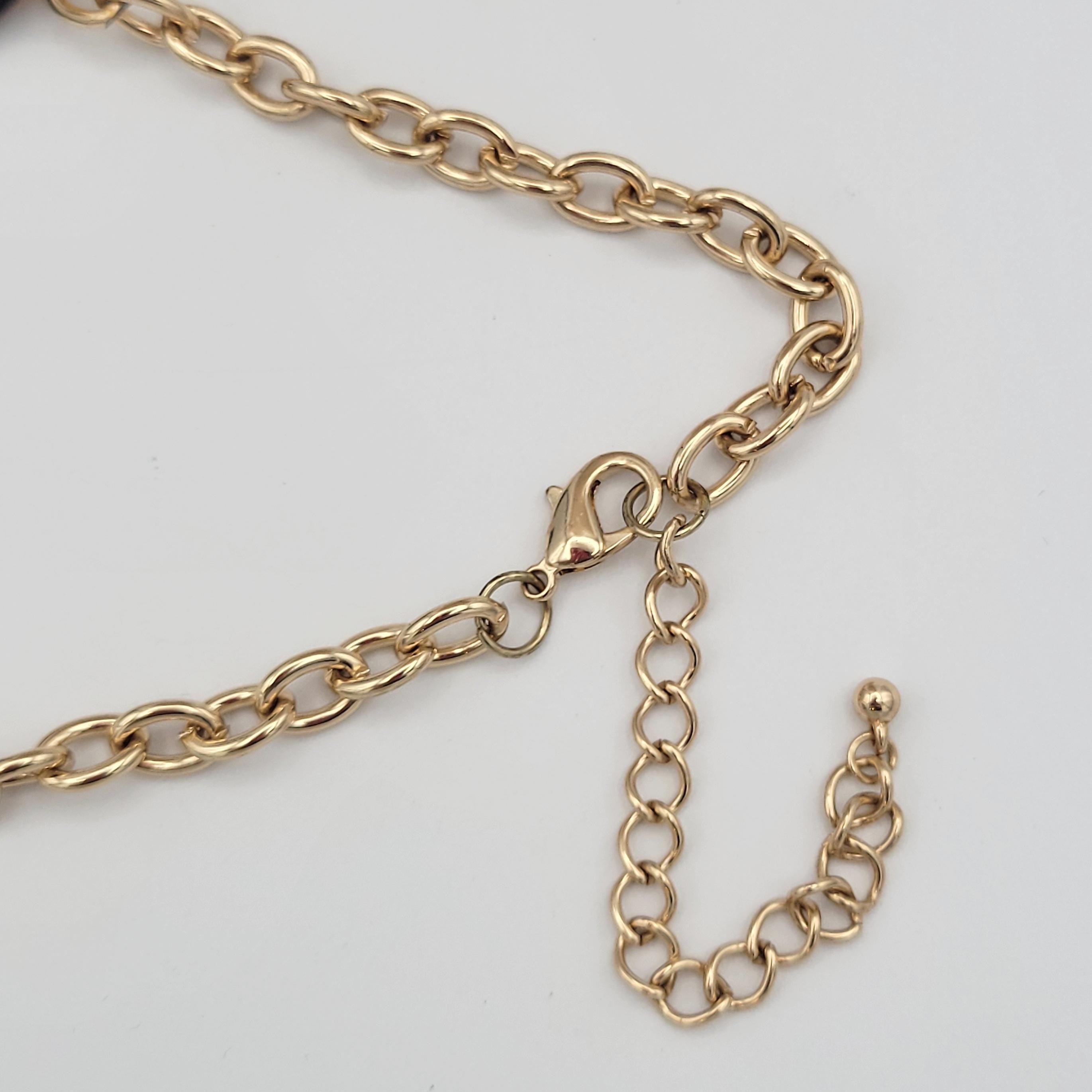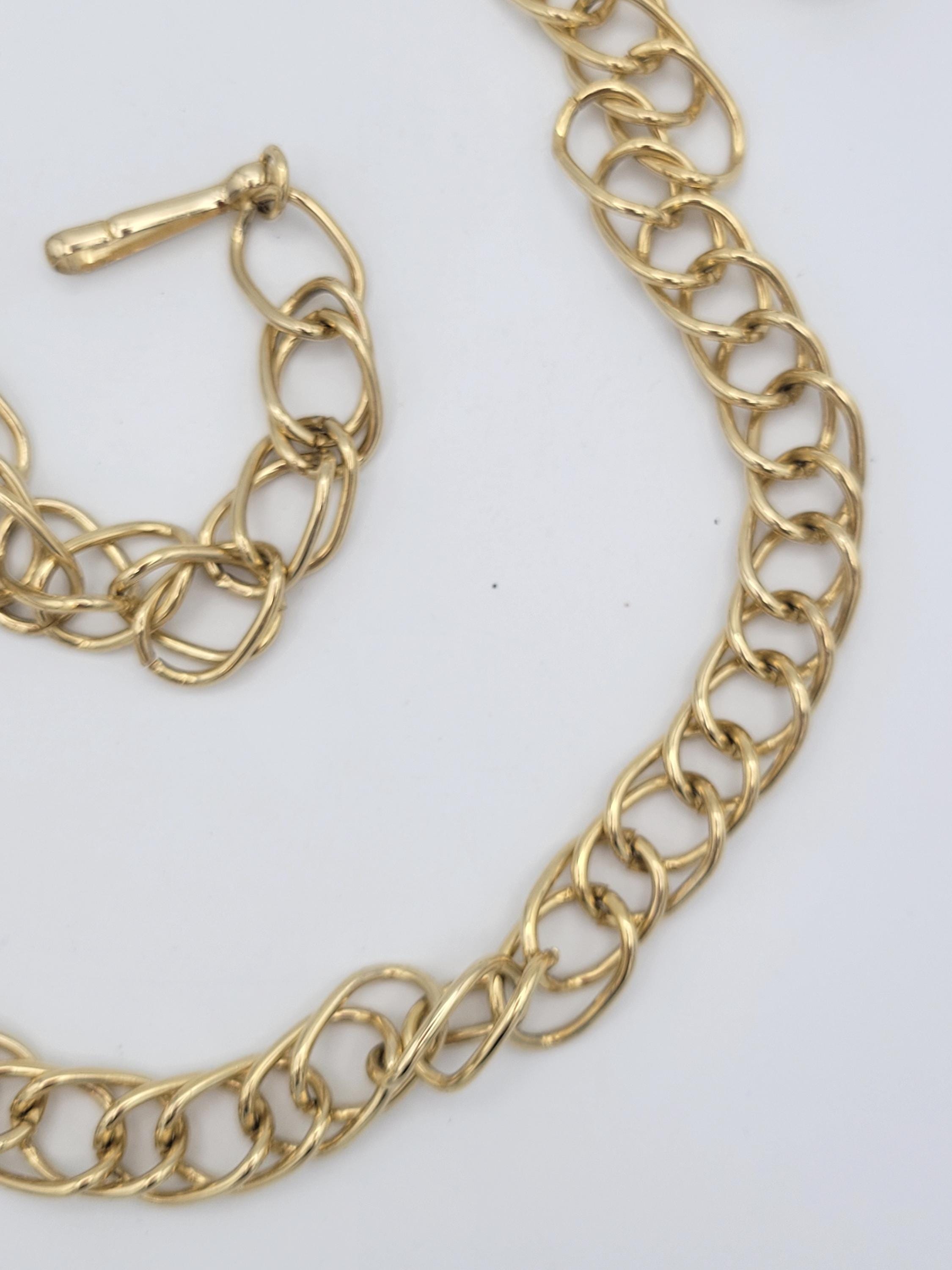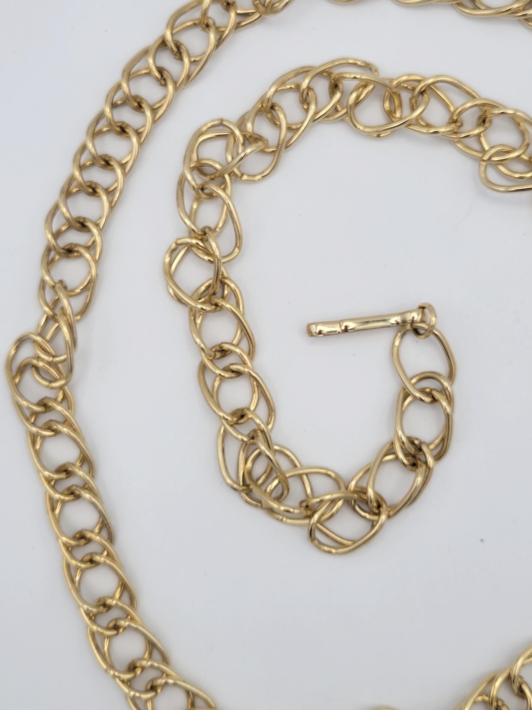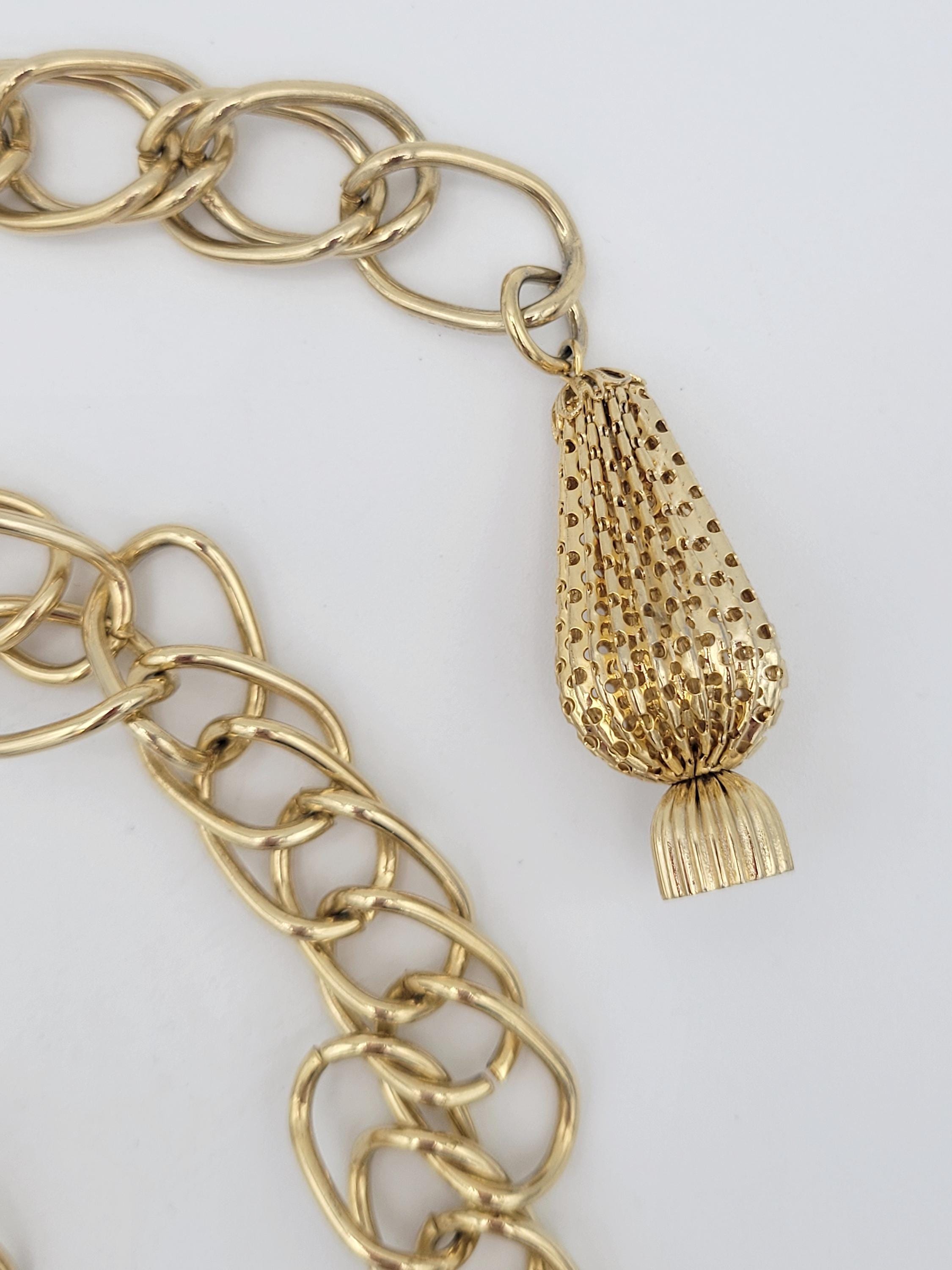 This vintage chain belt makes a great statement piece. The shining gold-tone belt is made of a large double curb chain that secures with a hook clasp. At the end of the belt is a large metallic tassel. This piece is in excellent vintage condition with a very little wear.