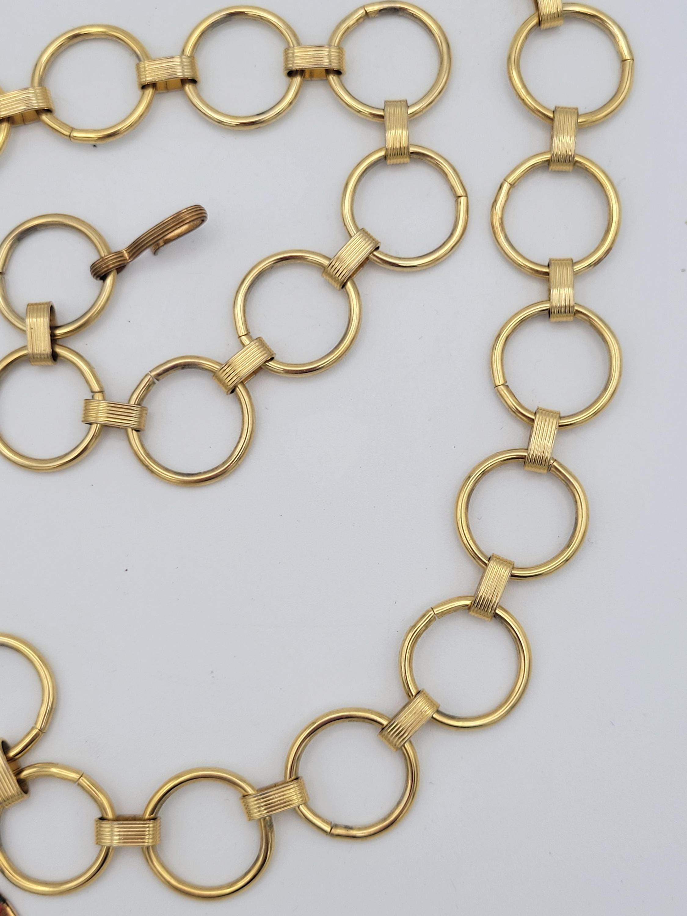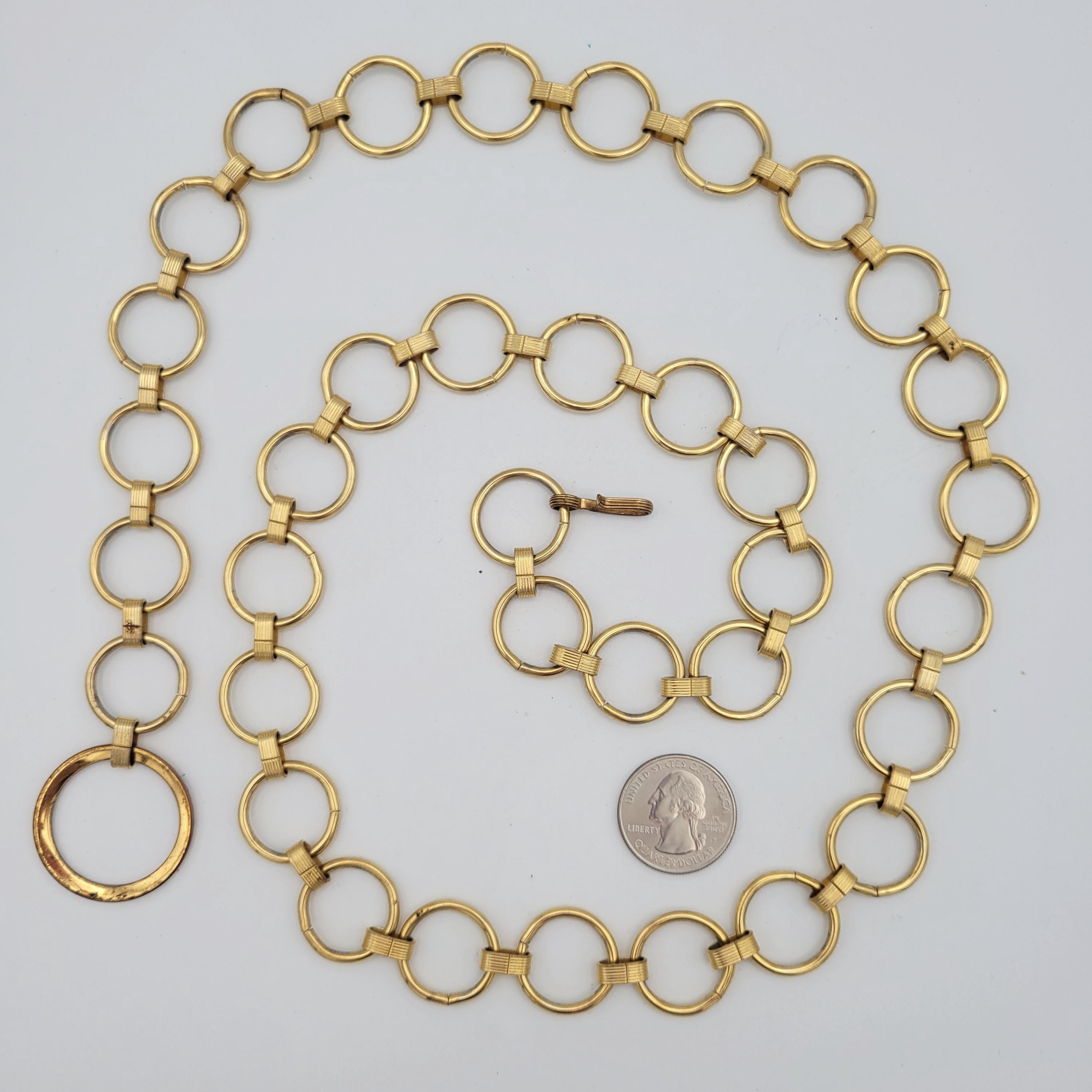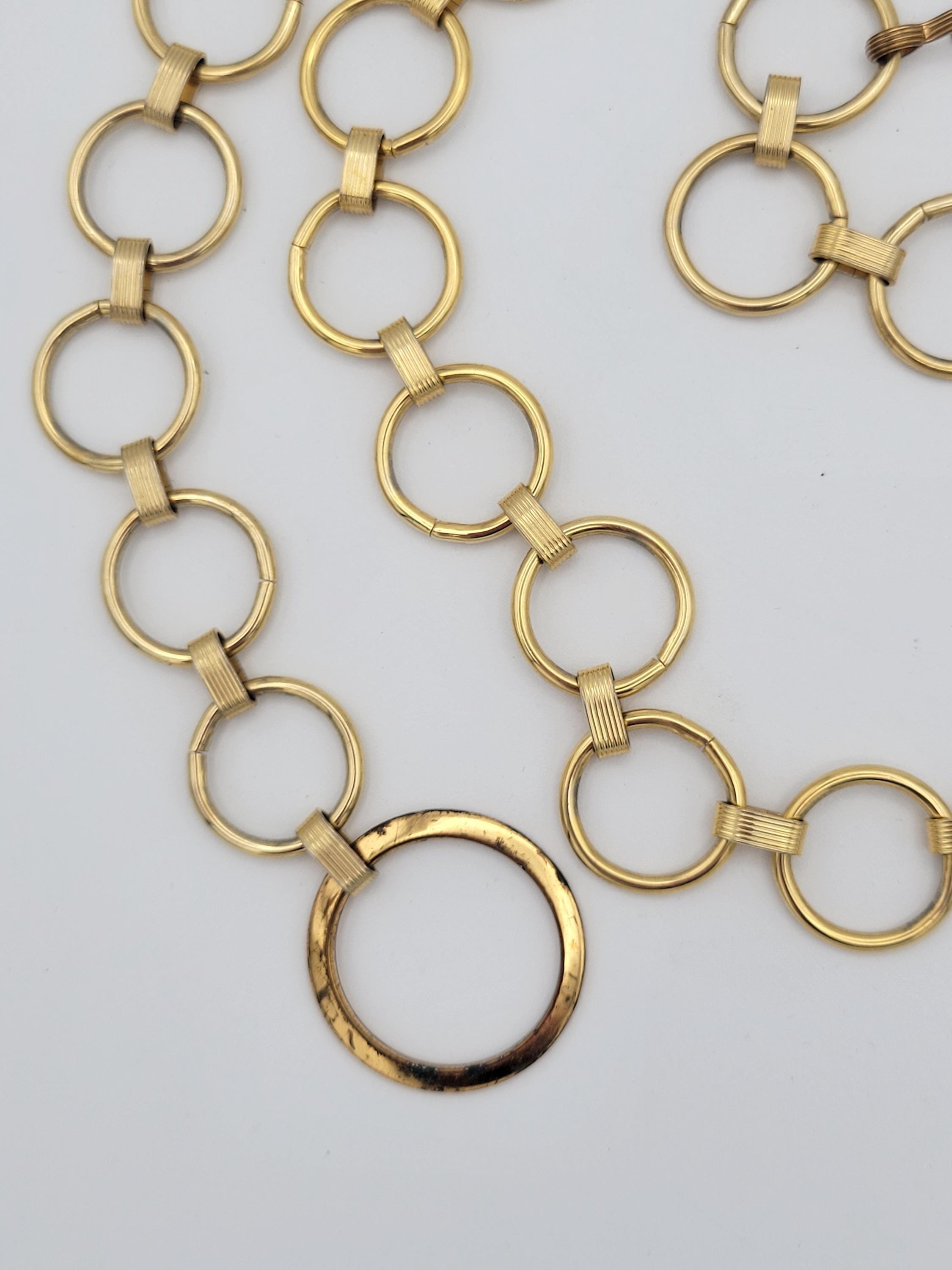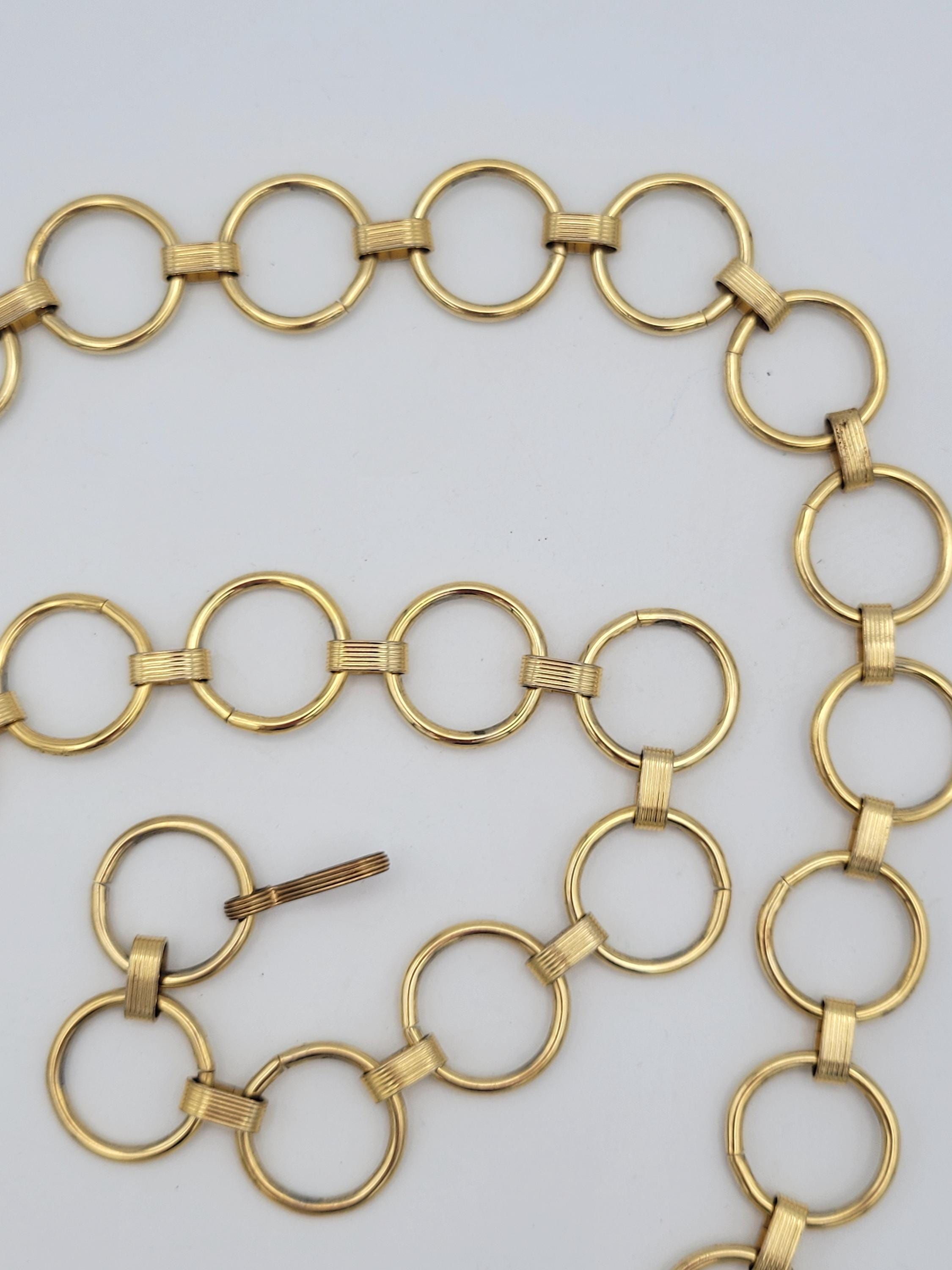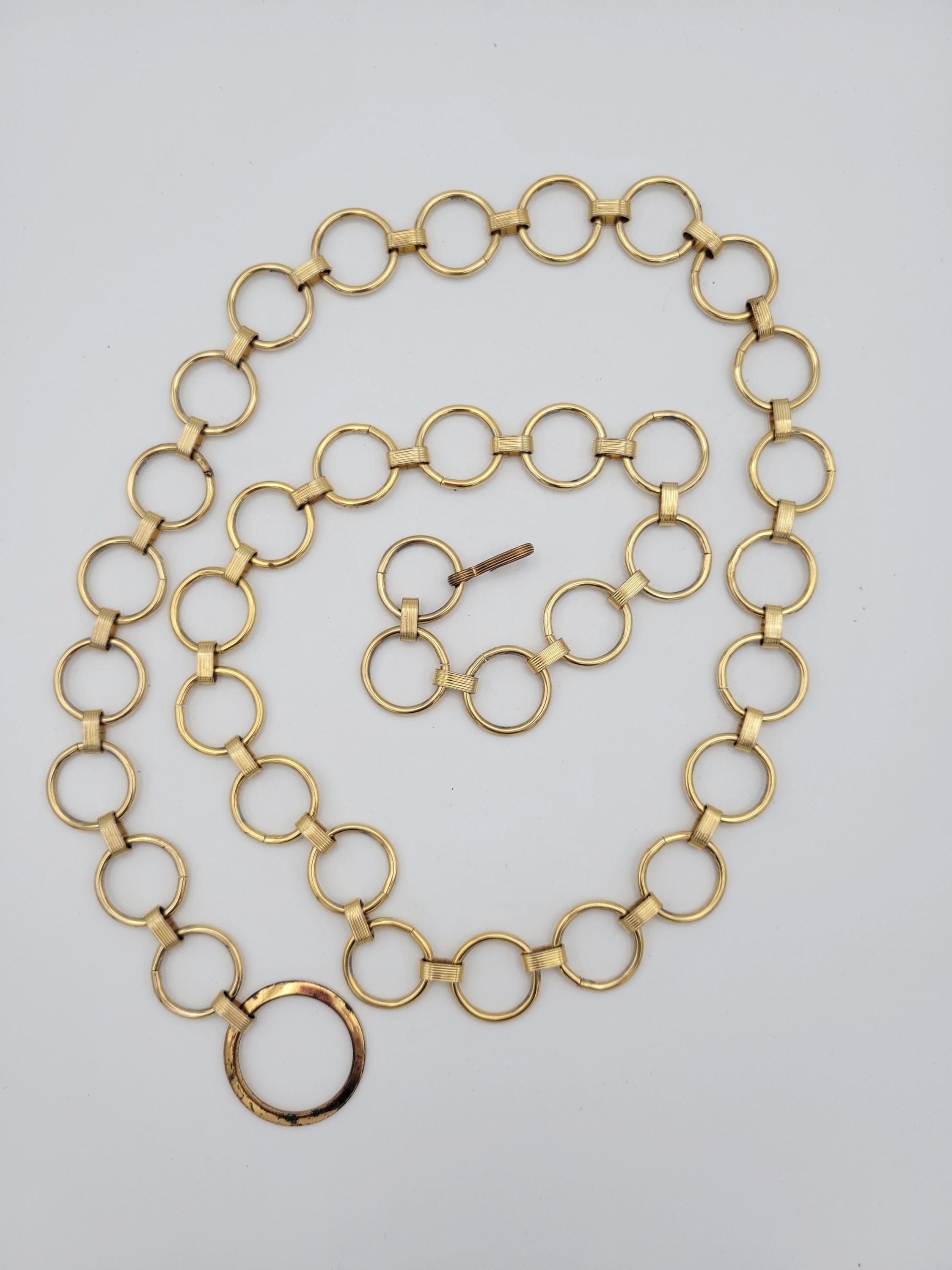 This vintage chain belt makes a great statement piece. The shining gold-tone belt is made of circular rings & secures with a hook clasp. This piece is in great vintage condition with a small amount of wear.