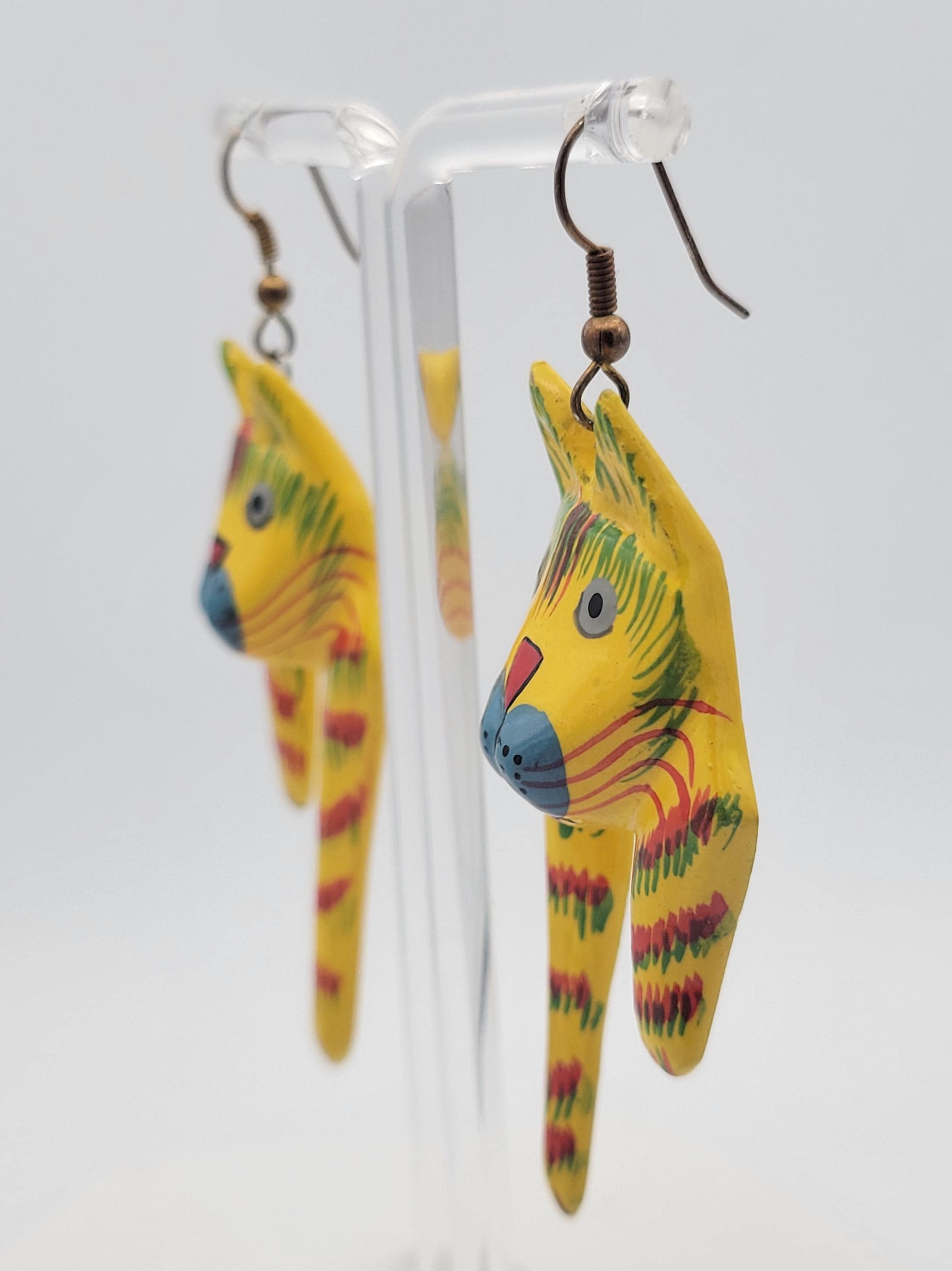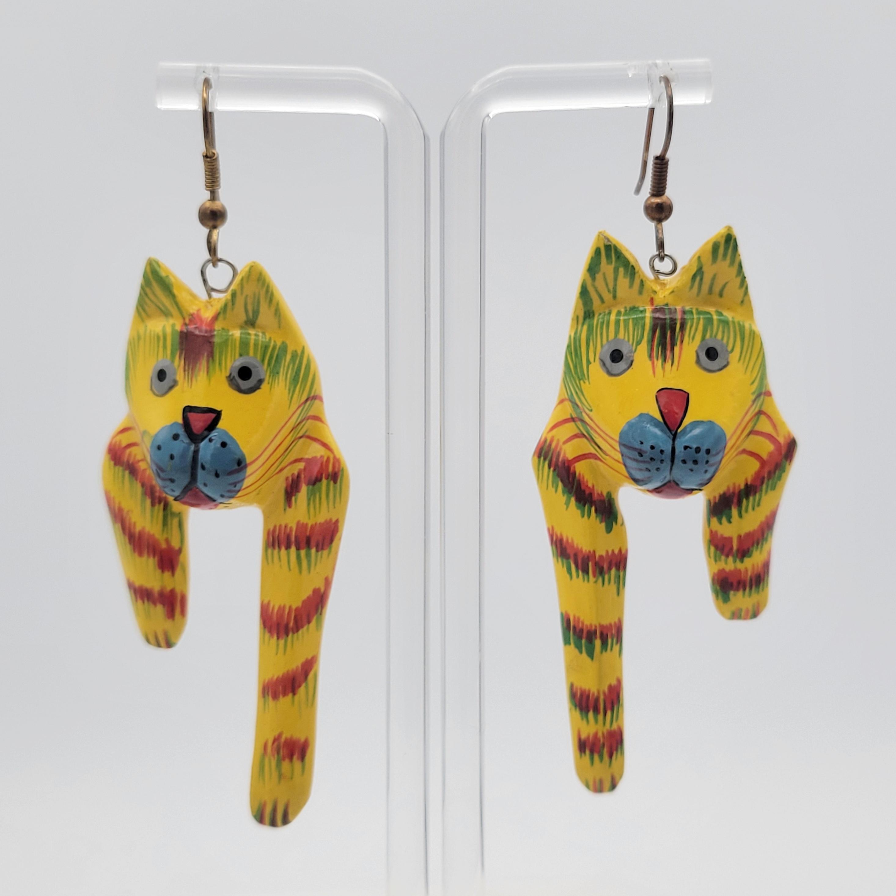 Vintage Lightweight Painted Wood Whimsical Striped Cat Dangle Earrings