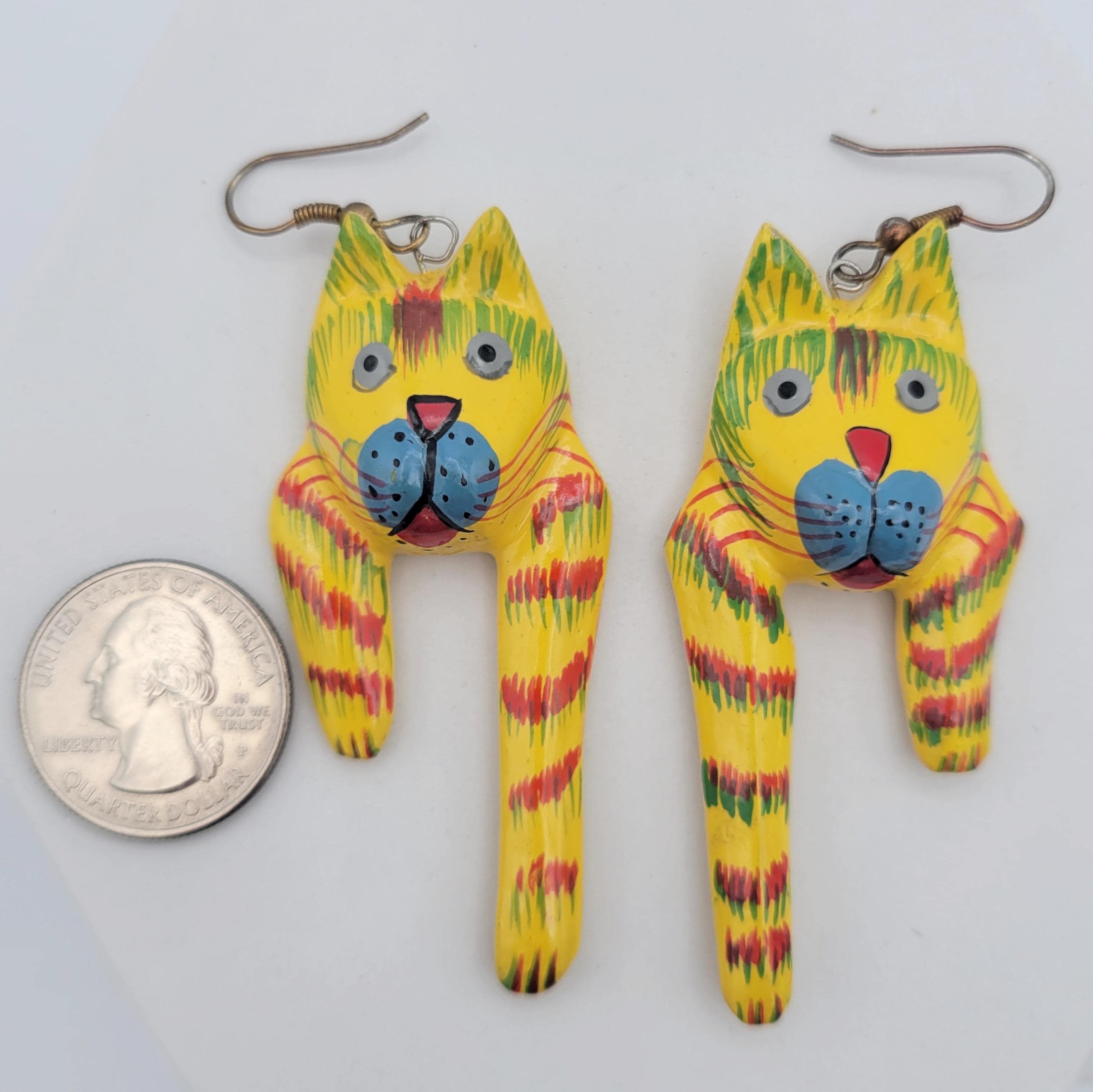 How cute are these crazy cats? The earrings are made from lightweight wood that forms the shape of cat faces with hanging arms. The earrings are painted with yellow, blue, green, & red enamel. These unique earrings are in excellent vintage condition with very little wear.