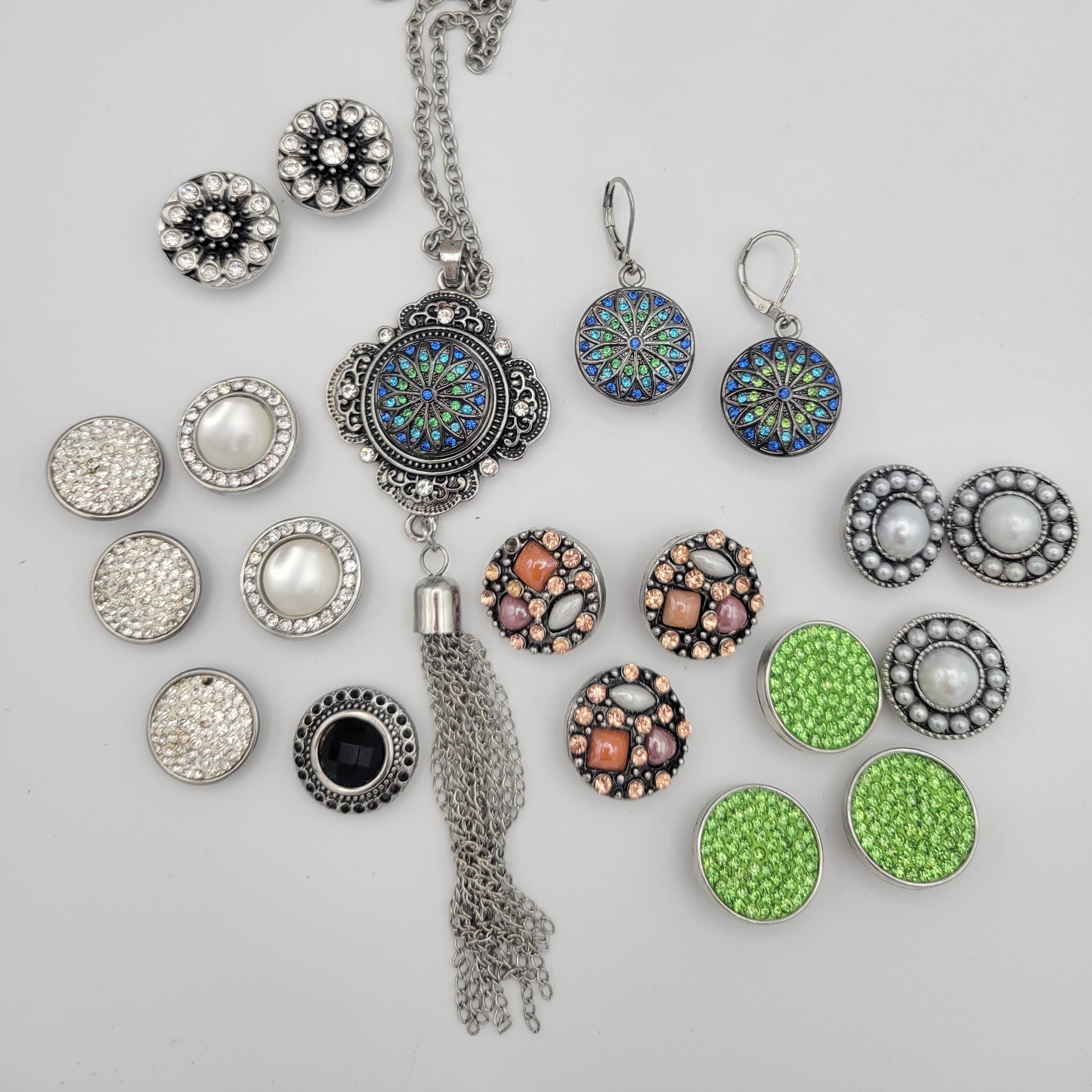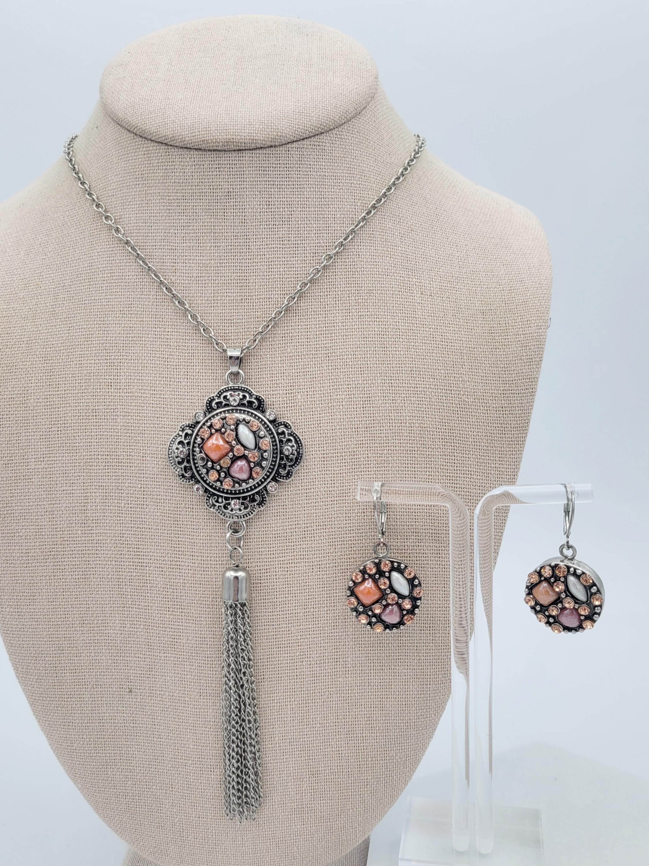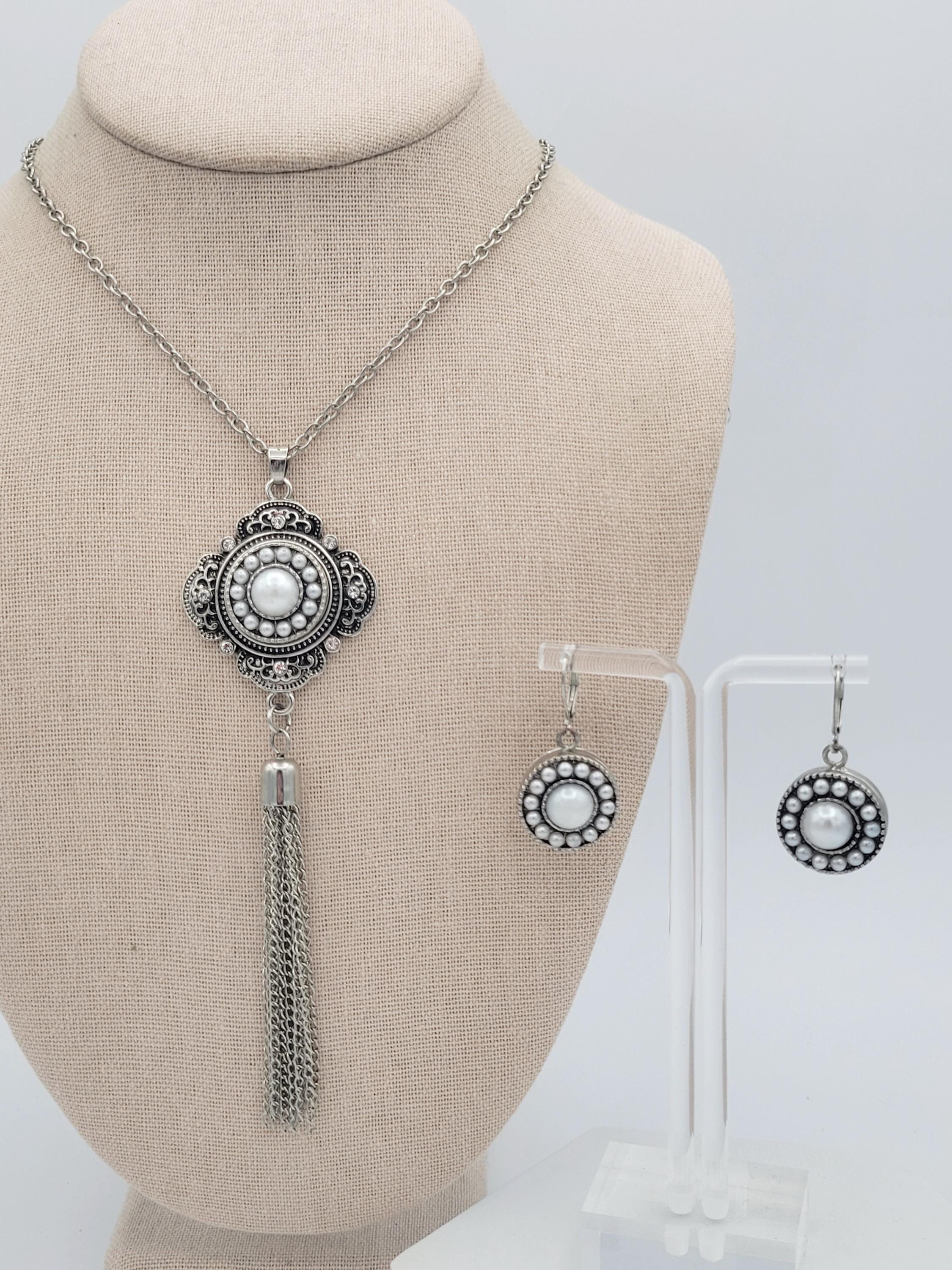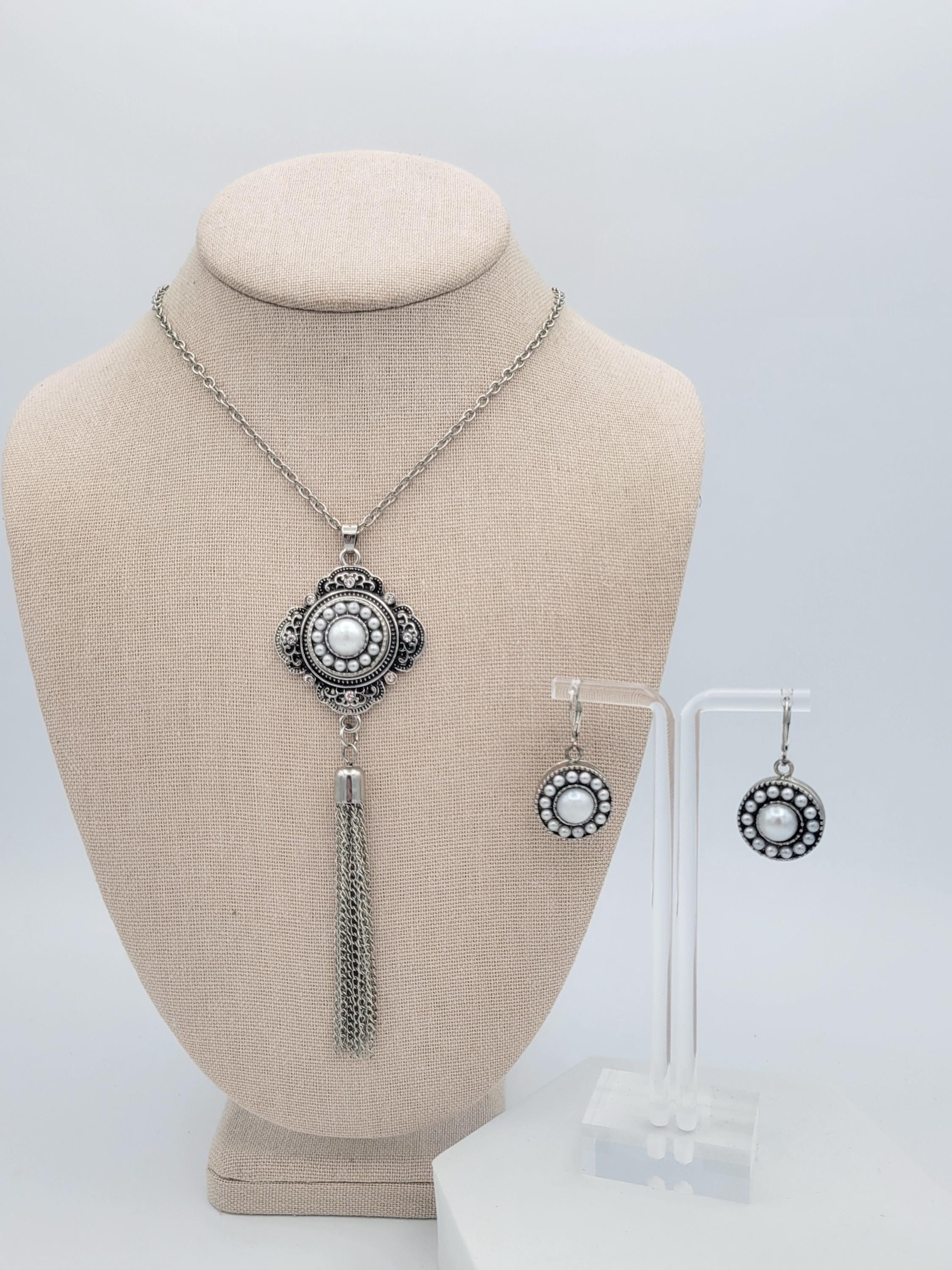 You can create a variety of looks with this 1 jewelry set! The set features a beautiful tassel necklace with filigree accents & a long cable chain. The dangle earrings have lever-back clasps. All 3 pieces are silver-tone in color & feature interchangable snap-on buttons. All snaps in the photos are included. This set is in excellent, nearly new condition.