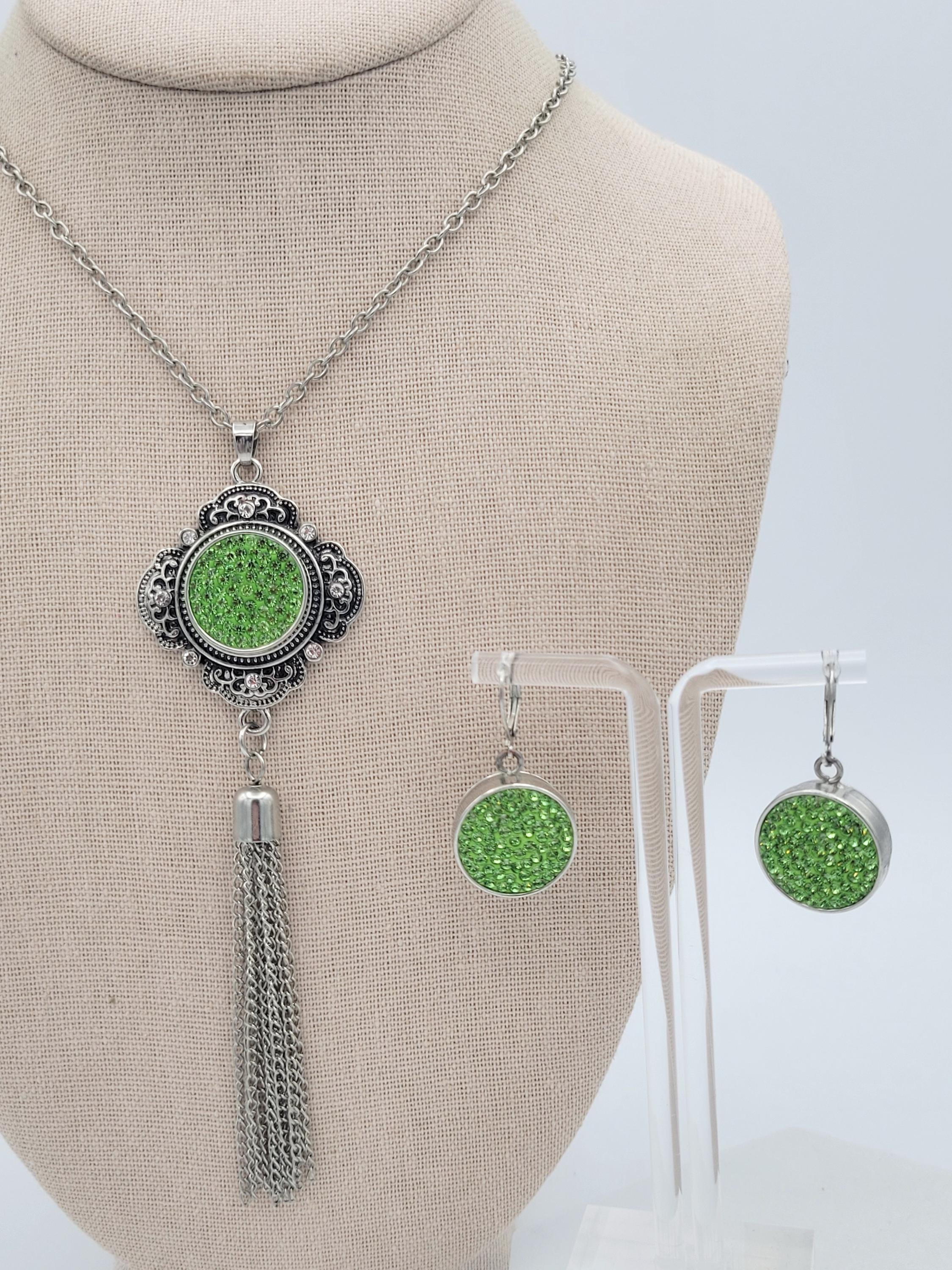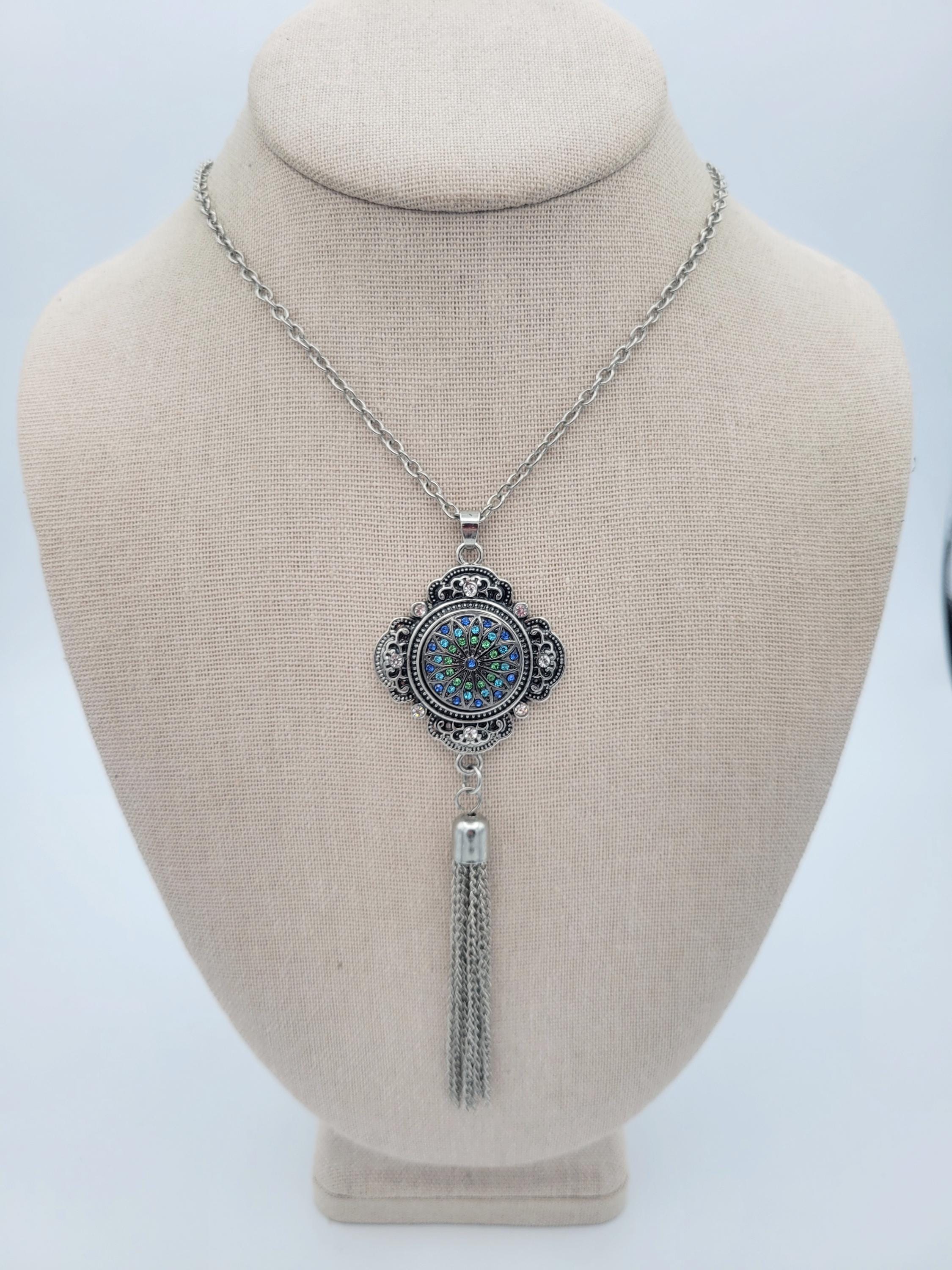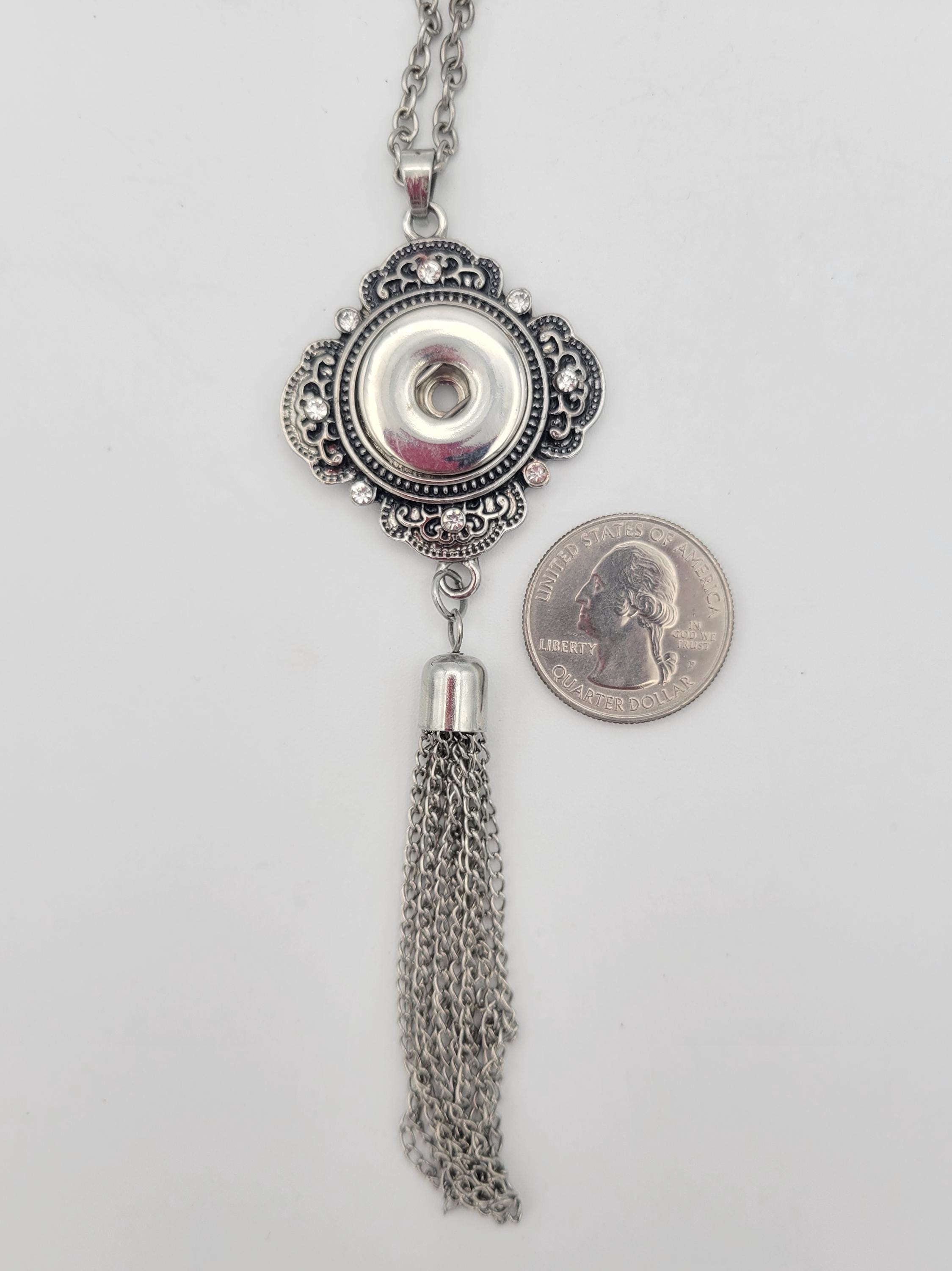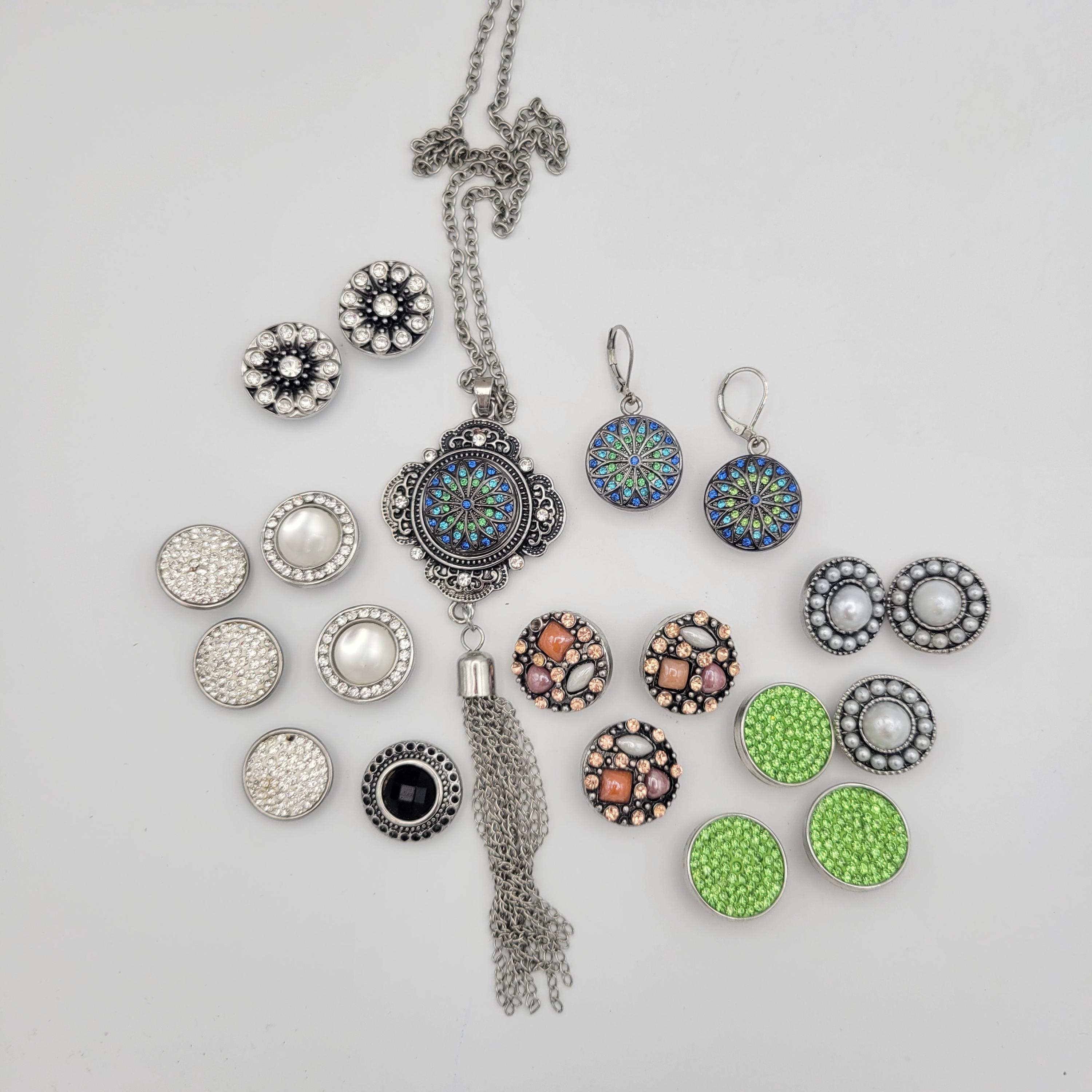 You can create a variety of looks with this 1 jewelry set! The set features a beautiful tassel necklace with filigree accents & a long cable chain. The dangle earrings have lever-back clasps. All 3 pieces are silver-tone in color & feature interchangable snap-on buttons. All snaps in the photos are included. This set is in excellent, nearly new condition.