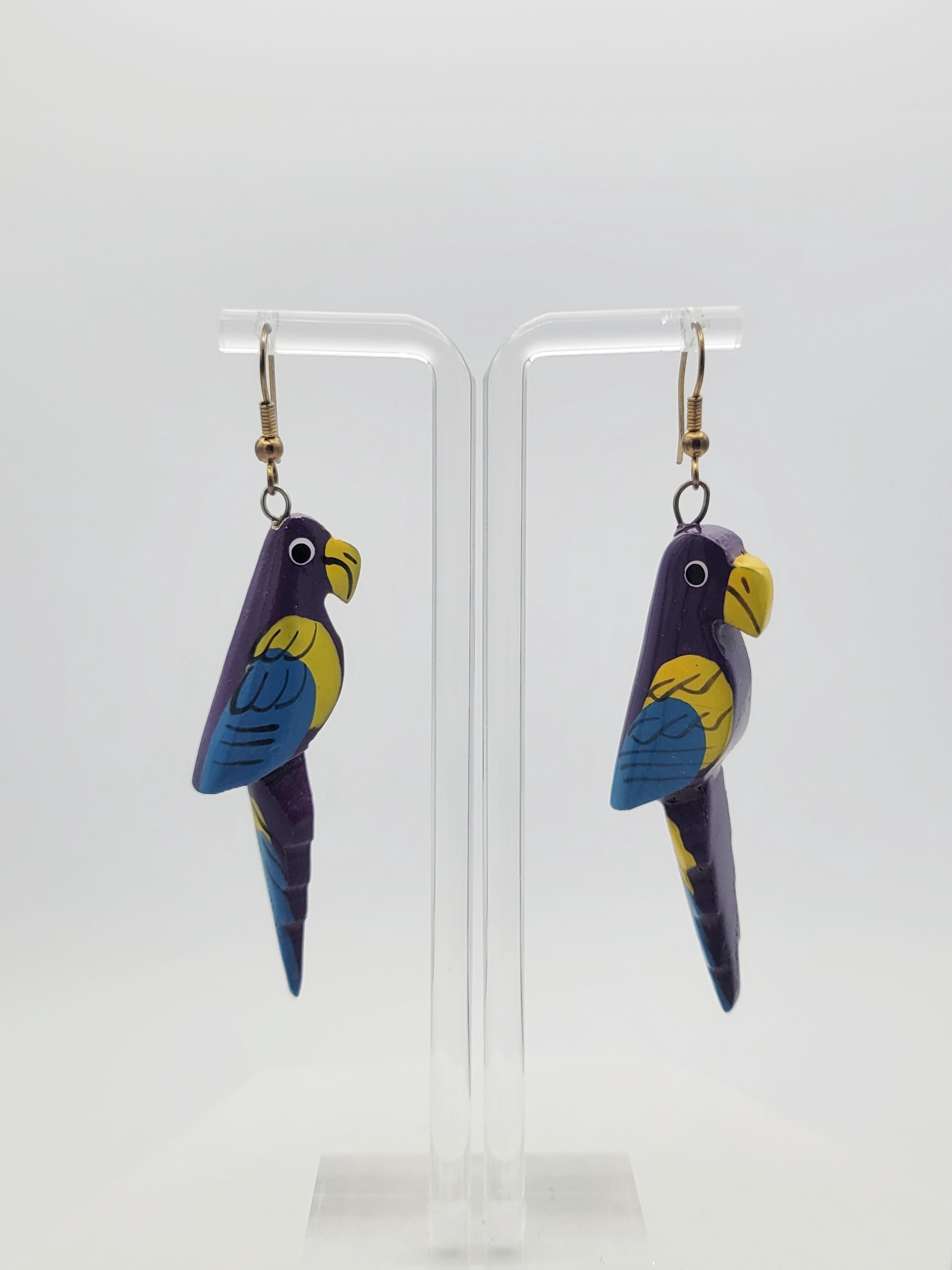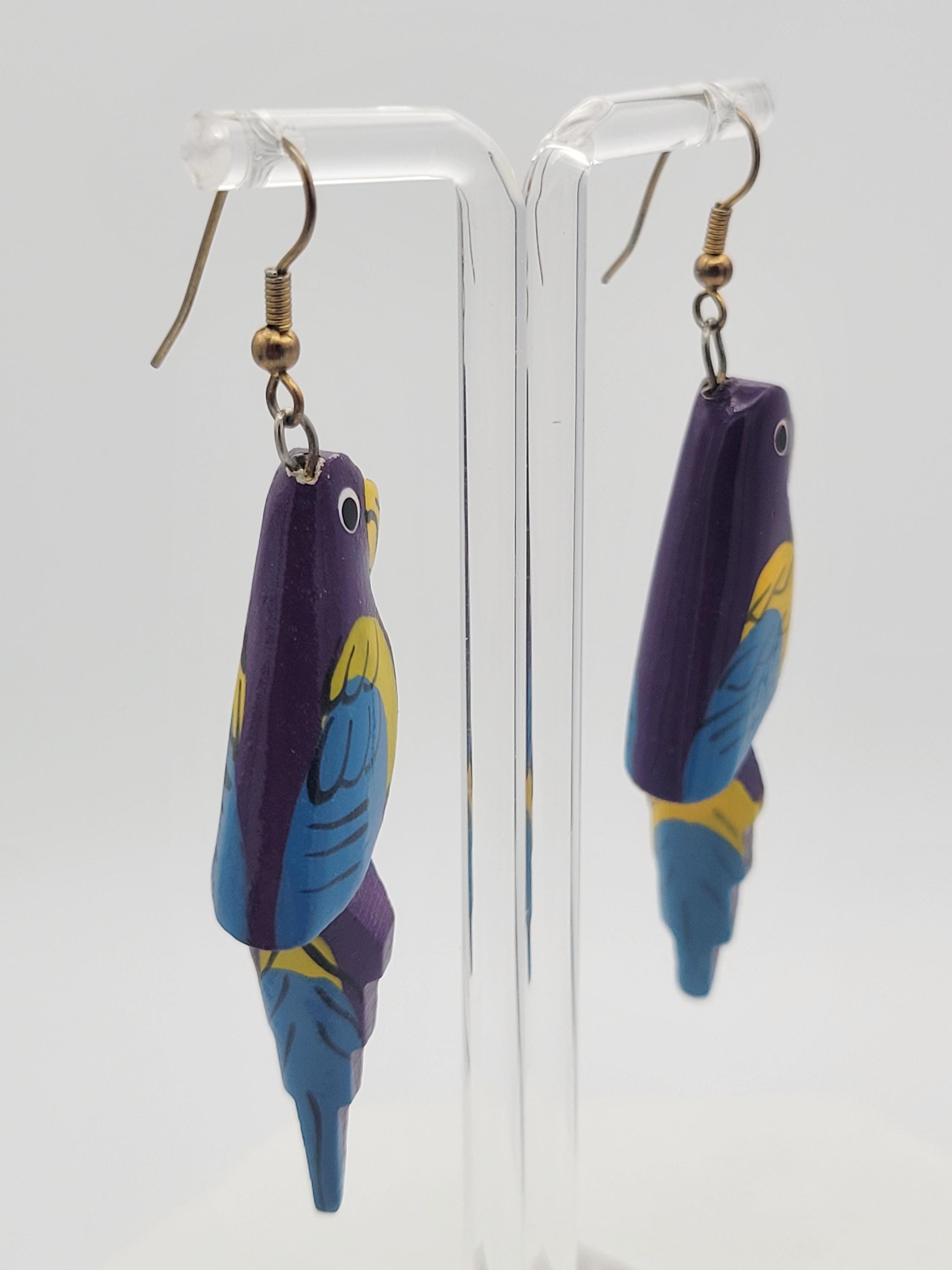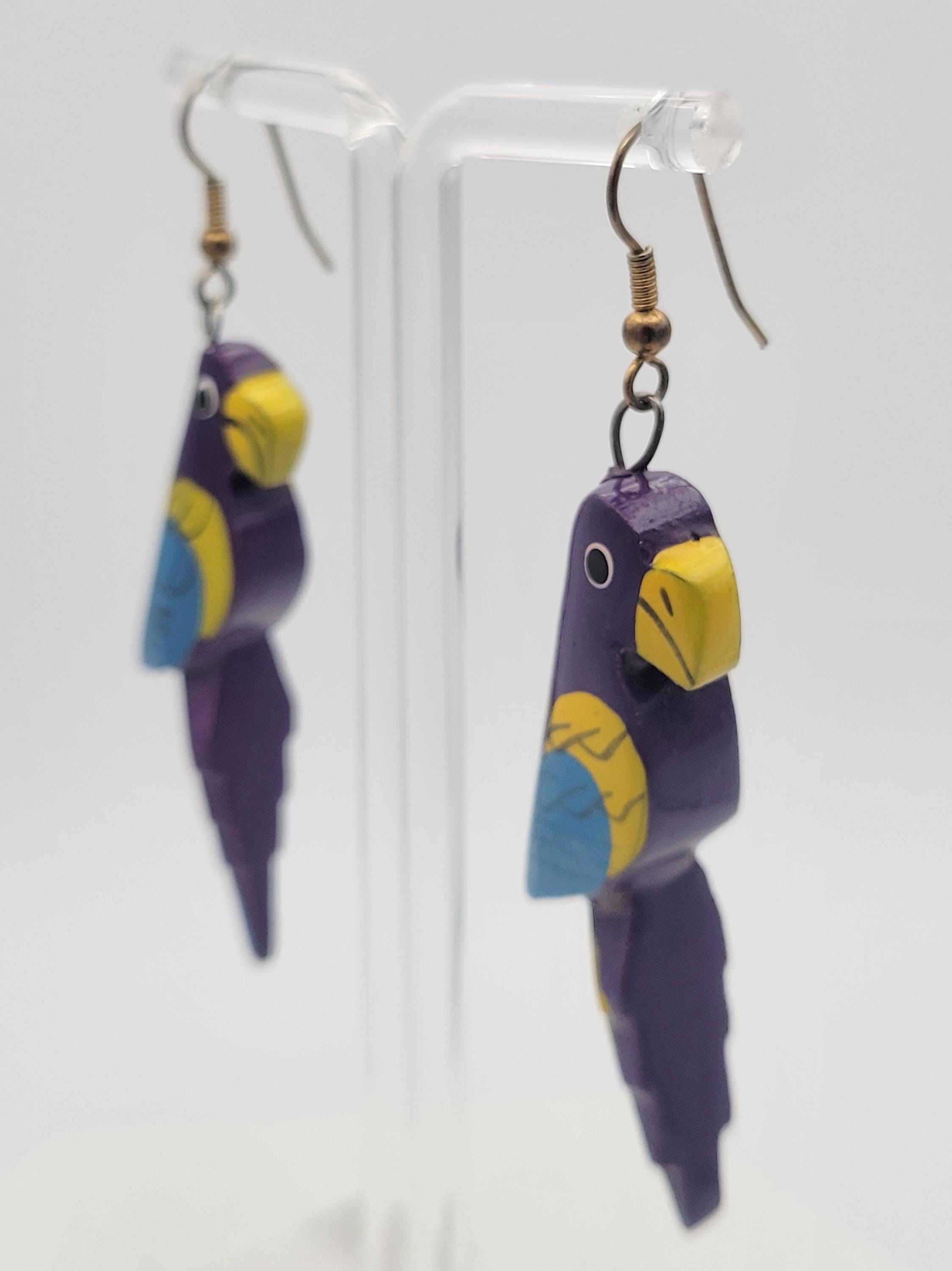 Vintage Lightweight Painted Wood Whimsical Purple Parrot Dangle Earrings