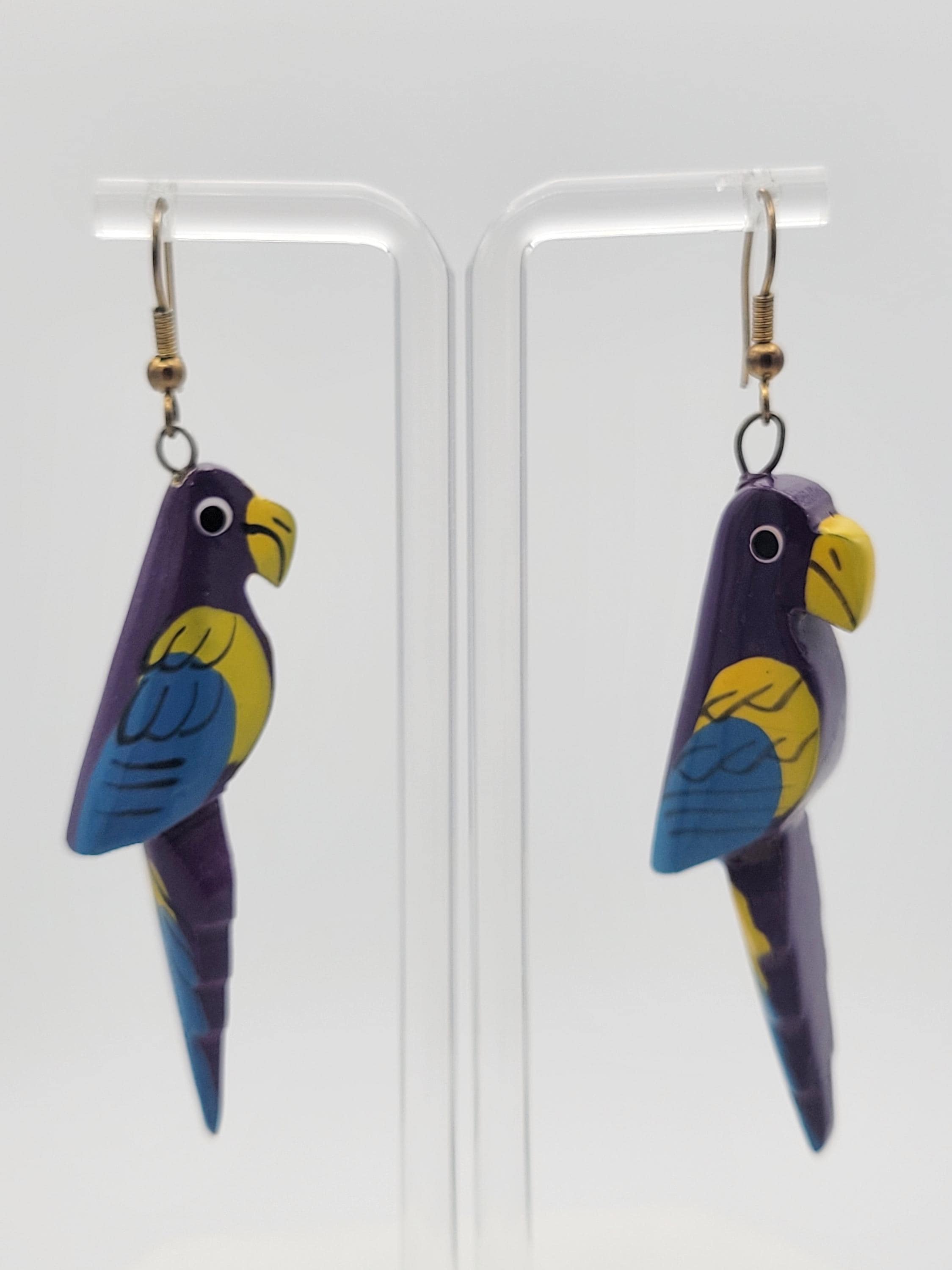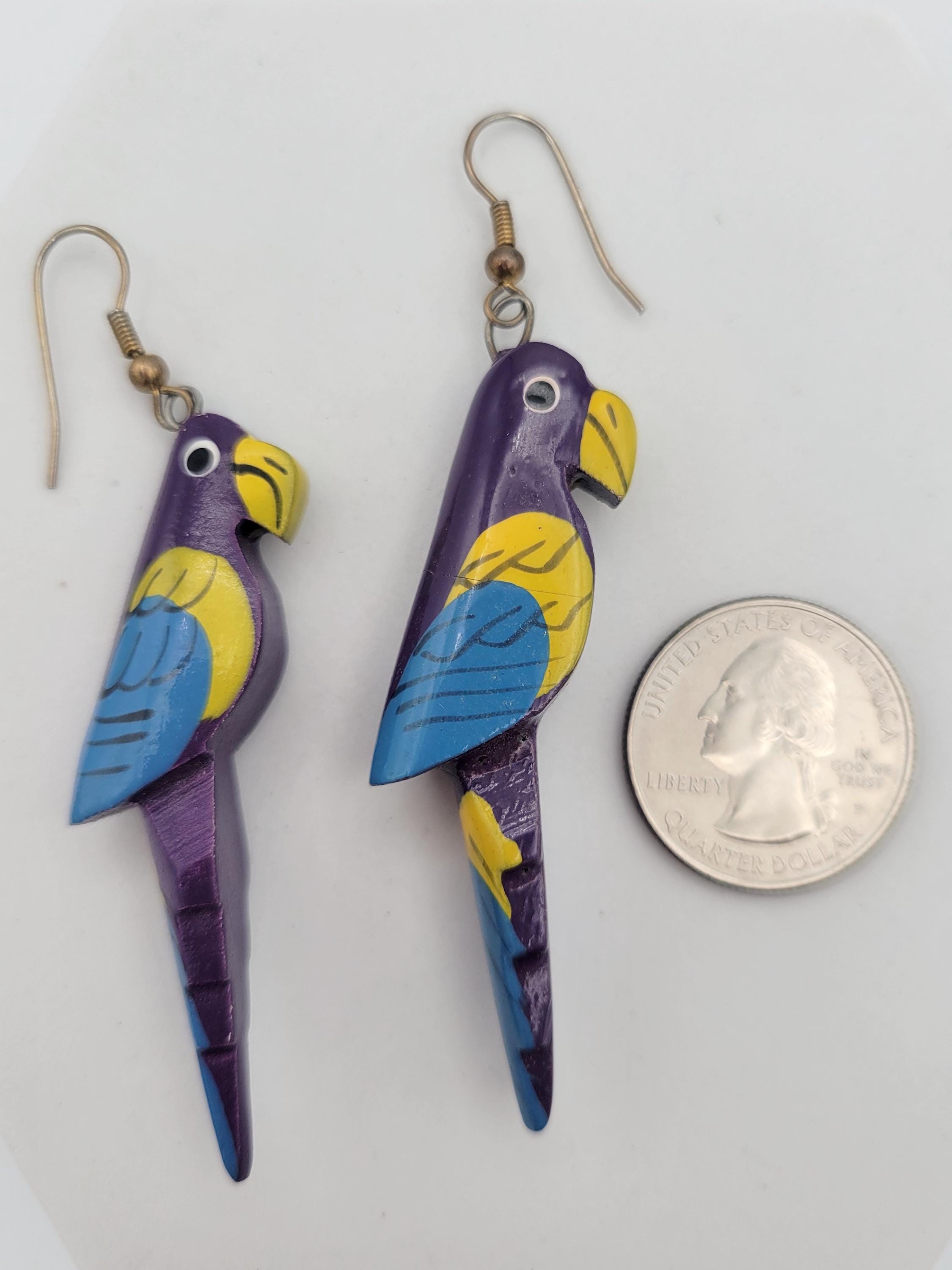 How cute are these parrots? The earrings are made from lightweight wood that forms the shape of parrots with long tailfeathers. The earrings are painted with purple, yellow, & blue enamel. These unique earrings are in excellent vintage condition with very little wear.