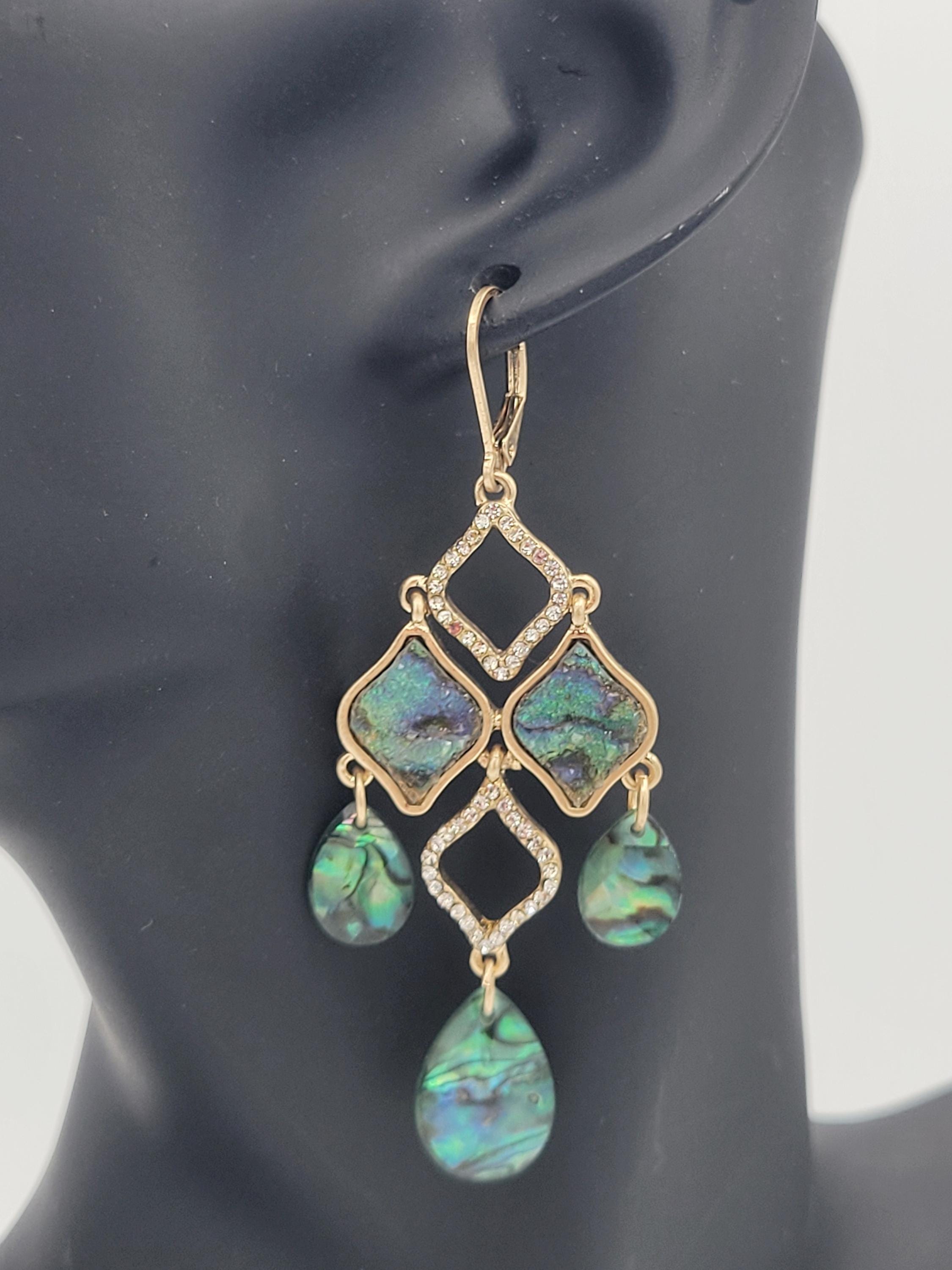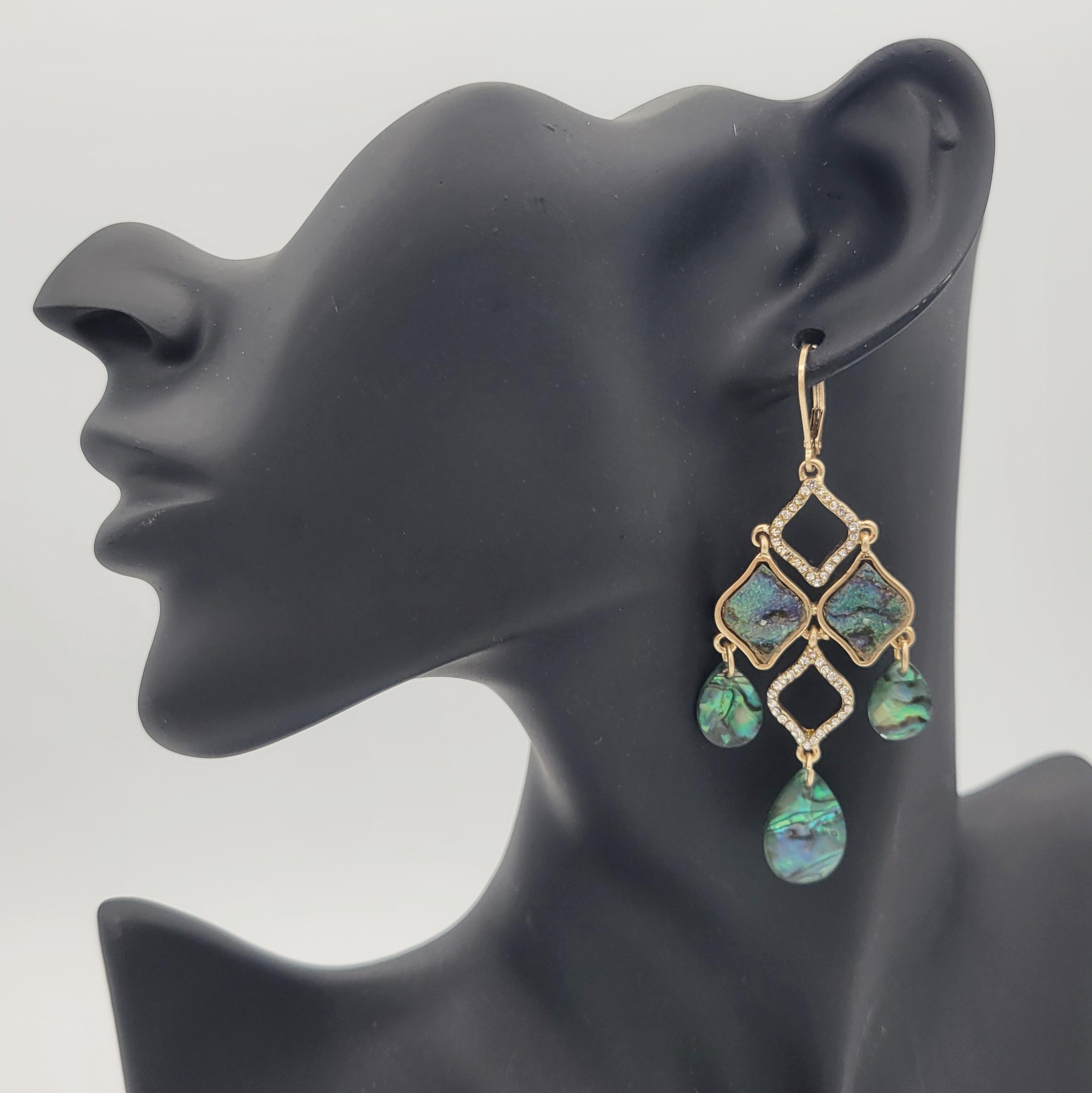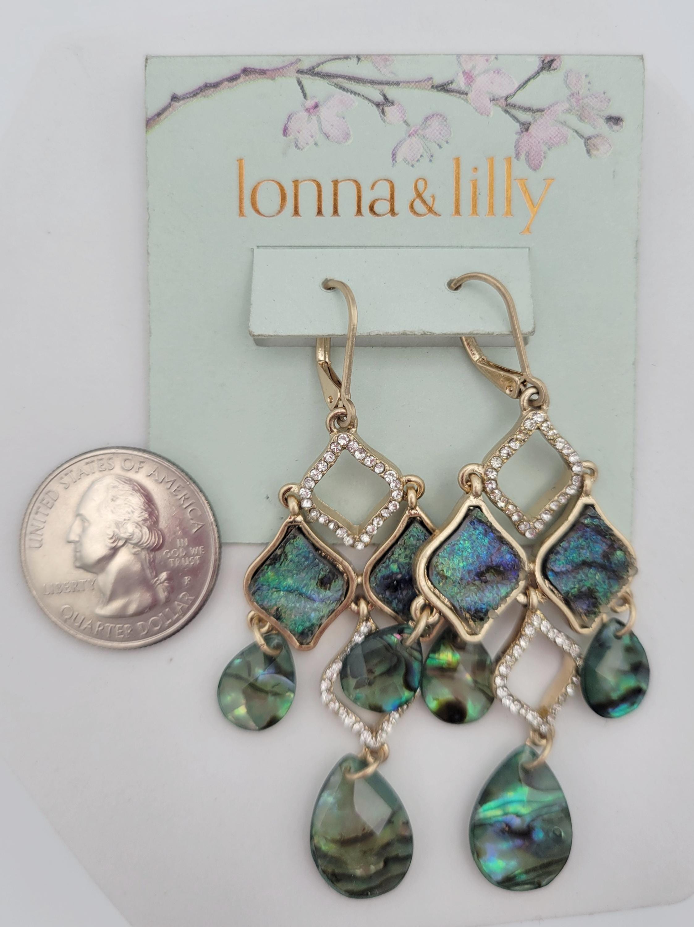 NEW Lonna & Lilly Gold Tone Openwork Chandelier Dangle Earrings with Rhinestones and Blue Green Shell Designs