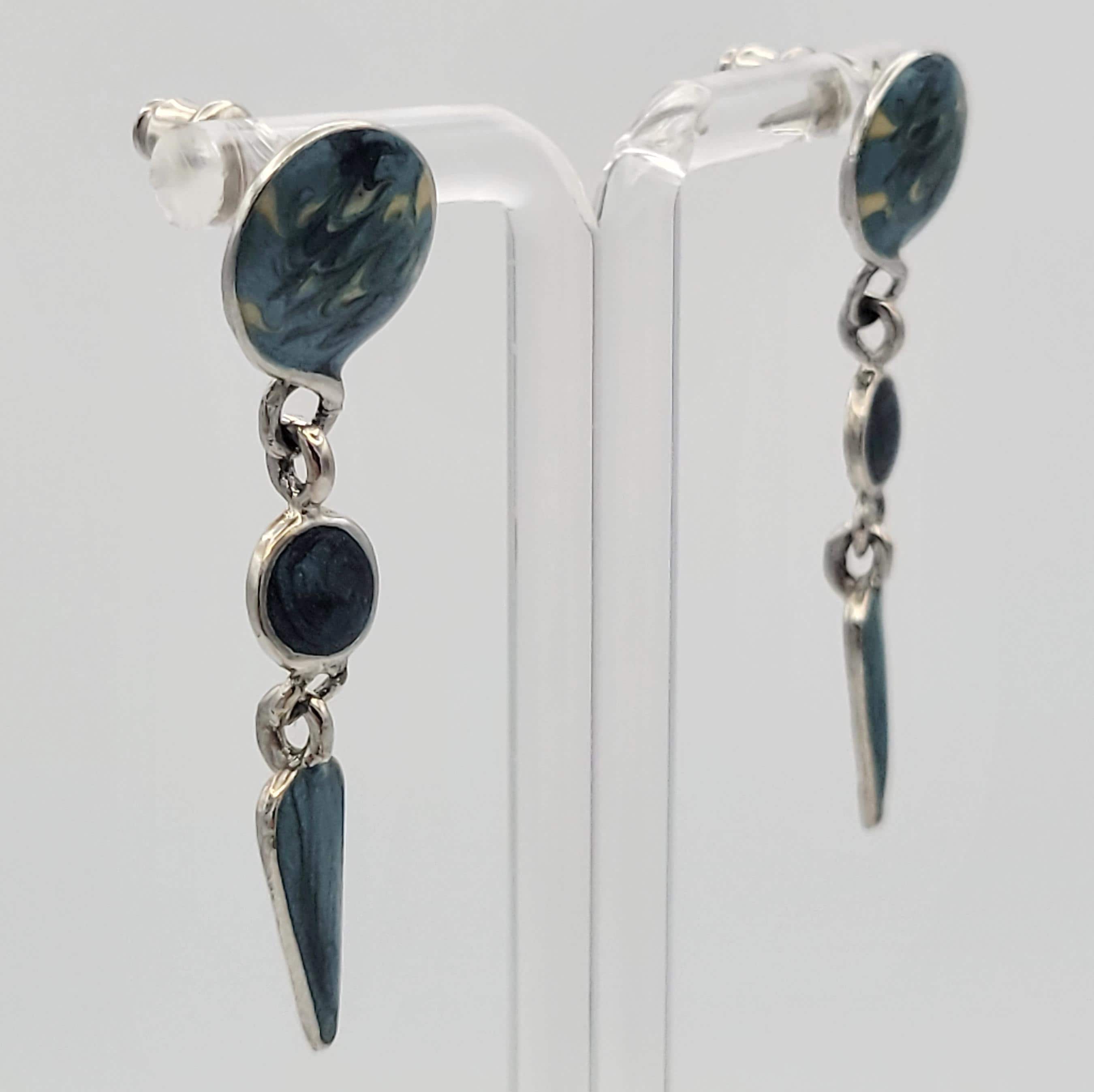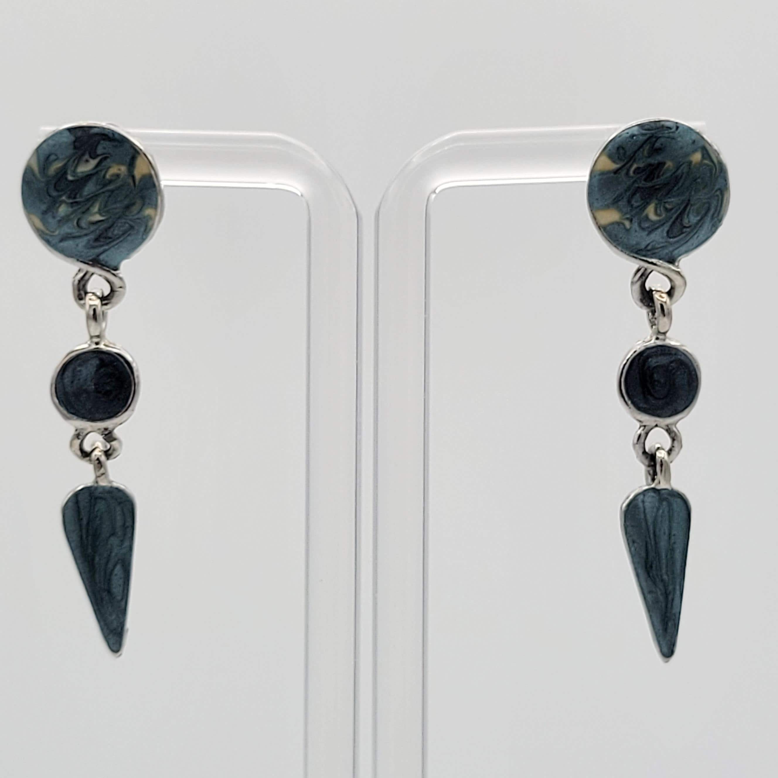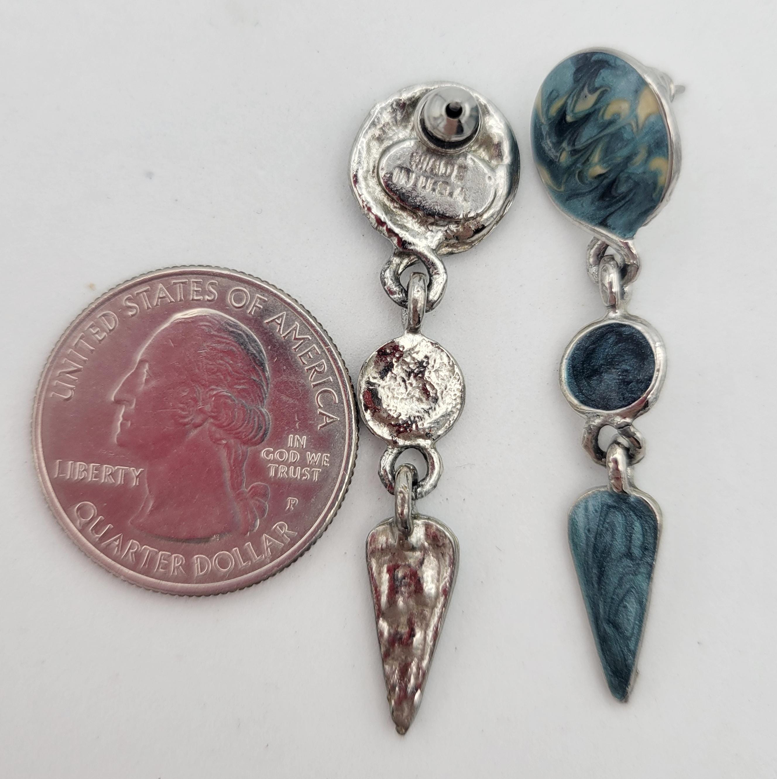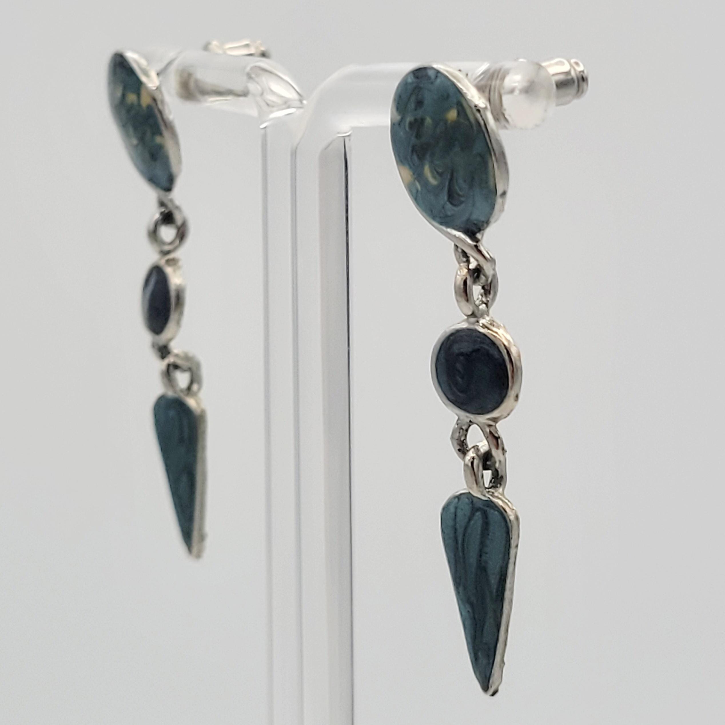 These earrings make great accent pieces. The silver-tone earrings form 3 geometric links - a circle, an oval & a teardrop. Each shape is filled with shimmery blue & yellow swirled enamel. These earrings are in excellent condition with very little wear.