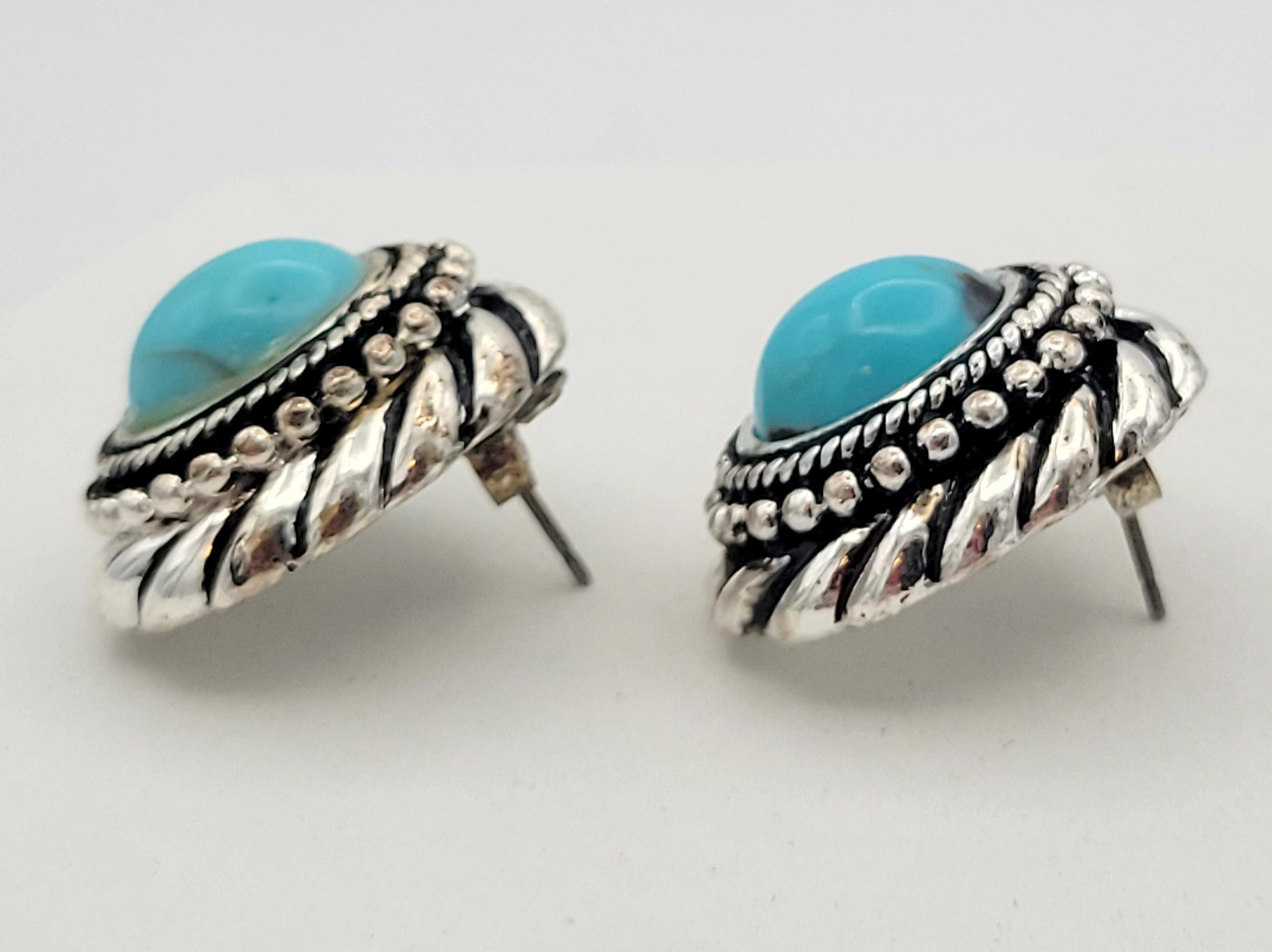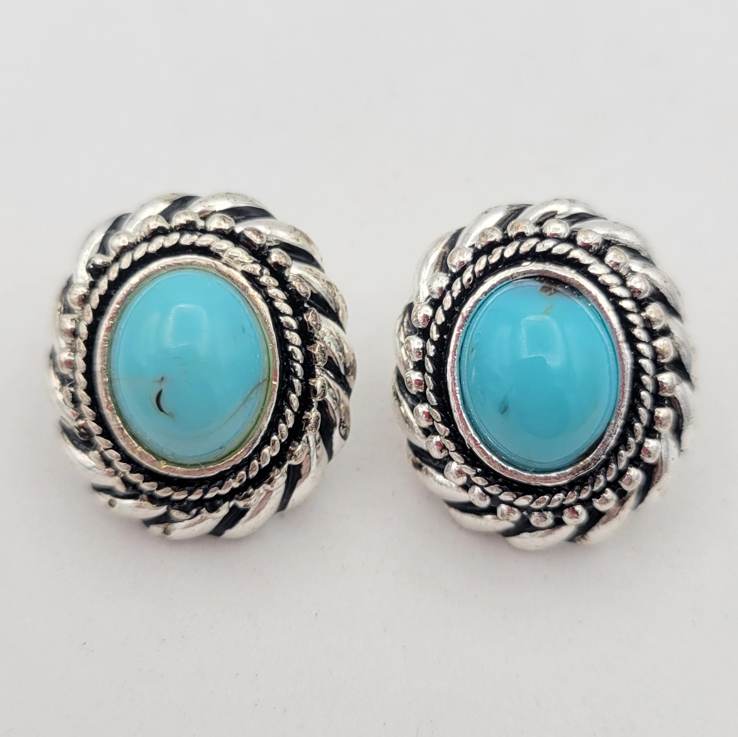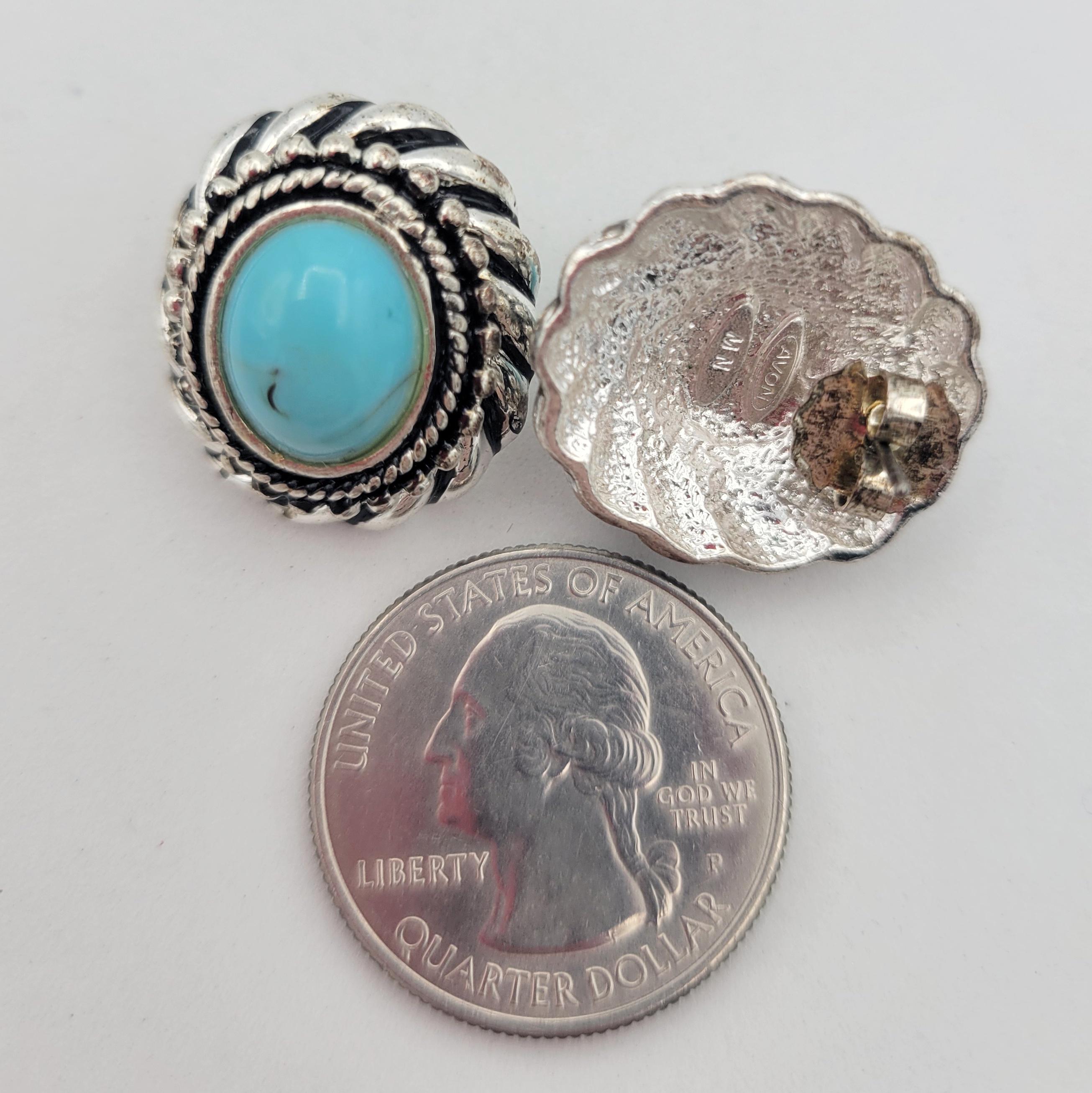 These vintage earrings from Avon are perfect for adding a pop of blue to your outfit. The thick silver-tone earrings have a rope-patterned design that is accented with black enamel. In the center are 2 large faux turquoise cabochons. These earrings are in excellent vintage condition with very little wear.