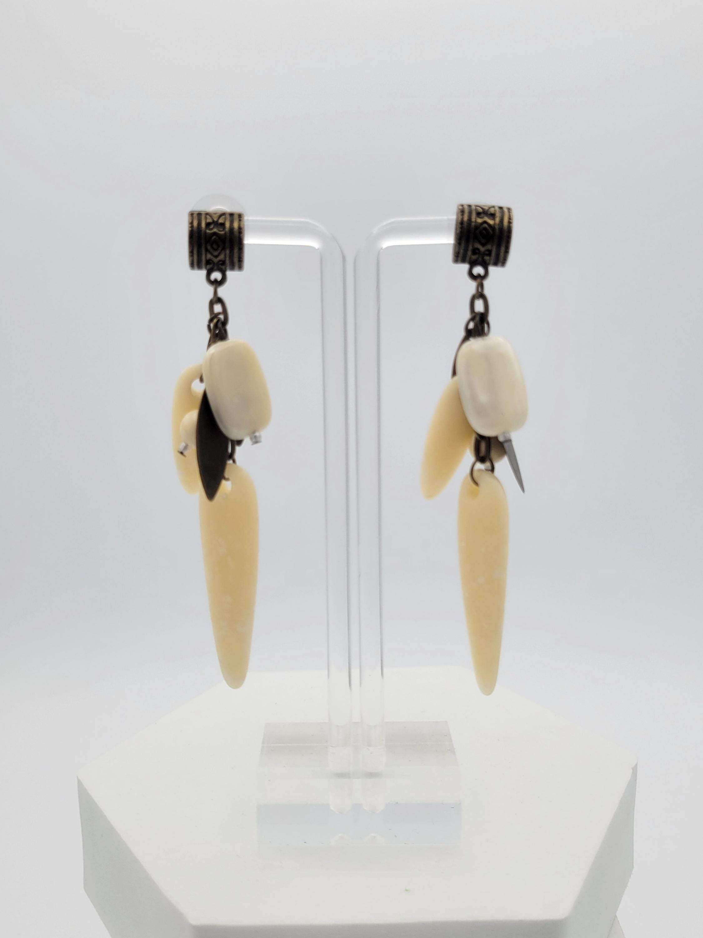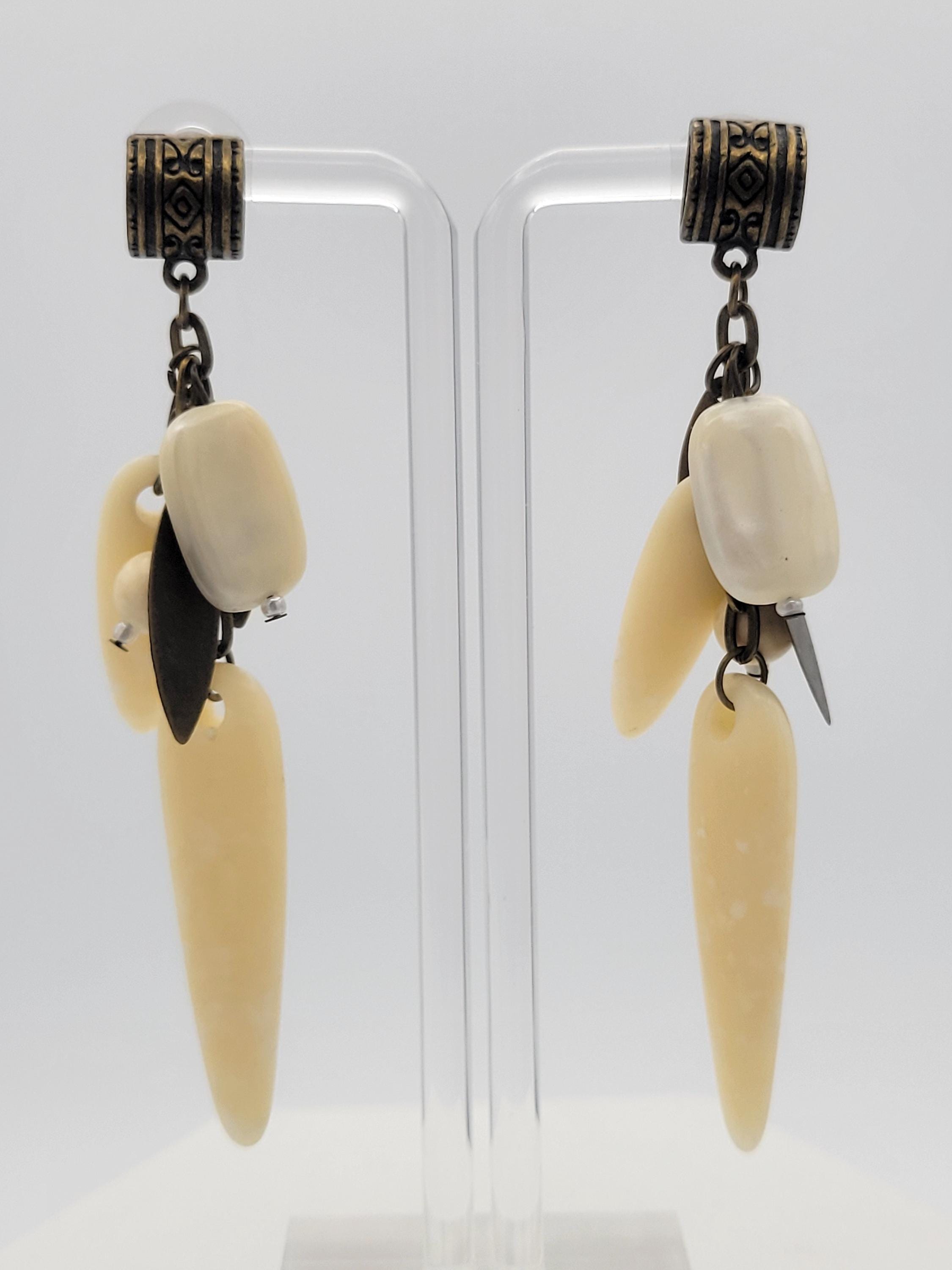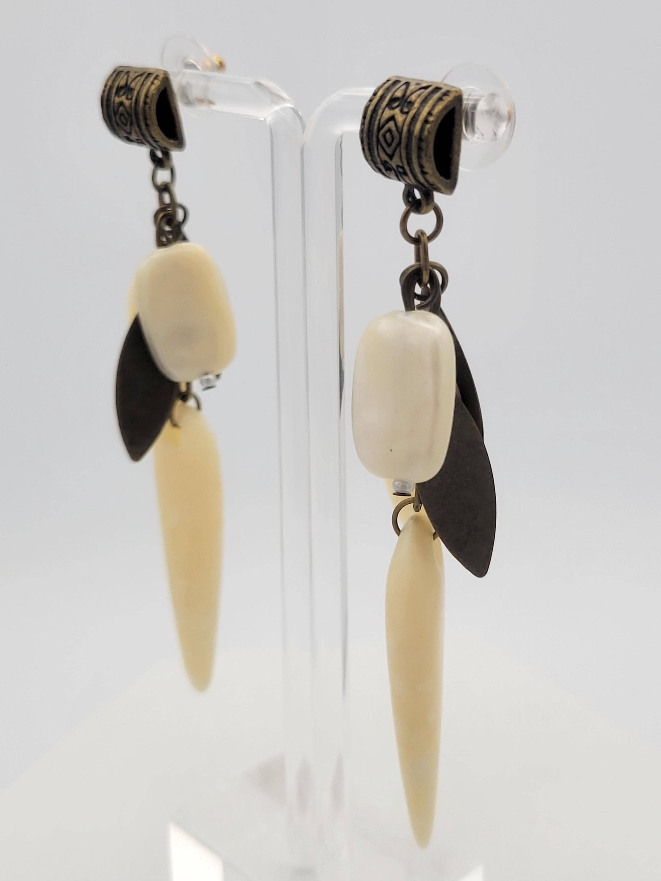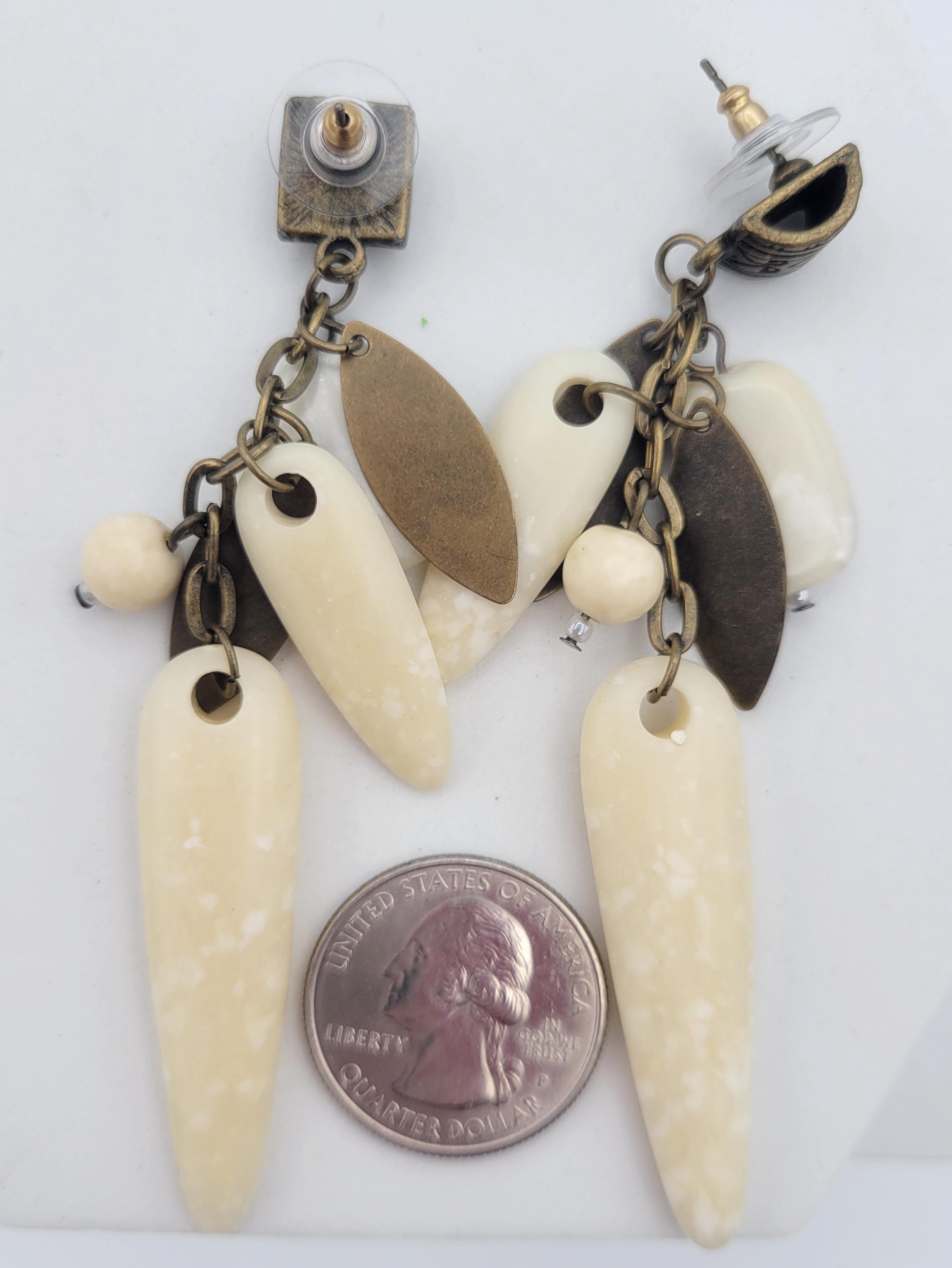 These earrings make great statement pieces. The antique gold-tone studs have a rounded shape & are engraved with a diamond & ribbon shapes. From the stud hangs an antique gold-tone cable chain adorned with brass oval shapes & white/ivory beads in various shapes. These earrings are in excellent condition with very little wear.