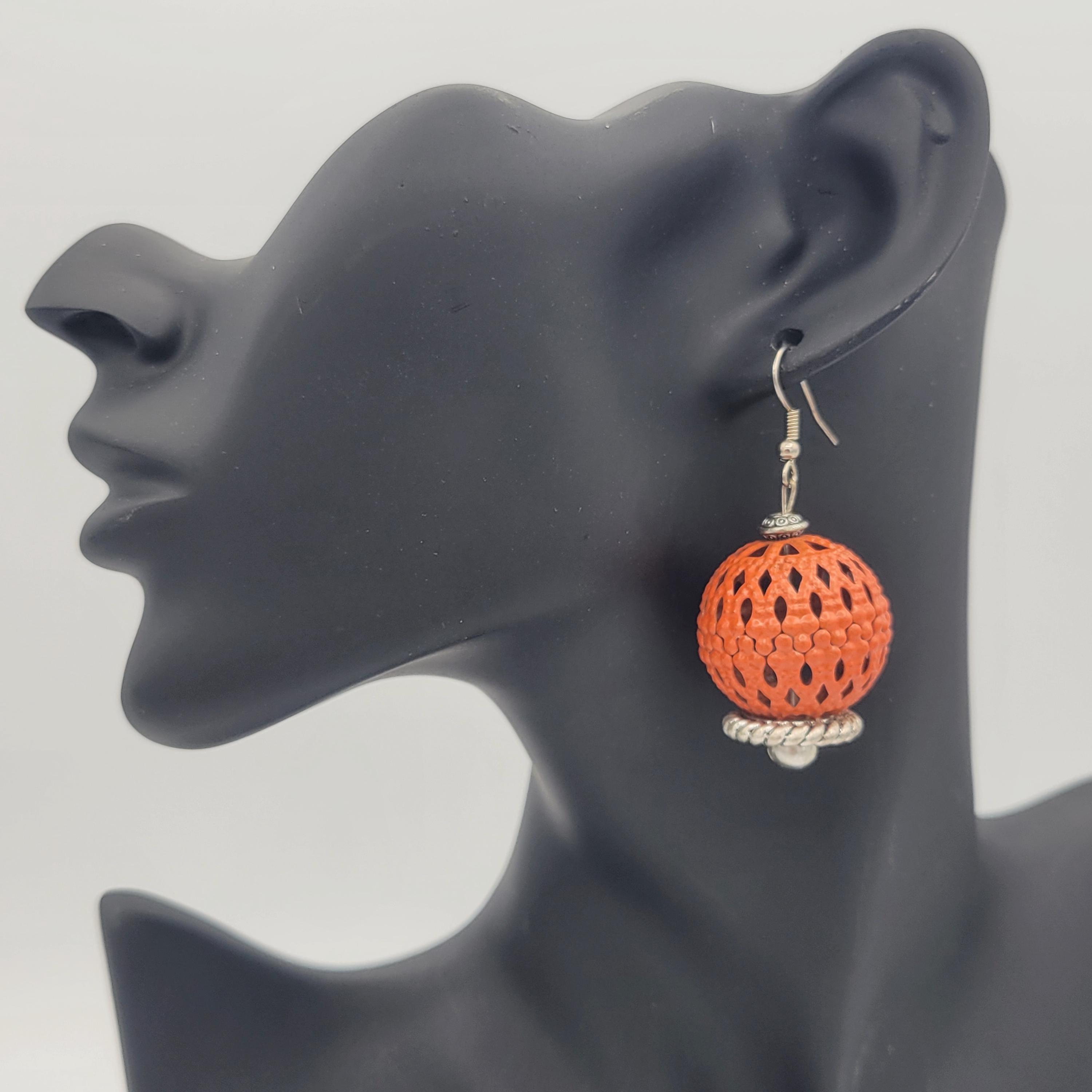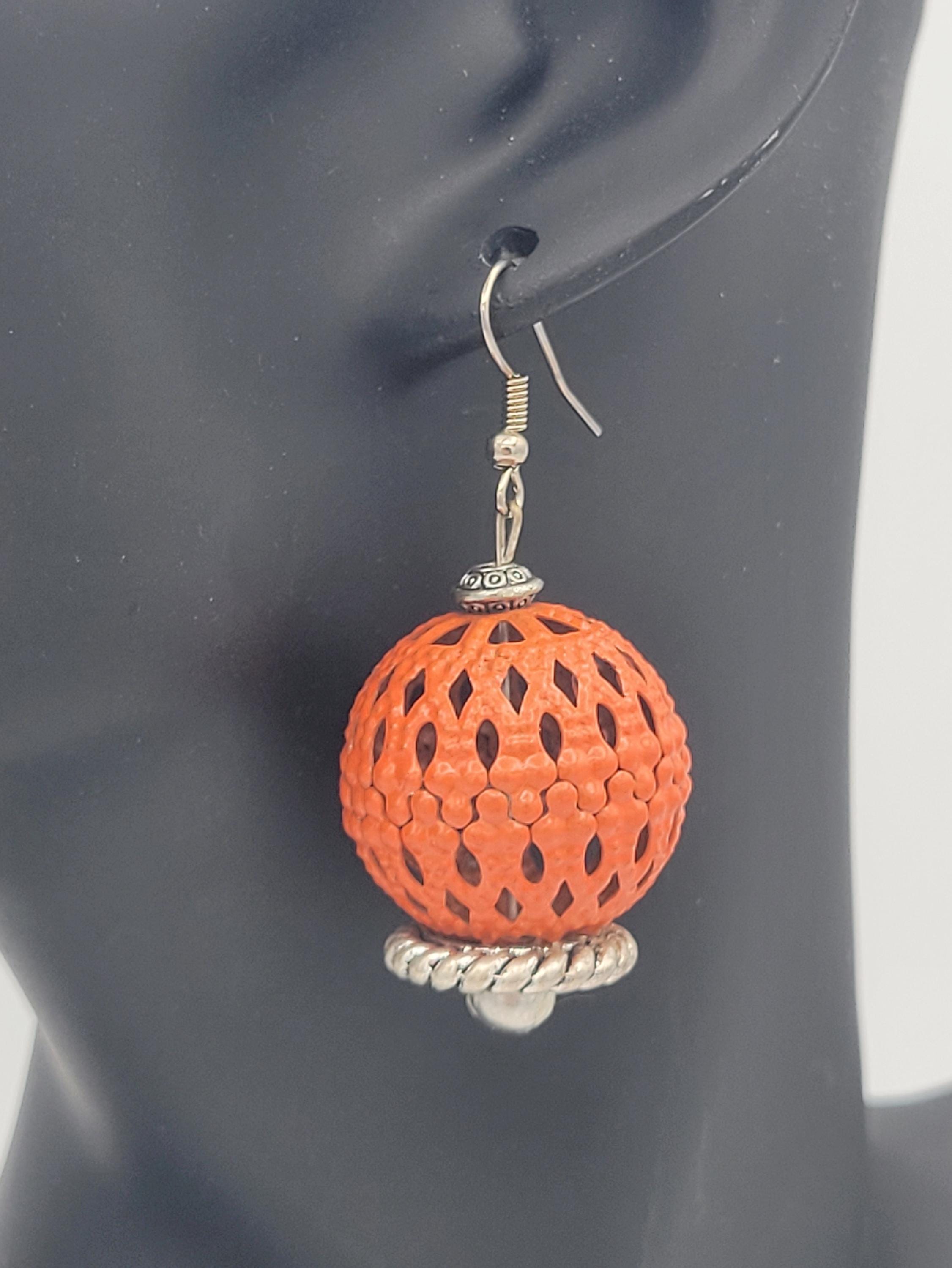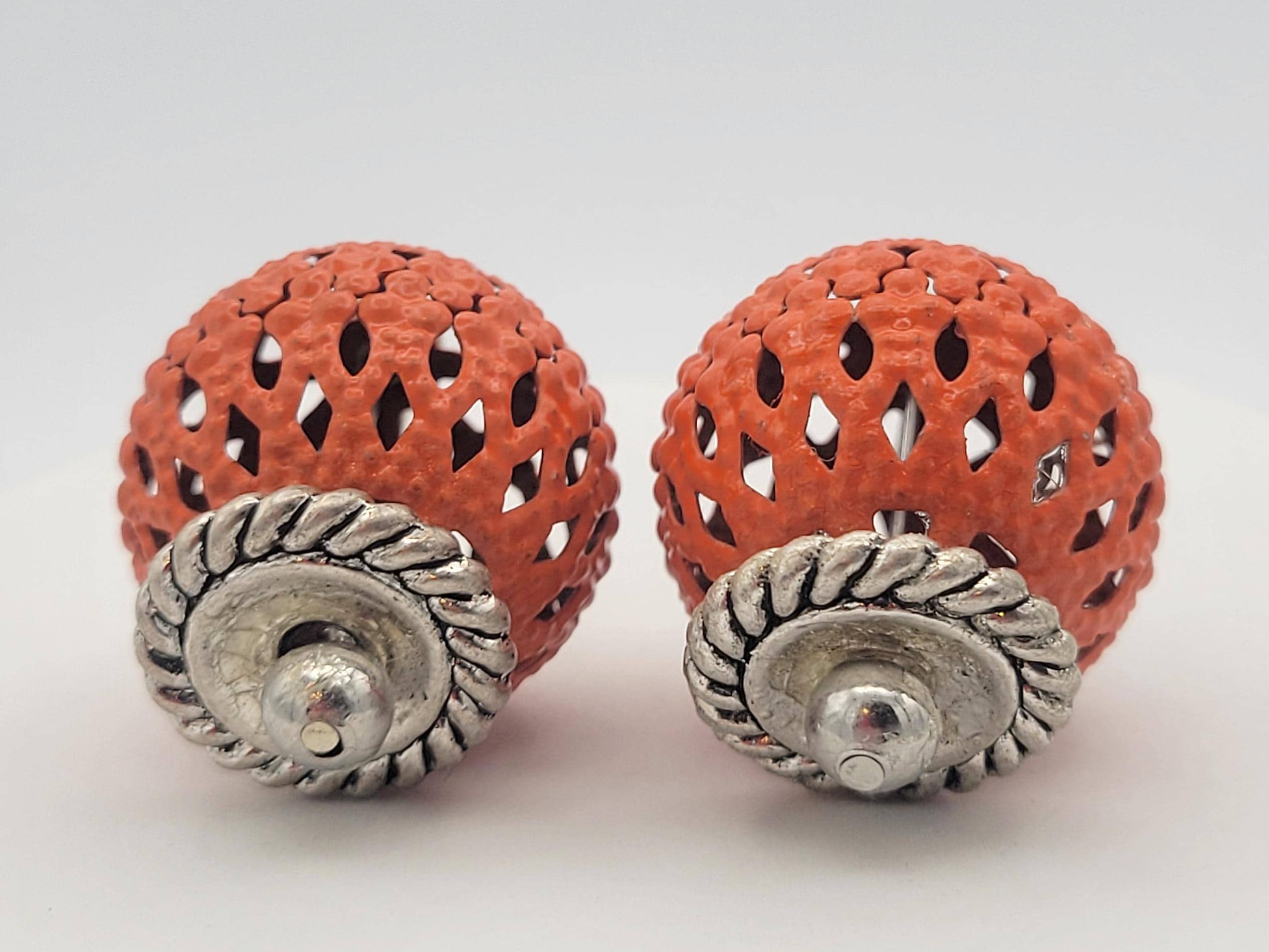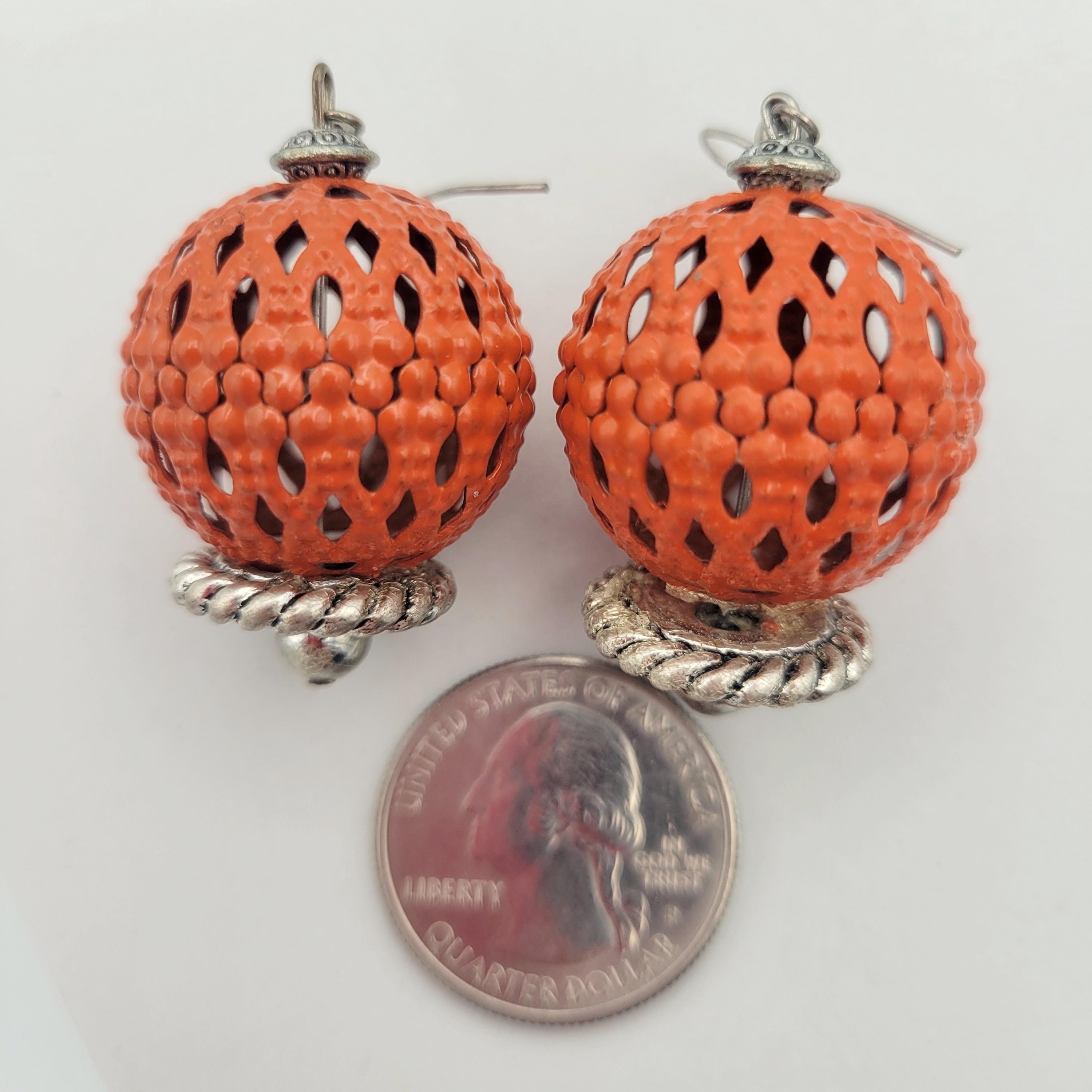 Vintage Oversize Silver Tone & Orange Enamel Openwork Sphere Dangle Earrings