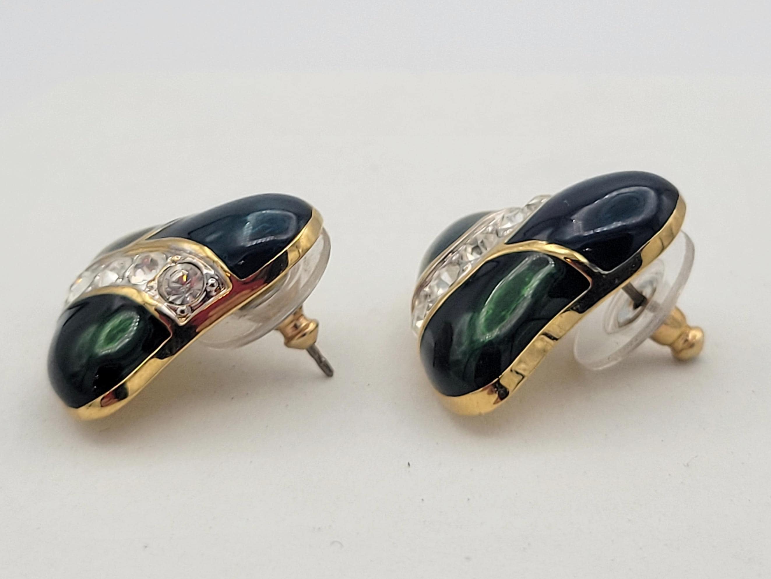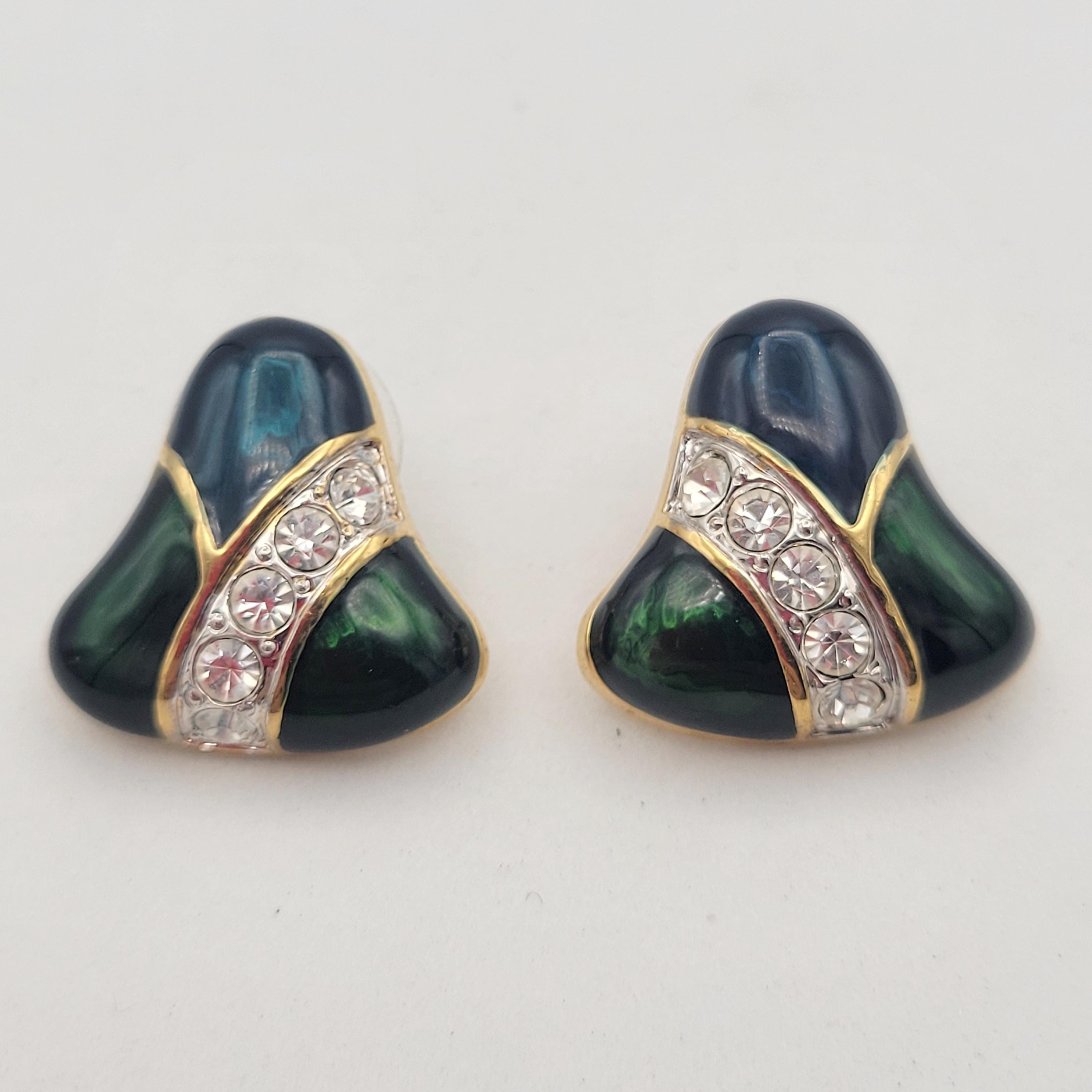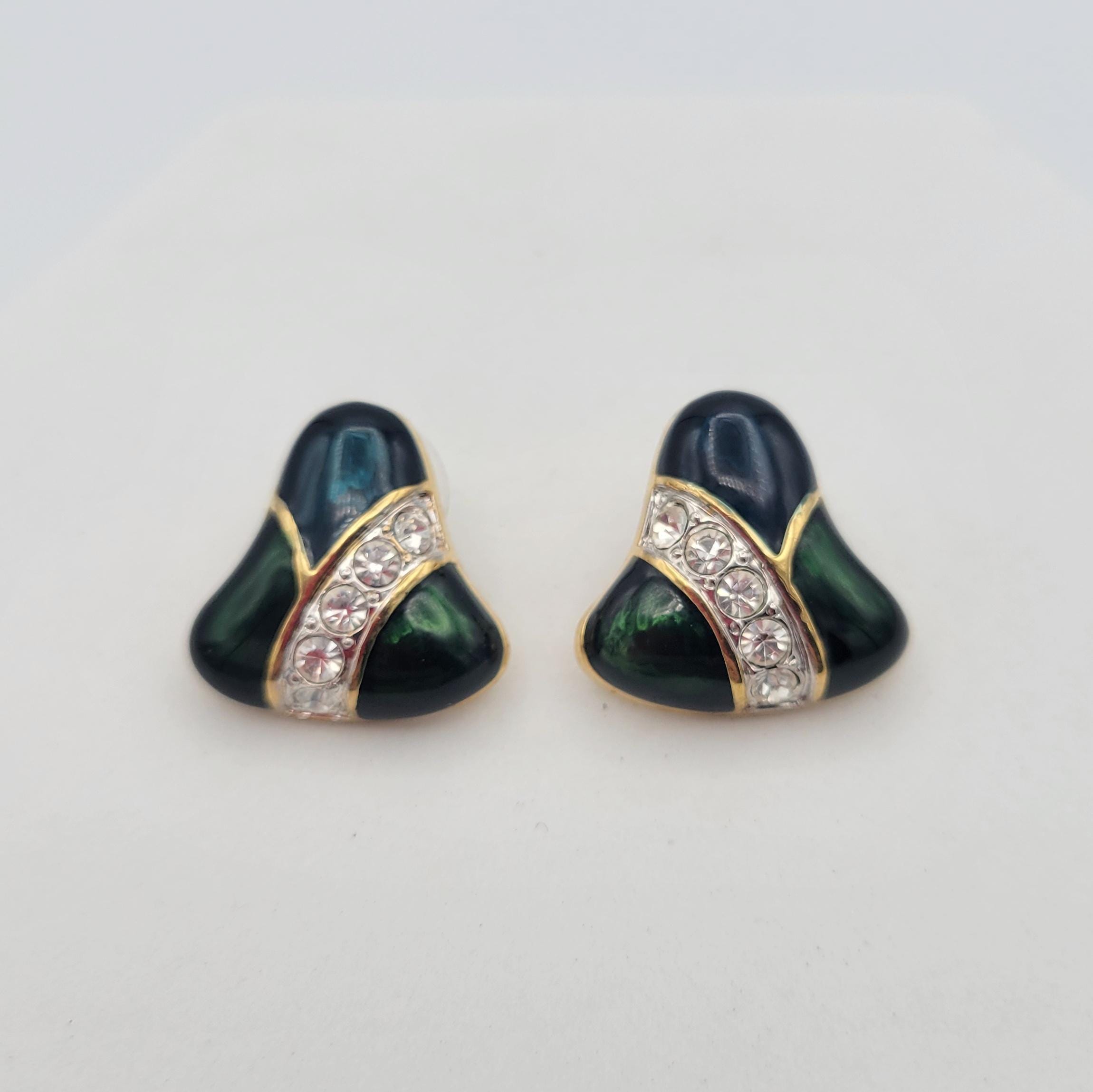 These unique earrings will add some sparkle to your ensemble. The gold-tone earrings have a slightly domed bell shape. The surface of the earrings are covered with blue & green enamel & feature a stripe filled with rhinestones. These earrings are in excellent, nearly new condition.