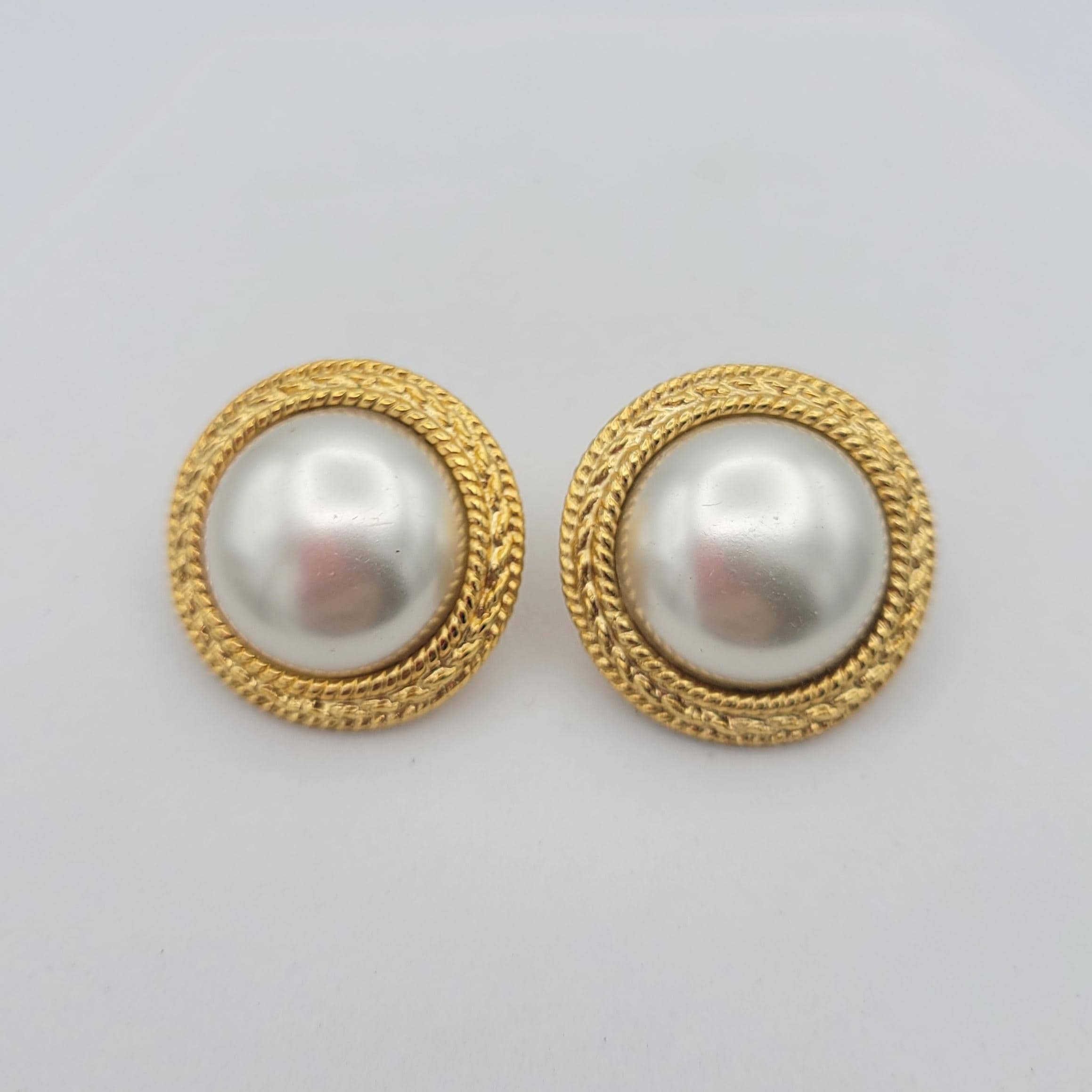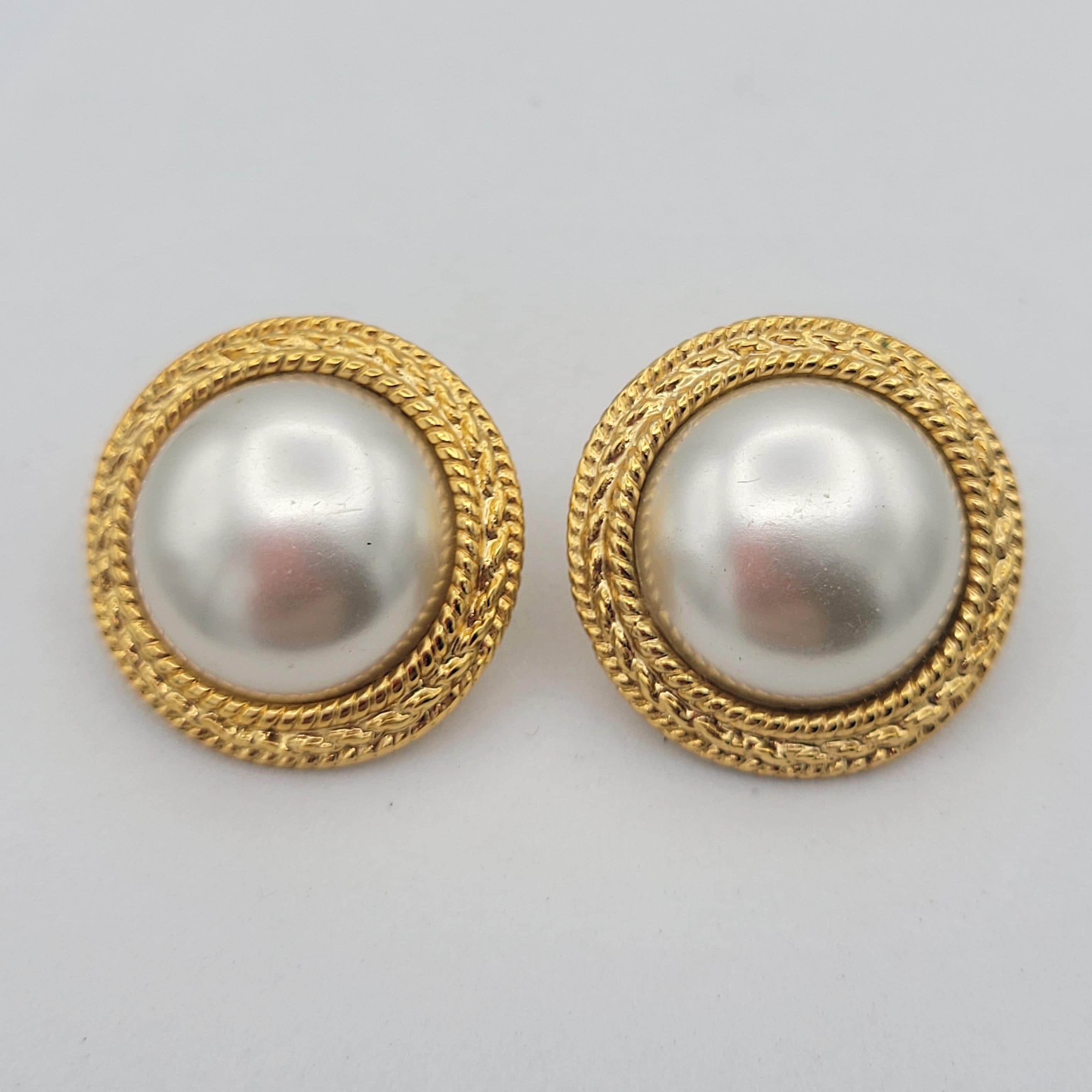 These vintage earrings from White Stag will become a staple in your jewelry wardrobe. The thick gold-tone earrings have a rope-patterned edge. In the center are white faux pearl cabochons. These earrings are in excellent, nearly new condition.
