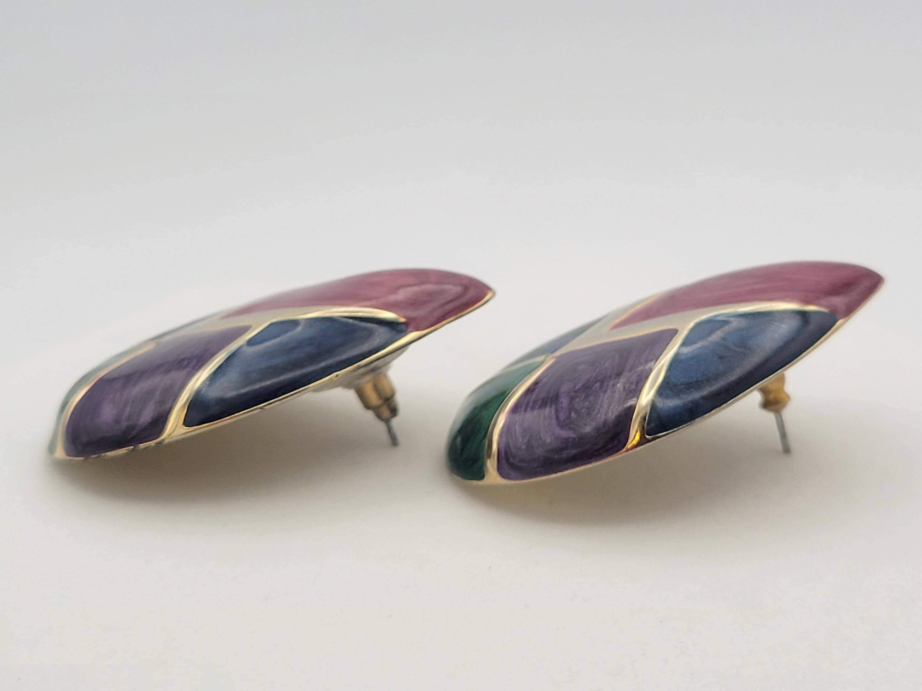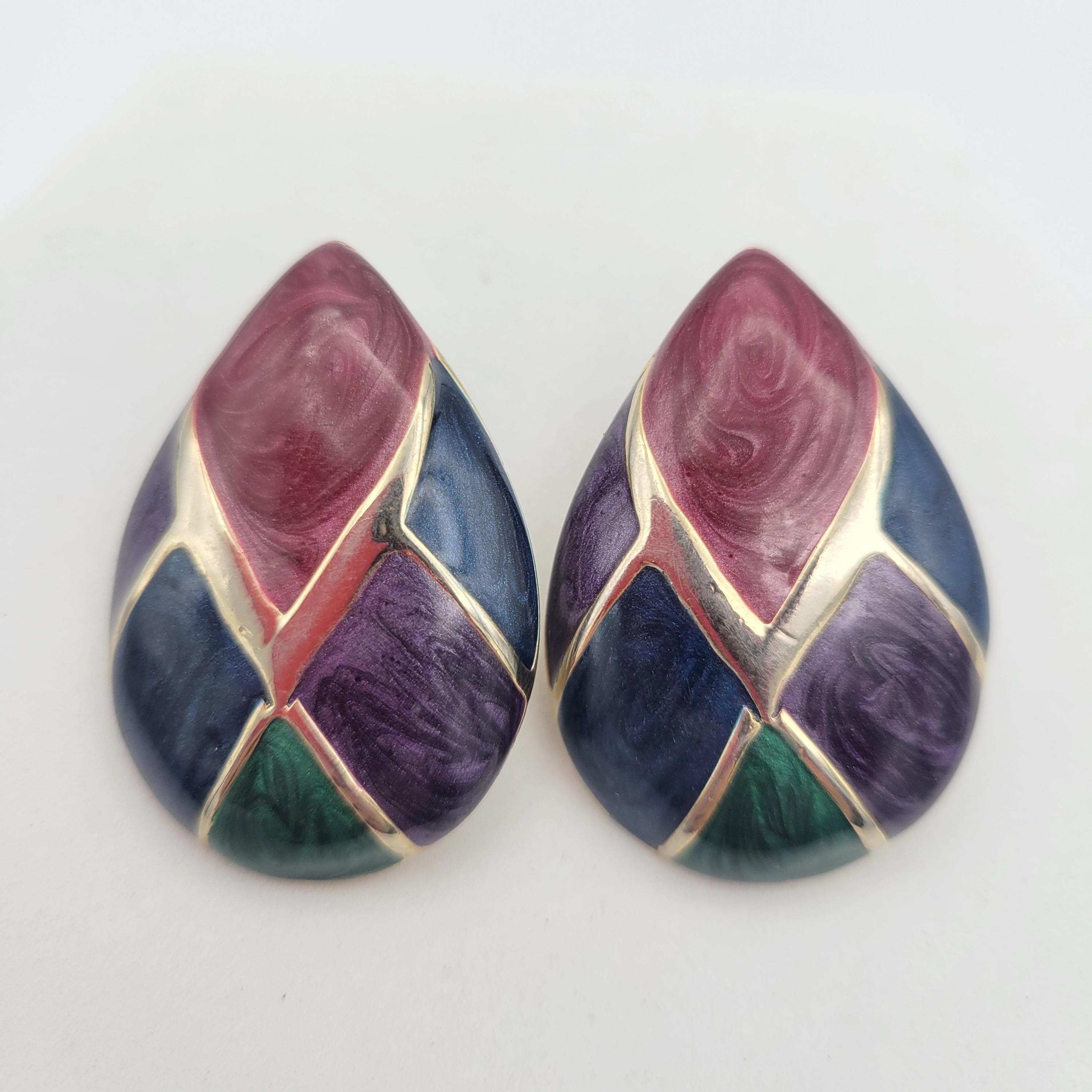 These retro earrings make great statement pieces. The hefty gold-tone earrings form a domed teardrop shape. The center of each earring is filled with sections of mauve, purple, blue & green jewel-tone enamel. These earrings are in excellent vintage condition with very little wear.