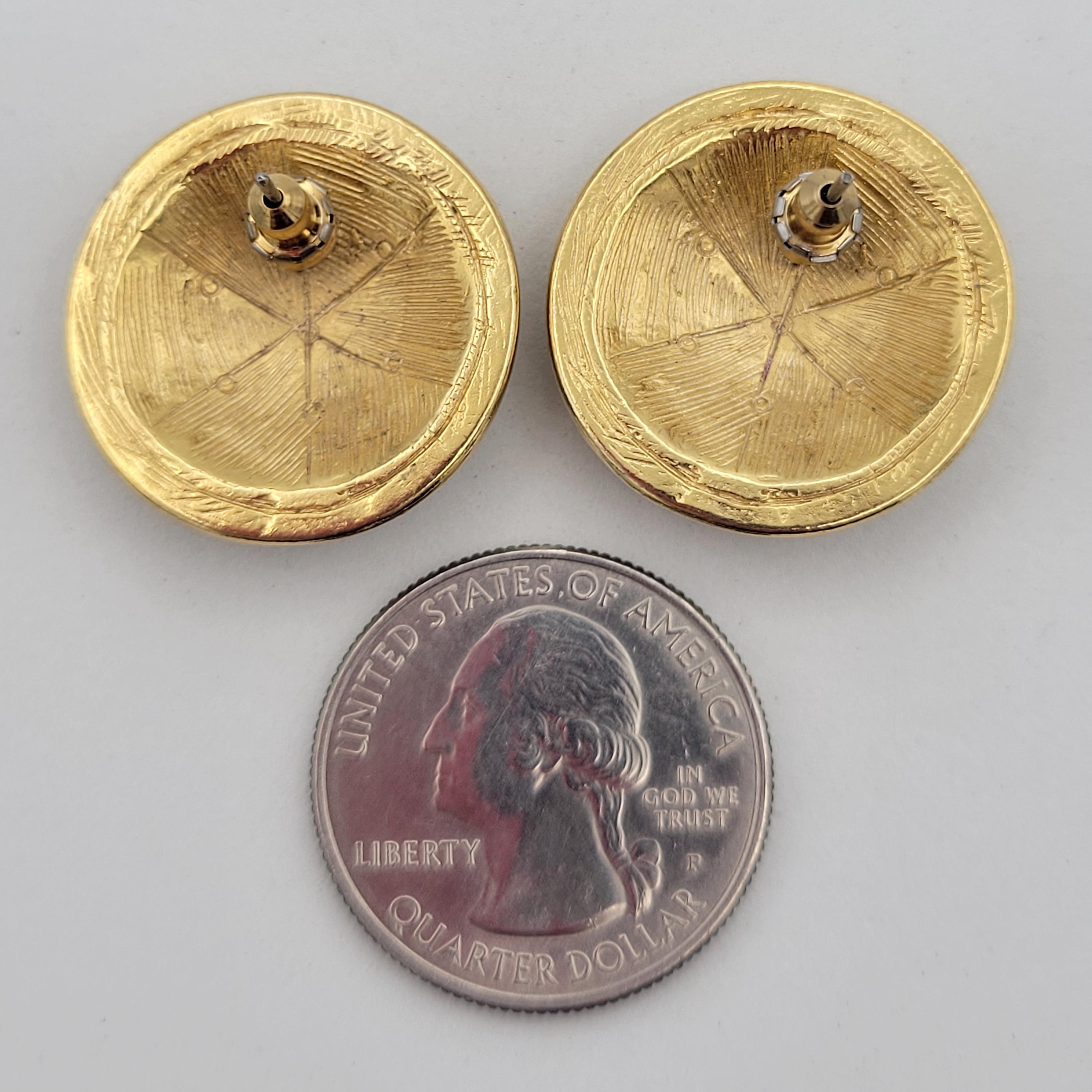 These vintage earrings have a unique design. The thick gold-tone earrings are round & domed. They have a textured pattern in the center. The center has an overlay of pale green translucent enamel. These earrings are in excellent, nearly new condition.