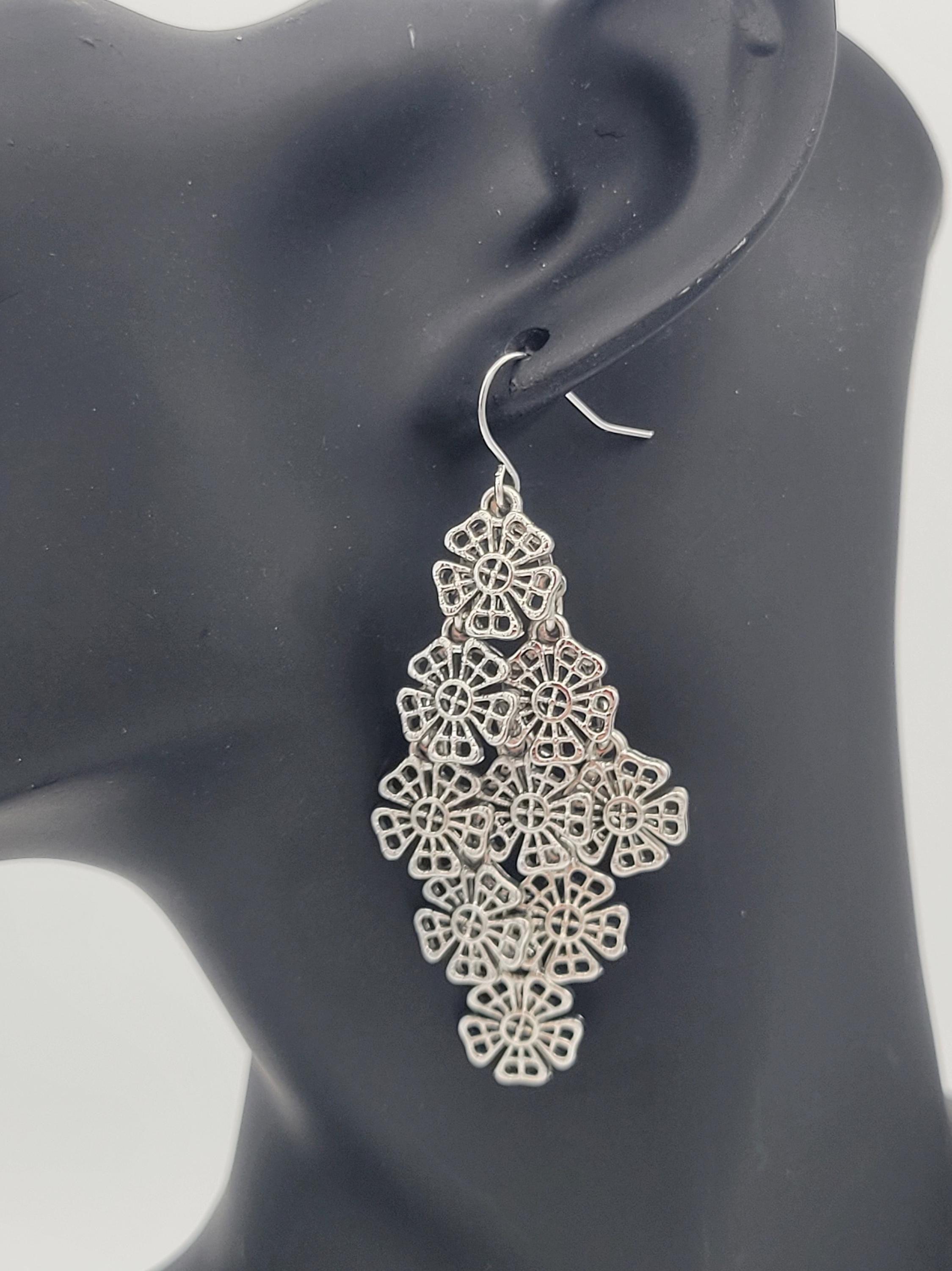 Vintage NEW Silver Tone Openwork Floral Stacked Chandelier Dangle Earrings