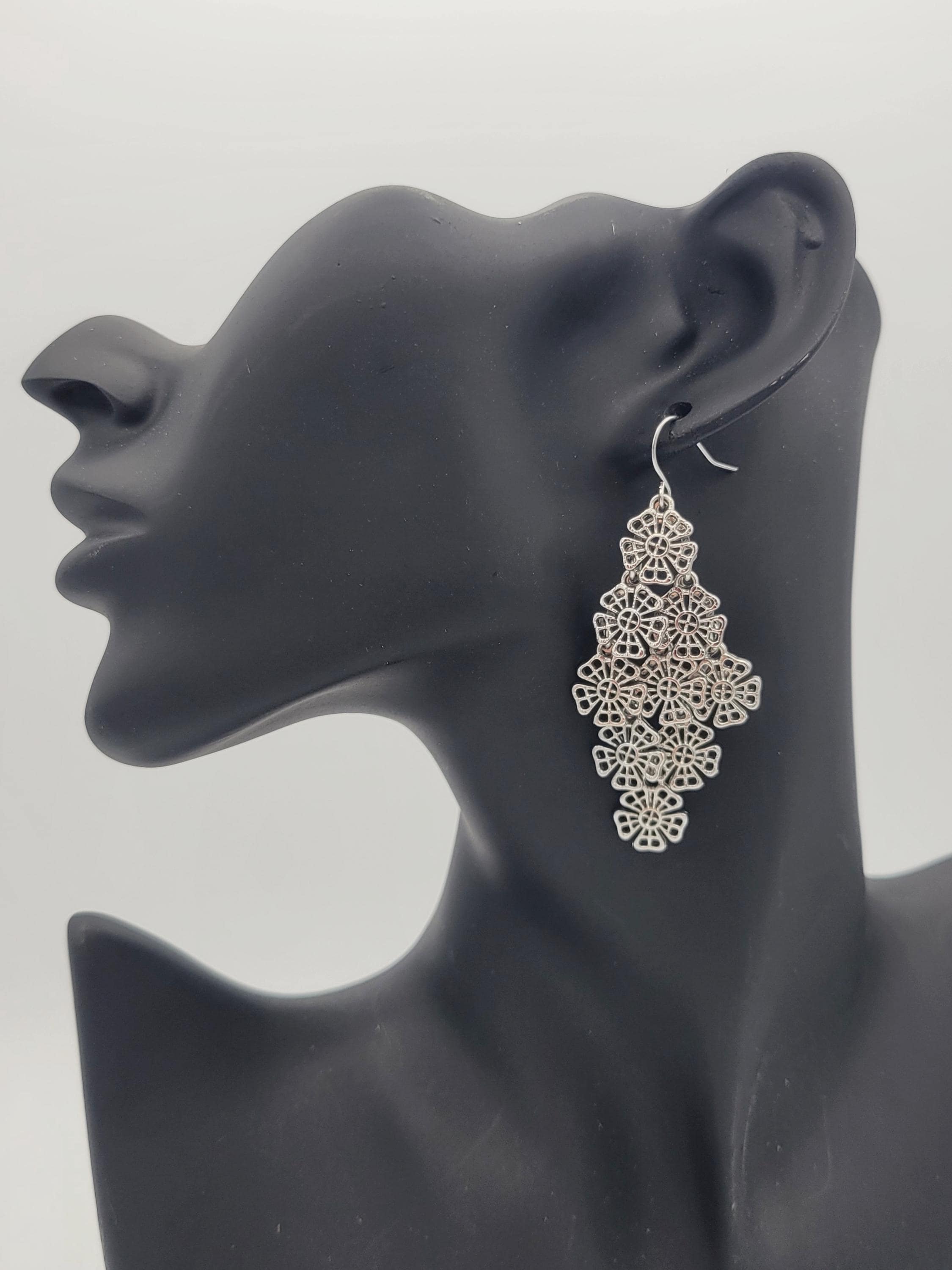 These earrings make great statement pieces. The shining silver-tone earrings feature many openwork floral dangles. The flowers are arranged on the setting to form a large diamond shape. These earrings are in excellent, brand-new condition.