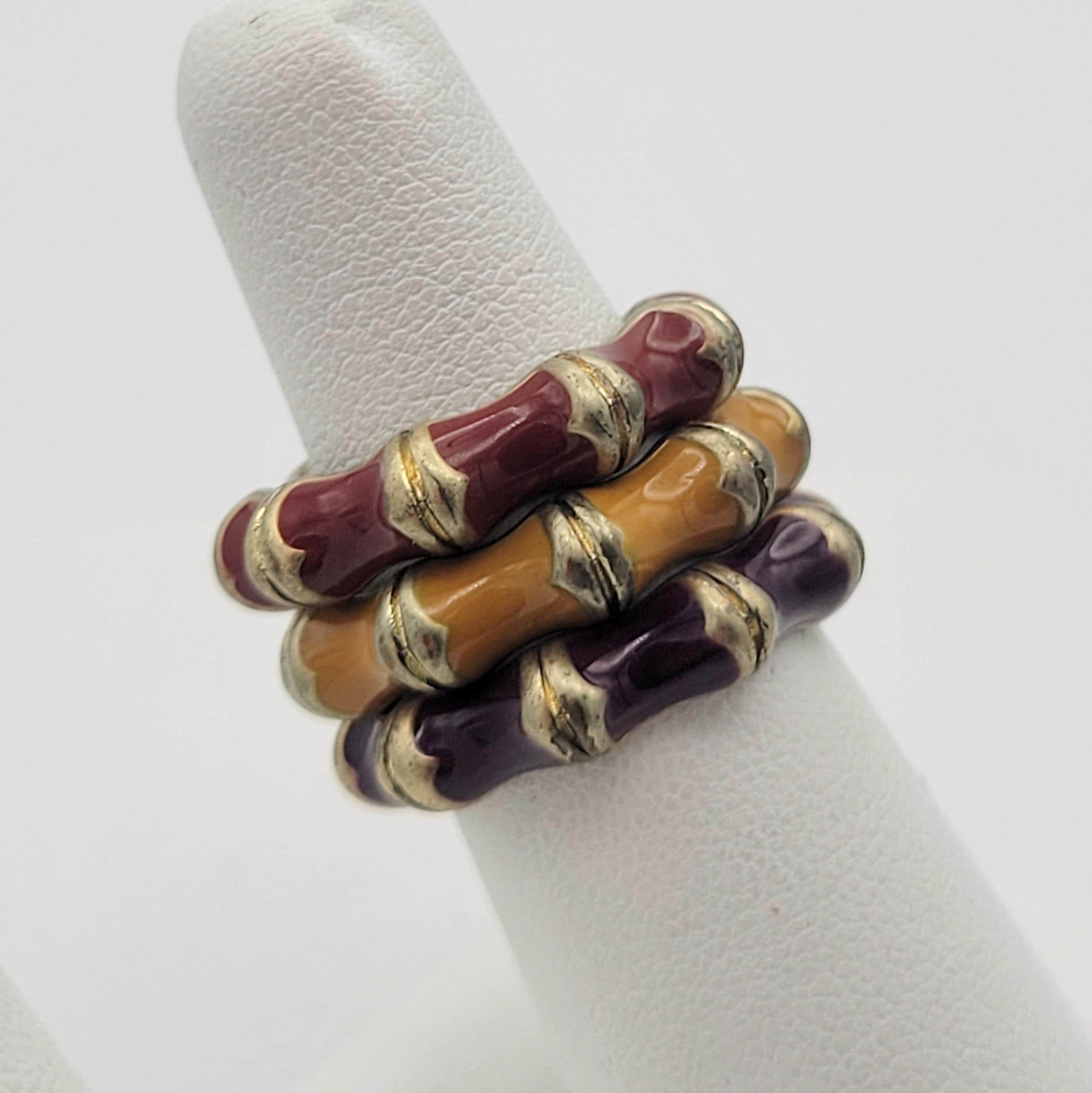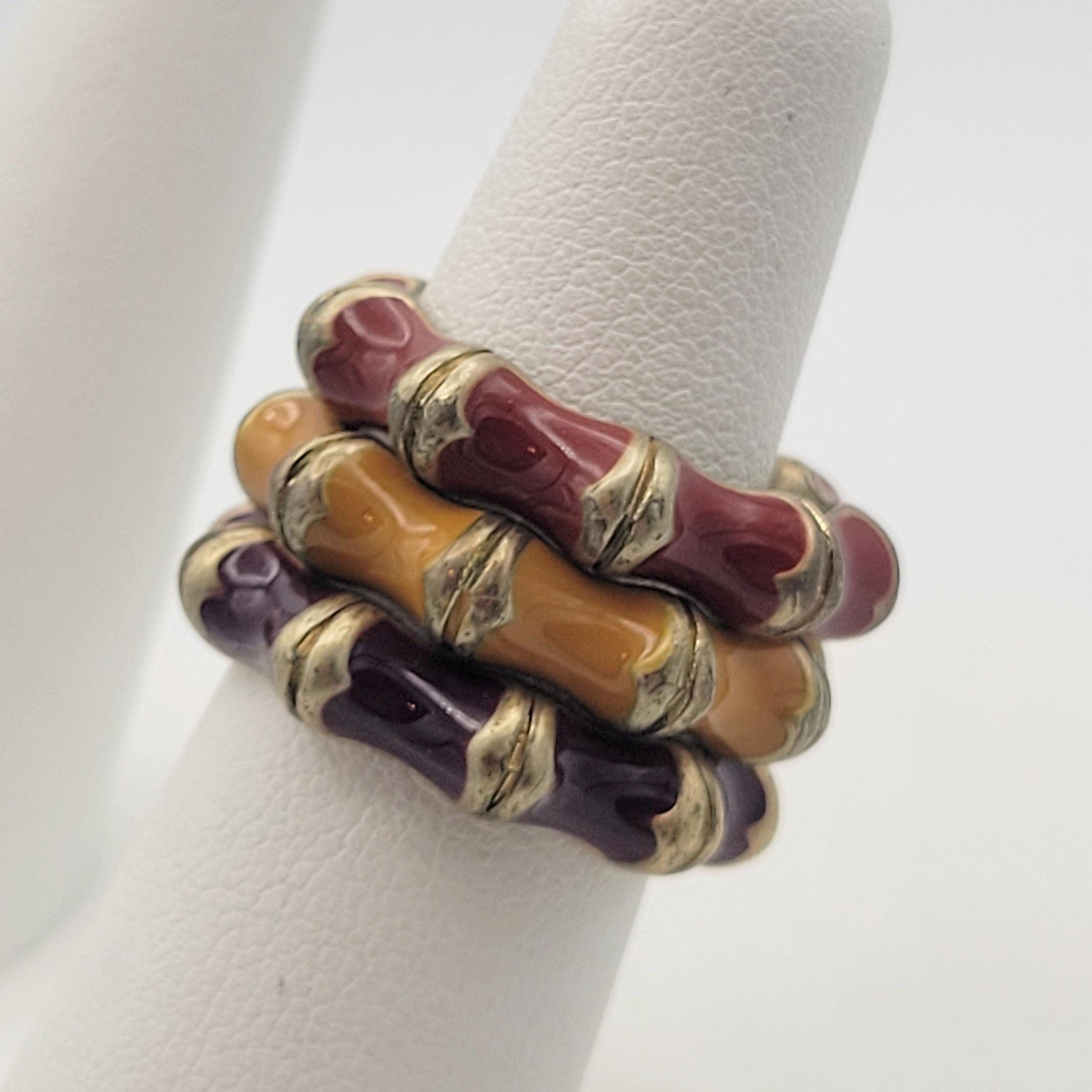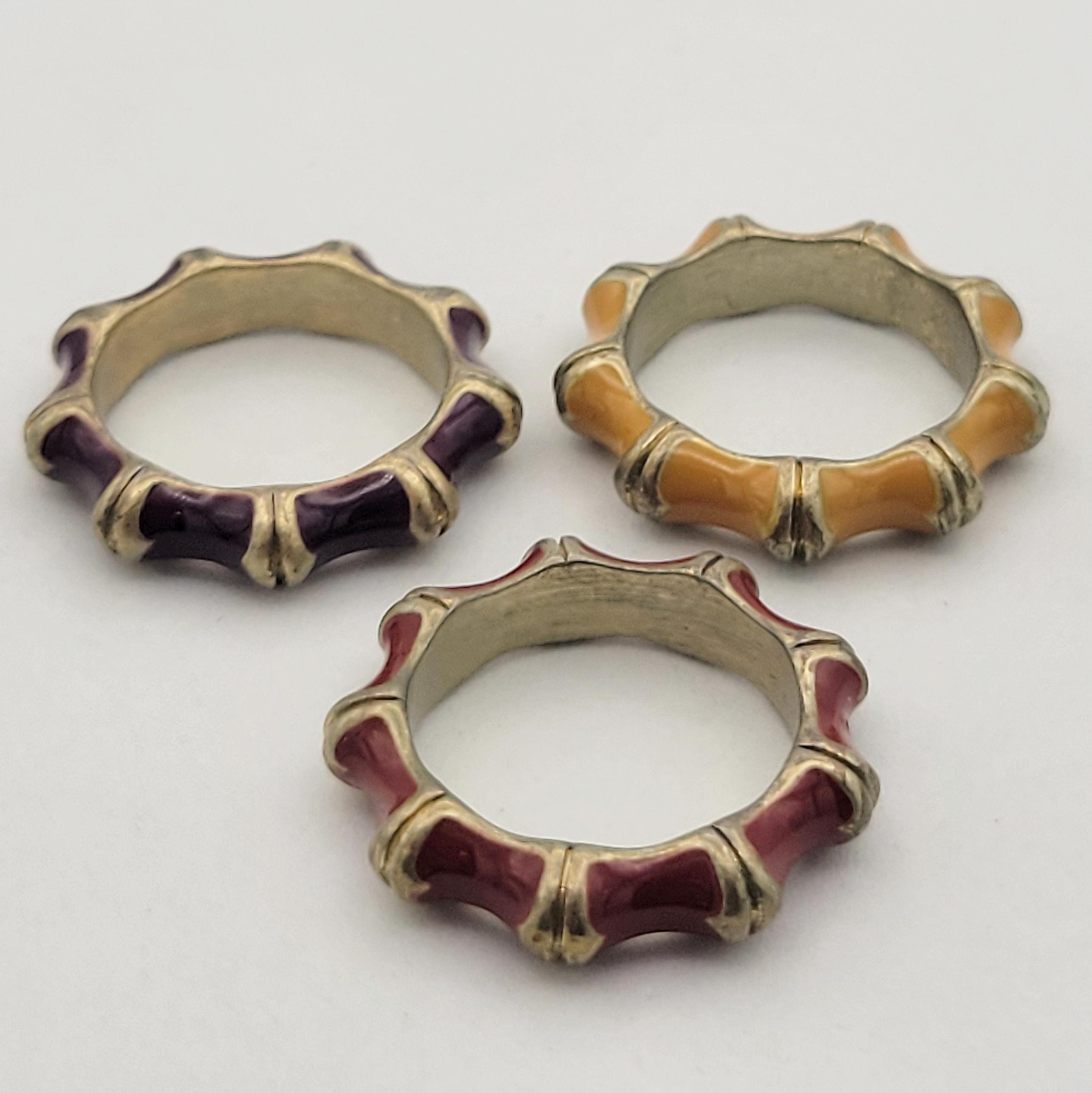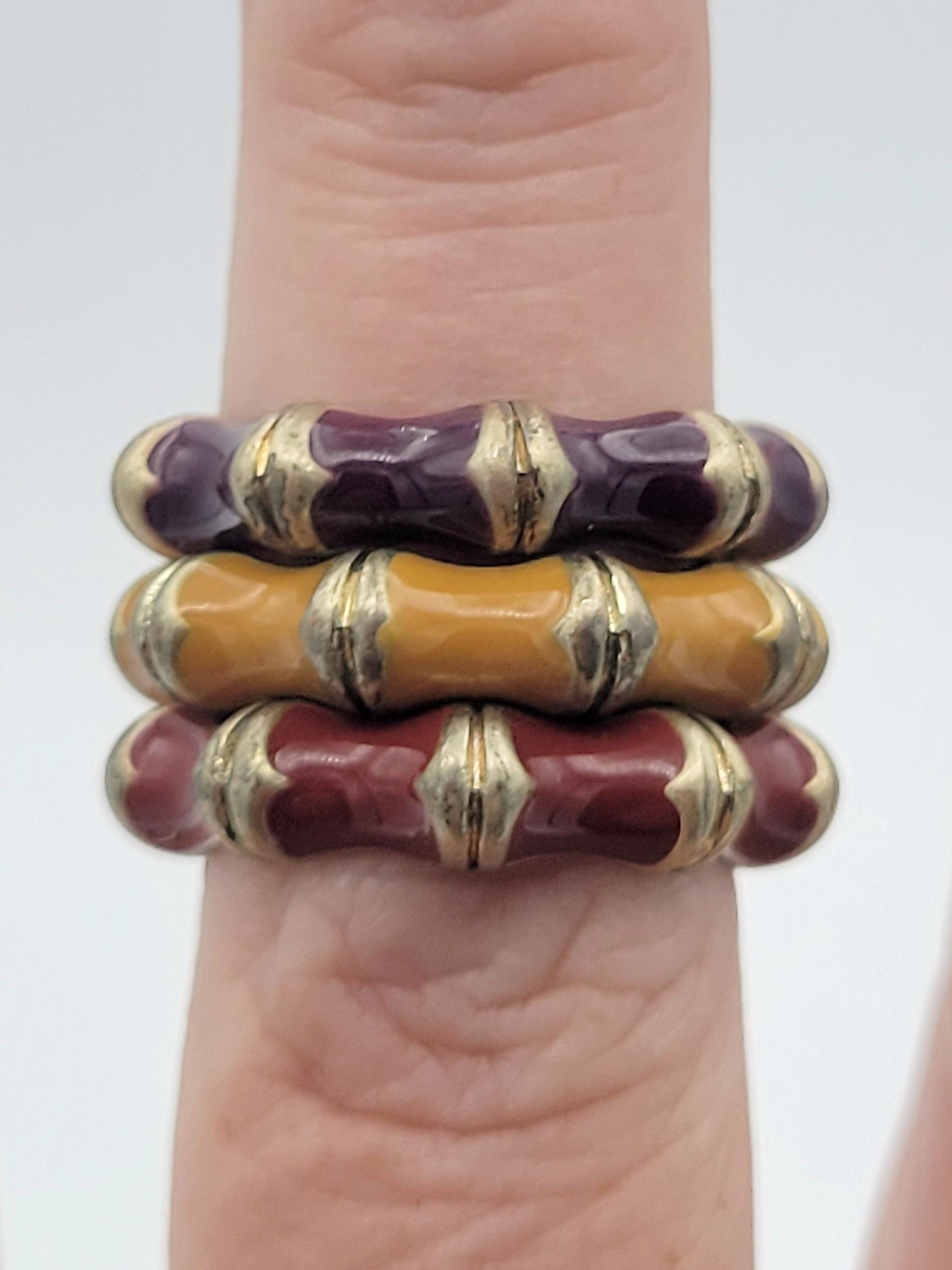 These fun rings will add some color to your ensemble. The gold-tone bands have convex scallops on the outside edge that are filled with red, yellow or purple enamel. You can wear all 3 rings stacked together or separately. These rings are in excellent vintage condition with very little wear. They may need cleaning.