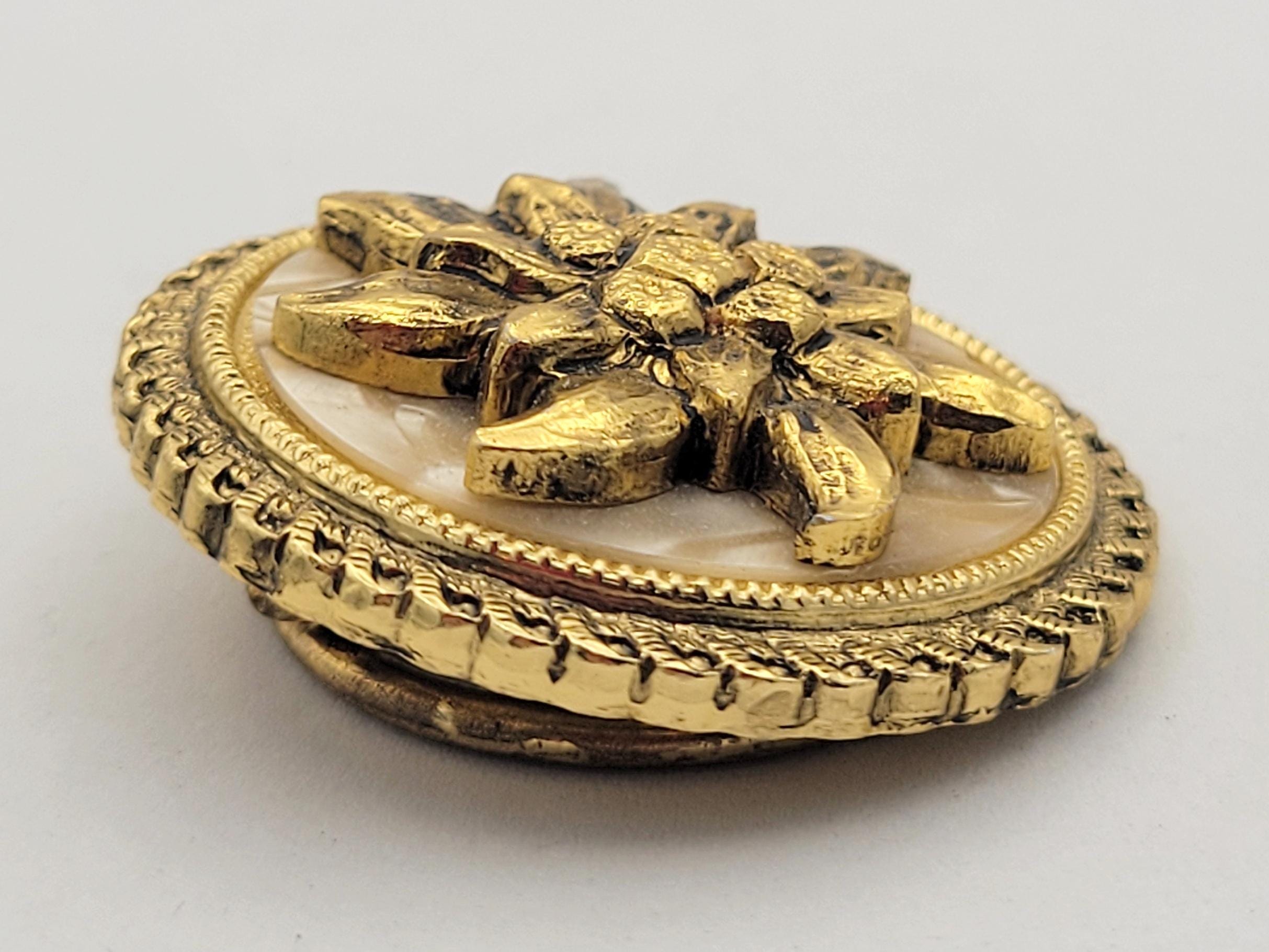 This intricate scarf clip makes a great statement piece. The gold-tone clip is affixed to a round piece that has a rope-patterned edge. The center of the piece has a Mother-of-Pearl base with a gold-tone floral piece on top. This piece is in excellent vintage condition with very little wear.