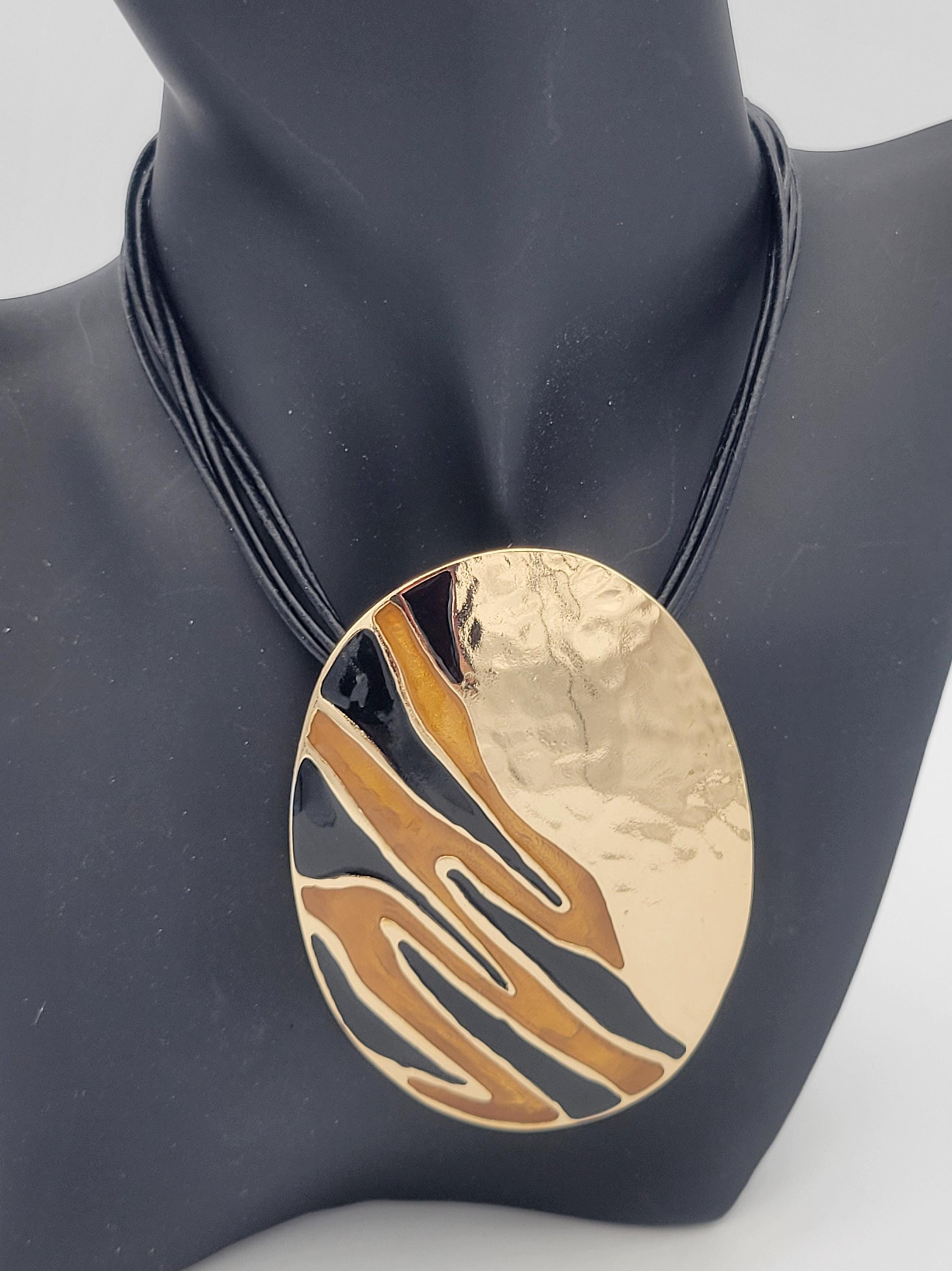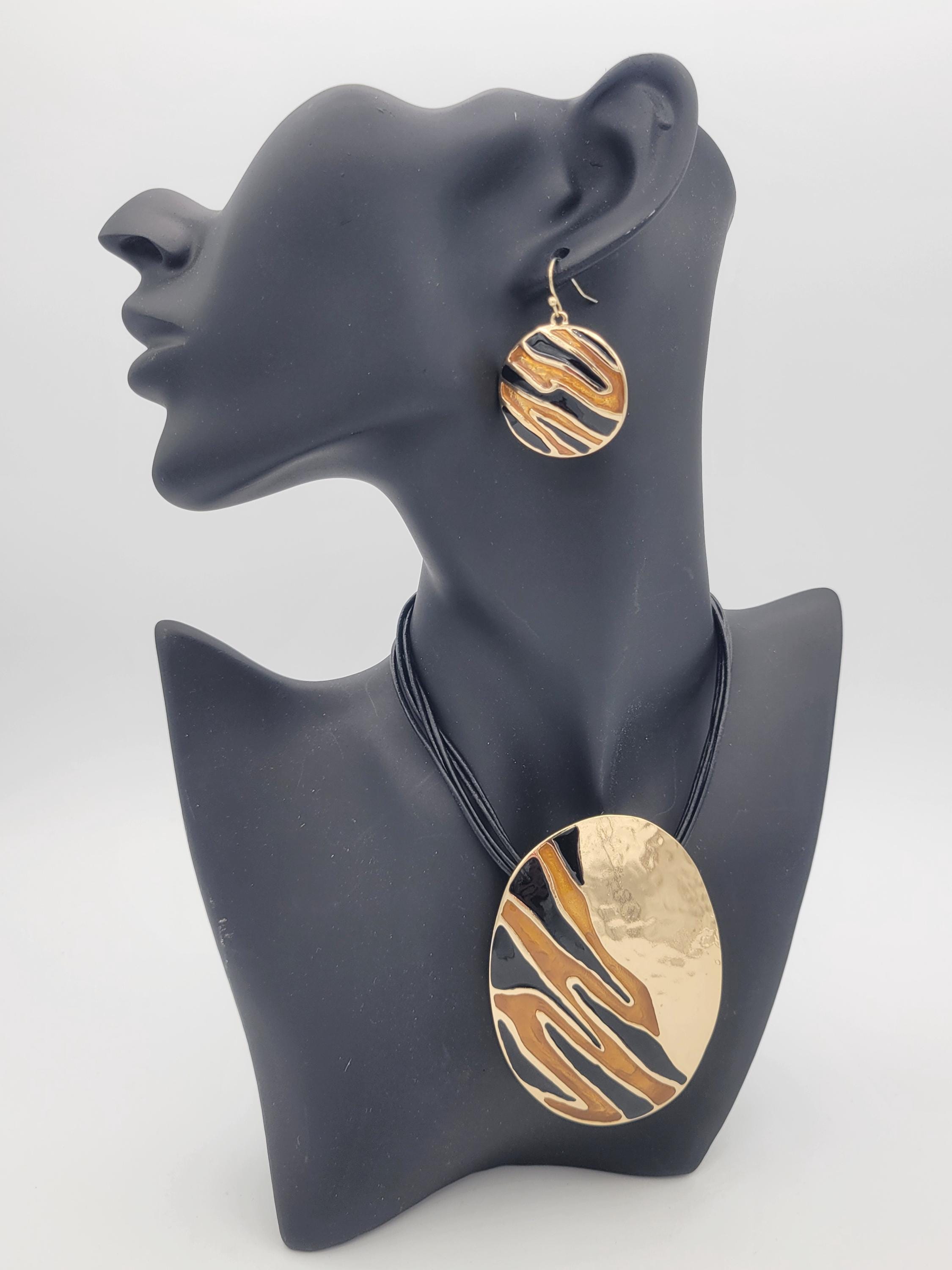 This bold jewelry set is sure to catch attention. The 5-strand black leather corded necklace is adjustable for length & secures with a lobster claw clasp. The pendant on the necklace is a large gold-tone oval disc that is slightly domed. The piece has a hammered texture & features stripes on one side that are filled with black & yellow enamel. The round dangle earrings feature circular discs that are slightly domed with the same striped enamel design. This set is in excellent vintage condition with very little wear.