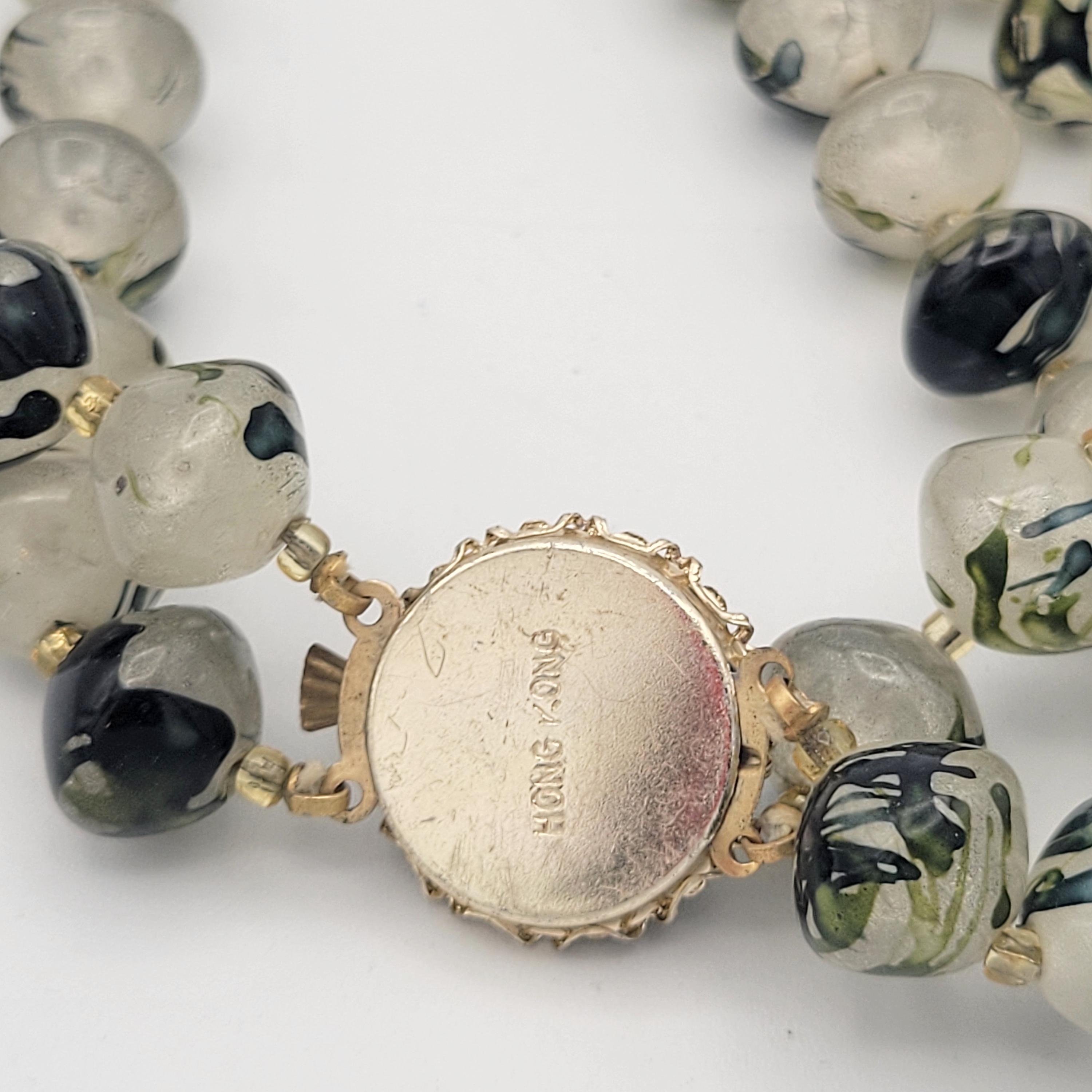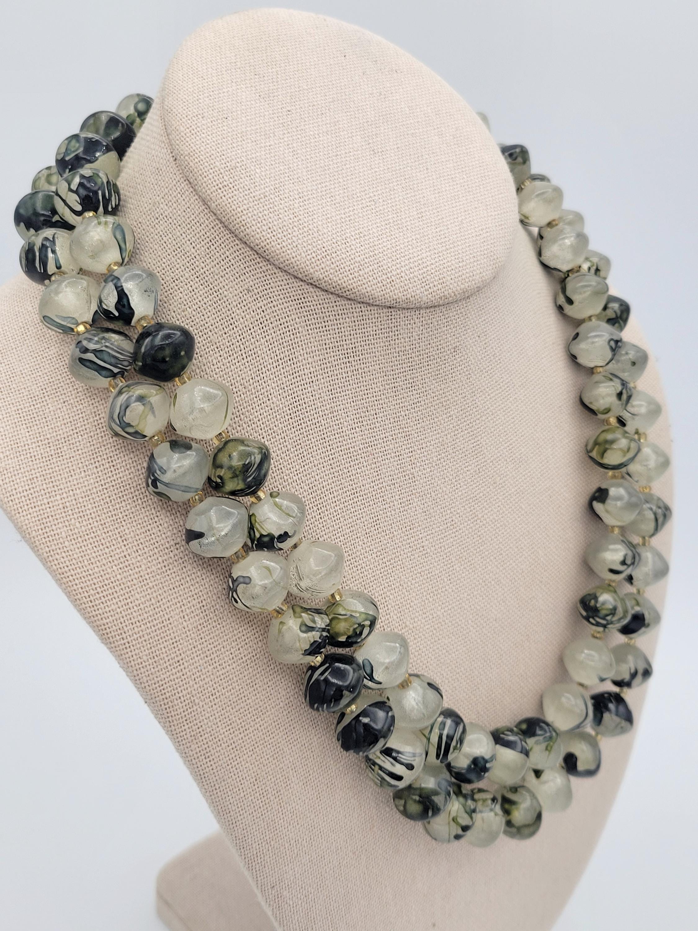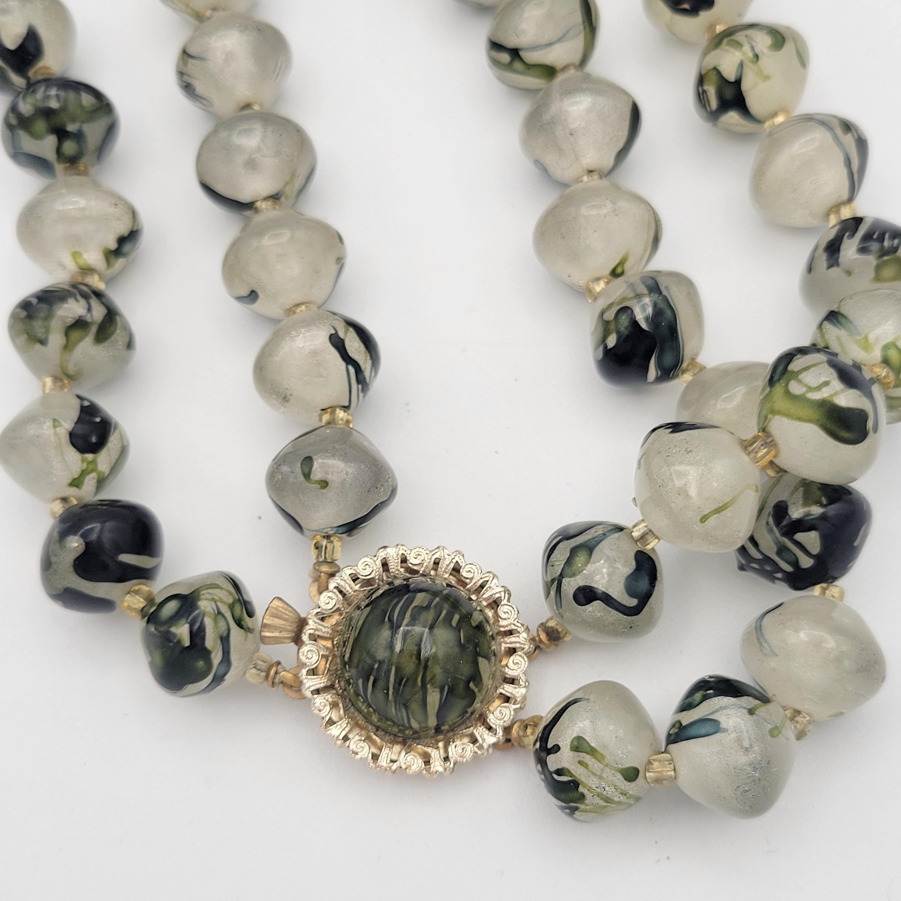 Vintage 1960s Two Strand Green Marbled Beaded Chunky Necklace with Box Clasp