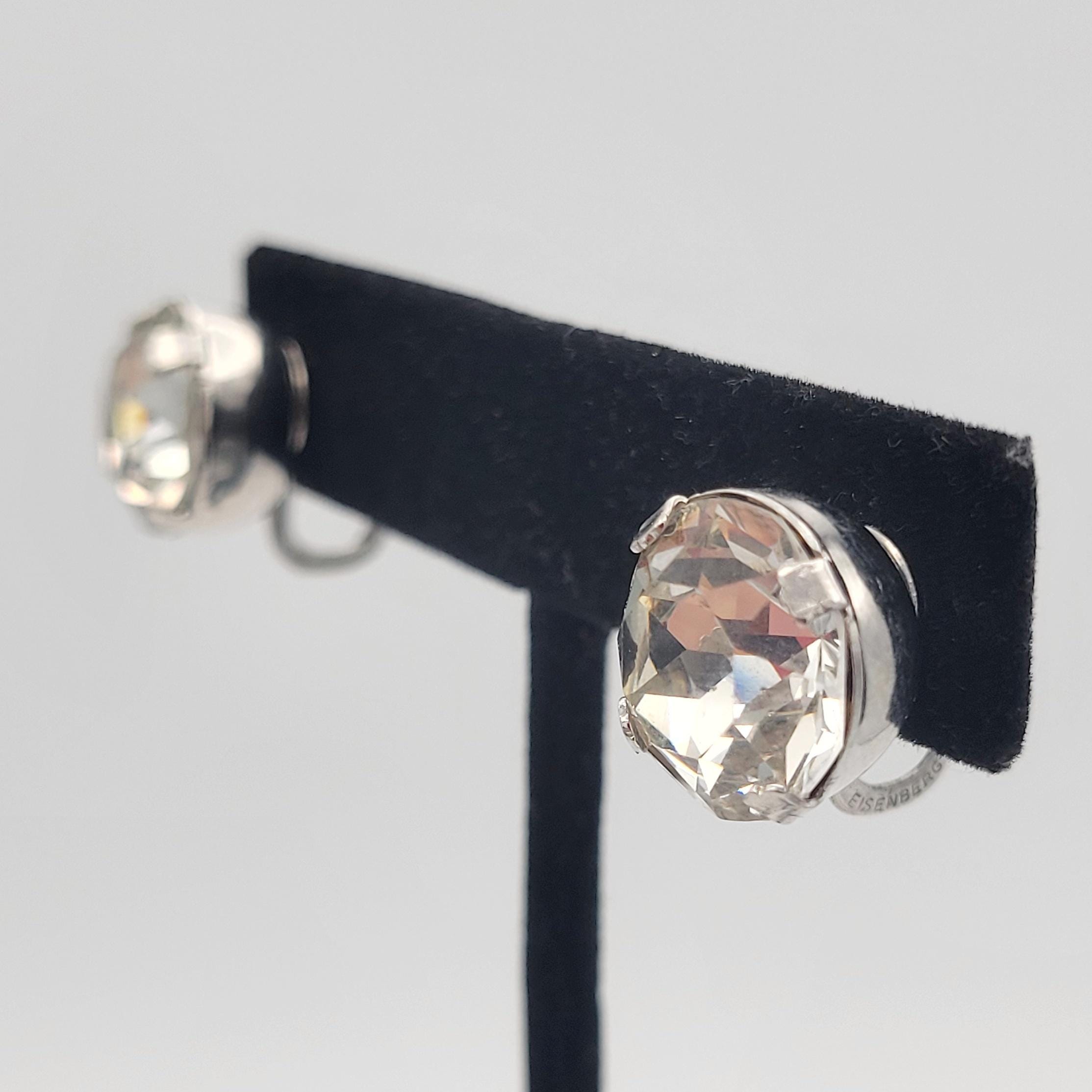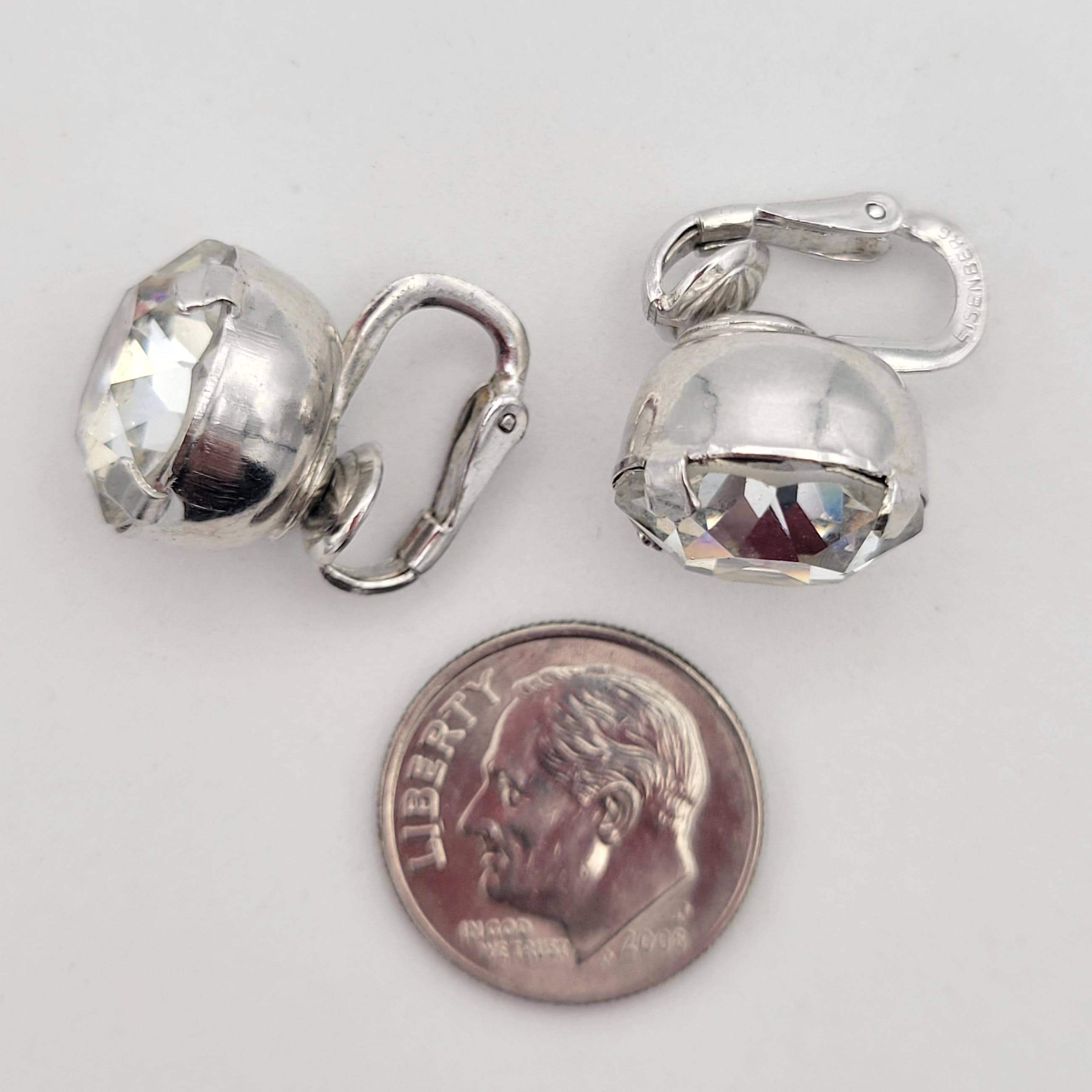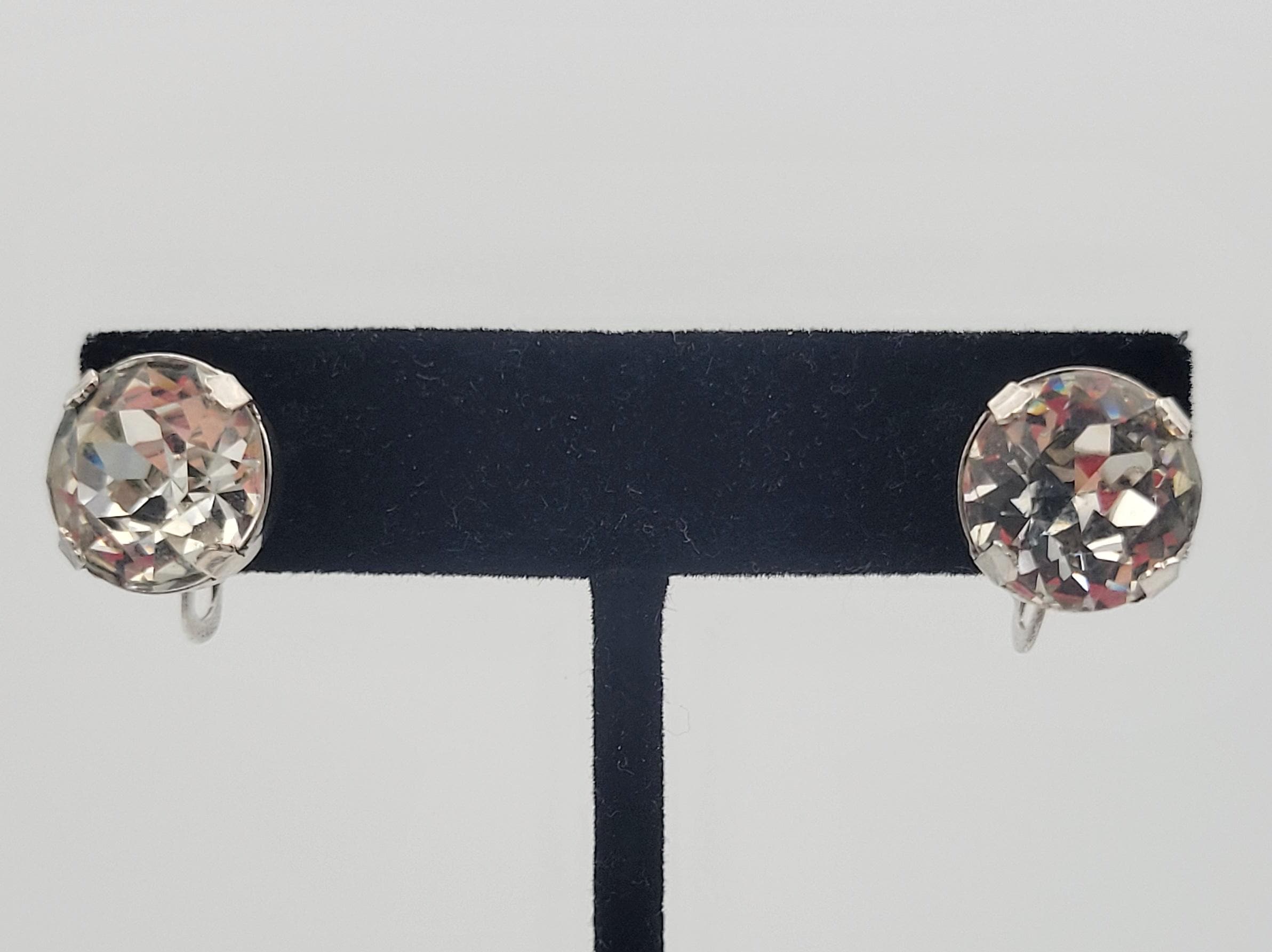 Vintage Oversize Silver Tone & Clear Faceted Rhinestone Clip On Stud Earrings