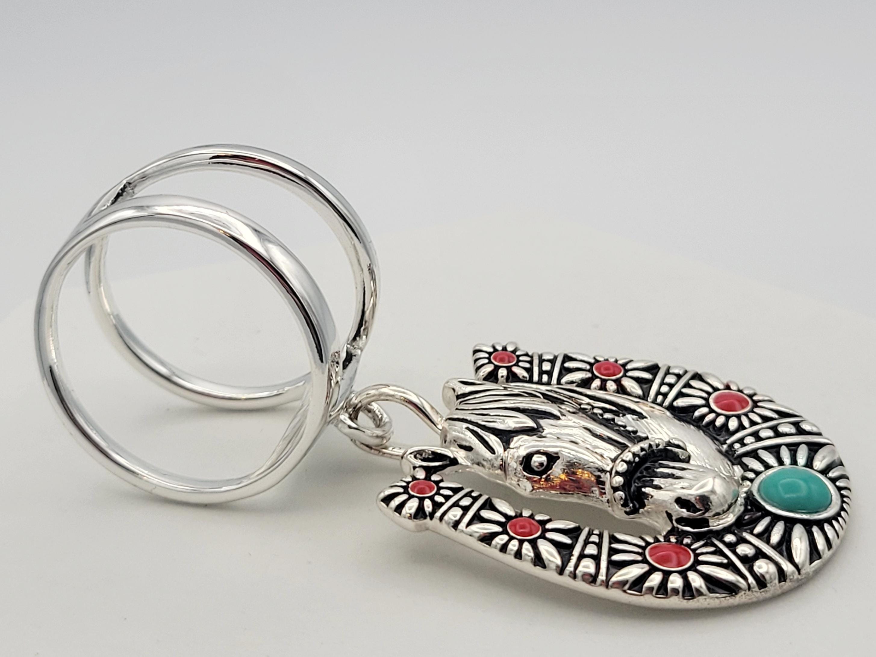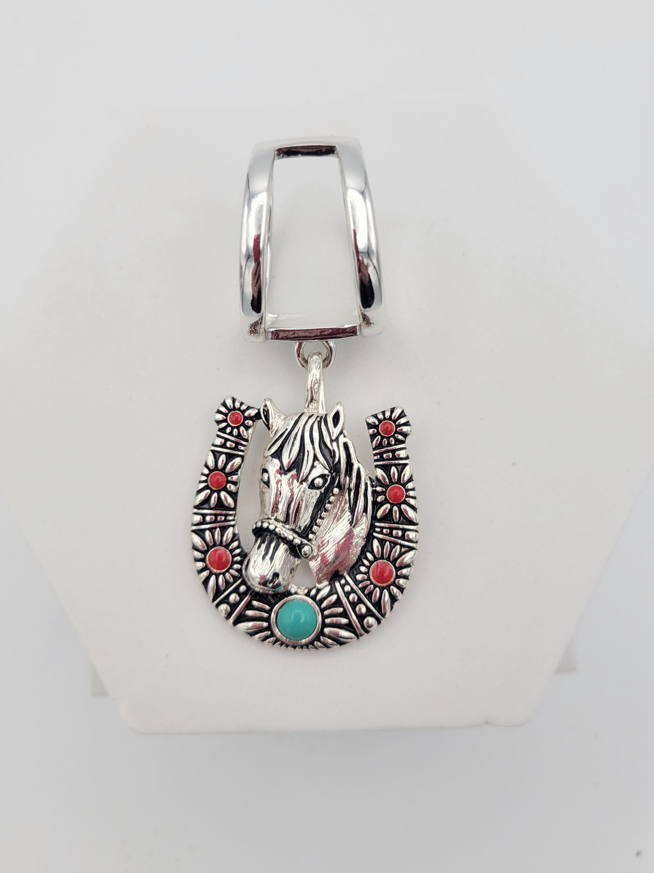 This scarf slide is perfect for the horse lover. The shining silver-tone openwork slide features a large horseshoe-shaped dangle with a horse head in the center. The dangle is accented with black enamel & features red & aqua-colored cabochons. This piece is in excellent, brand-new condition.