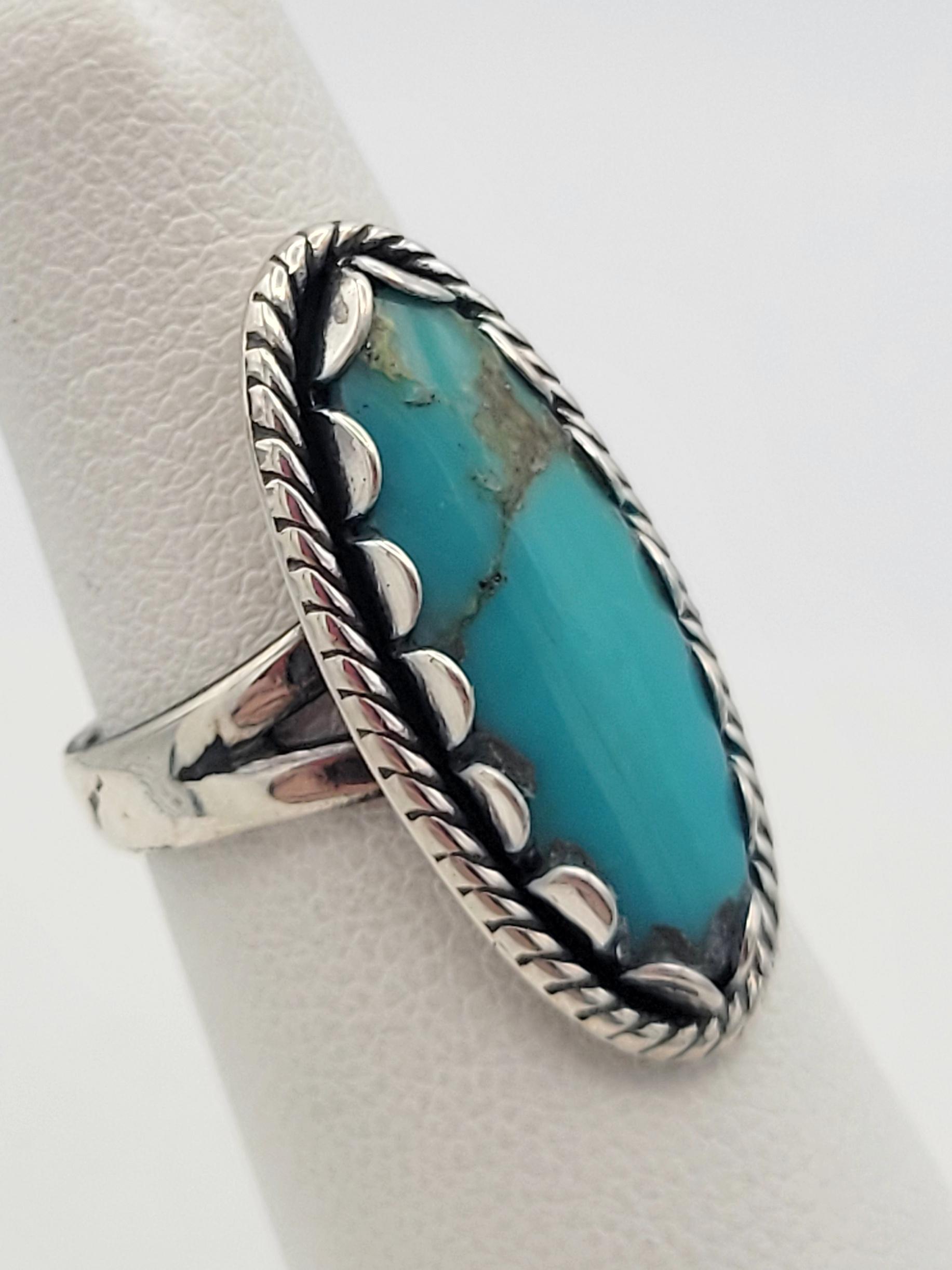 This vintage statement ring is perfect for the turquoise lover. The sterling silver band forms an elongated oval-shaped setting that holds an oval marbled turquoise cabochon. The setting has a rope-patterned edge with scalloped prongs. The ring is marked "sterling" inside of the band. It is in excellent vintage condition with very little wear.