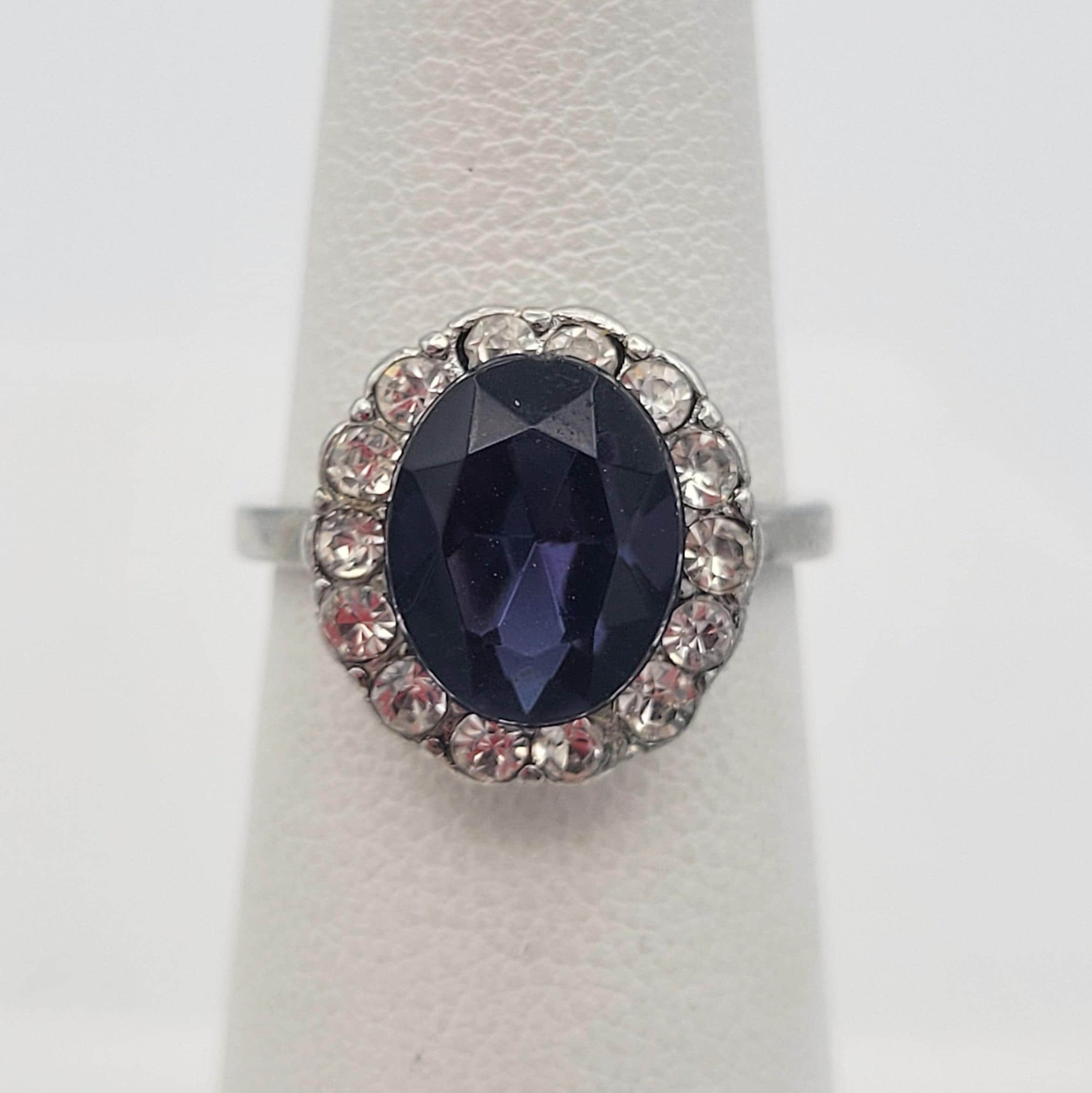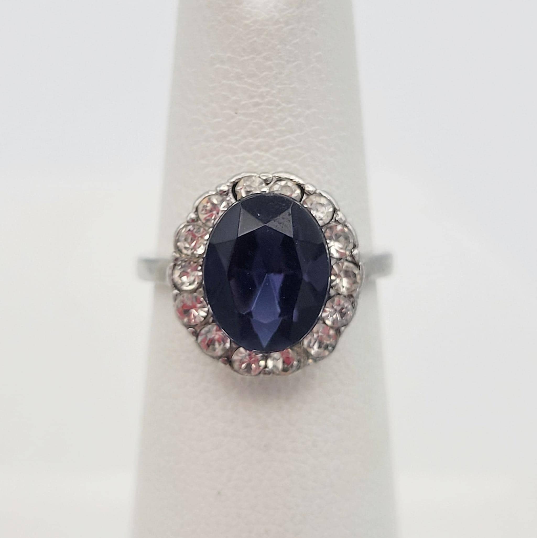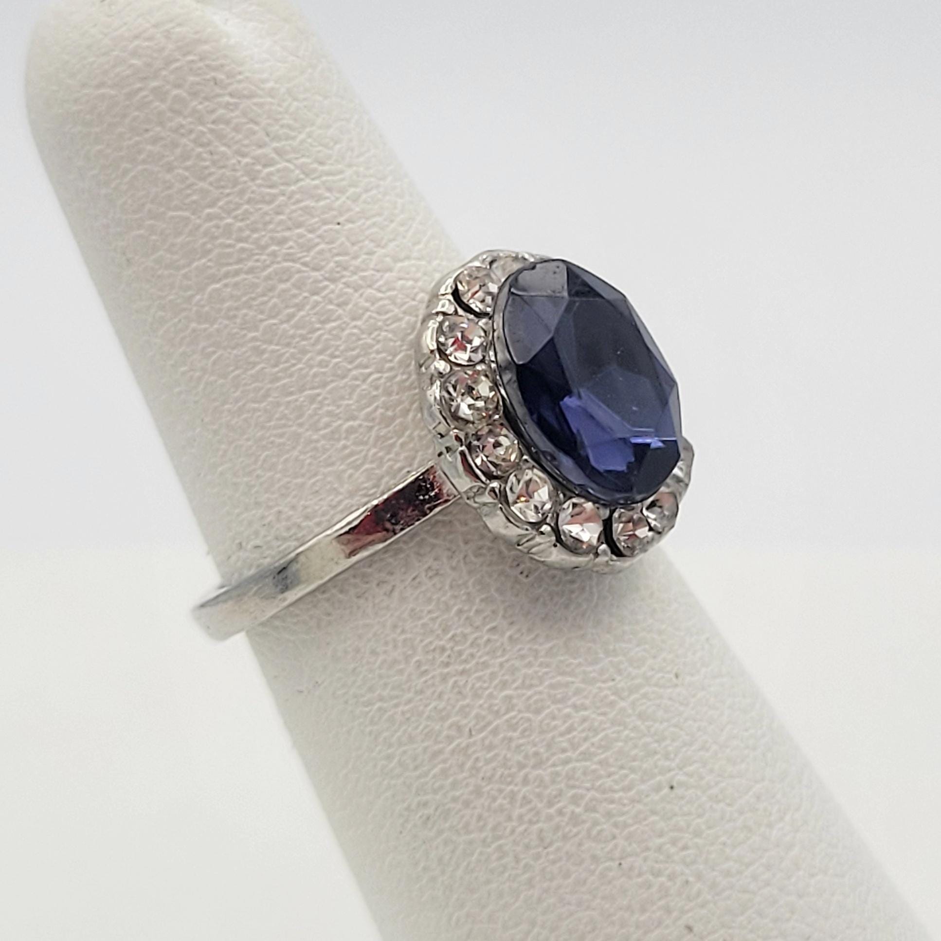 Vintage Silver Tone & Oval Faux Sapphire Statement Cocktail Ring
