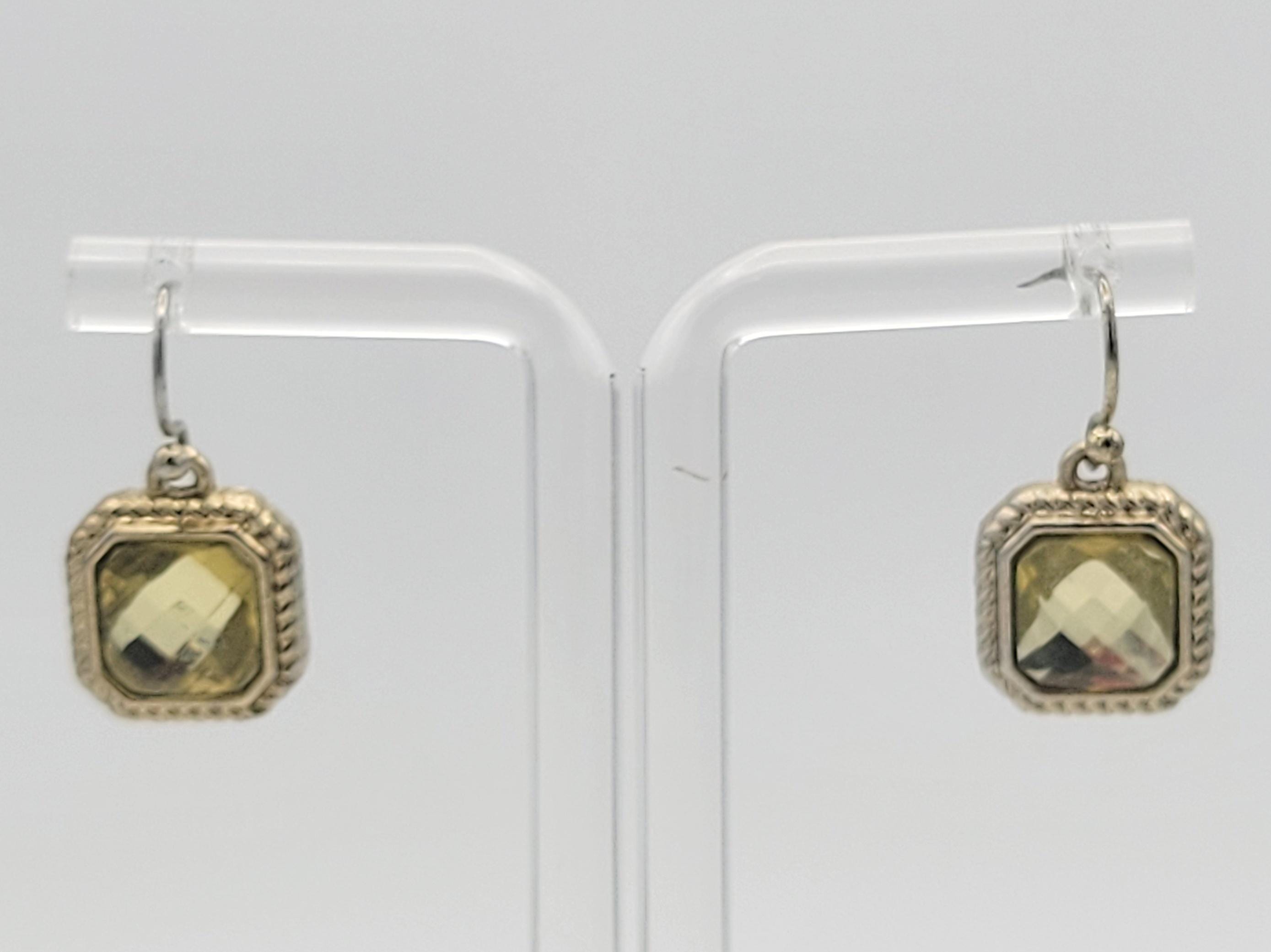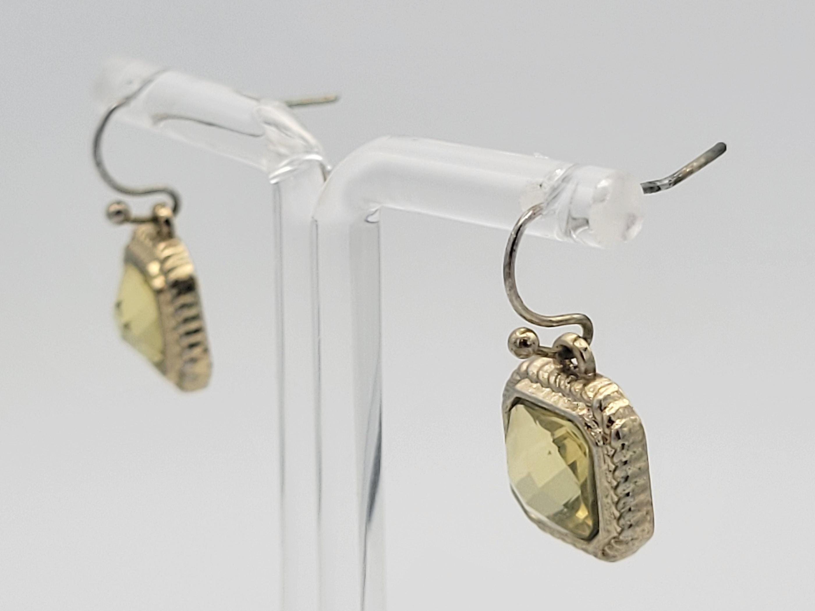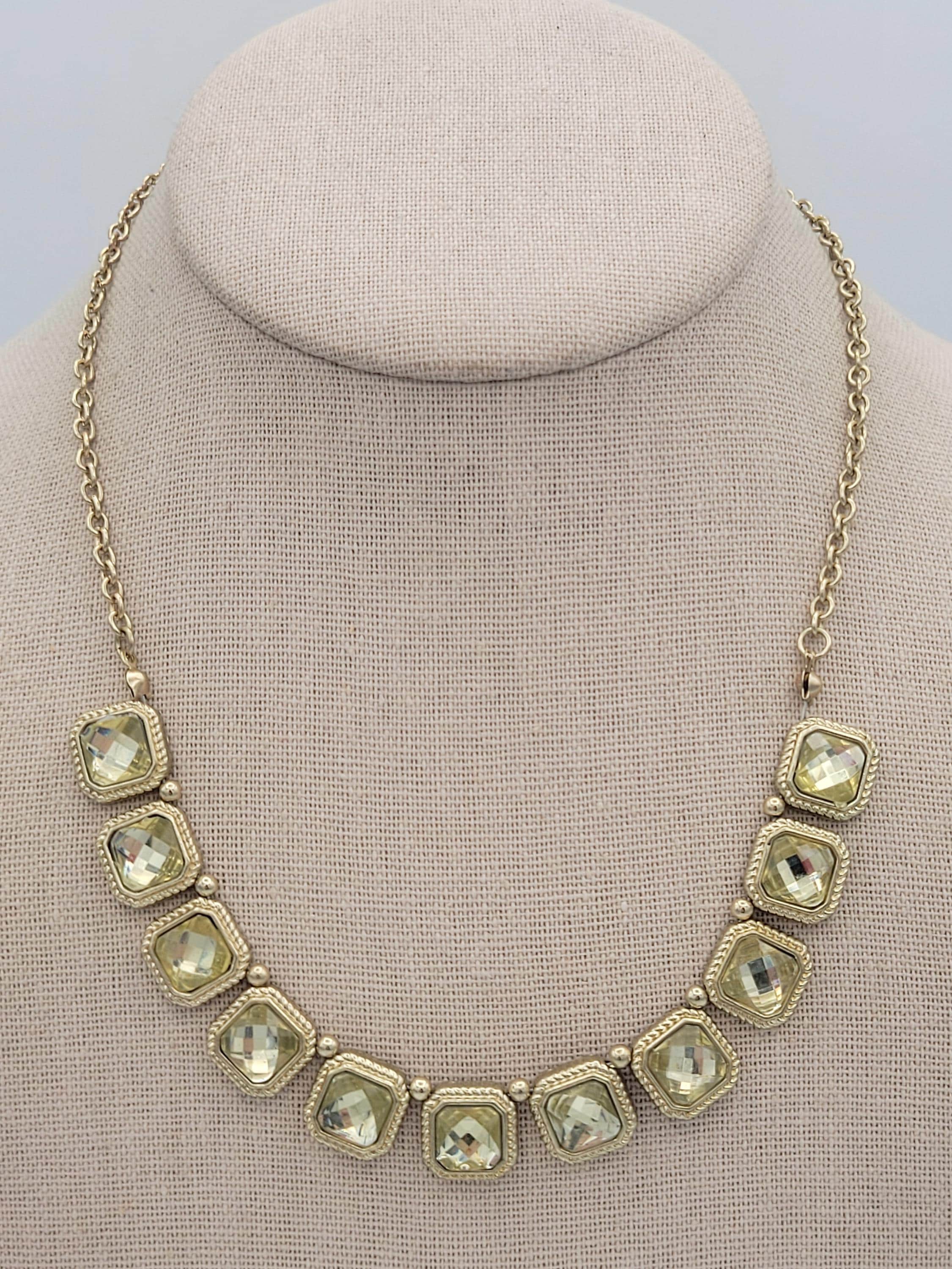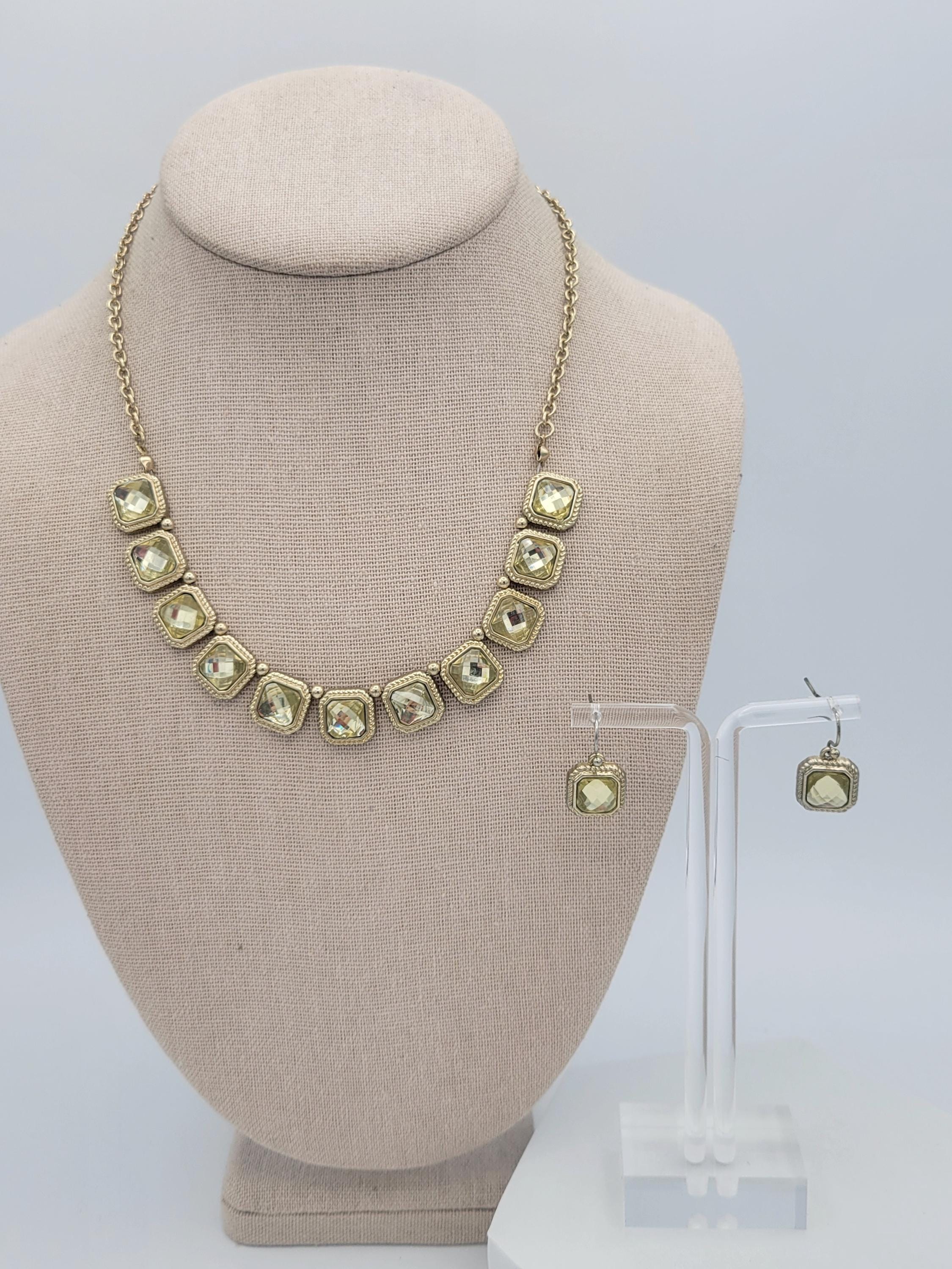 This beautiful jewelry set has a sophisticated look. A gold-tone cable chain is secured with a lobster claw clasp & is adjustable for length. The bib of the necklace is made of several rounded square setting links with textured edges. Inside of each link is a sparkling faceted yellow-green rhinestone. The earrings are each made of 1 of the same square rhinestone links from the necklace. This set is in excellent vintage condition with very little wear.
