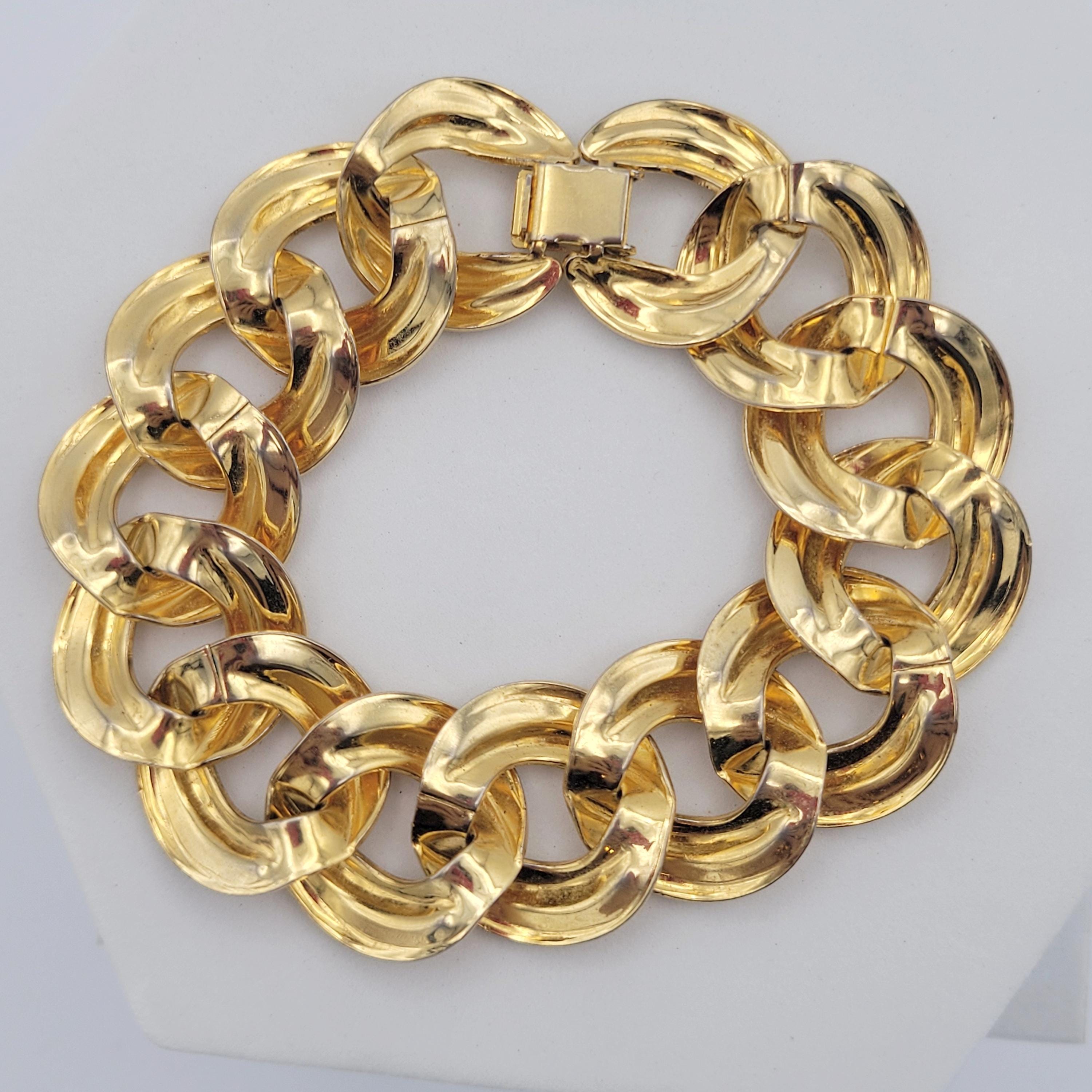 This shining bracelet makes a great statement piece. The gold-tone pleated curb chain bracelet is secured with a snap-lock clasp. The chain is nearly 1" wide & has a very shiny finish. This piece is in excellent condition with very little wear.
