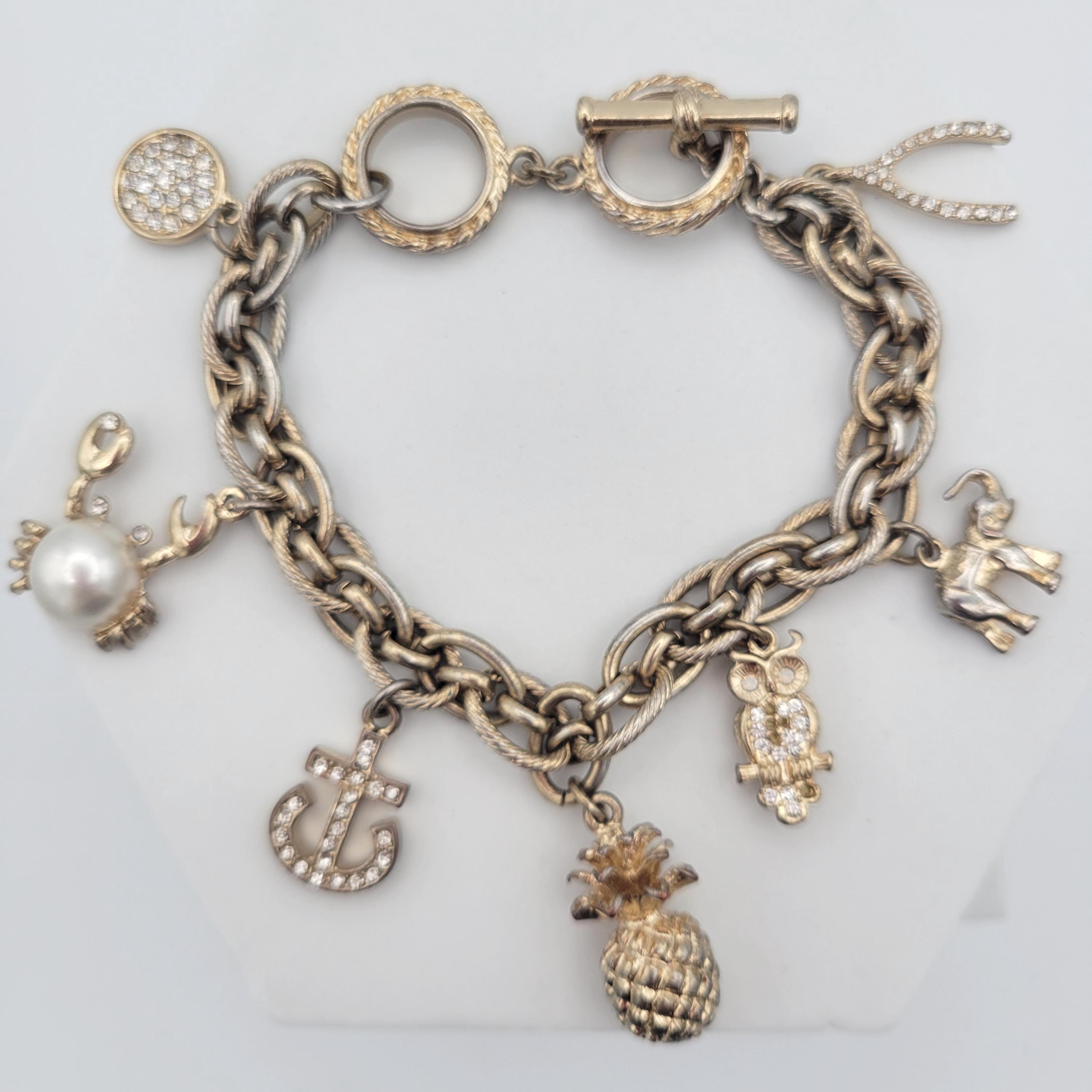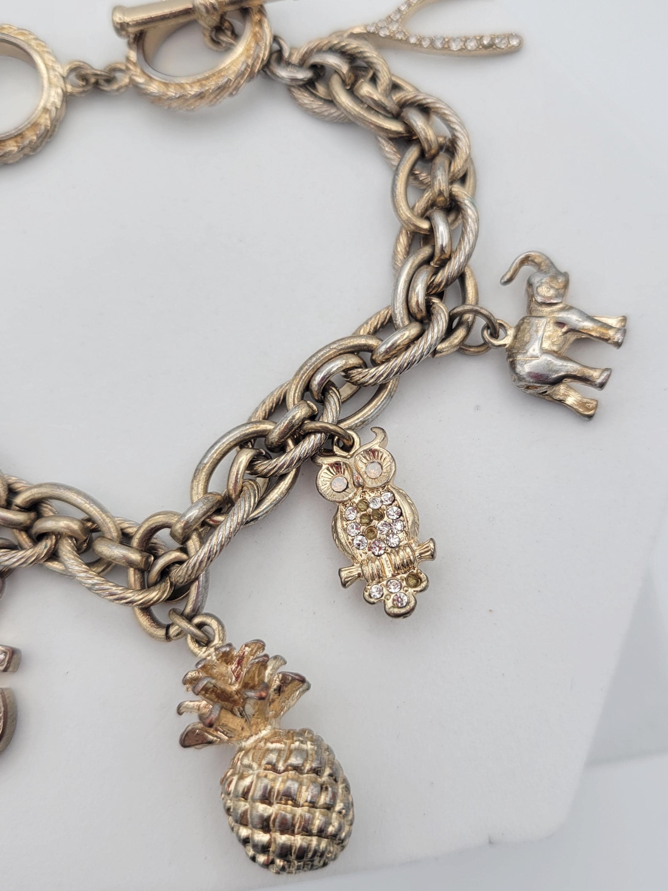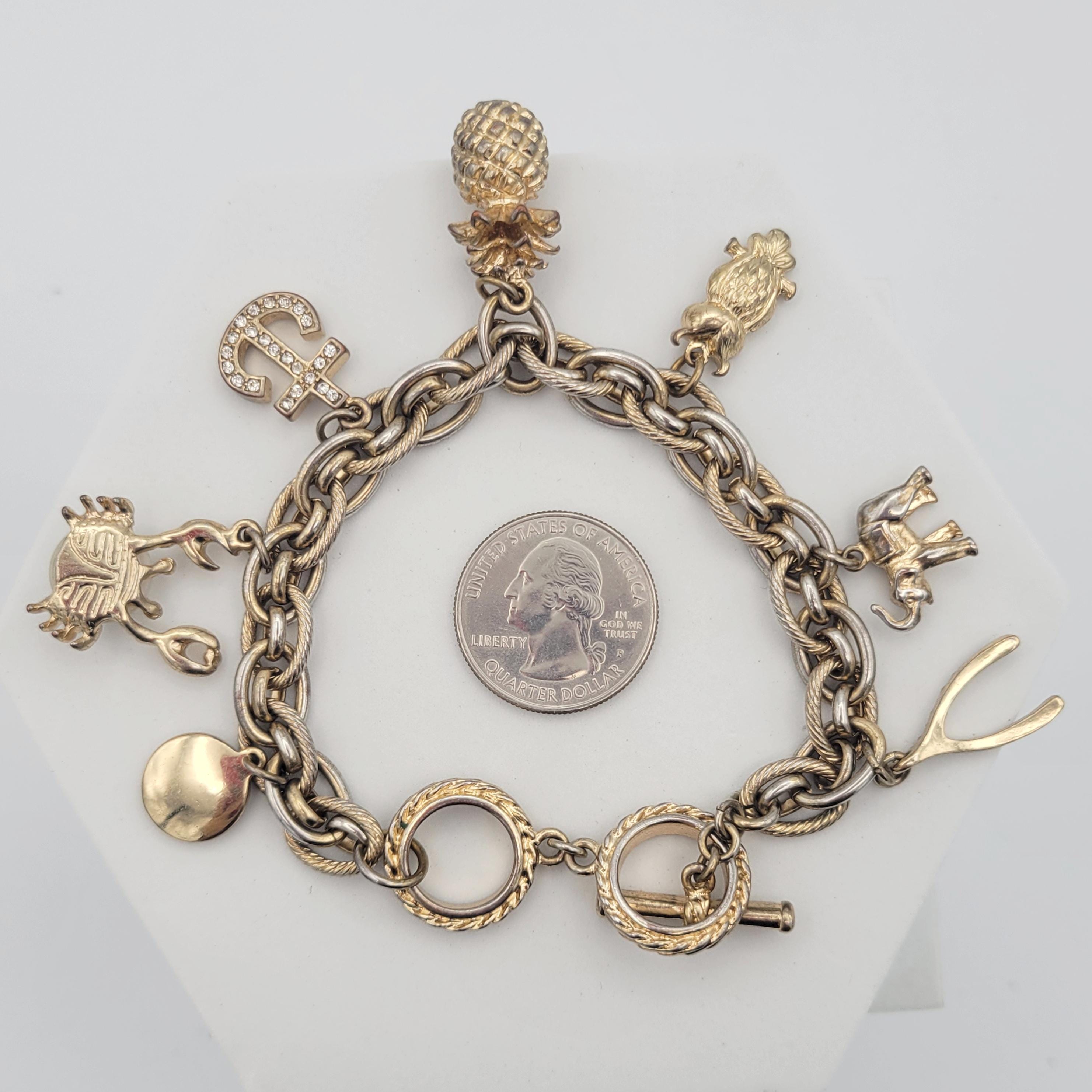 This cute charm bracelet makes a fun statement piece. A thick gold-tone oversize cable chain is secured with a toggle clasp & is slightly adjustable for length. The chain is packed with 7 gold-tone charms in the following shapes: disc, crab (with faux pearl body), anchor, pineapple, owl, elephant & wishbone. Some of the charms are accented with rhinestones. This piece is in excellent condition with some wear.