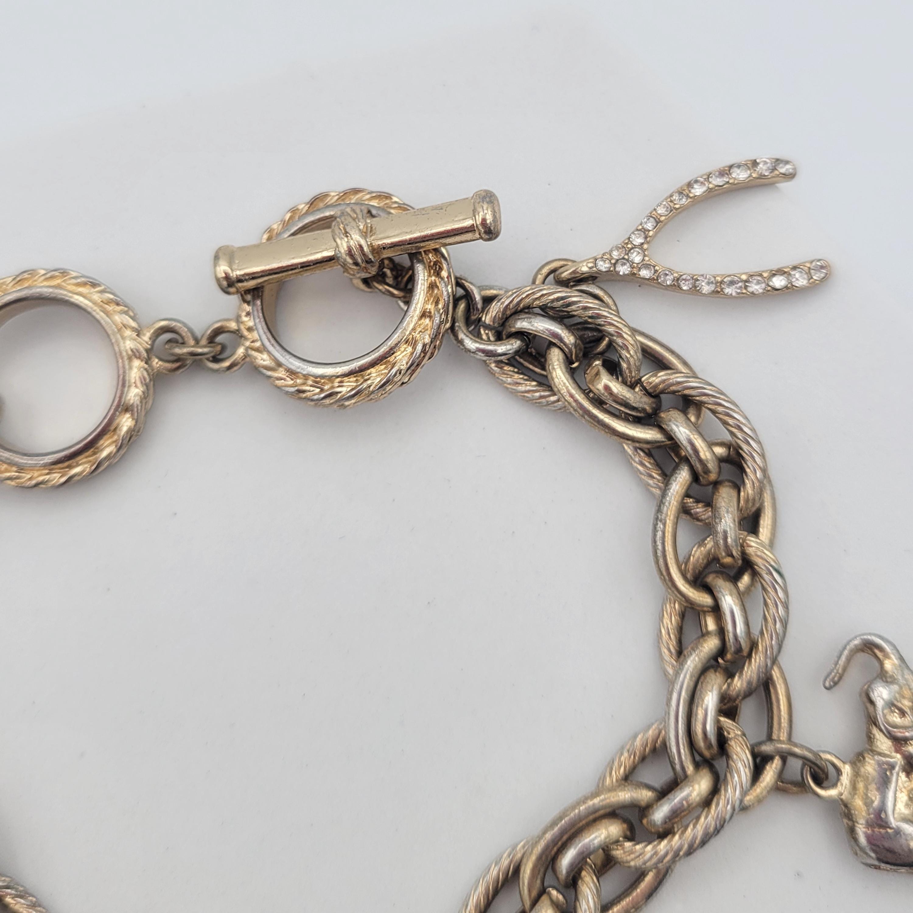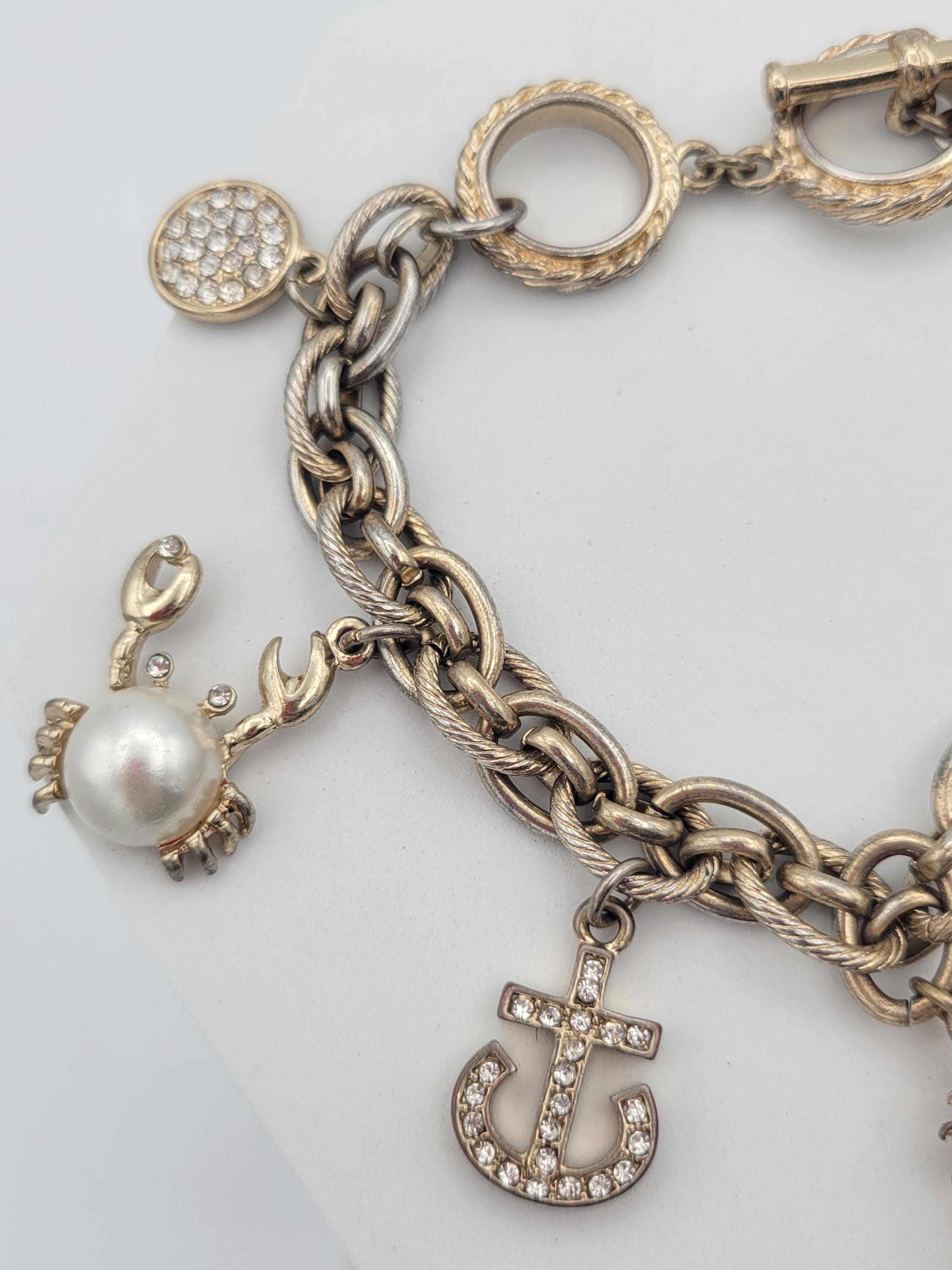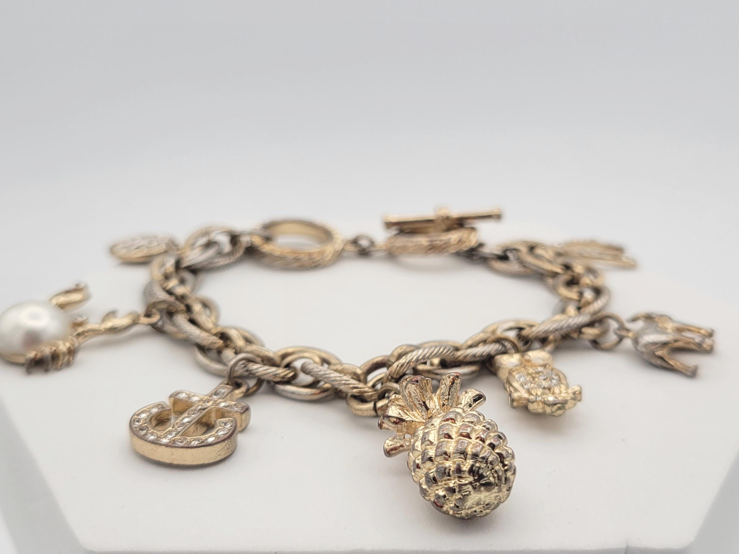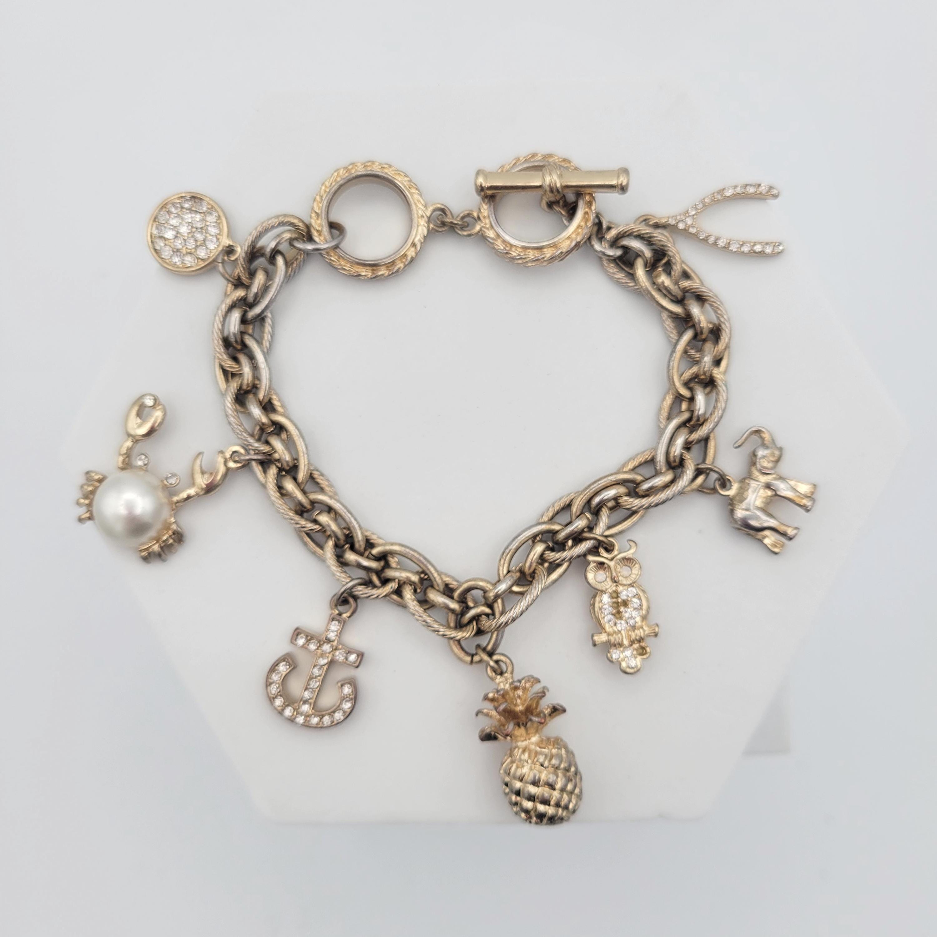 This cute charm bracelet makes a fun statement piece. A thick gold-tone oversize cable chain is secured with a toggle clasp & is slightly adjustable for length. The chain is packed with 7 gold-tone charms in the following shapes: disc, crab (with faux pearl body), anchor, pineapple, owl, elephant & wishbone. Some of the charms are accented with rhinestones. This piece is in excellent condition with some wear.