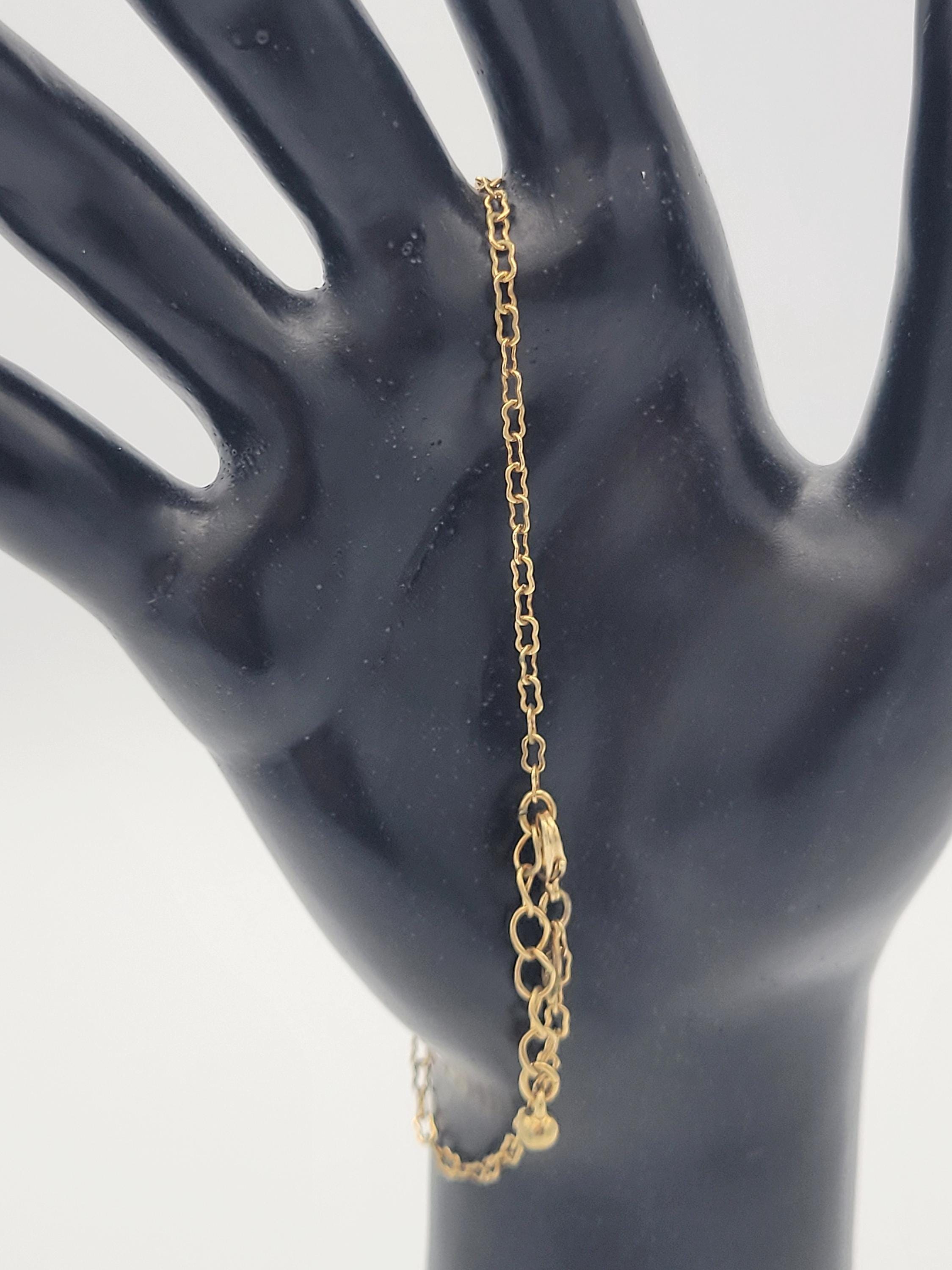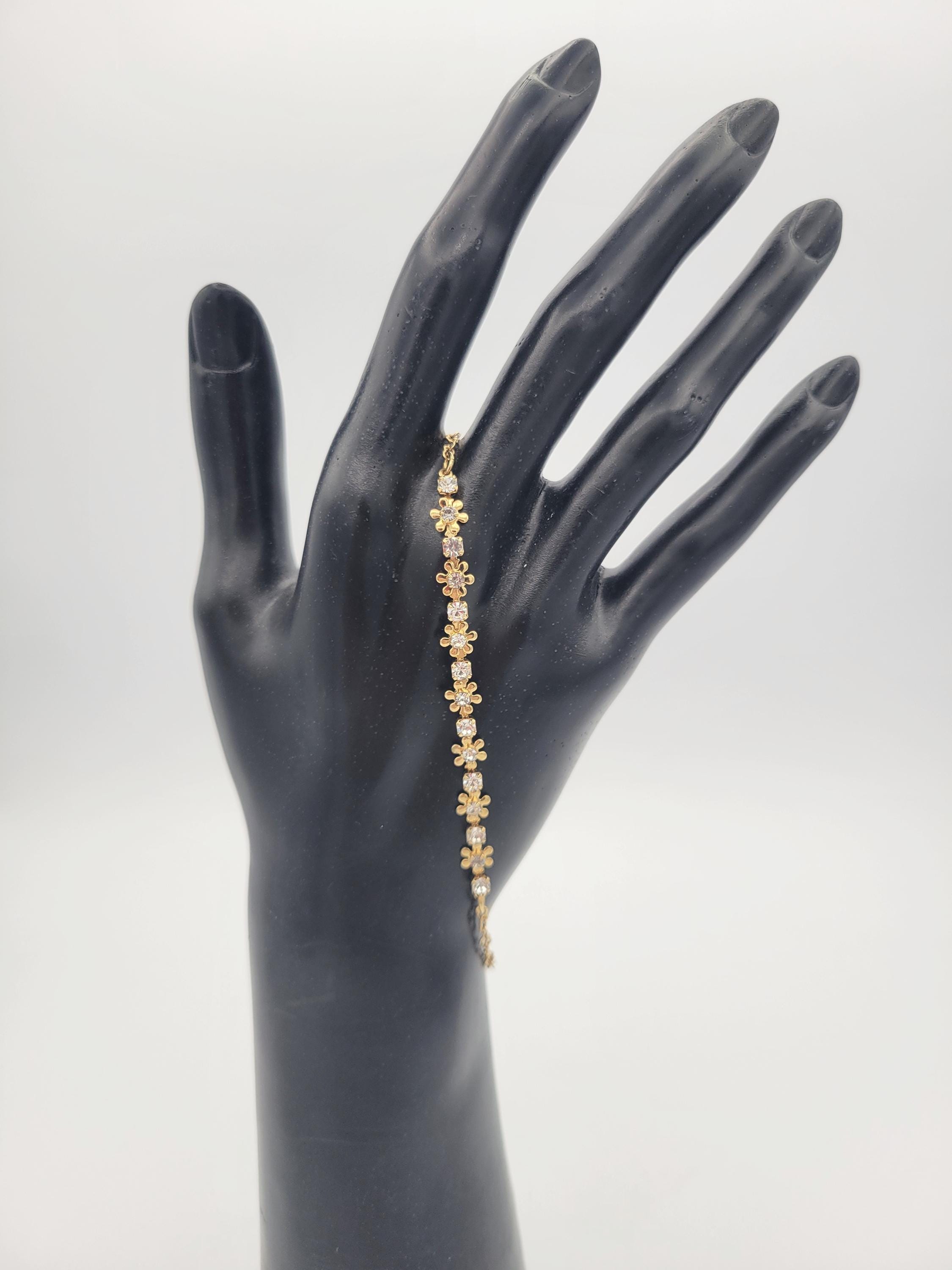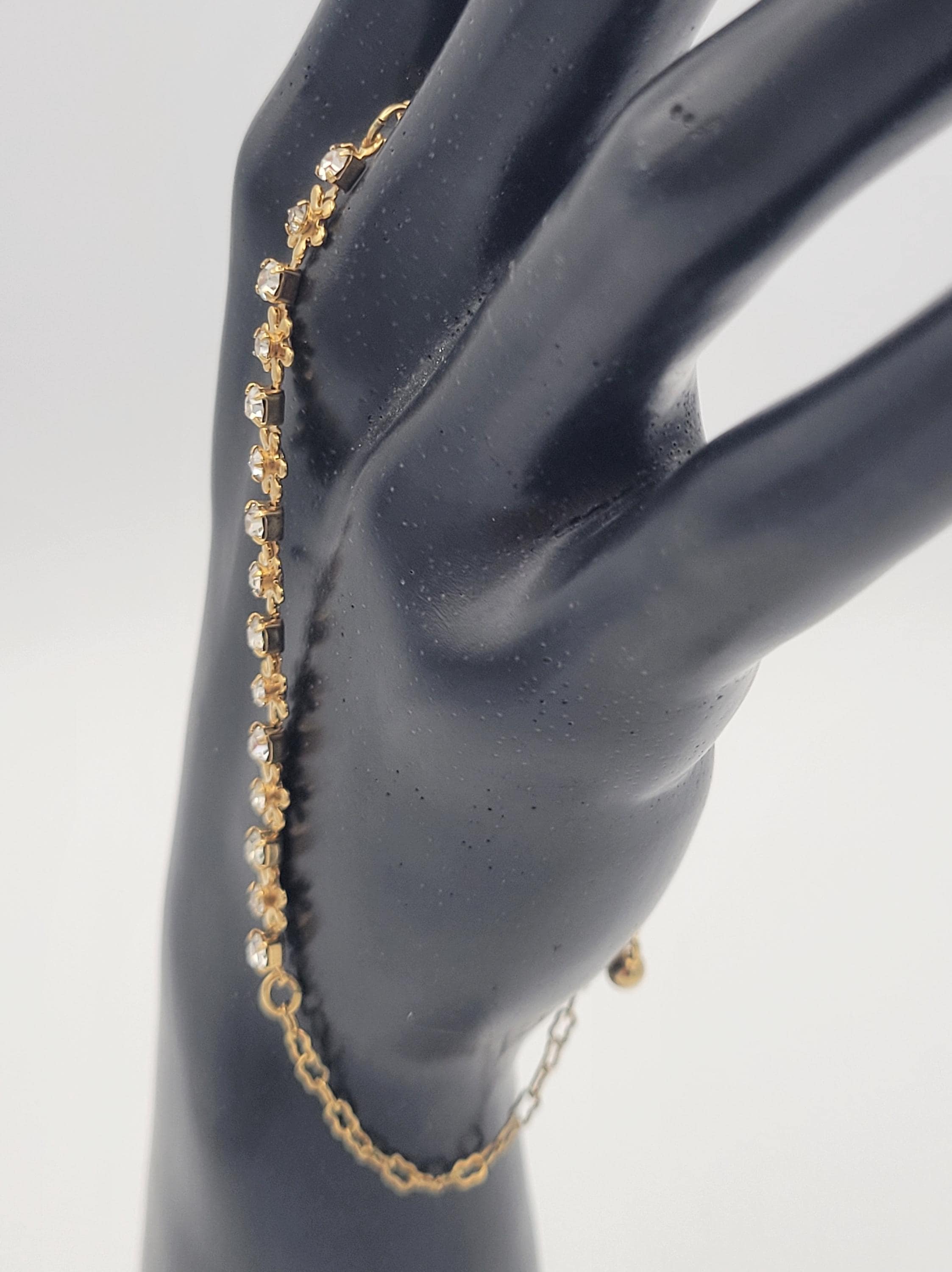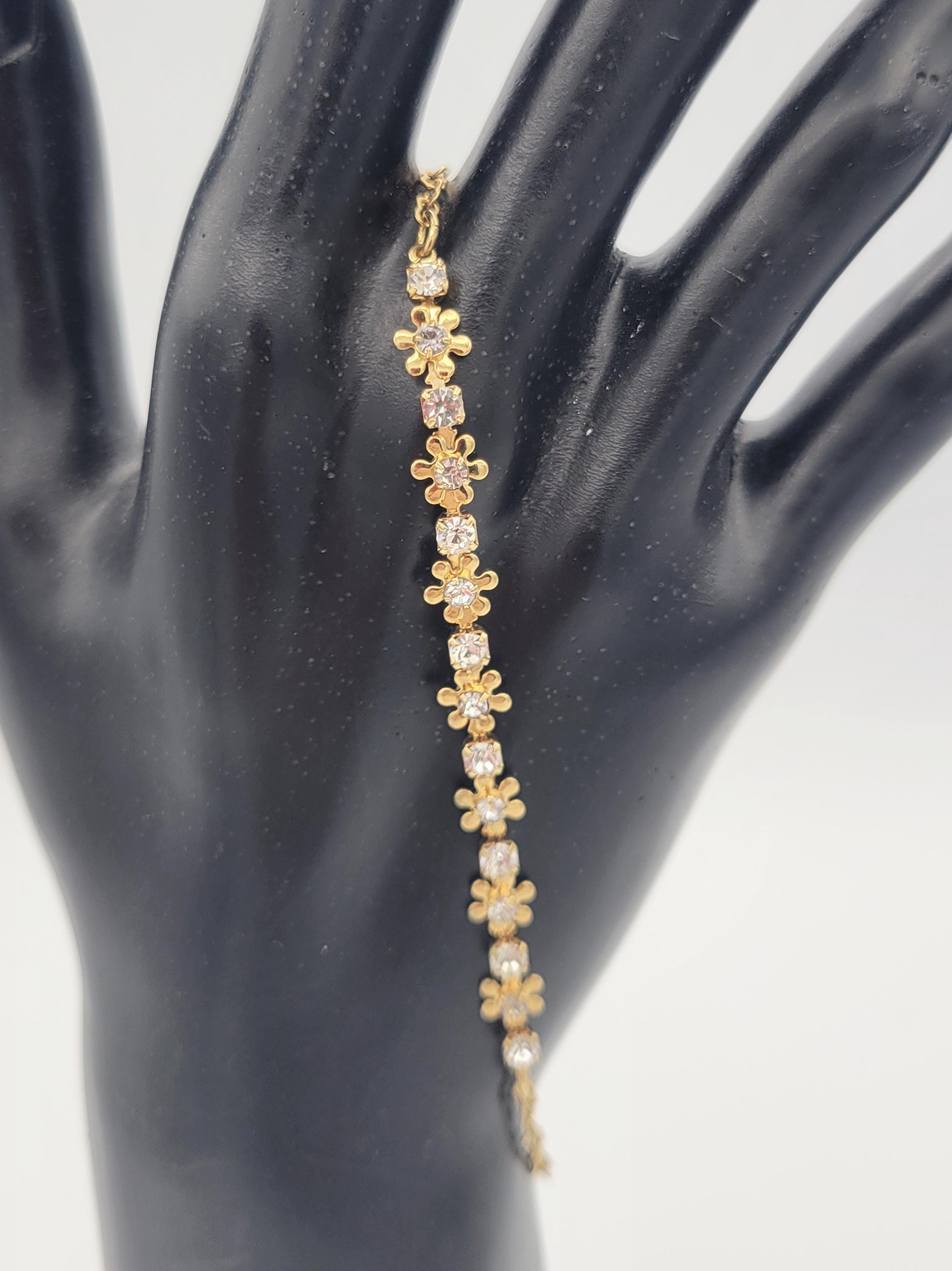 This piece can be worn as a bracelet or an anklet. A gold-tone chain is adjustable for length & secures with a lobster claw clasp. The center of the bracelet features gold-tone floral-shaped links & clear faceted rhinestones. This piece is in excellent vintage condition with very little wear.