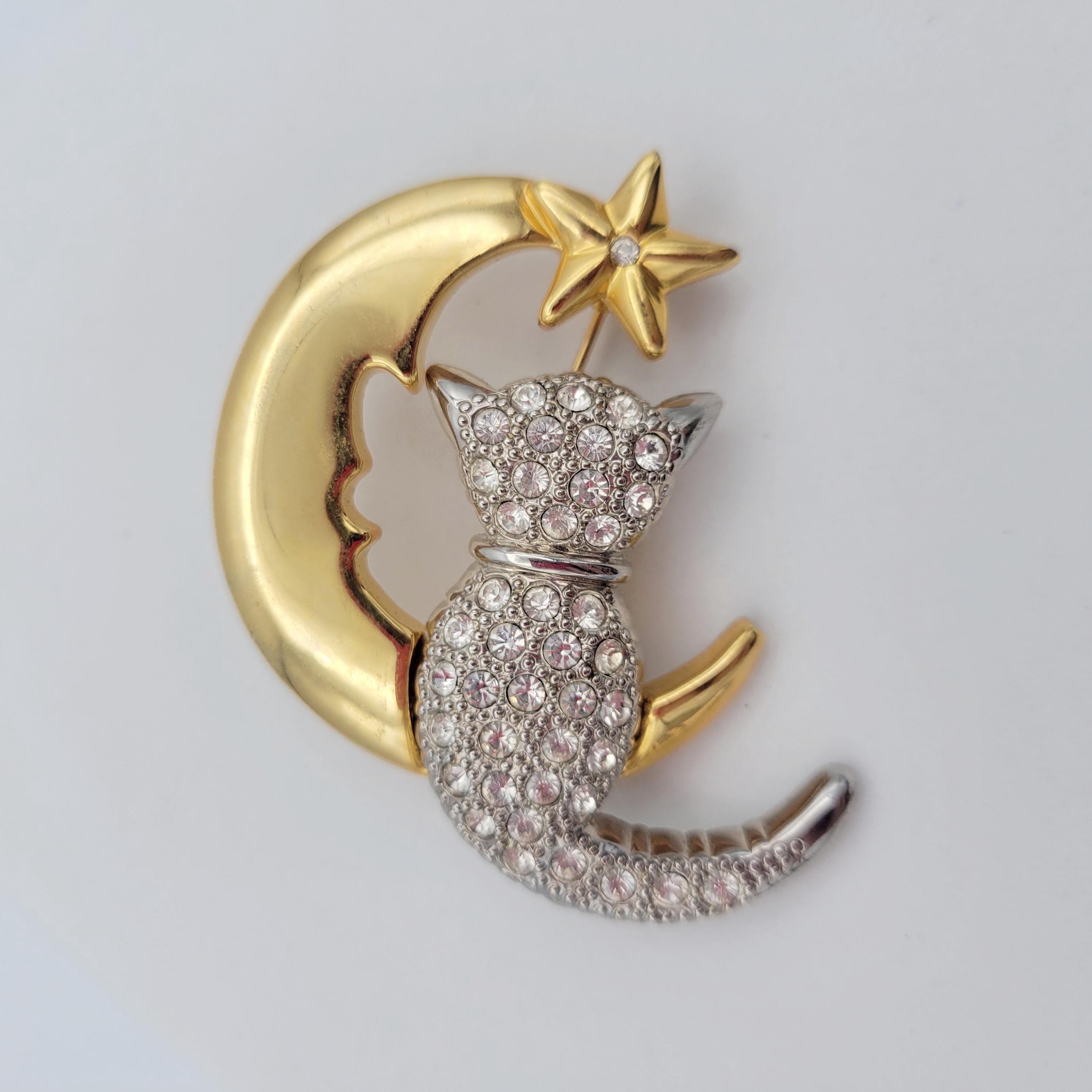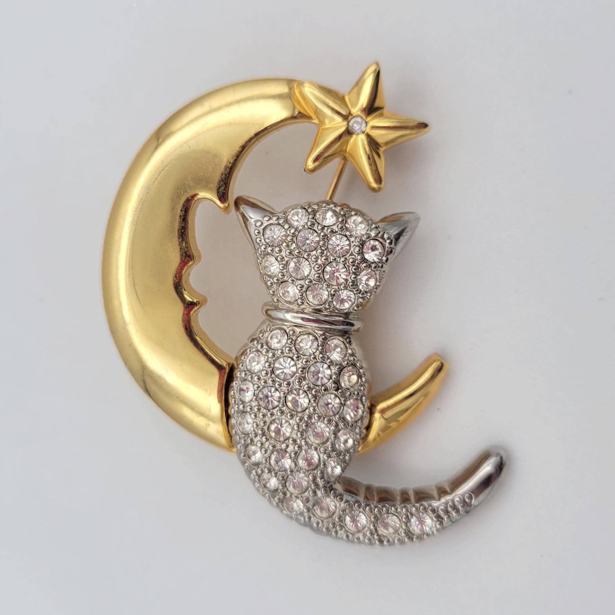 Vintage Two Tone Moon, Star & Rhinestone Encrusted Cat Figural Brooch