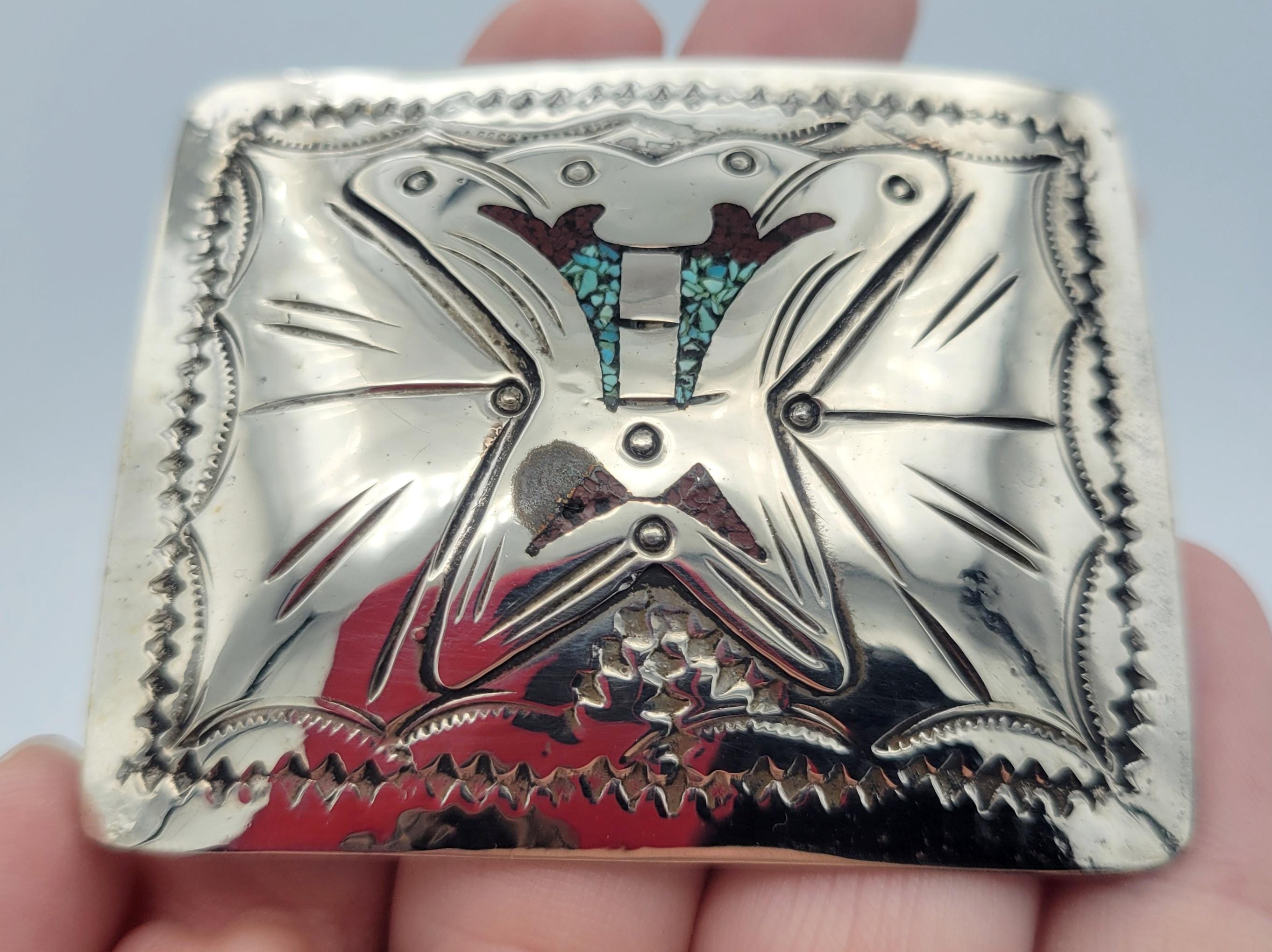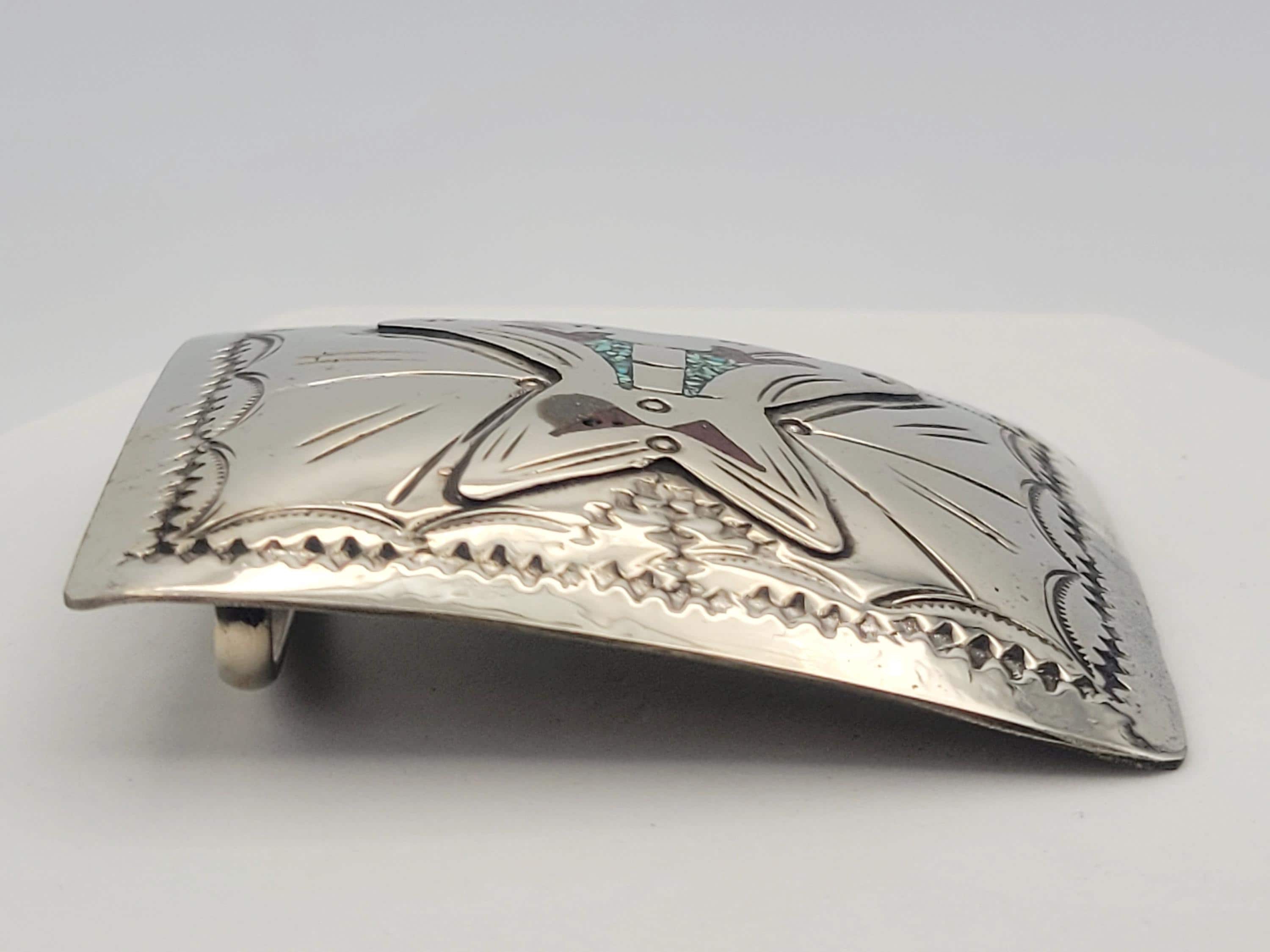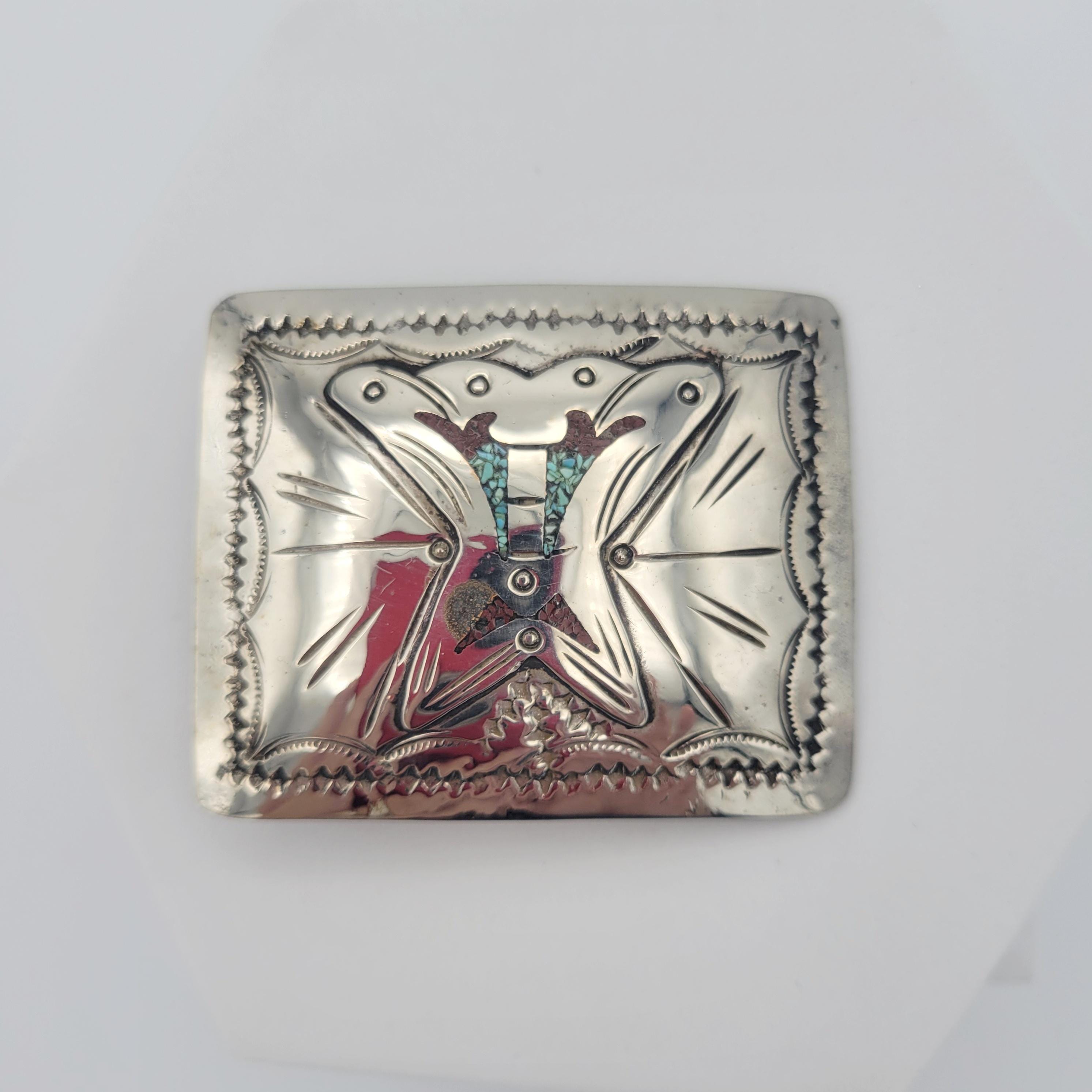 This shining belt buckle makes a great statement piece. The thin silver-tone belt buckle has a domed rectangular shape. It is engraved with a southwestern design accented with black enamel. Small areas of the design are accented with turquoise & coral inlay. This piece is in great vintage condition with a small amount of wear & loss of plating. It may need cleaning.