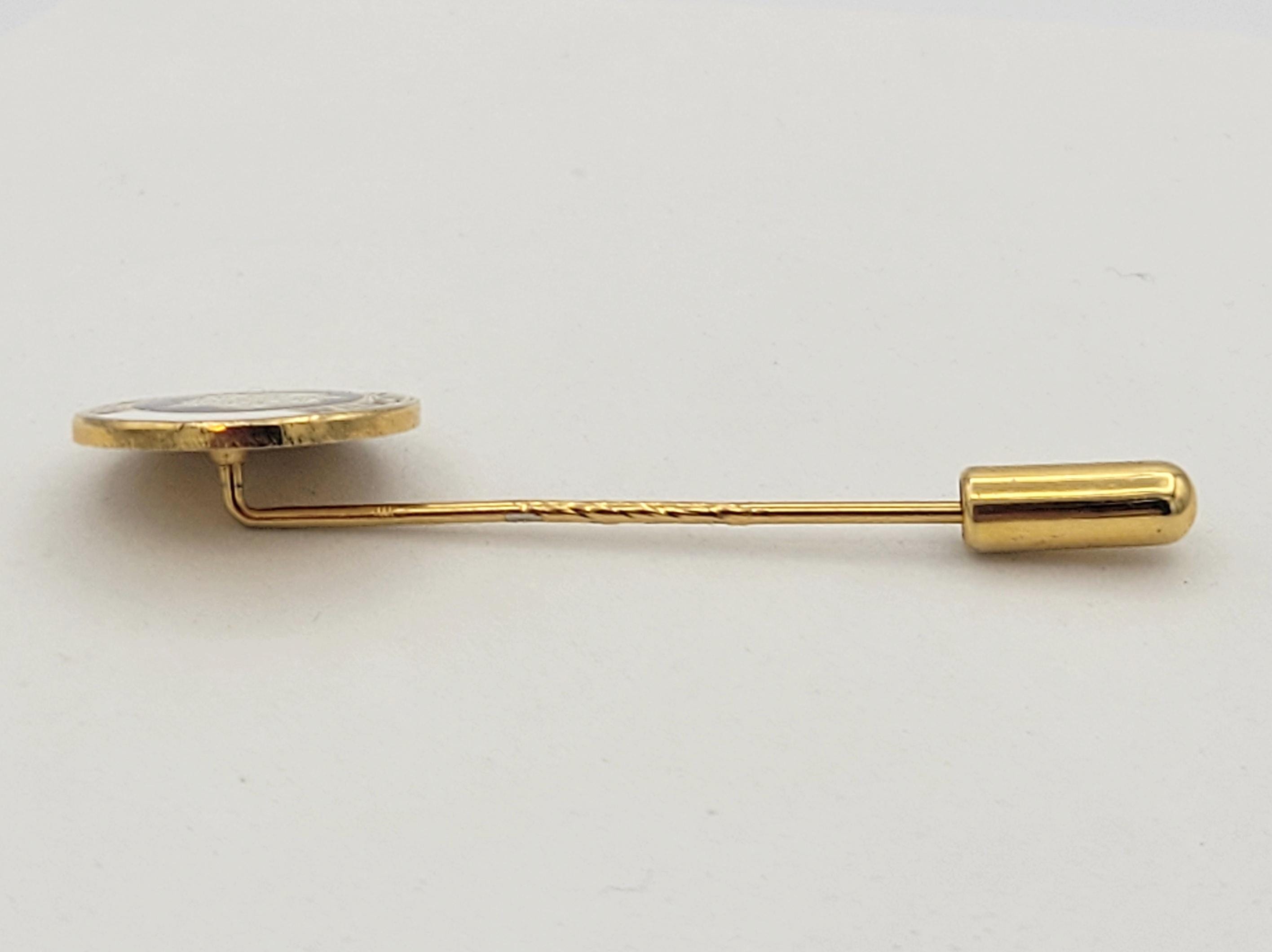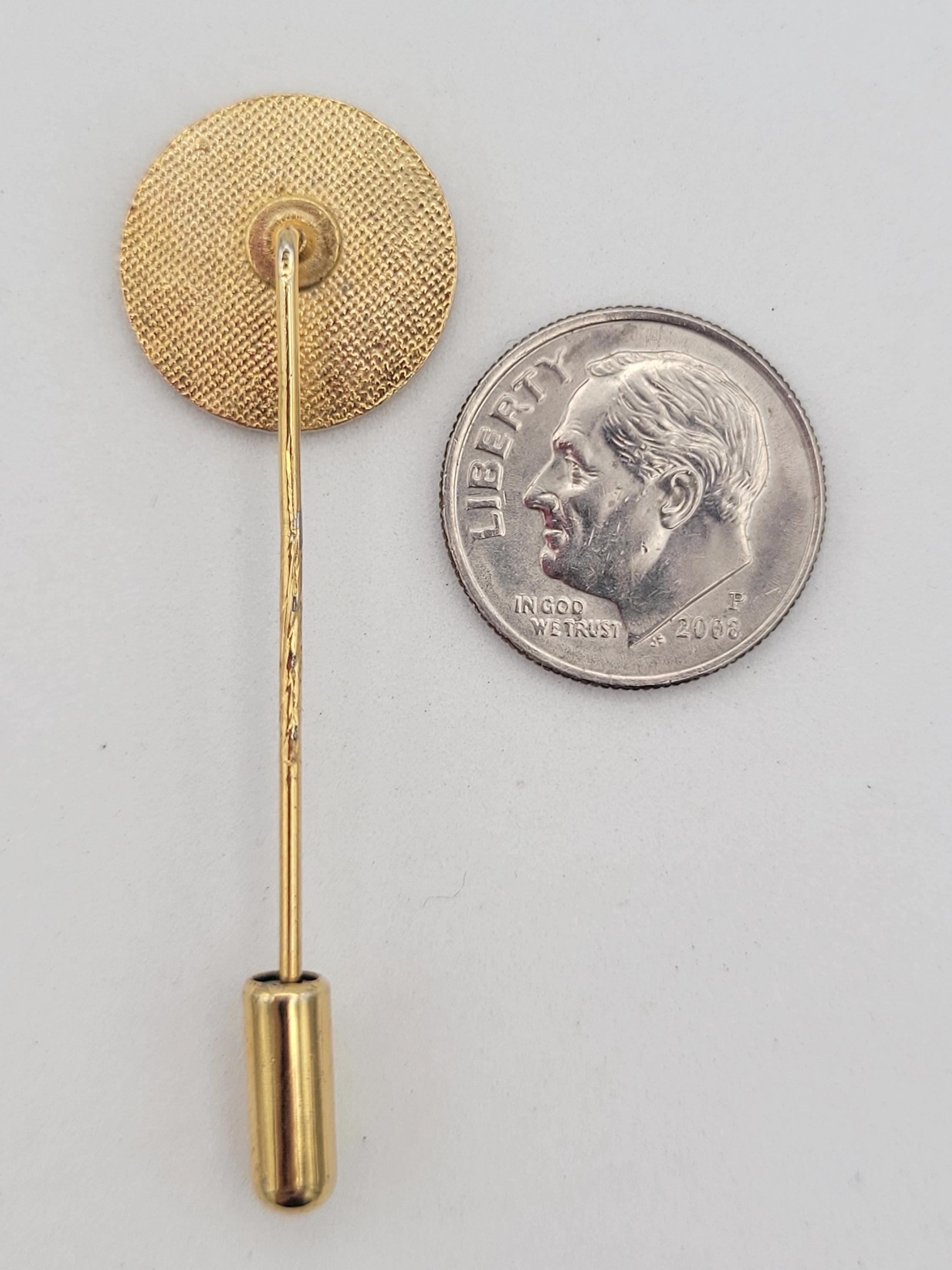 This vintage stick pin has a great vintage look. The pin & base of the head are gold-tone in color & the head is circular. The head is accented with blue & white enamel & forms the Kentucky Wildcat design. This piece is in excellent vintage condition with very little wear.