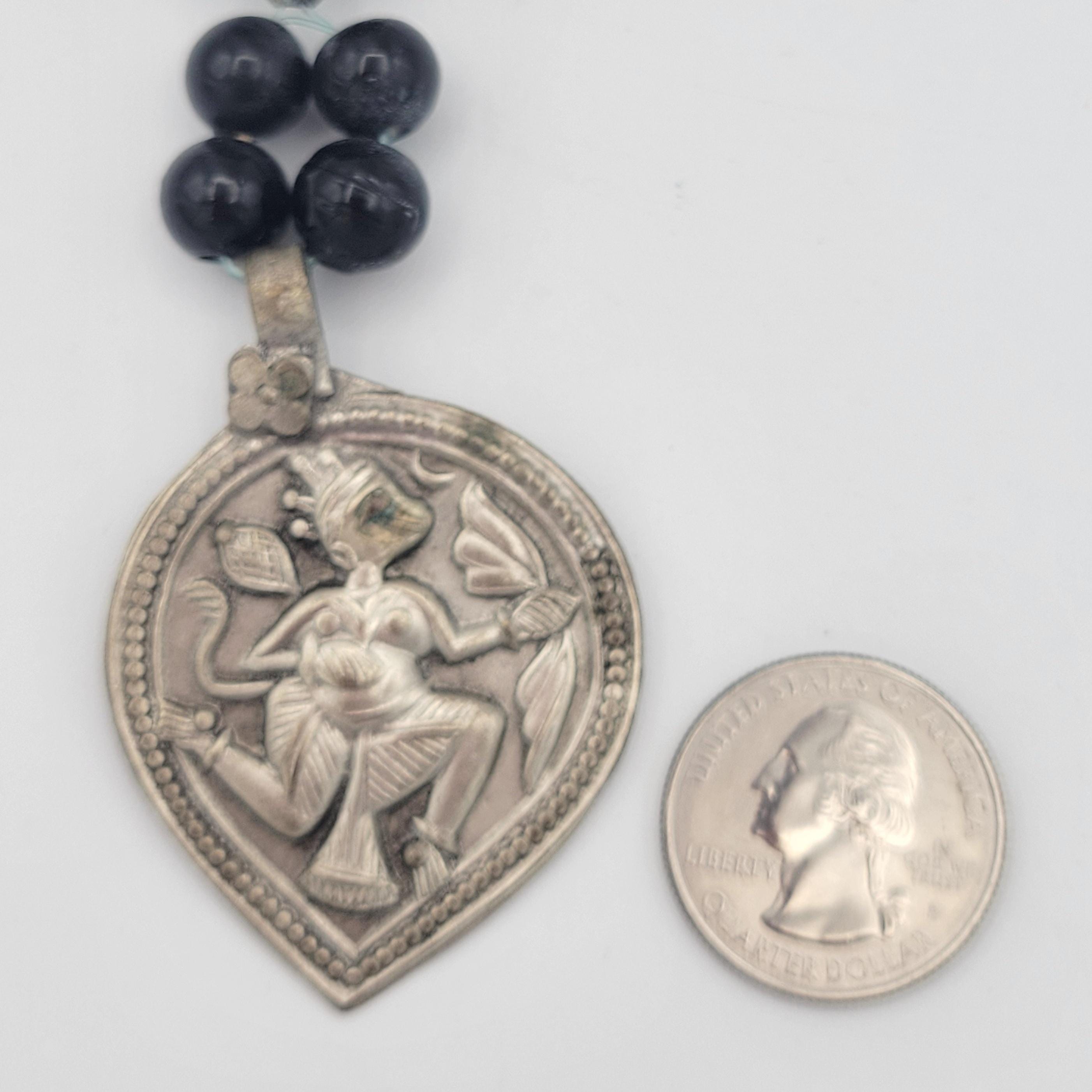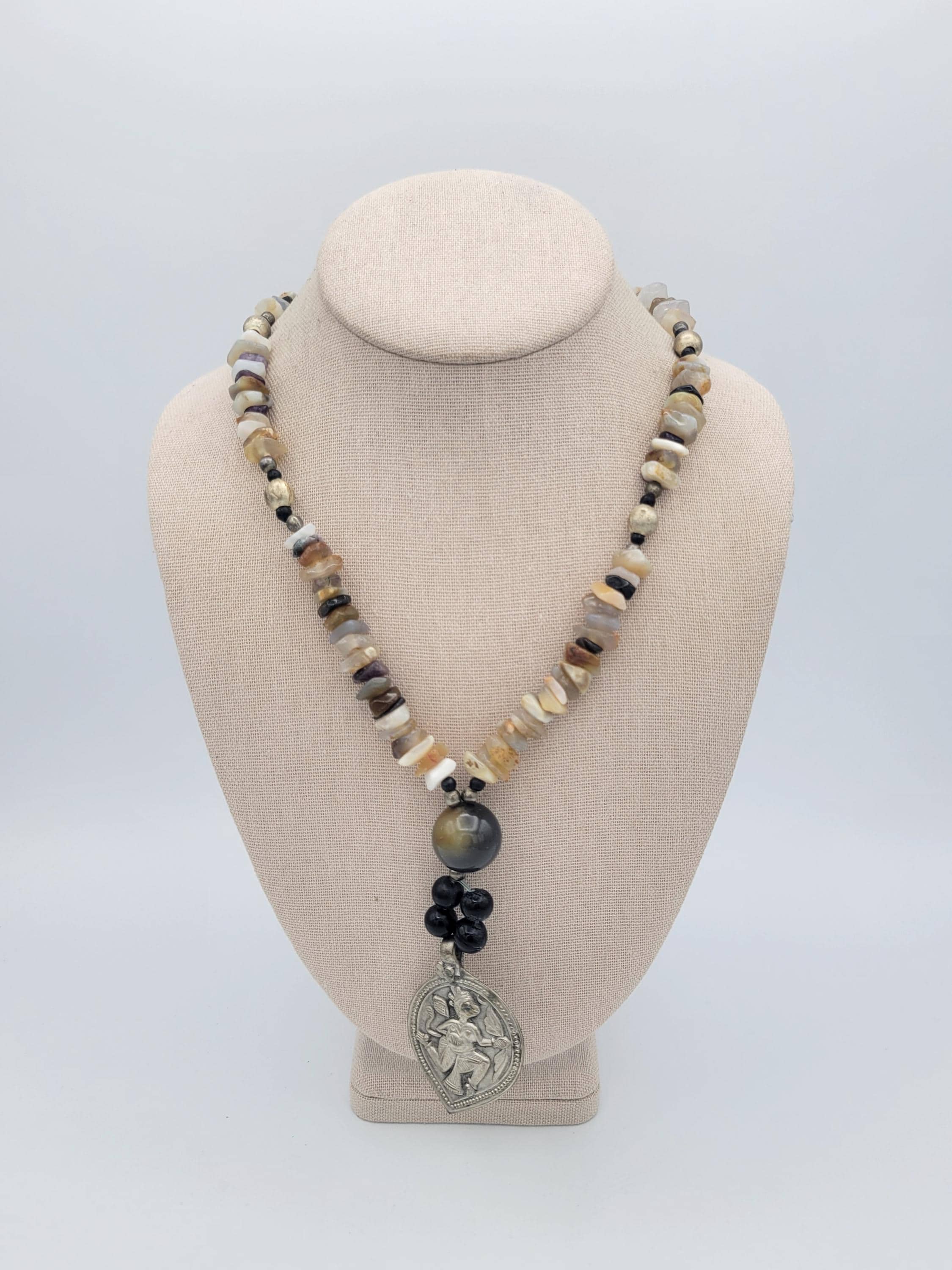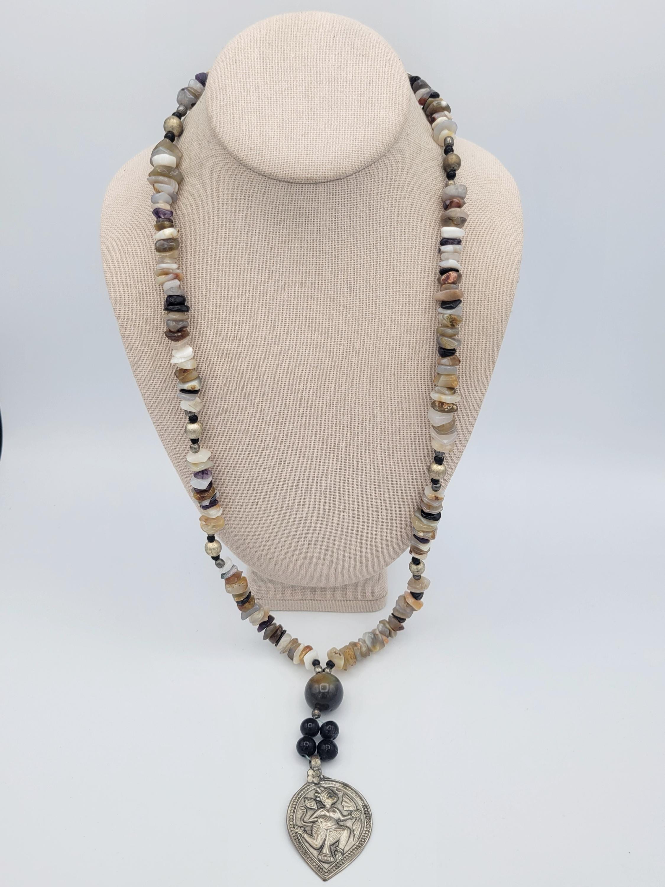 This beautiful necklace makes an Earthy statement piece. The single strand of chip & nugget beads made from various minerals including quartz & jasper secures with a hook clasp. The stamped teardrop-shaped pendant is silver-tone & features a design of Hanuman. This piece is in excellent vintage condition with a small amount of wear.