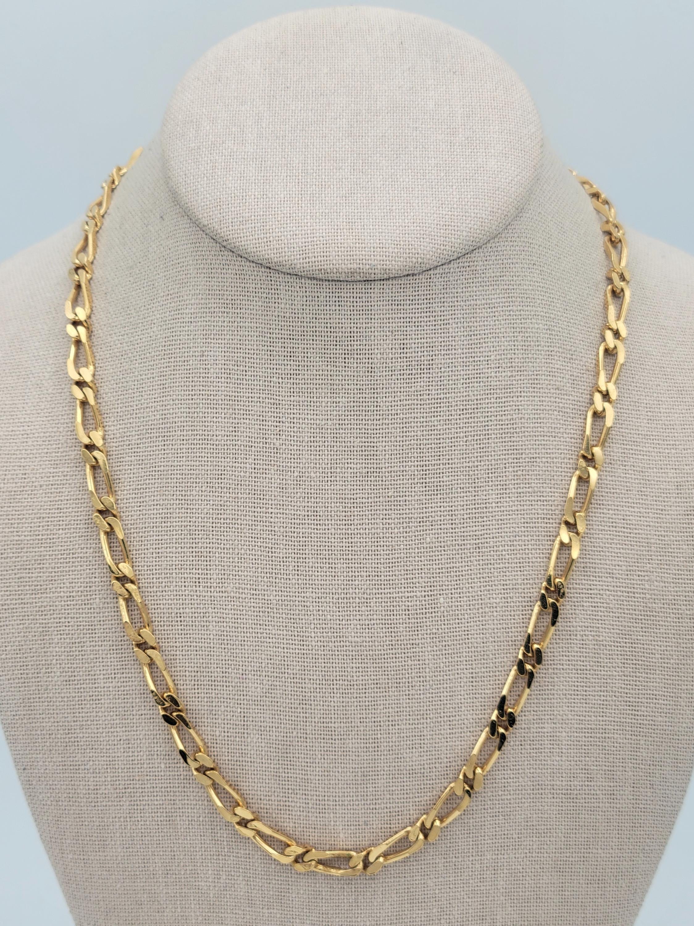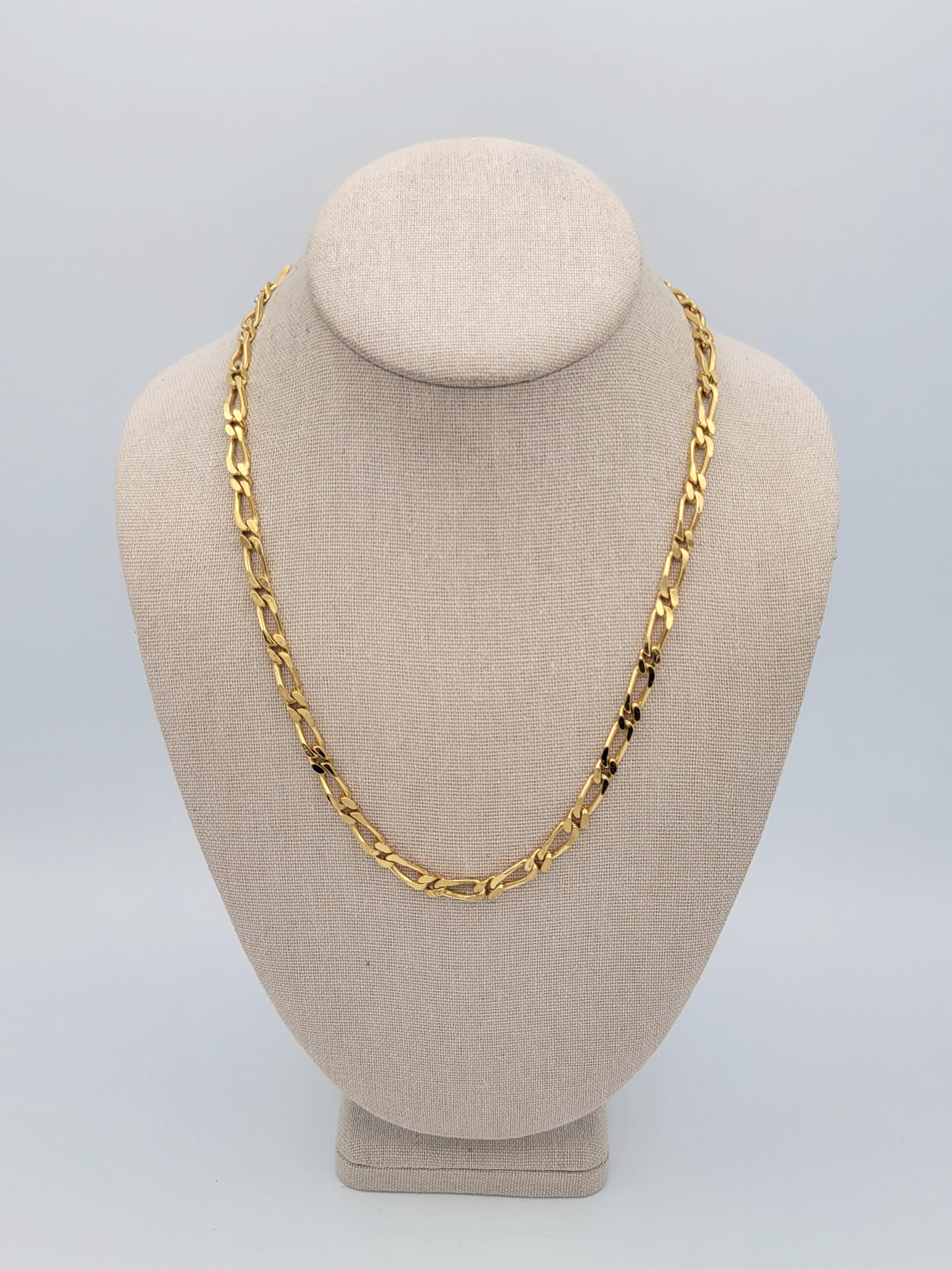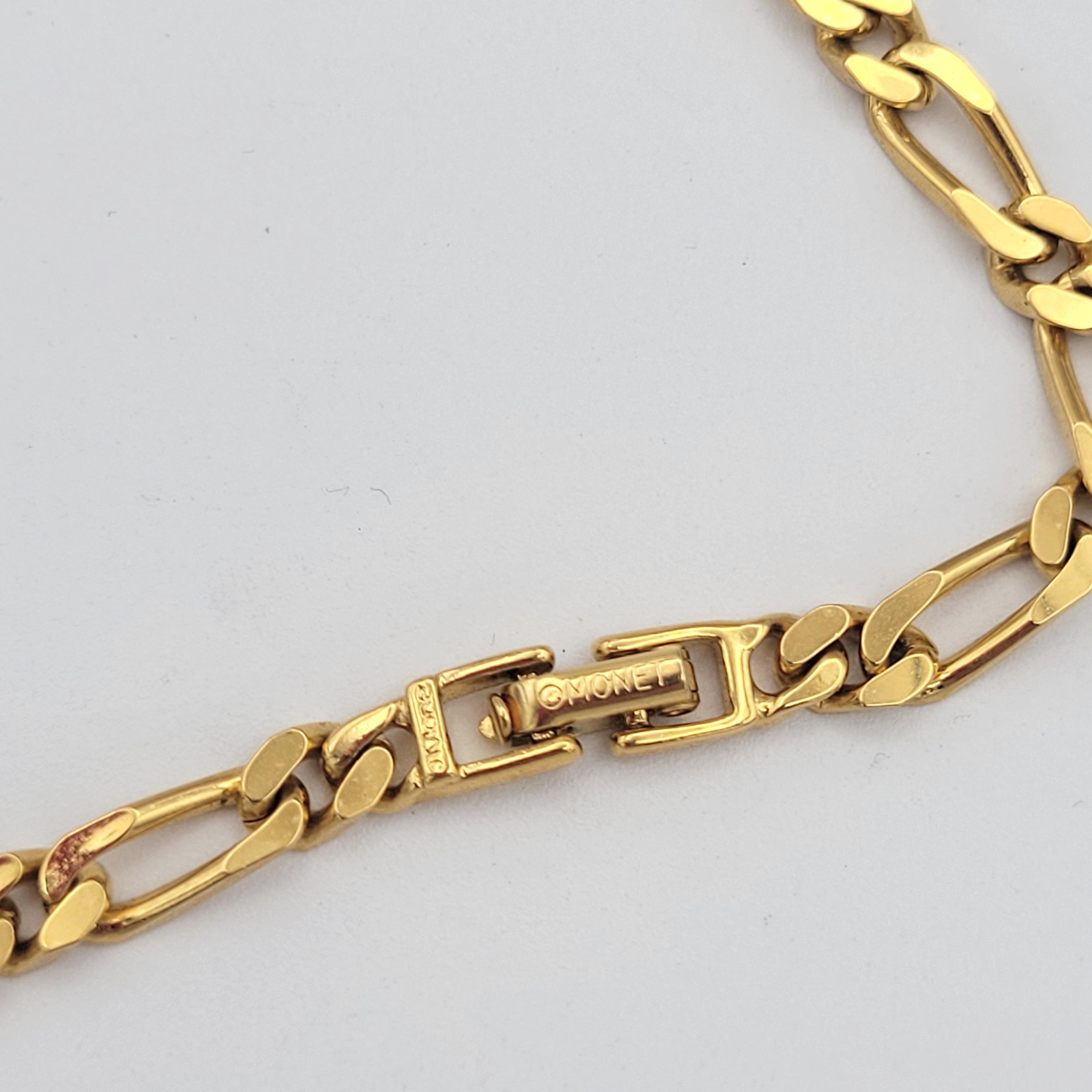 This shining chain has a great retro look. The gold-tone Figaro chain necklace secures with a snap-lock clasp. It is marked Monet on the clasp & on the chain. This piece is in excellent, nearly new condition.