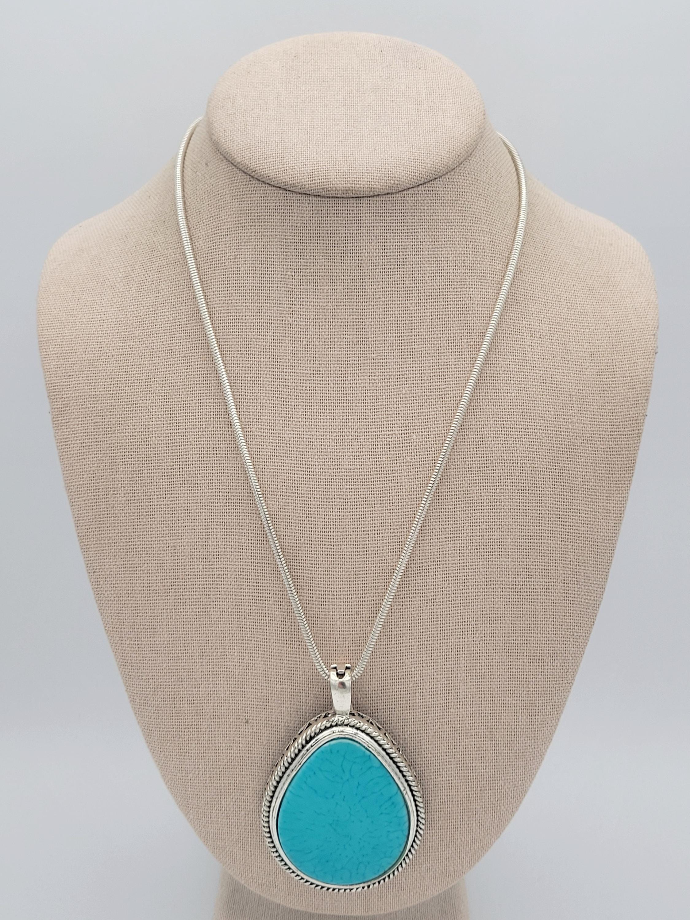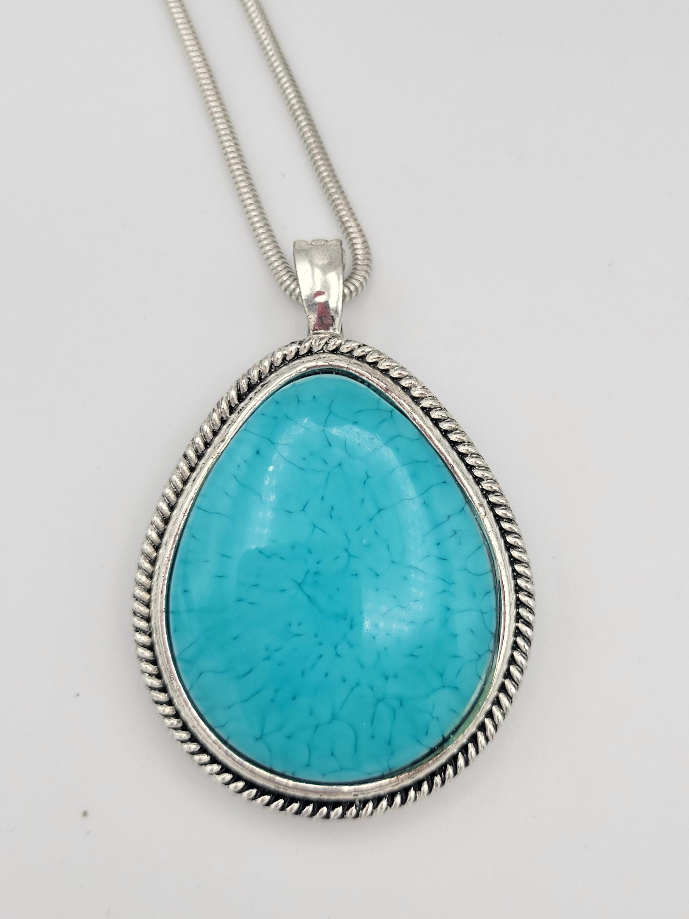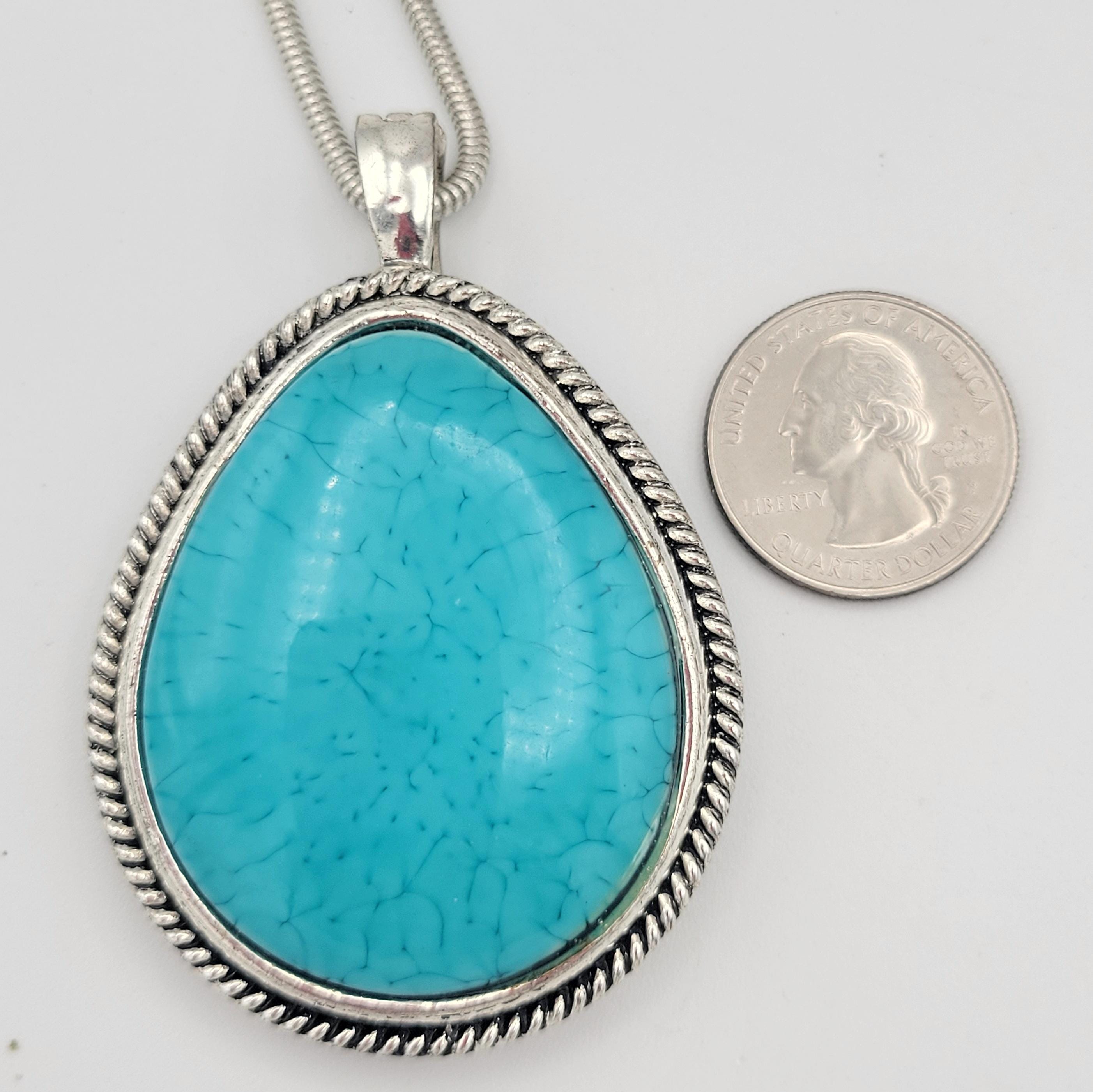 This stunning piece makes an eye-catching statement necklace. The silver-tone serpentine chain secures with a lobster claw clasp. The large pendant has a hinged magnetic bale & is marked RMN. The teardrop-shaped pendant features a triangle & rope-patterned edge & a large faux turquoise cabochon in the center. This piece is in excellent vintage condition with a small amount of wear, mainly on the hinged bale.