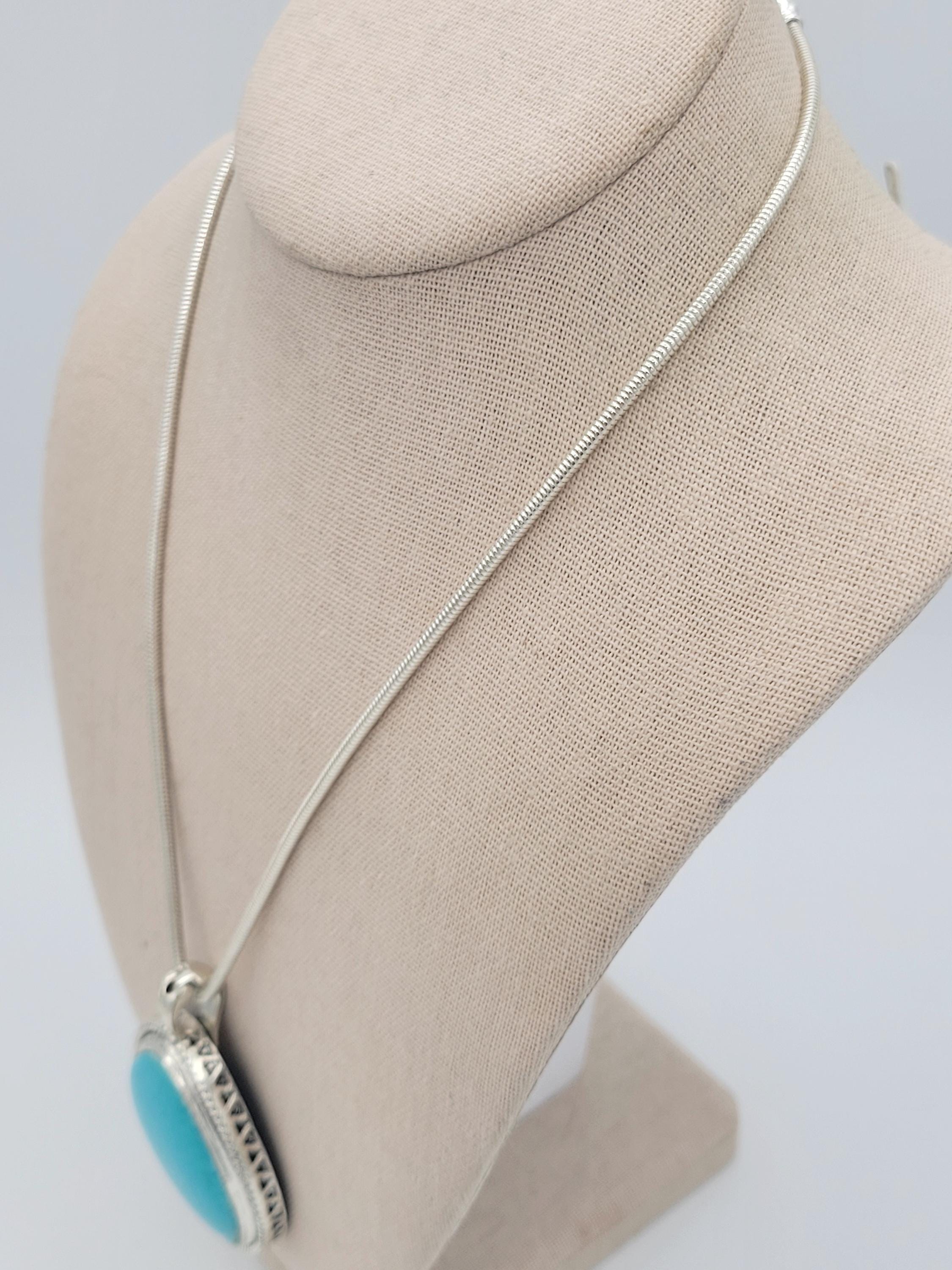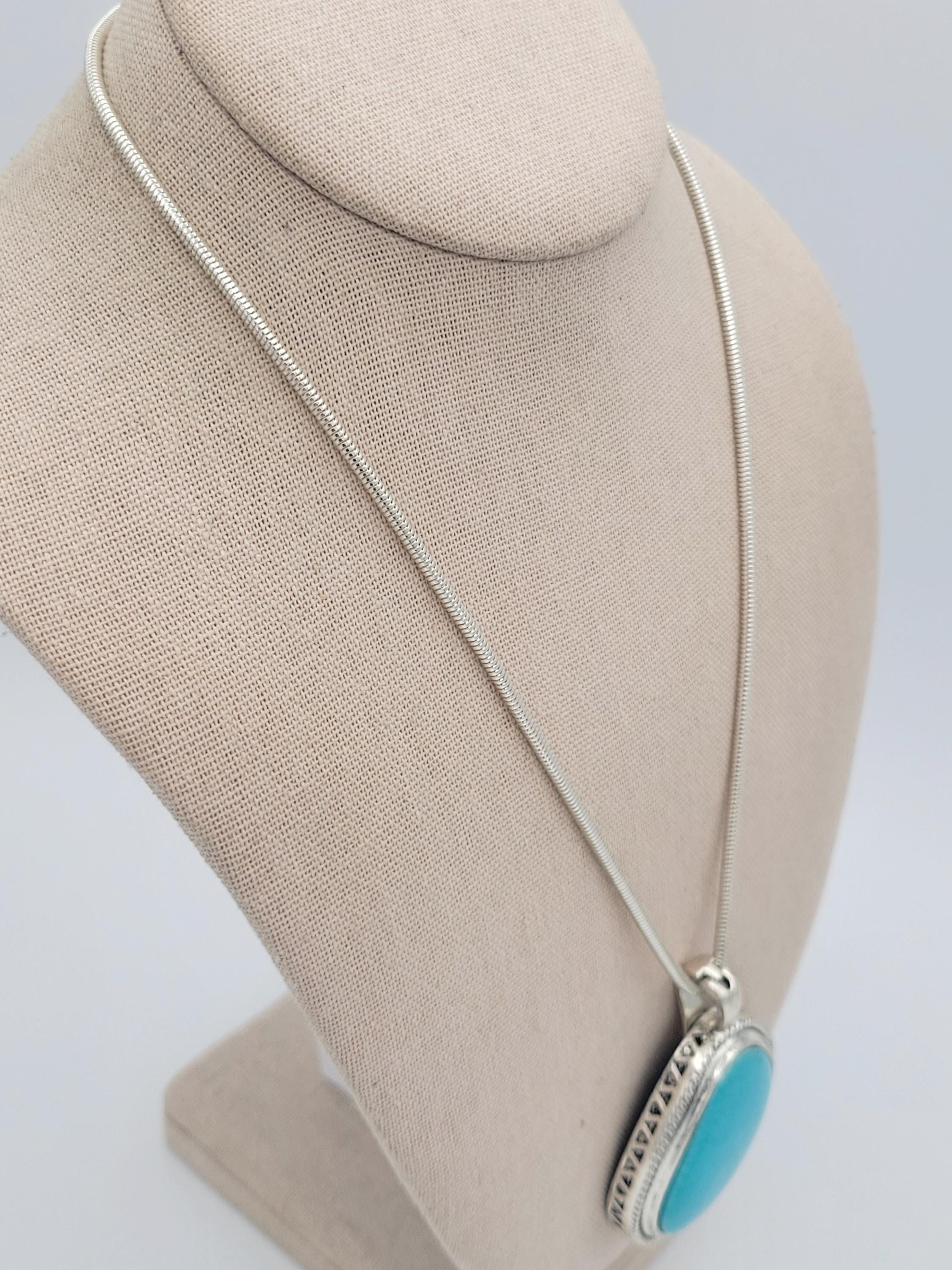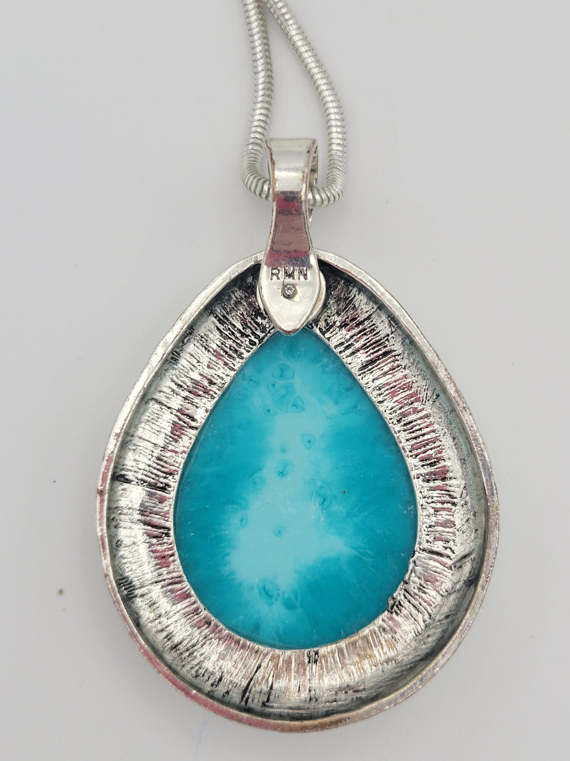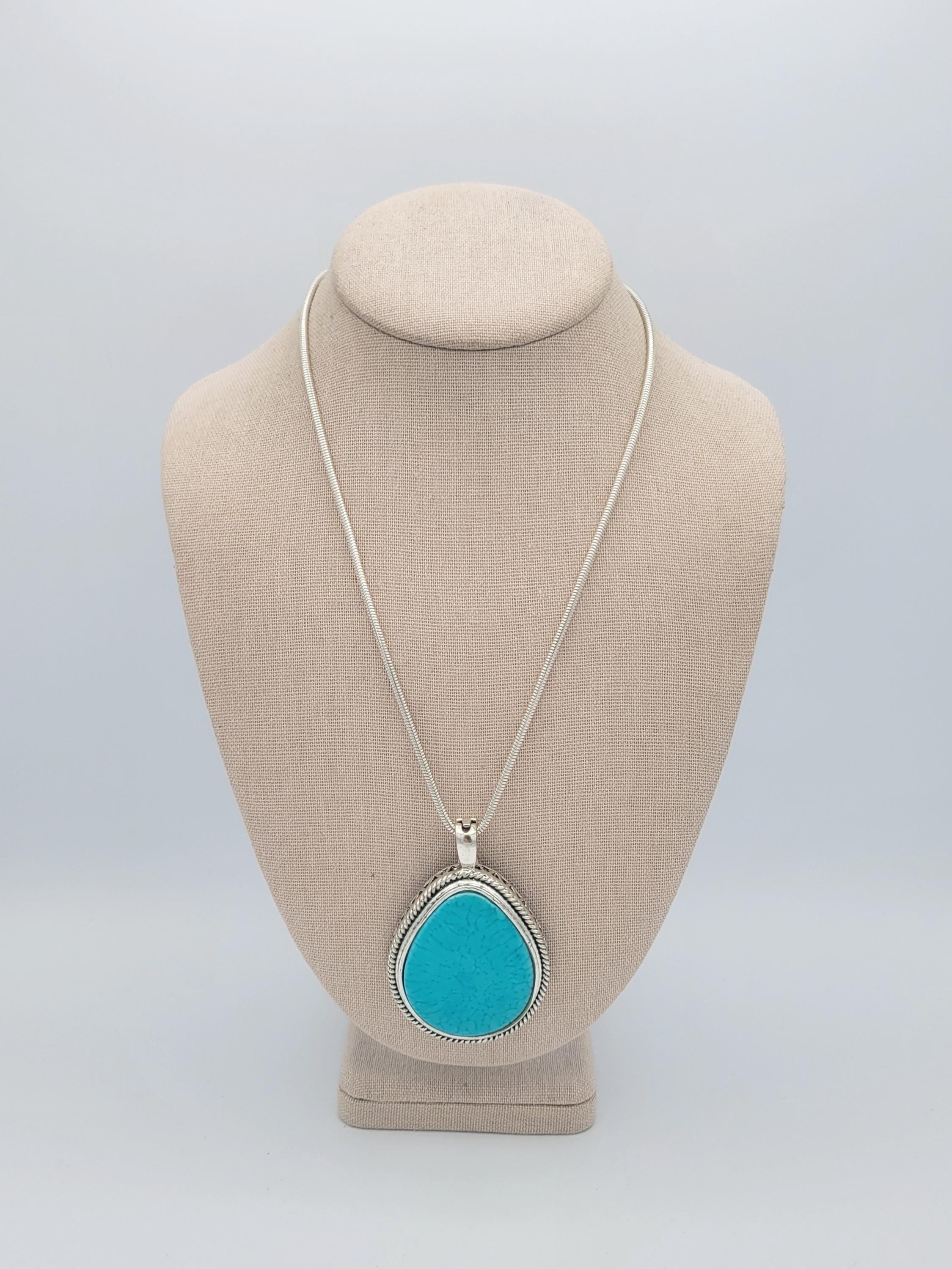This stunning piece makes an eye-catching statement necklace. The silver-tone serpentine chain secures with a lobster claw clasp. The large pendant has a hinged magnetic bale & is marked RMN. The teardrop-shaped pendant features a triangle & rope-patterned edge & a large faux turquoise cabochon in the center. This piece is in excellent vintage condition with a small amount of wear, mainly on the hinged bale.