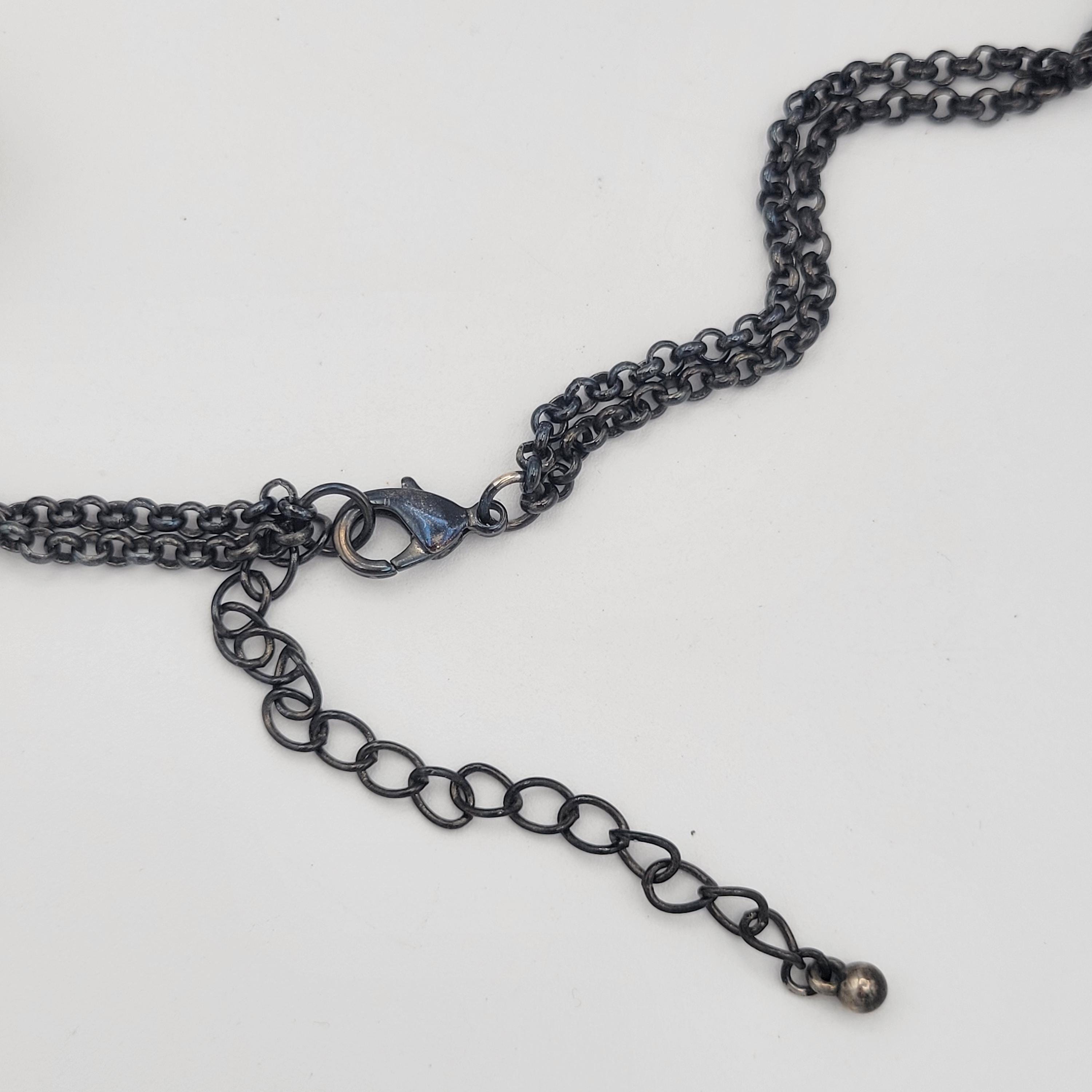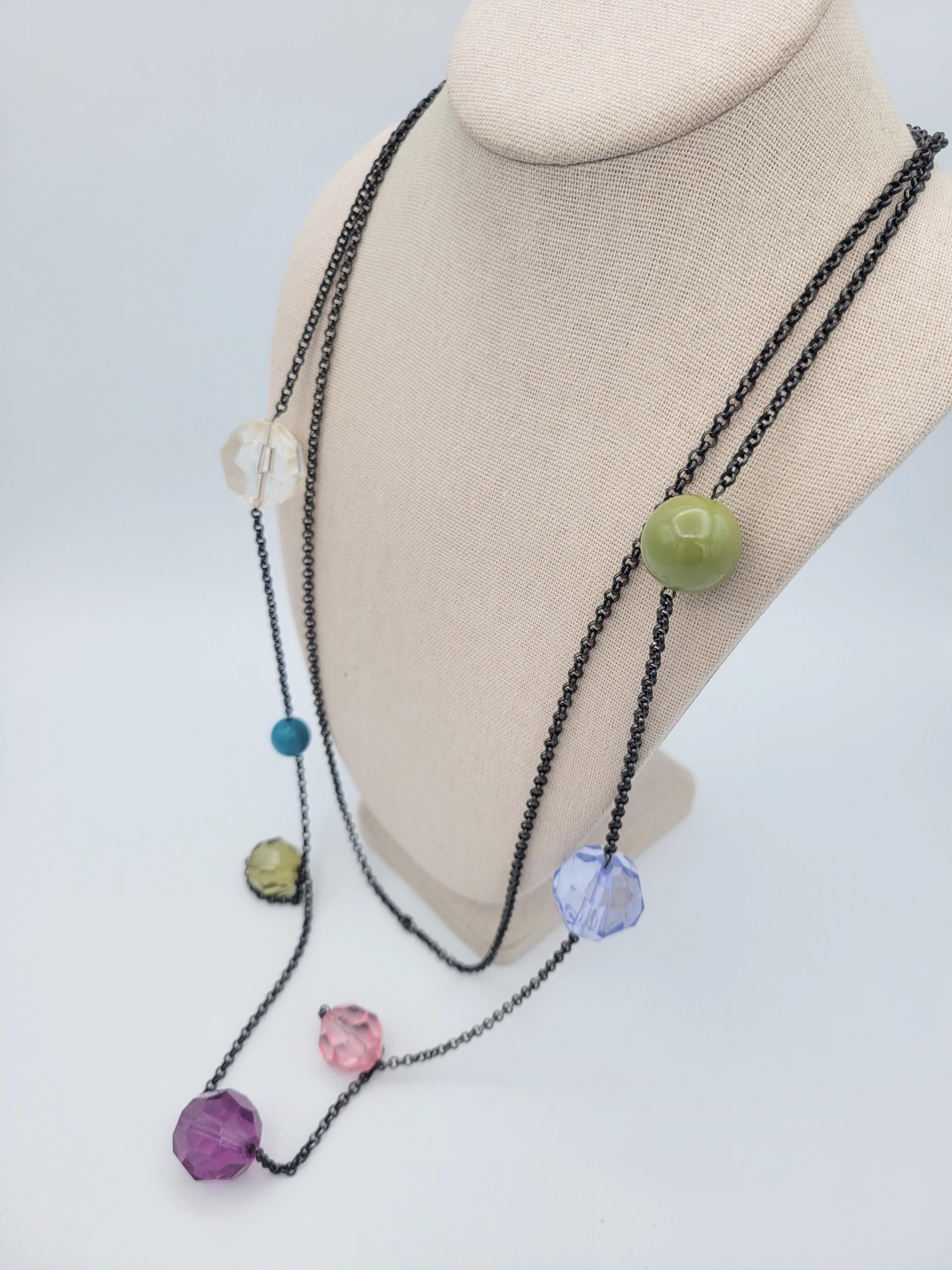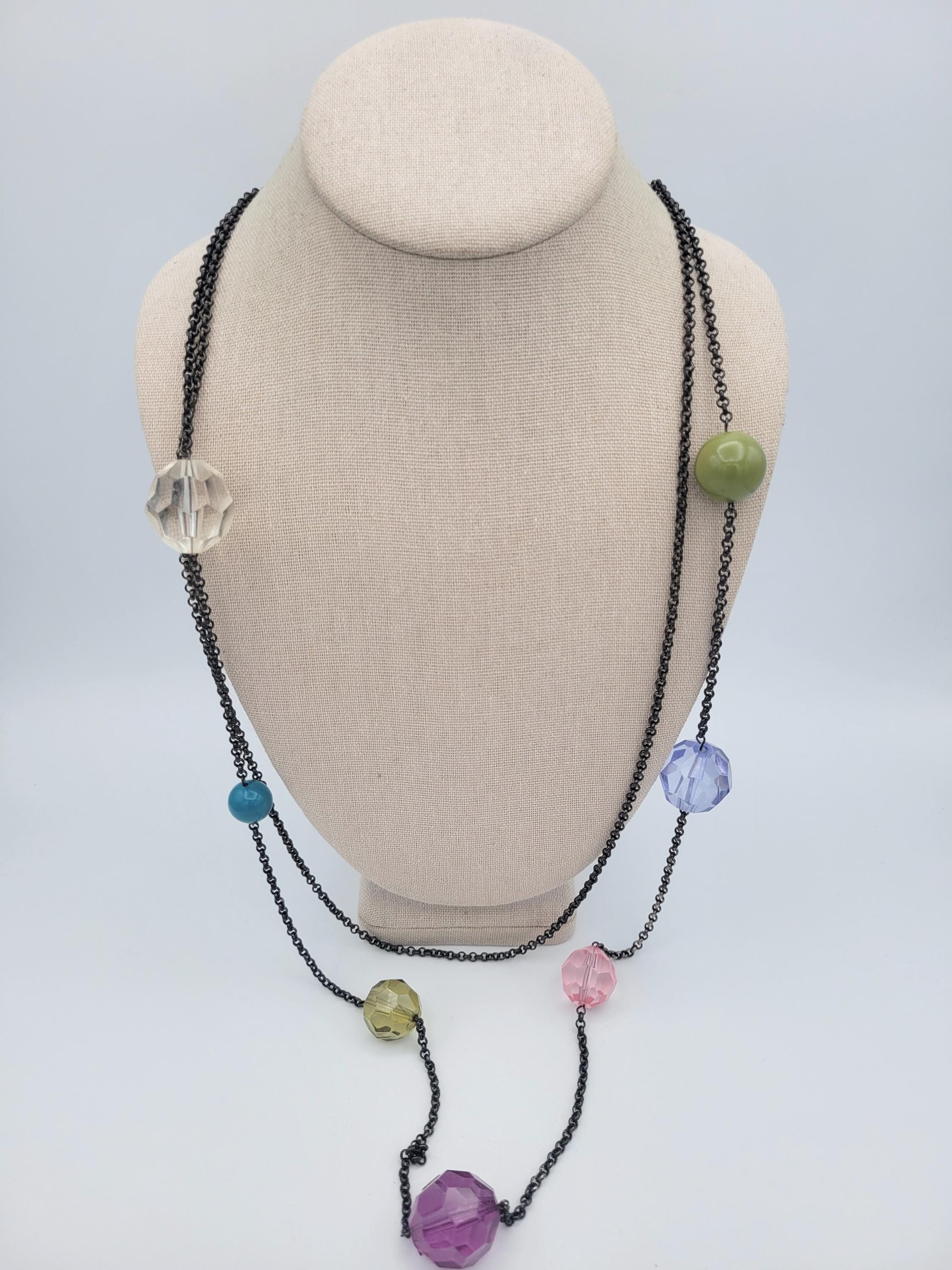 This colorful necklace makes a great statement piece. The black gunmetal cable chain has 2 strands & secures with a lobster claw clasp. The necklace is adjustable for length. Along the chains are large faceted beads & 2 smooth beads in a variety of colors & sizes. This piece is in excellent vintage condition with very little wear.
