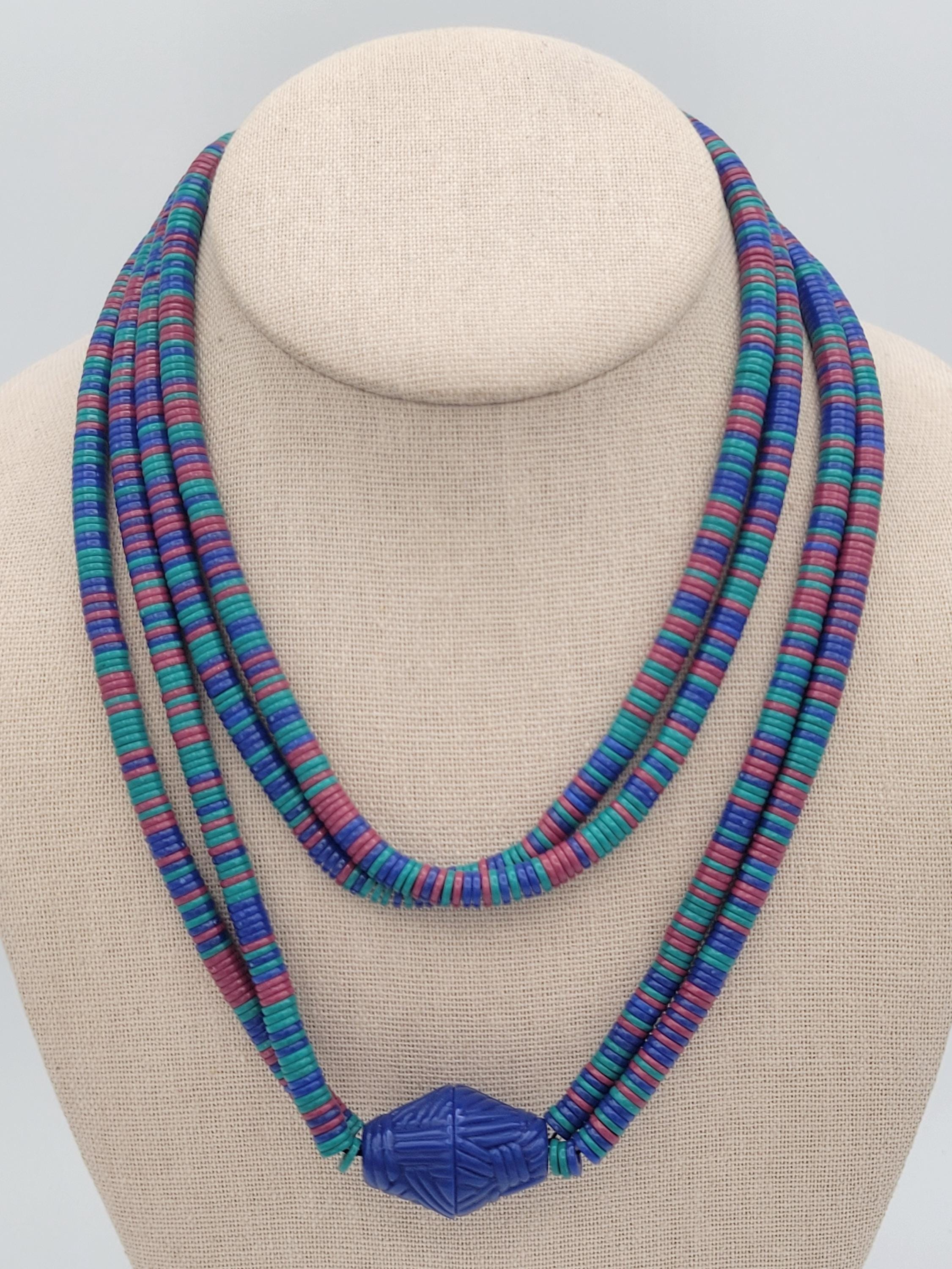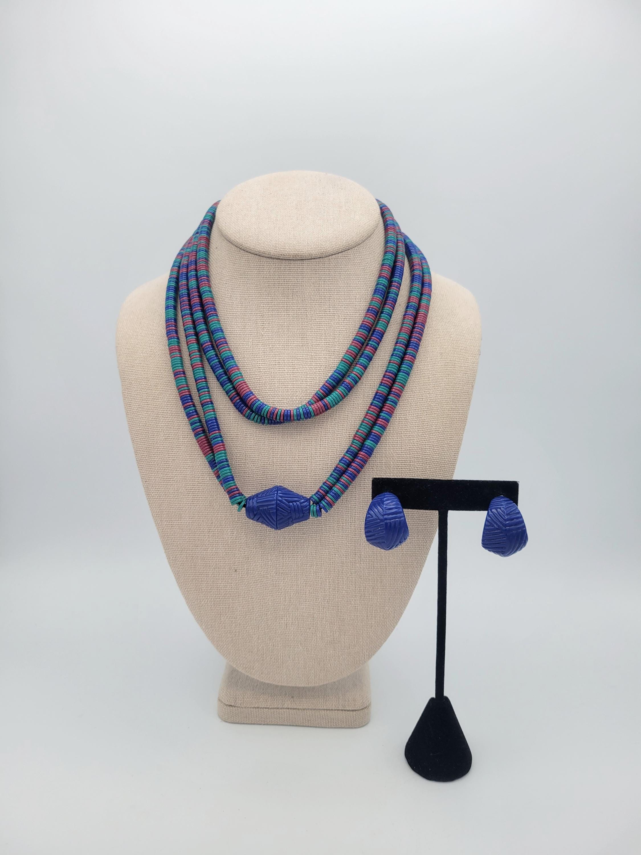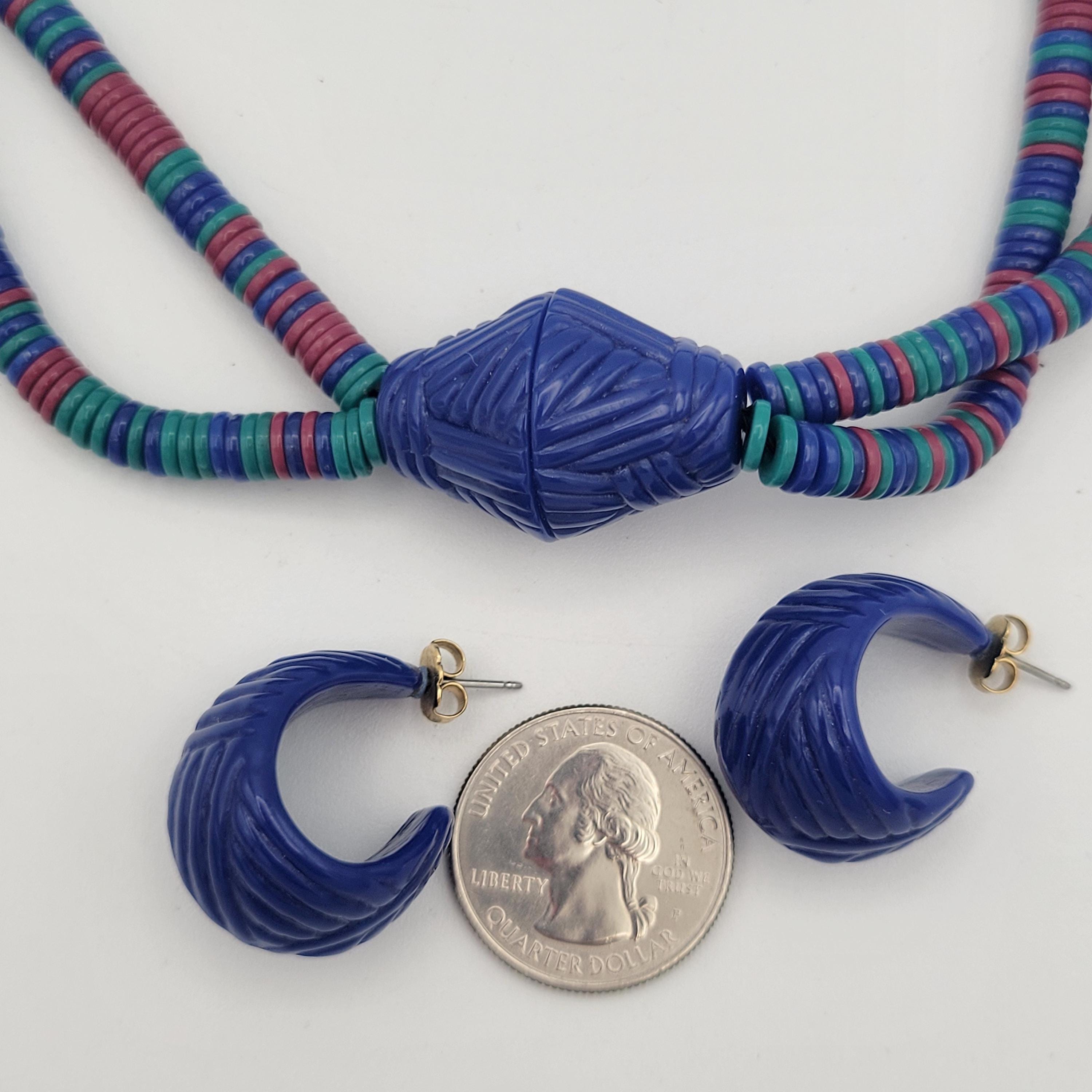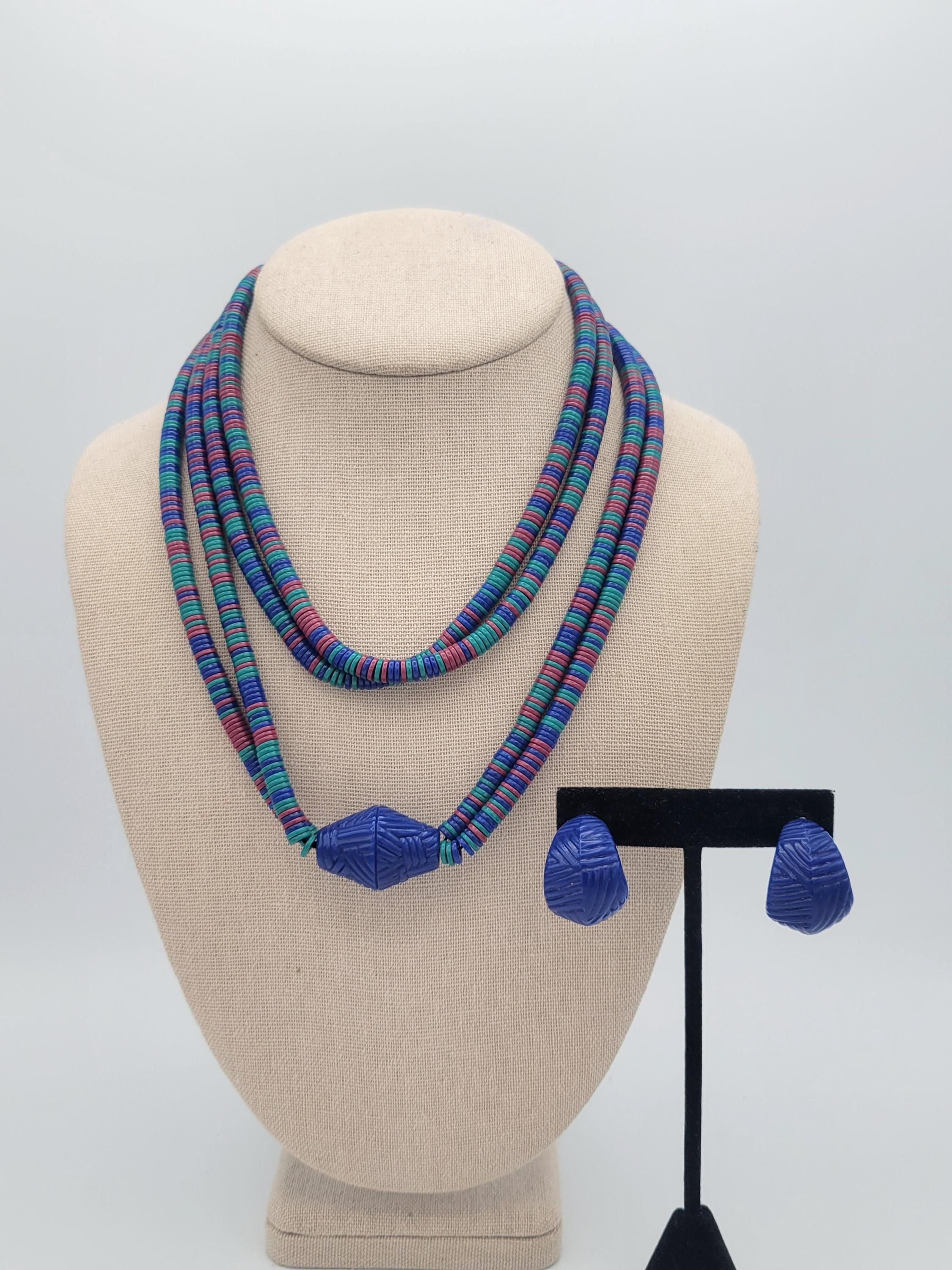 This vintage jewelry set has a great retro look. The necklace is made of two strands of tiny disc-shaped beads in royal blue, teal & fuchsia. The necklace is accented with a large royal blue bicone bead & the stud earrings are made from the same material. This set is lightweight & fun! It is in excellent vintage condition with very little wear.