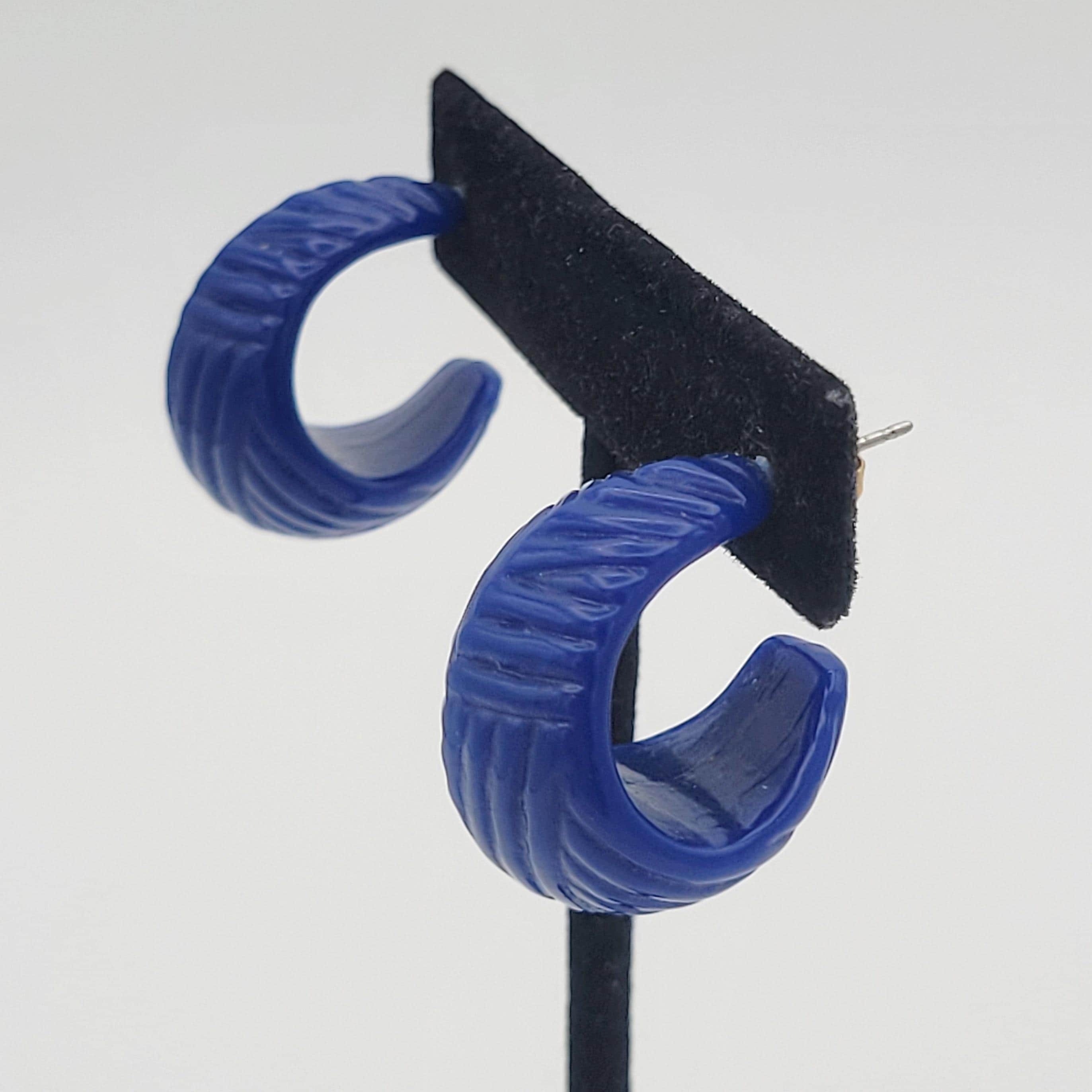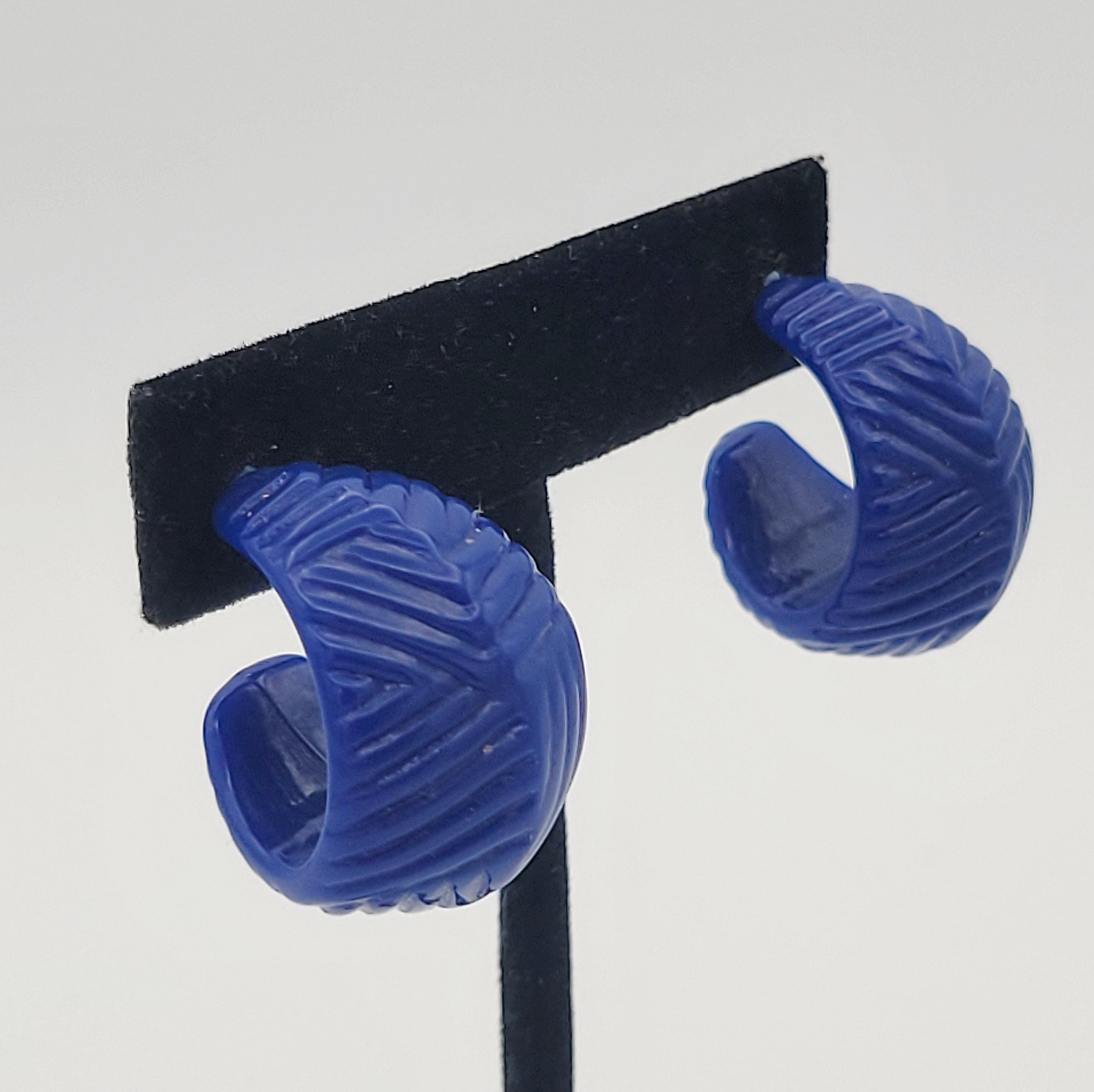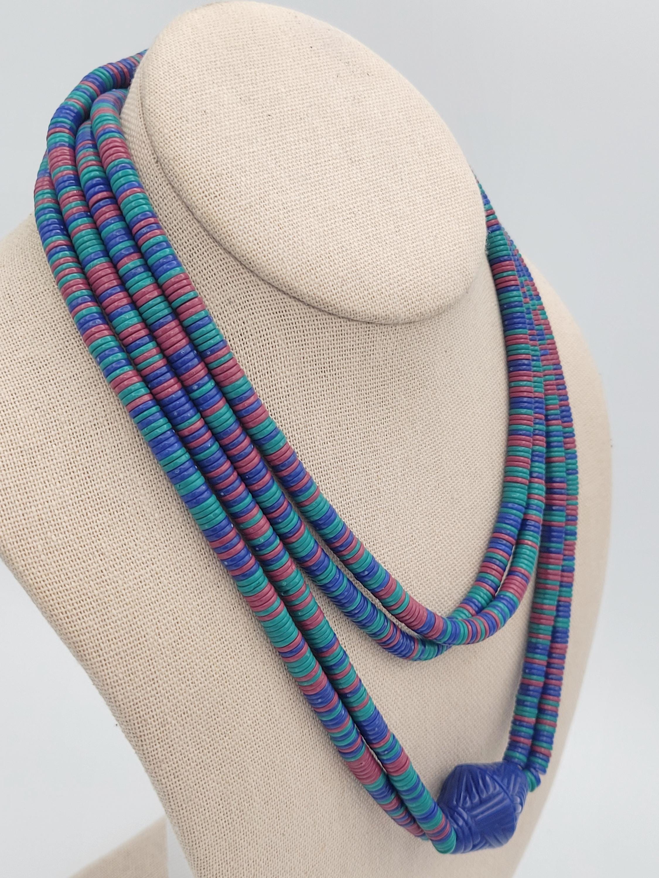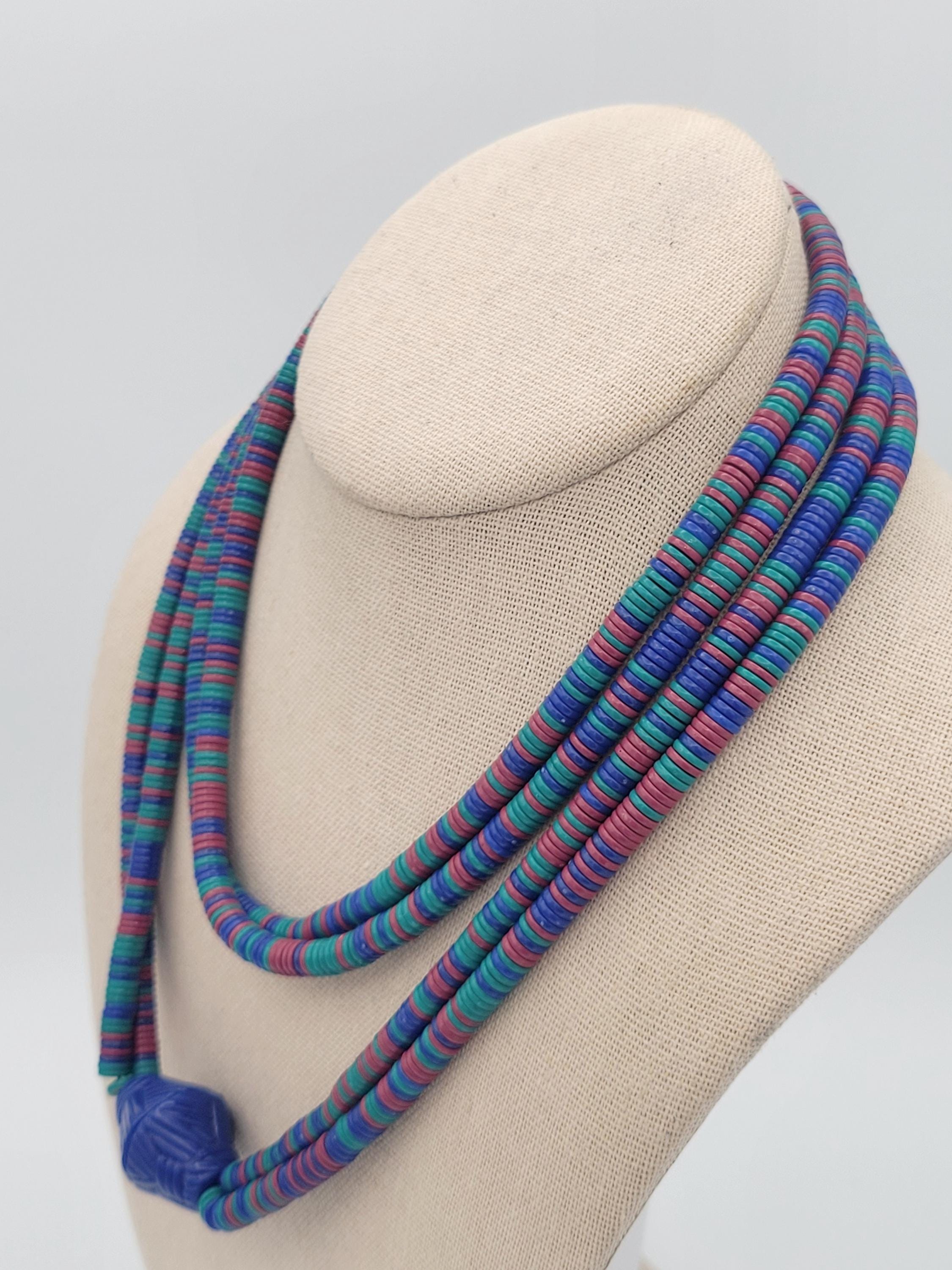 This vintage jewelry set has a great retro look. The necklace is made of two strands of tiny disc-shaped beads in royal blue, teal & fuchsia. The necklace is accented with a large royal blue bicone bead & the stud earrings are made from the same material. This set is lightweight & fun! It is in excellent vintage condition with very little wear.