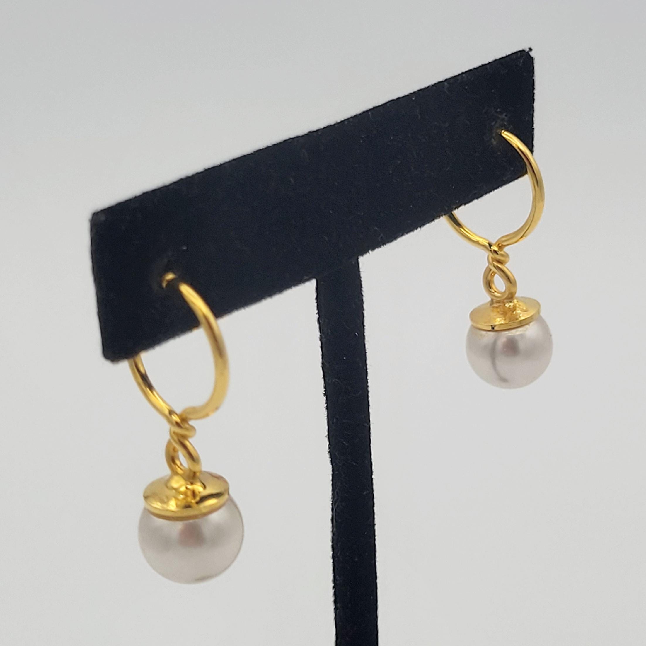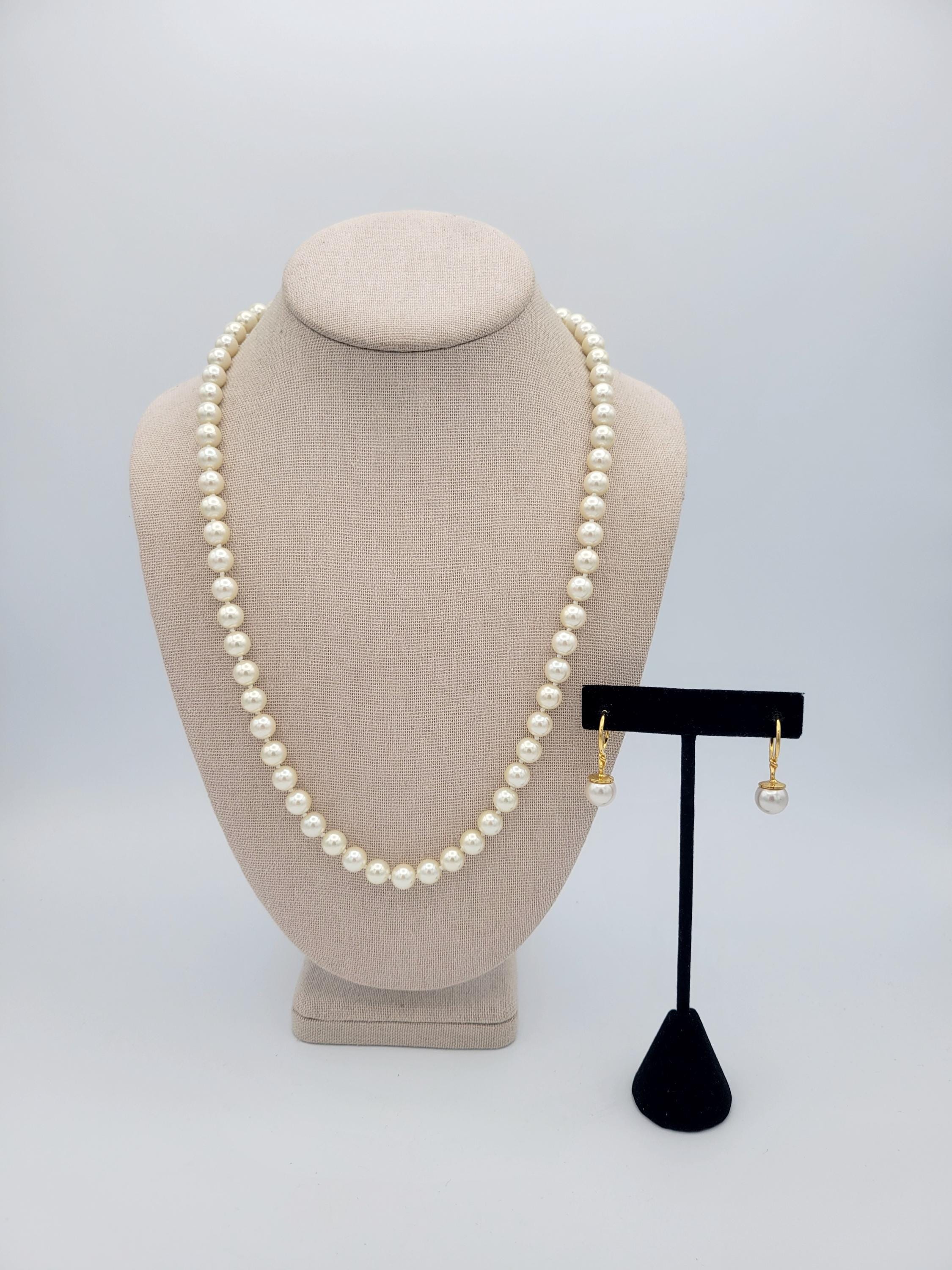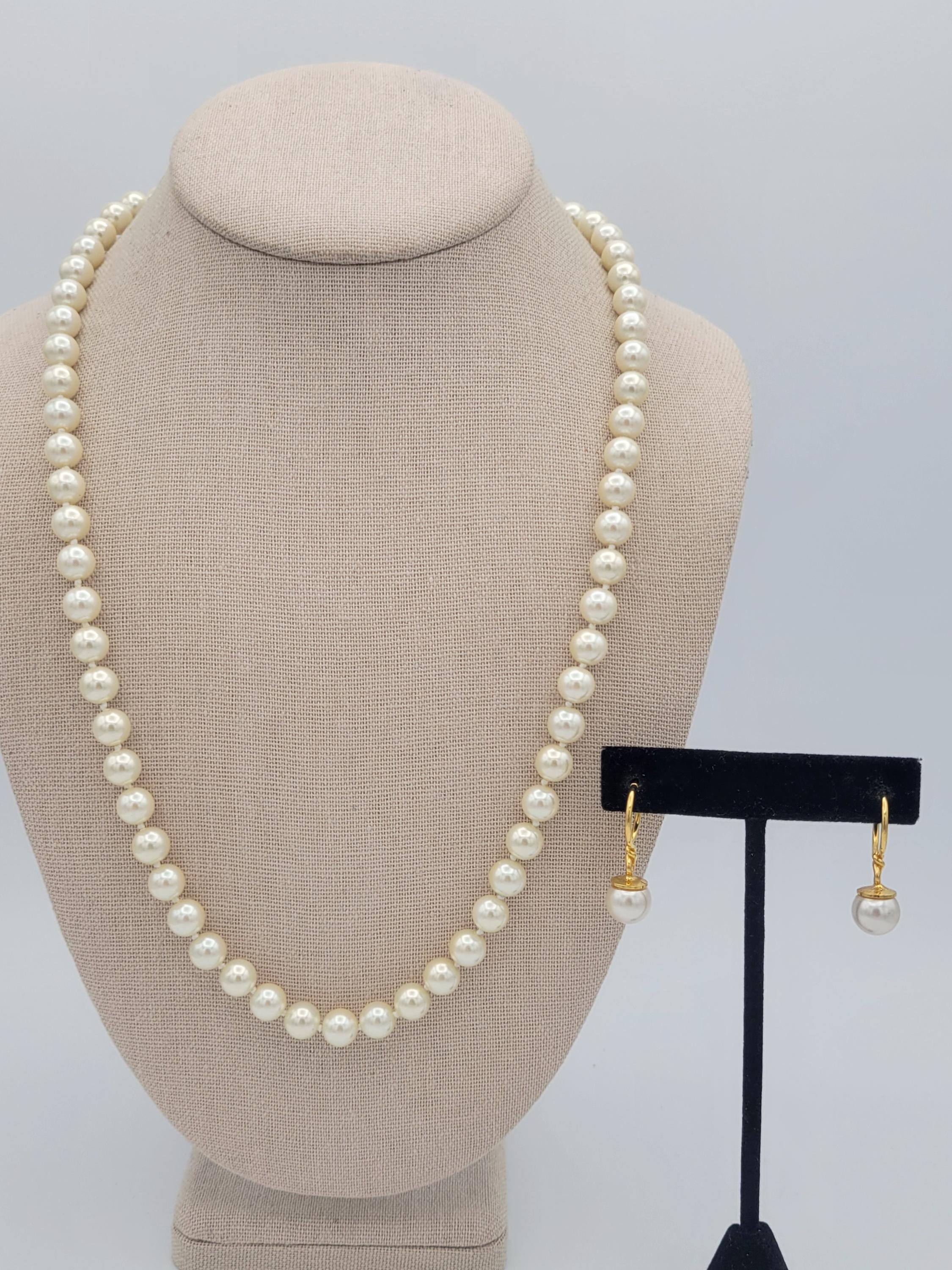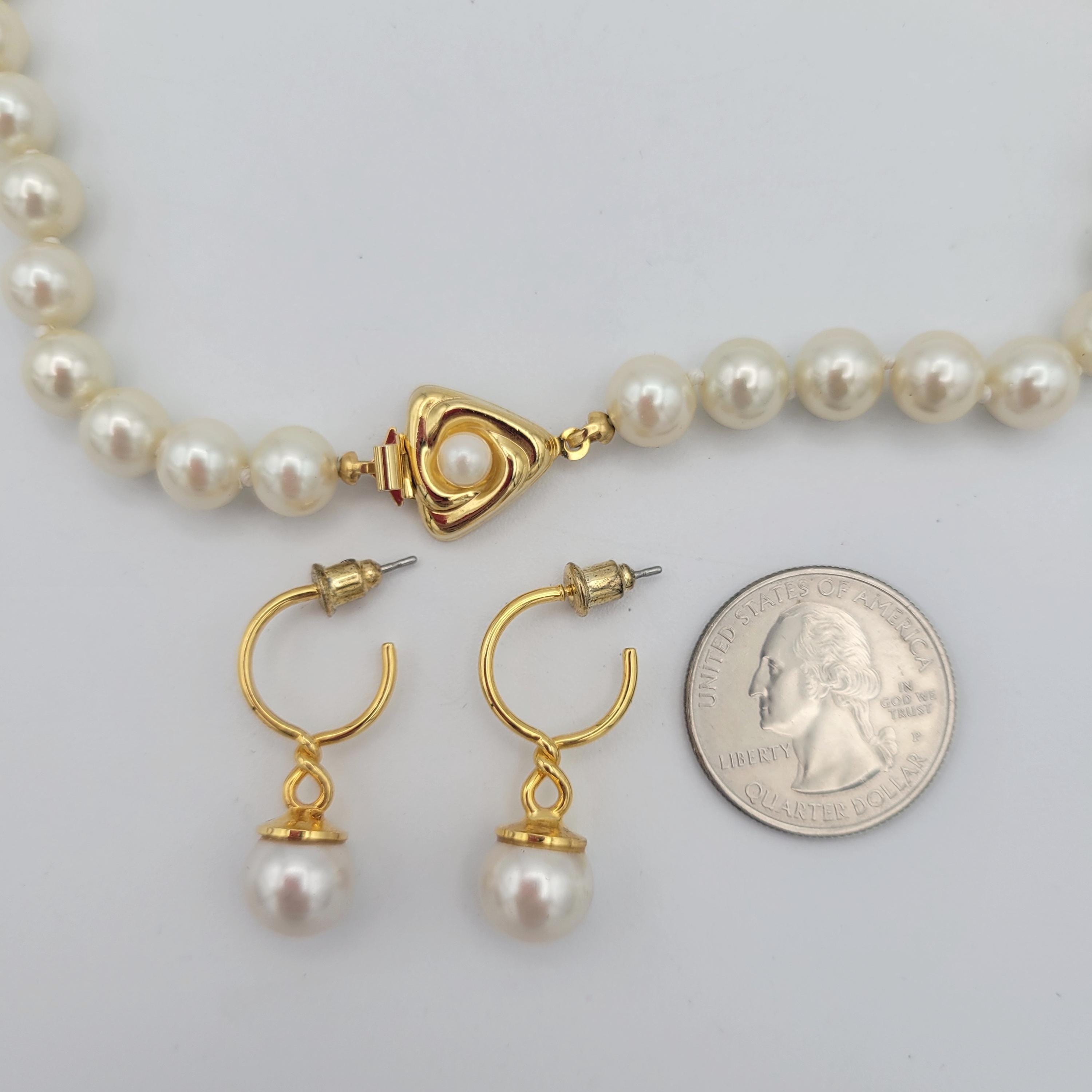 This classic jewelry set makes great accent pieces to add to your jewelry wardrobe. All 3 pieces are made with white faux pearls & gold-tone accents. The beads on the necklace is knotted & secures with a box clasp. This set is in excellent, nearly-new condition.