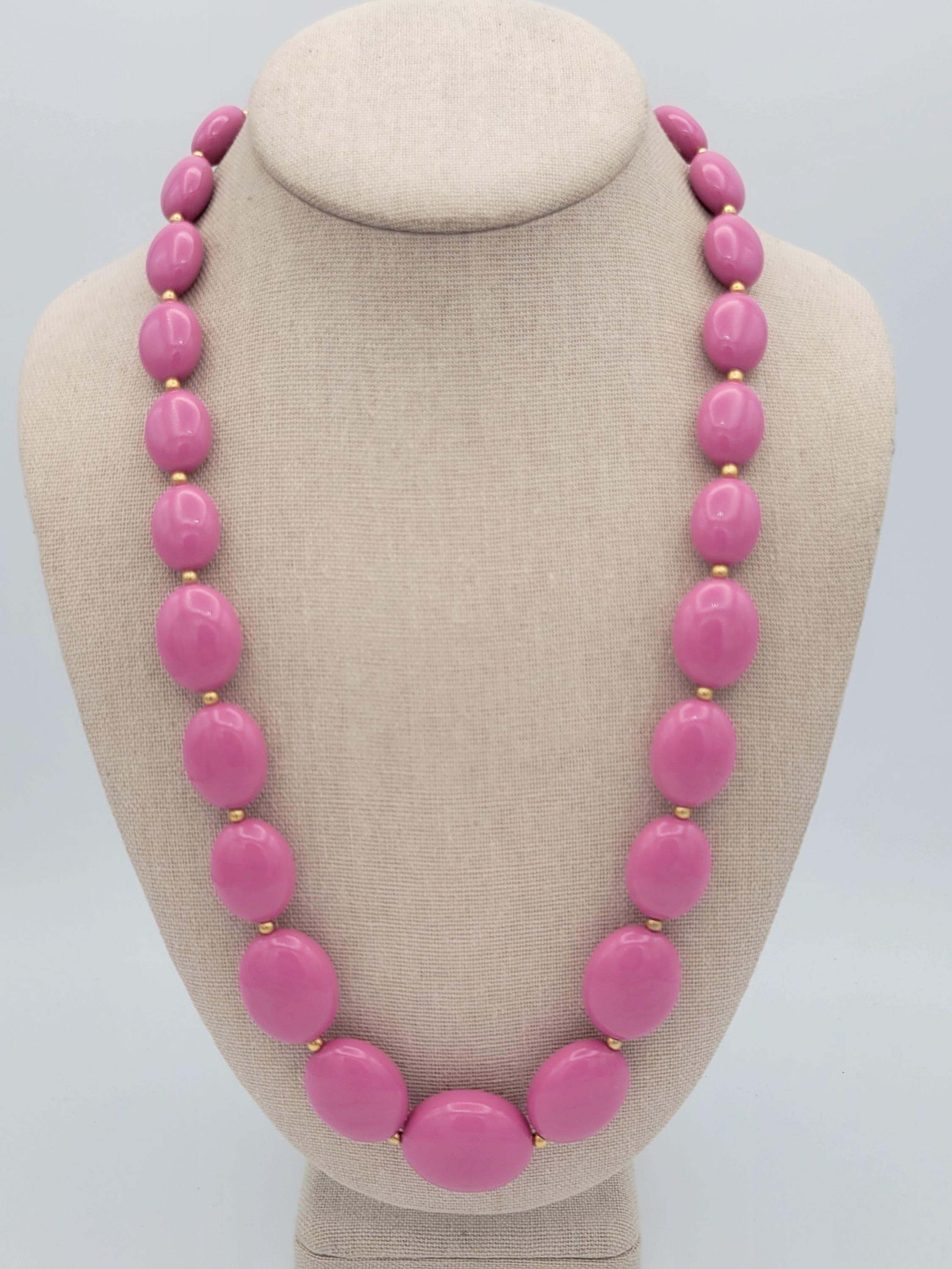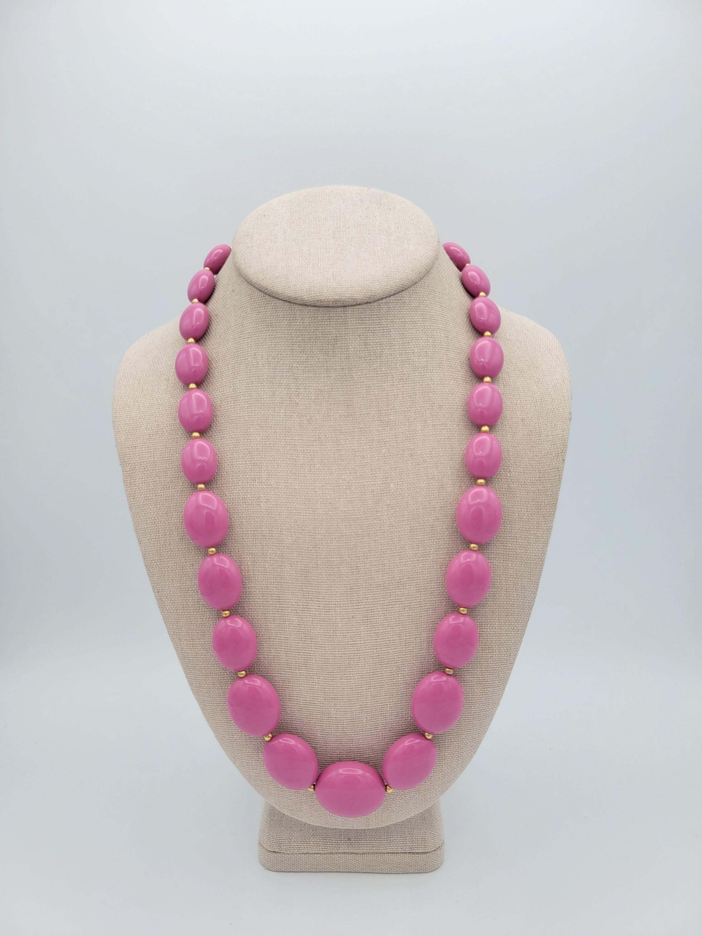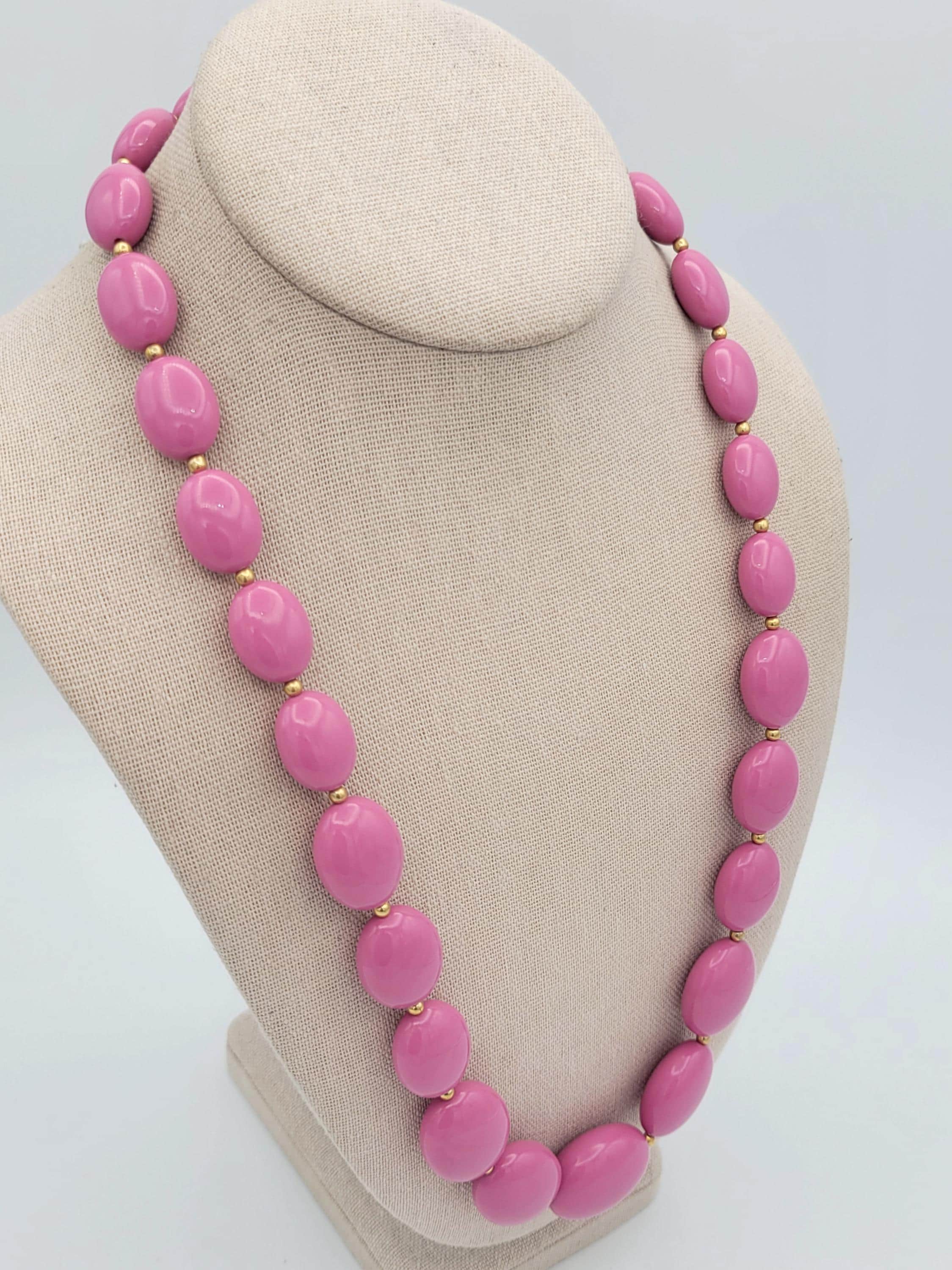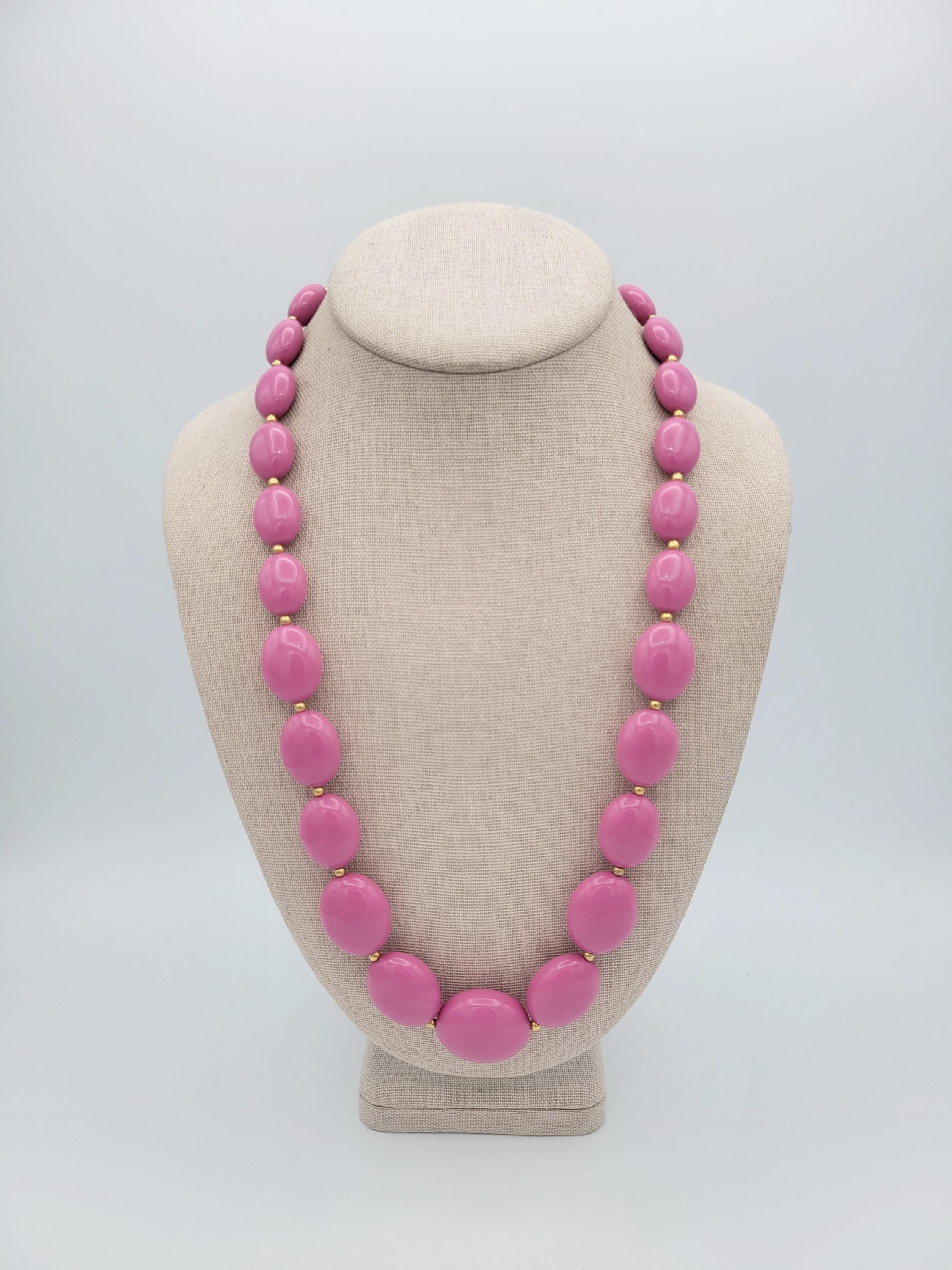 This adorable necklace makes a great statement piece. This piece is made from a single strand of lightweight pink plastic oval-shaped beads with small gold-tone spacer beads. The necklace secures with a spring-ring clasp. This piece is in excellent vintage condition with very little wear.