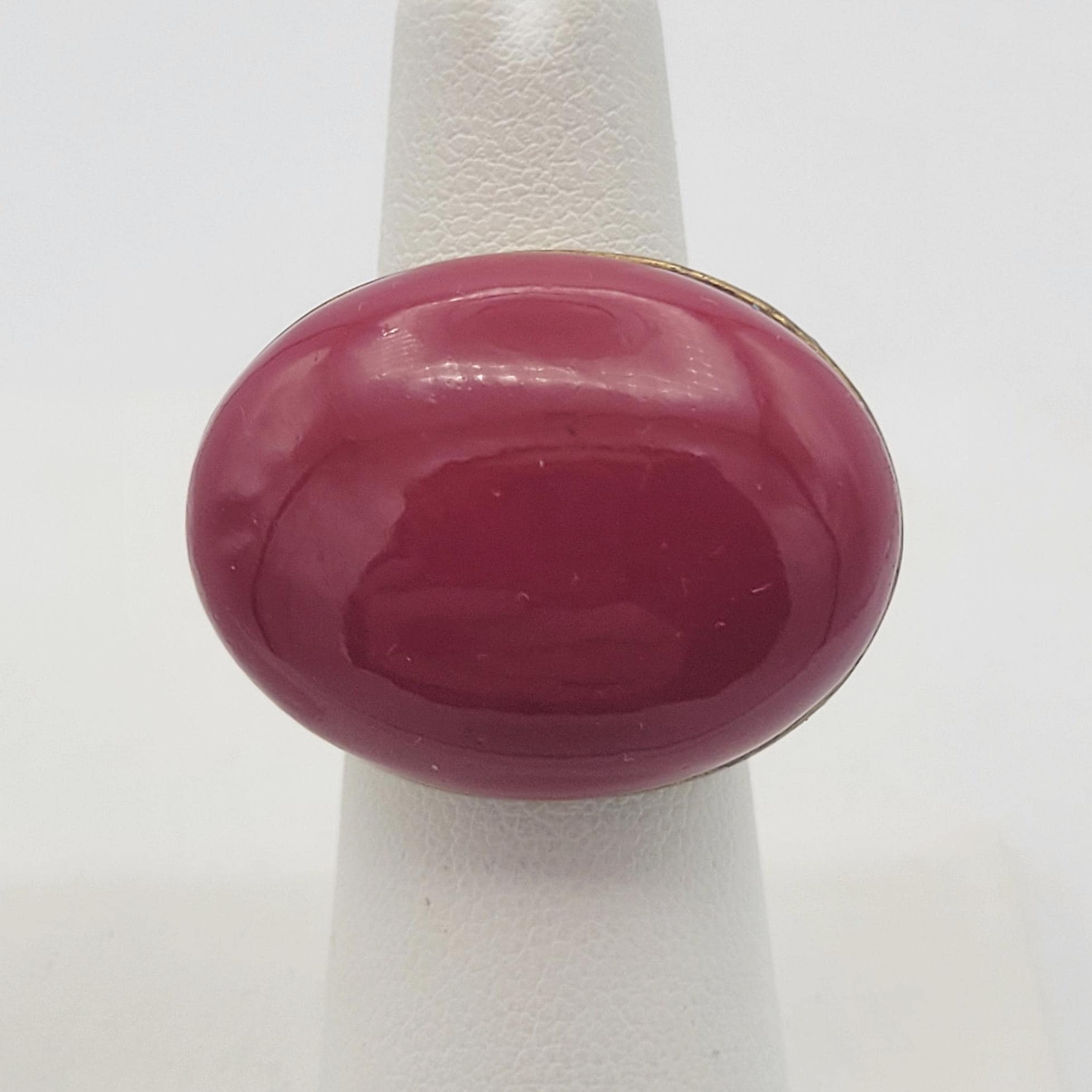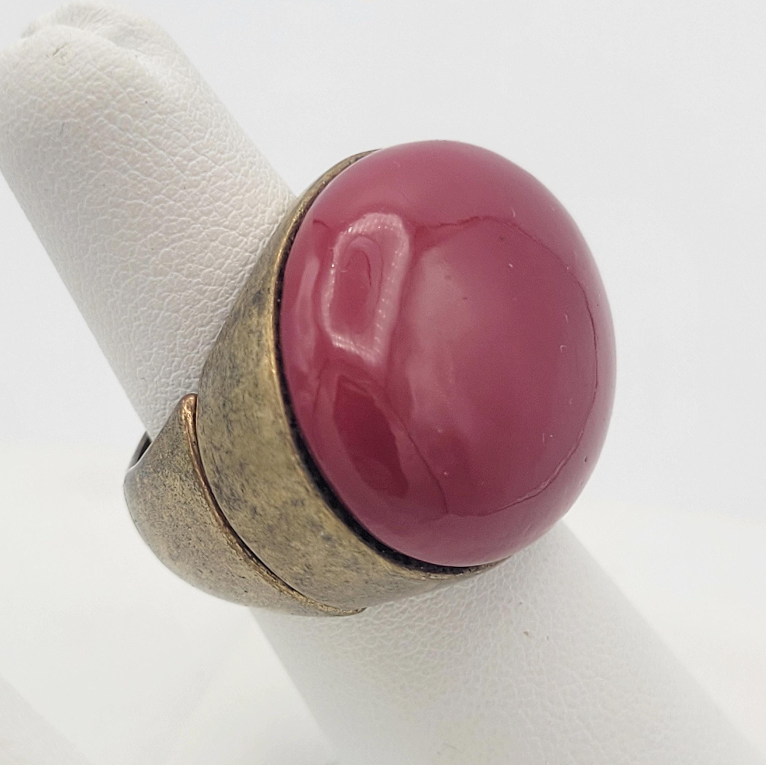 This chunky ring is sure to get noticed! The antique gold-tone band stretches to adjust for fit & provides a setting for a very large oval raspberry-colored cabochon. This piece is in excellent vintage condition with very little wear.