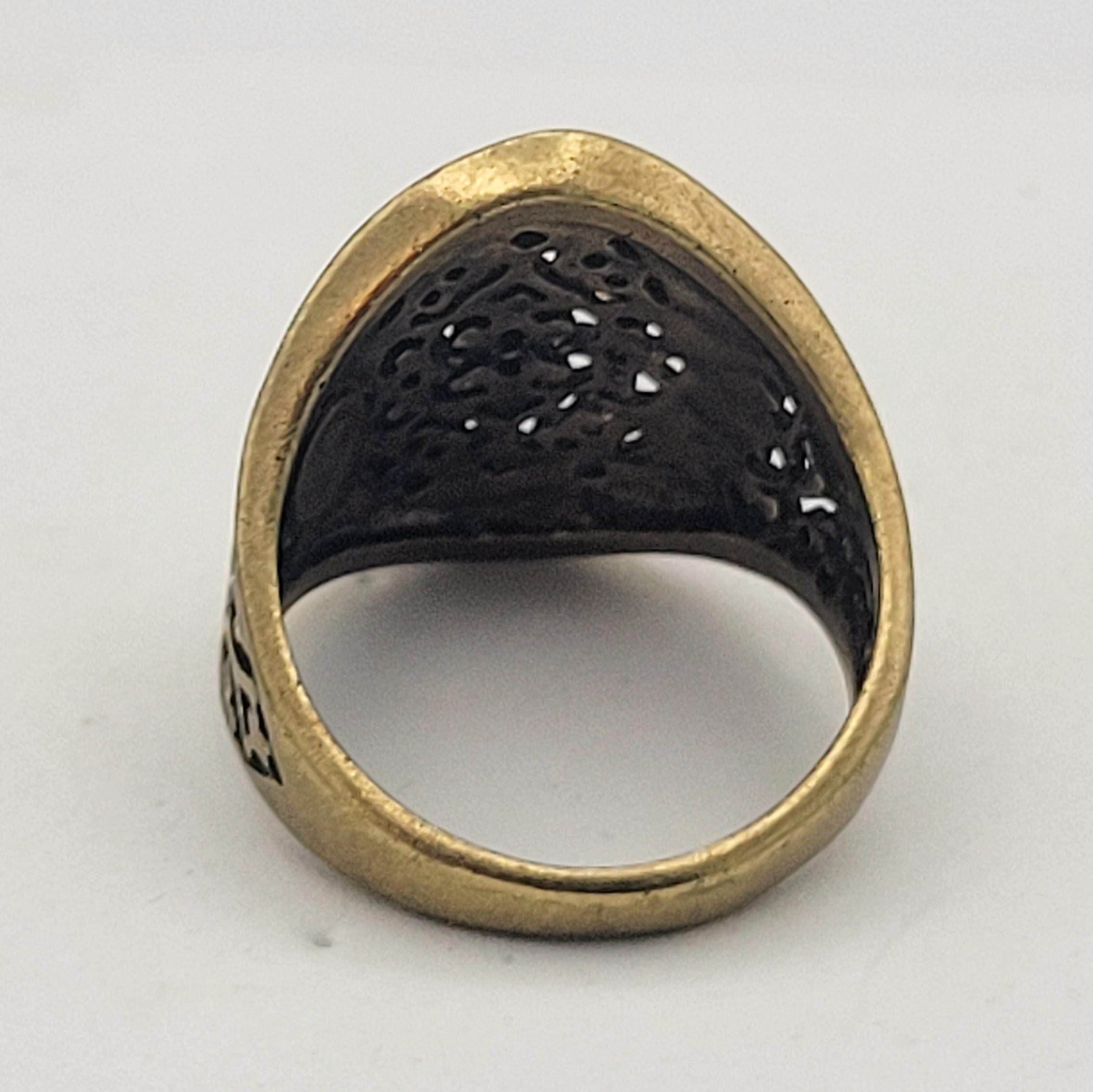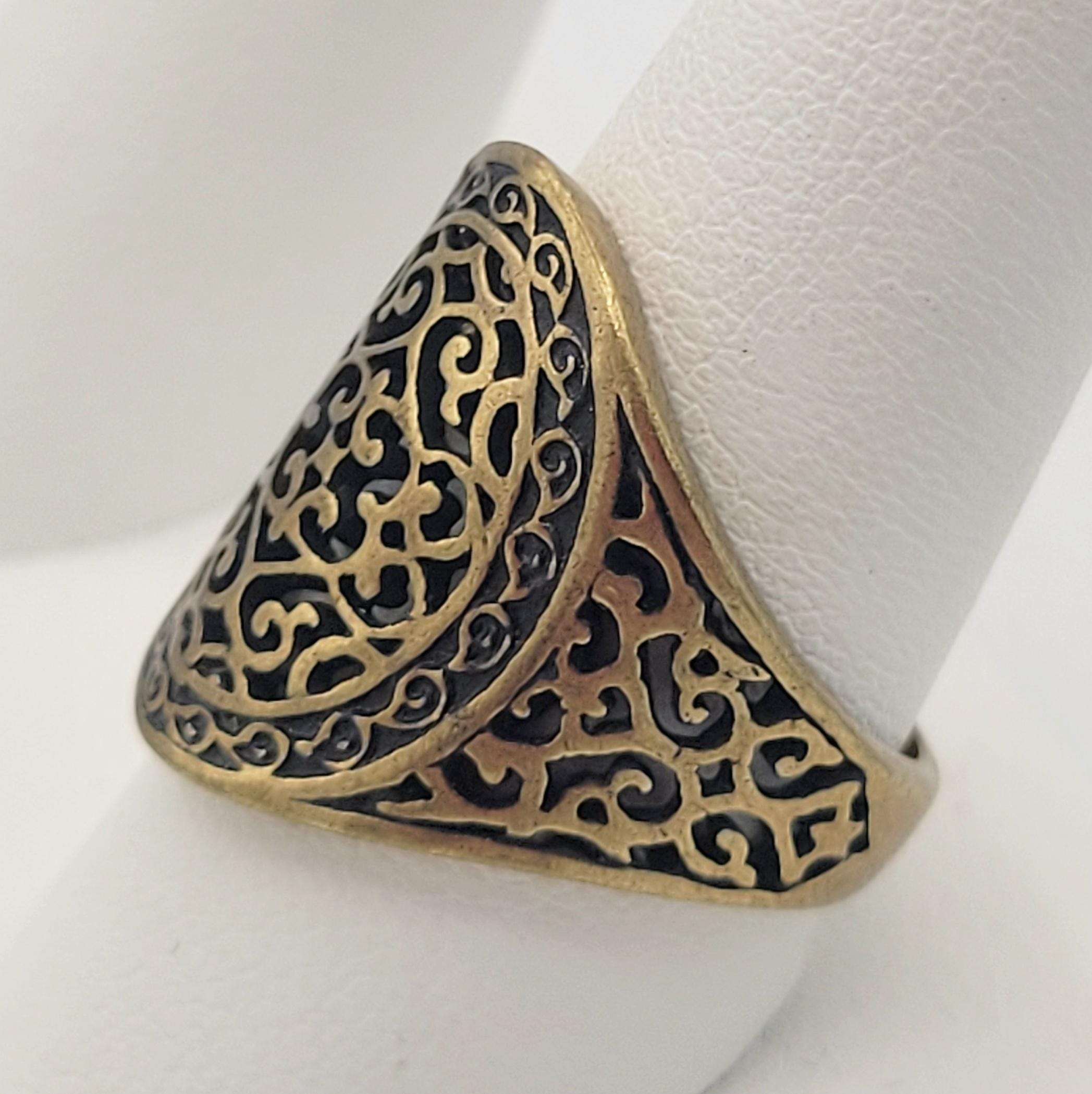 This chunky ring is sure to get noticed! The antique gold-tone ring broadens to a wide face. The piece is covered with openwork filigree & is signed with the Premier Designs mark on the inside. This piece is in excellent vintage condition with very little wear.
