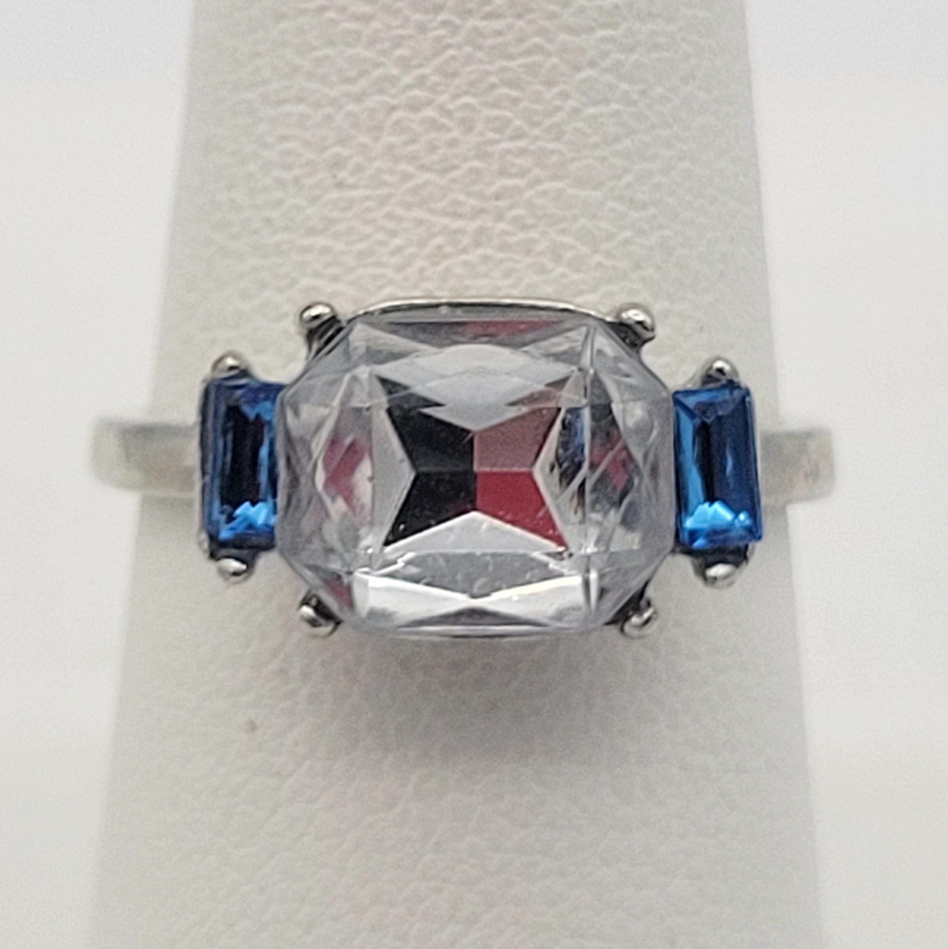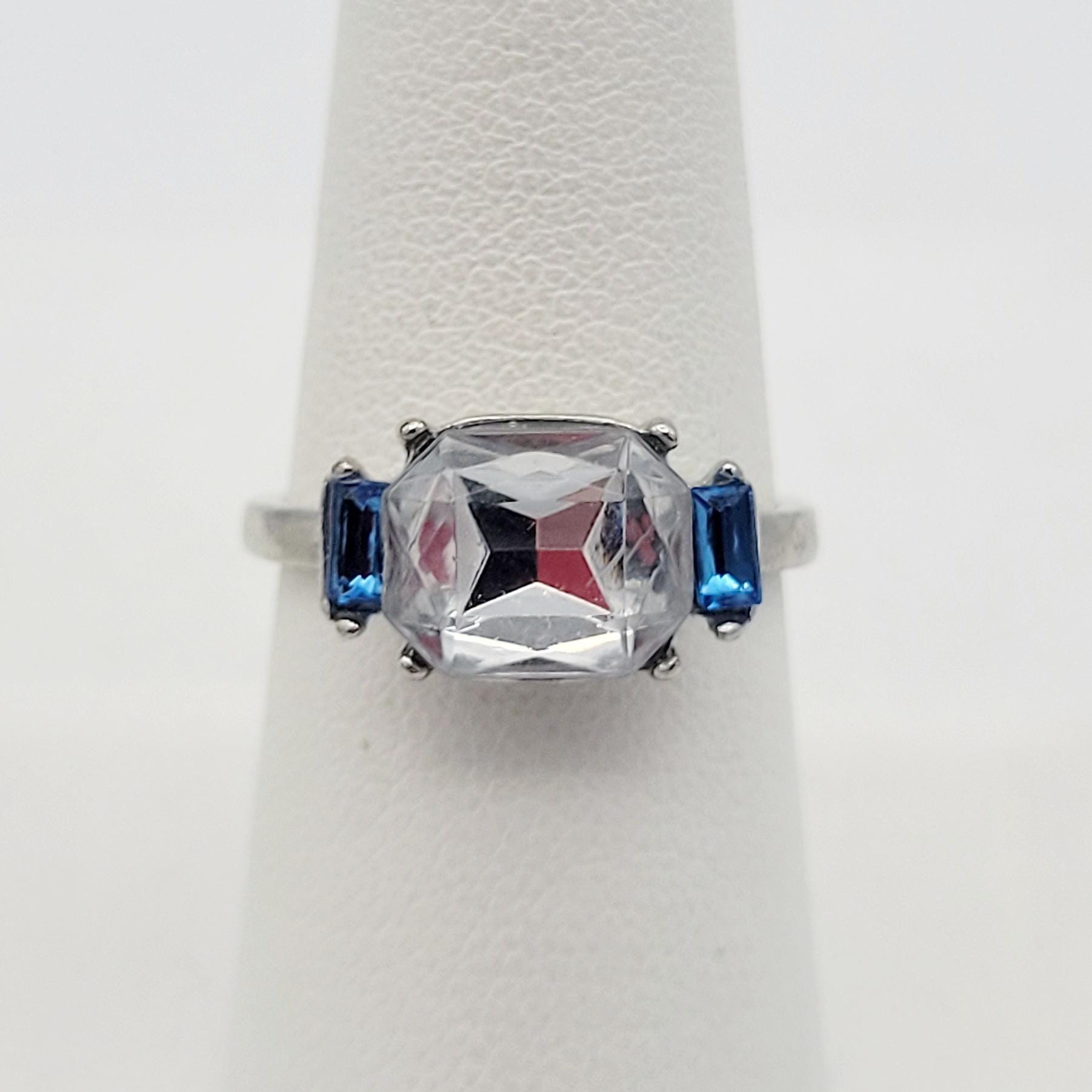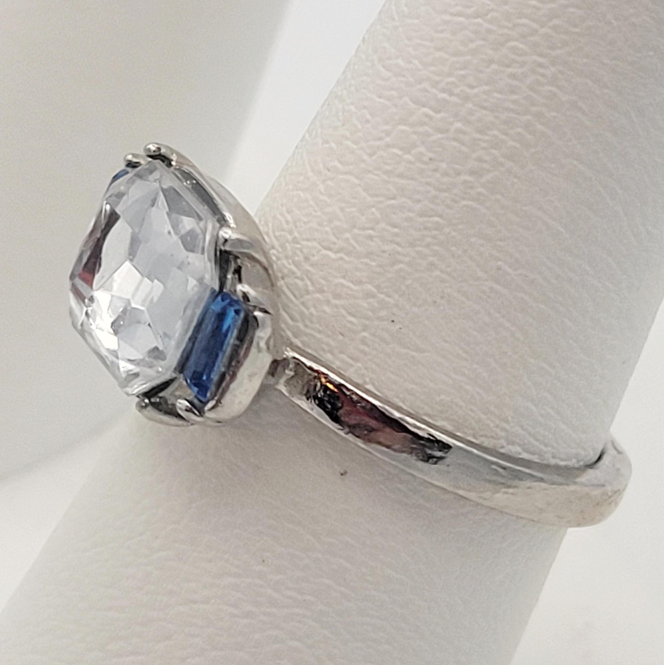 This dainty ring is a beautiful statement piece! The silver-tone band has a chrome finish & provides the setting for a large cushion-cut clear cubic zirconia stone. The CZ stone is flanked by 2 small emerald-cut faux sapphire stones. This piece is in excellent vintage condition with very little wear.