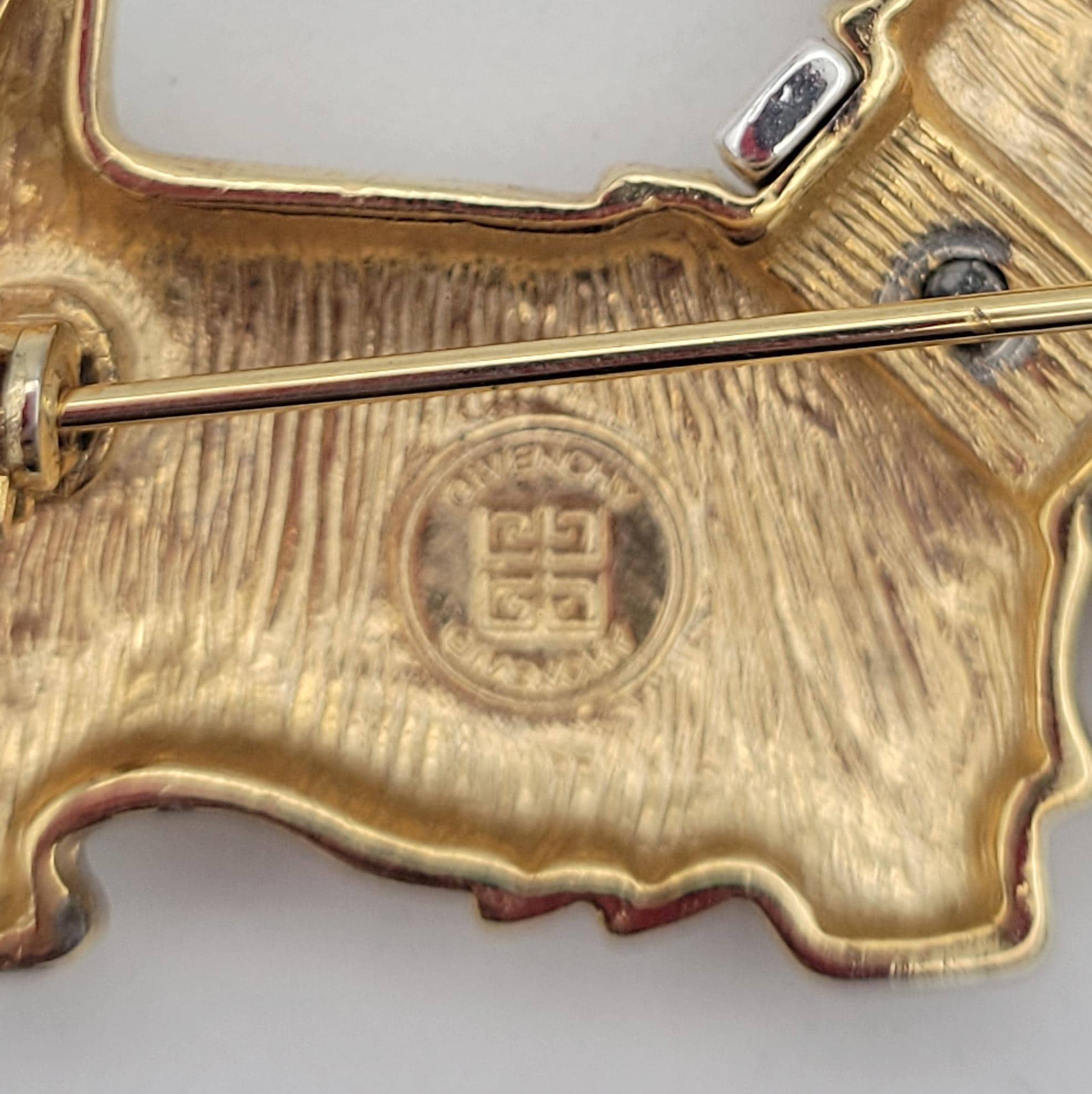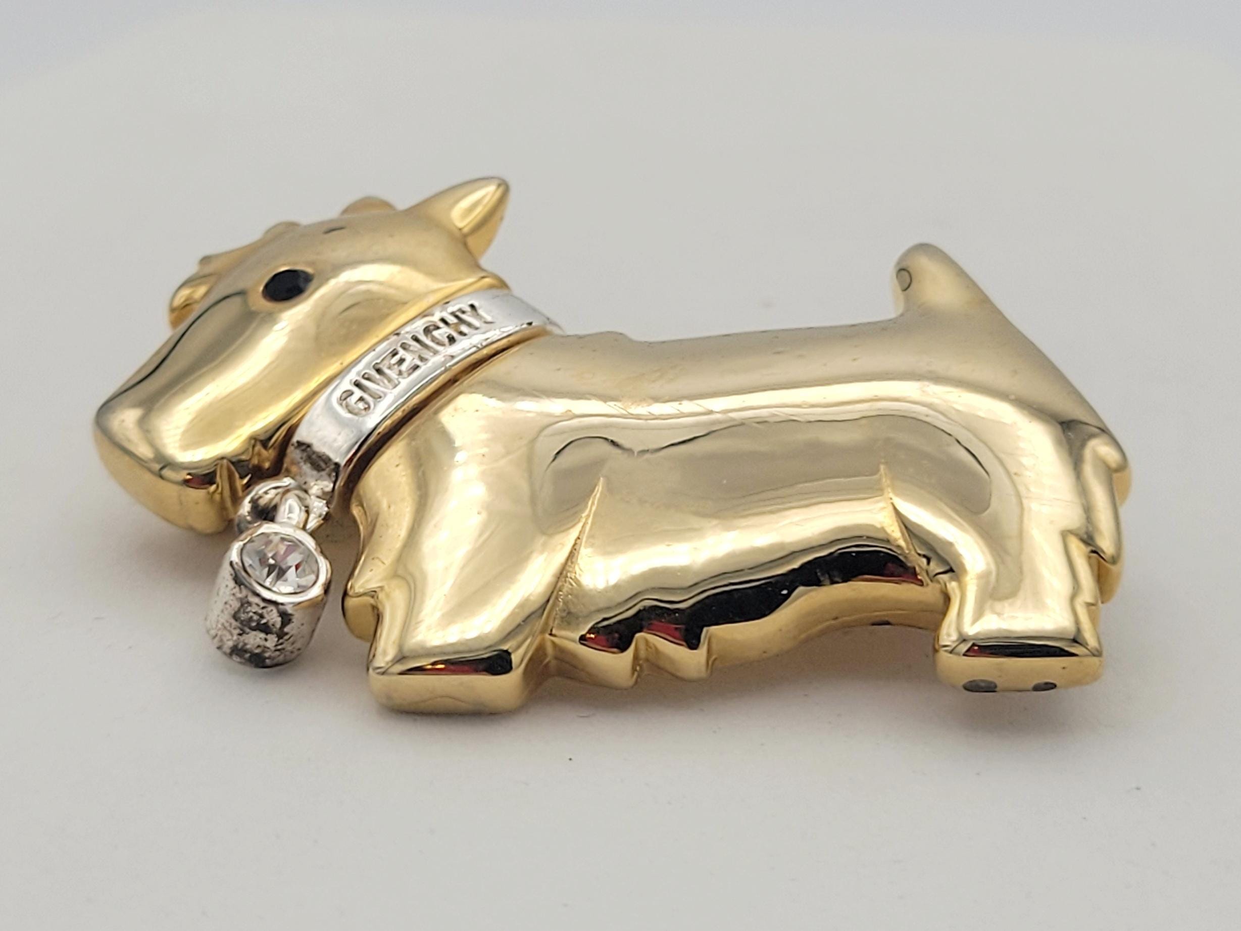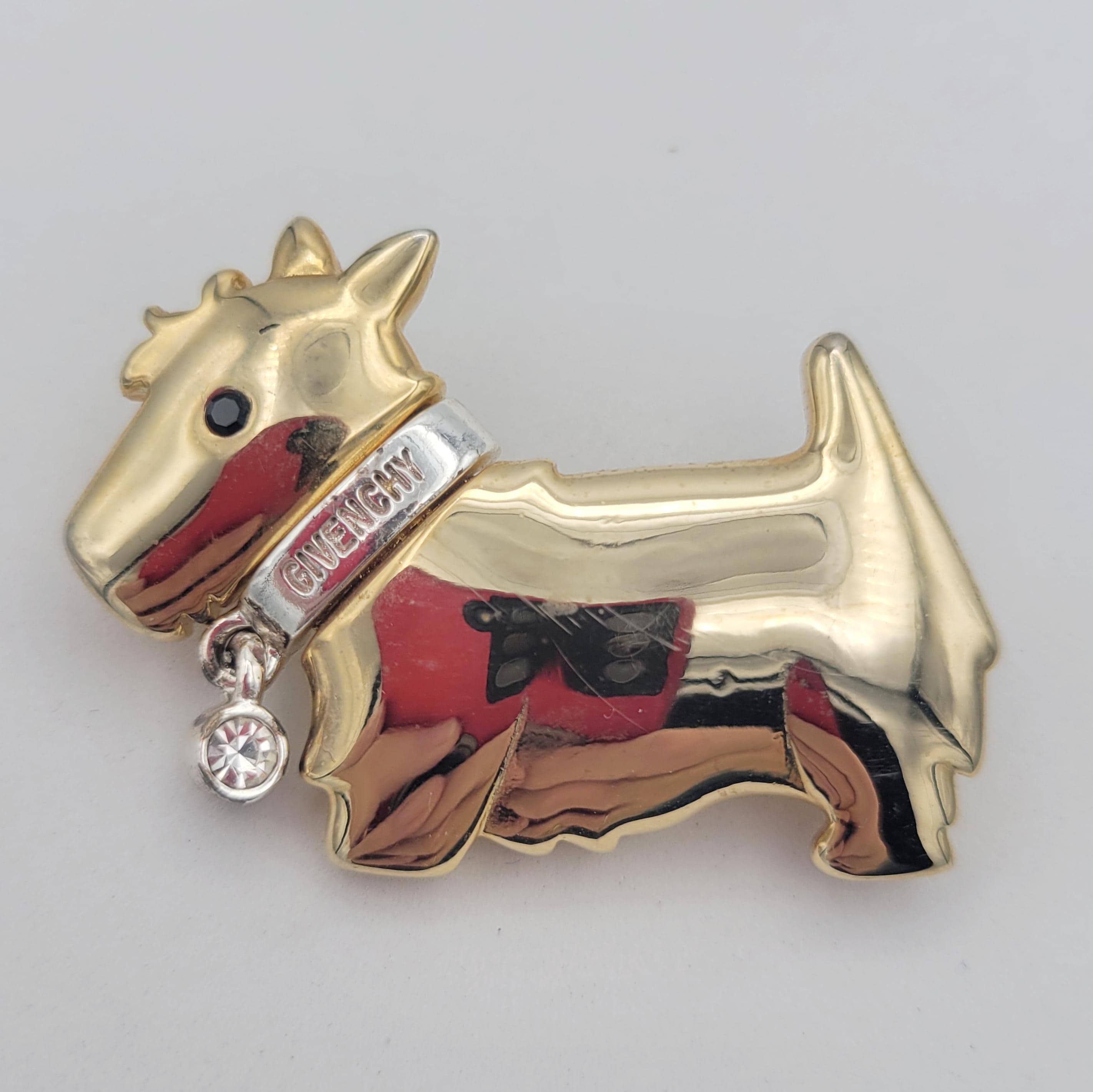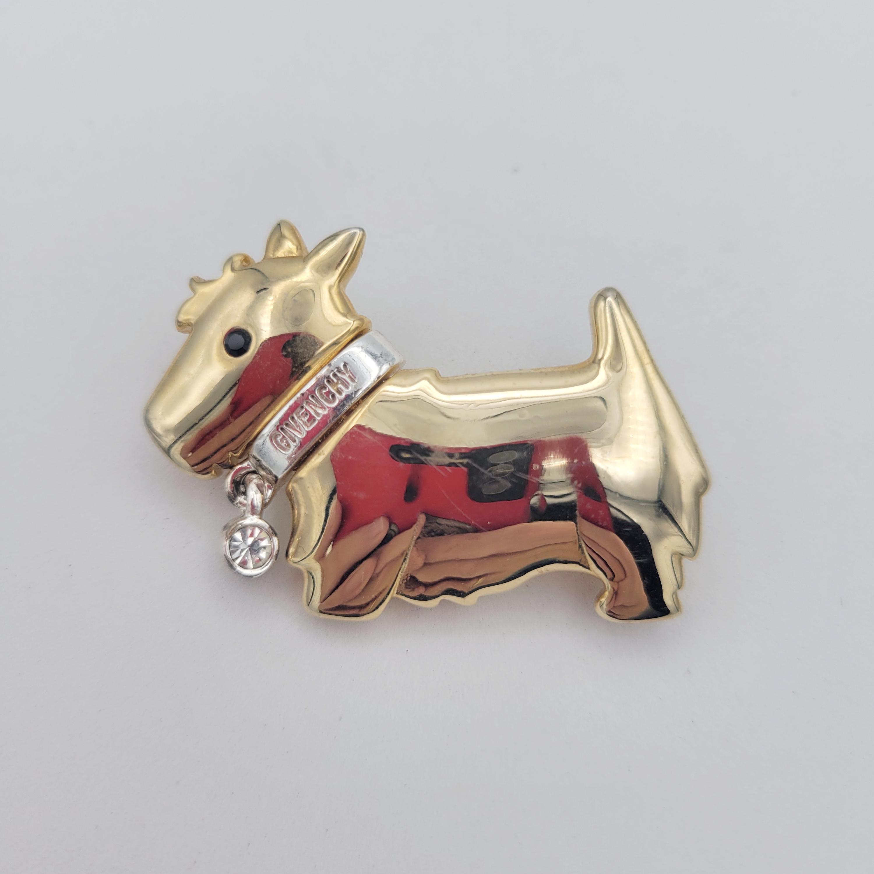 This small shining brooch makes a great accent piece. The piece forms the slighly domed shape of a Scottie dog. The body of the dog is gold-tone metal & the collar is silver-tone metal. The collar says "GIVENCHY" & features a dangling rhinestone. This piece is marked on the back & is in excellent vintage condition with very little wear.
