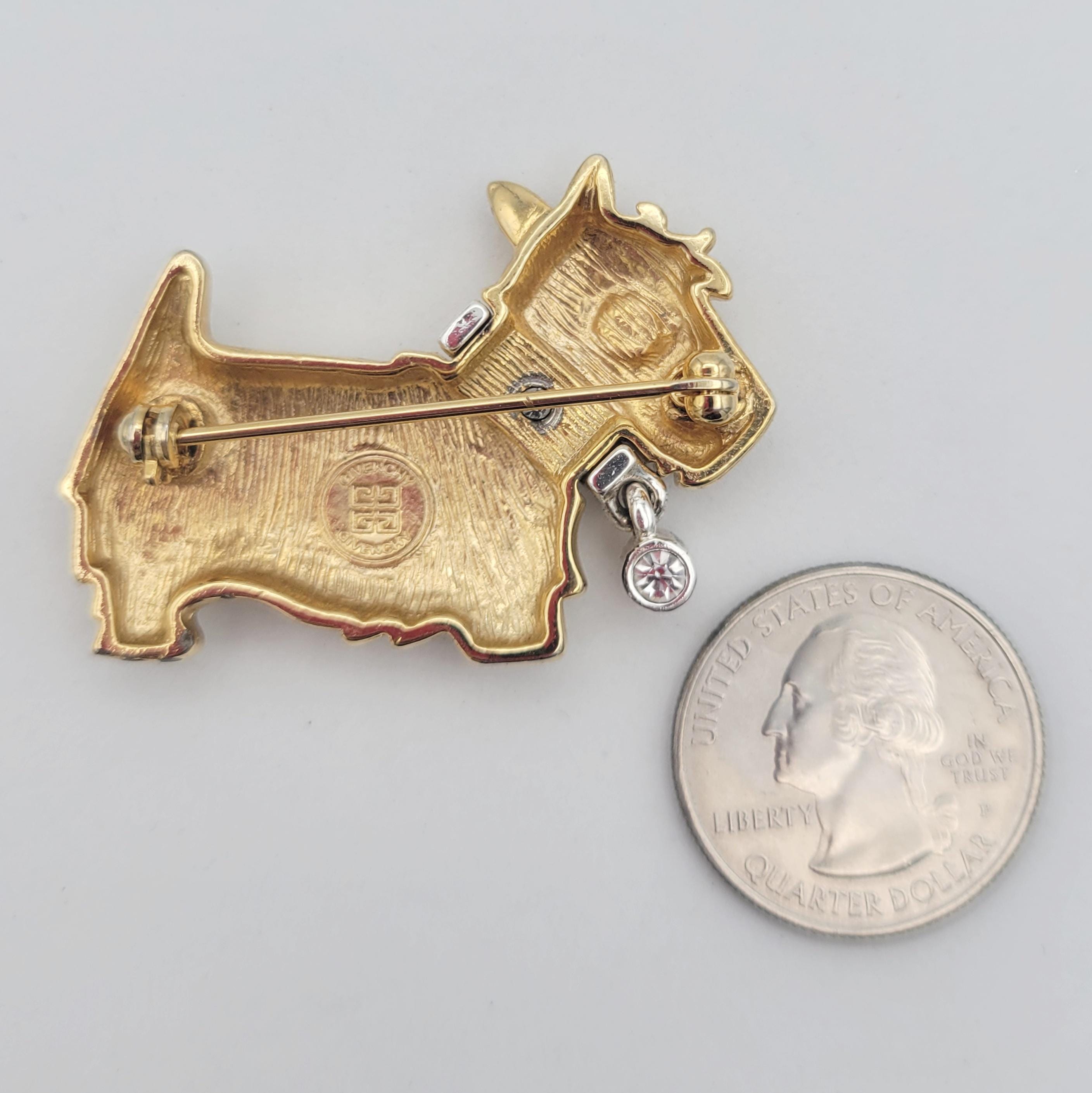 Vintage Givenchy Two Tone Scottie Dog Figural Brooch with Dangling Stone on Collar