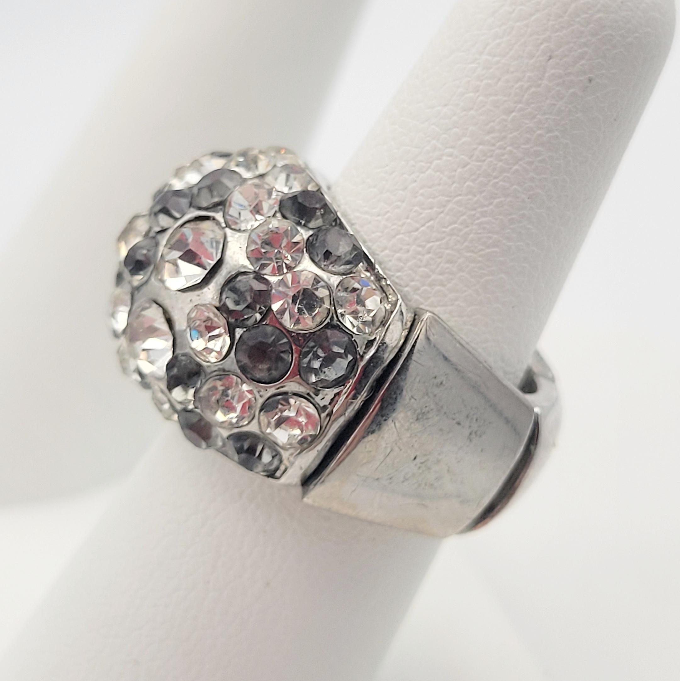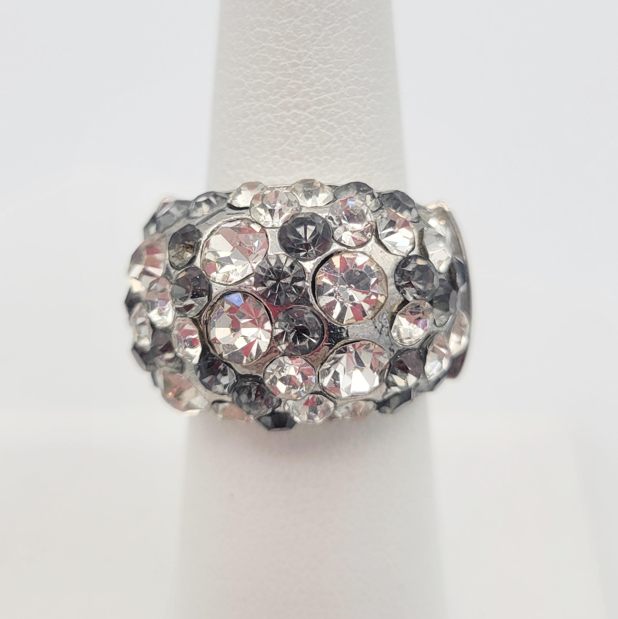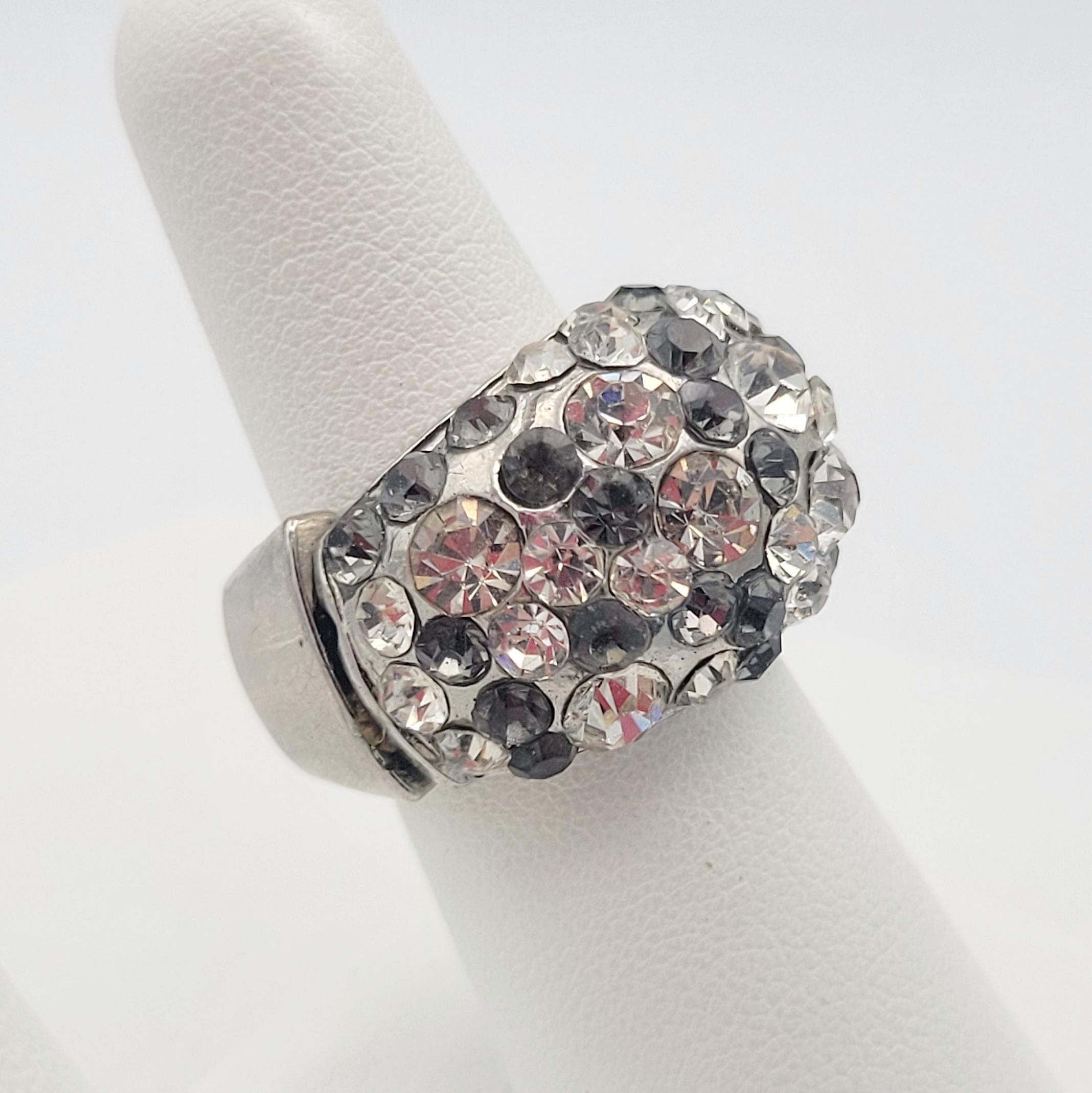 Vintage Oversize Silver Tone Stretch Cocktail Ring Encrusted with Clear & Gray Round Faceted Rhinestones